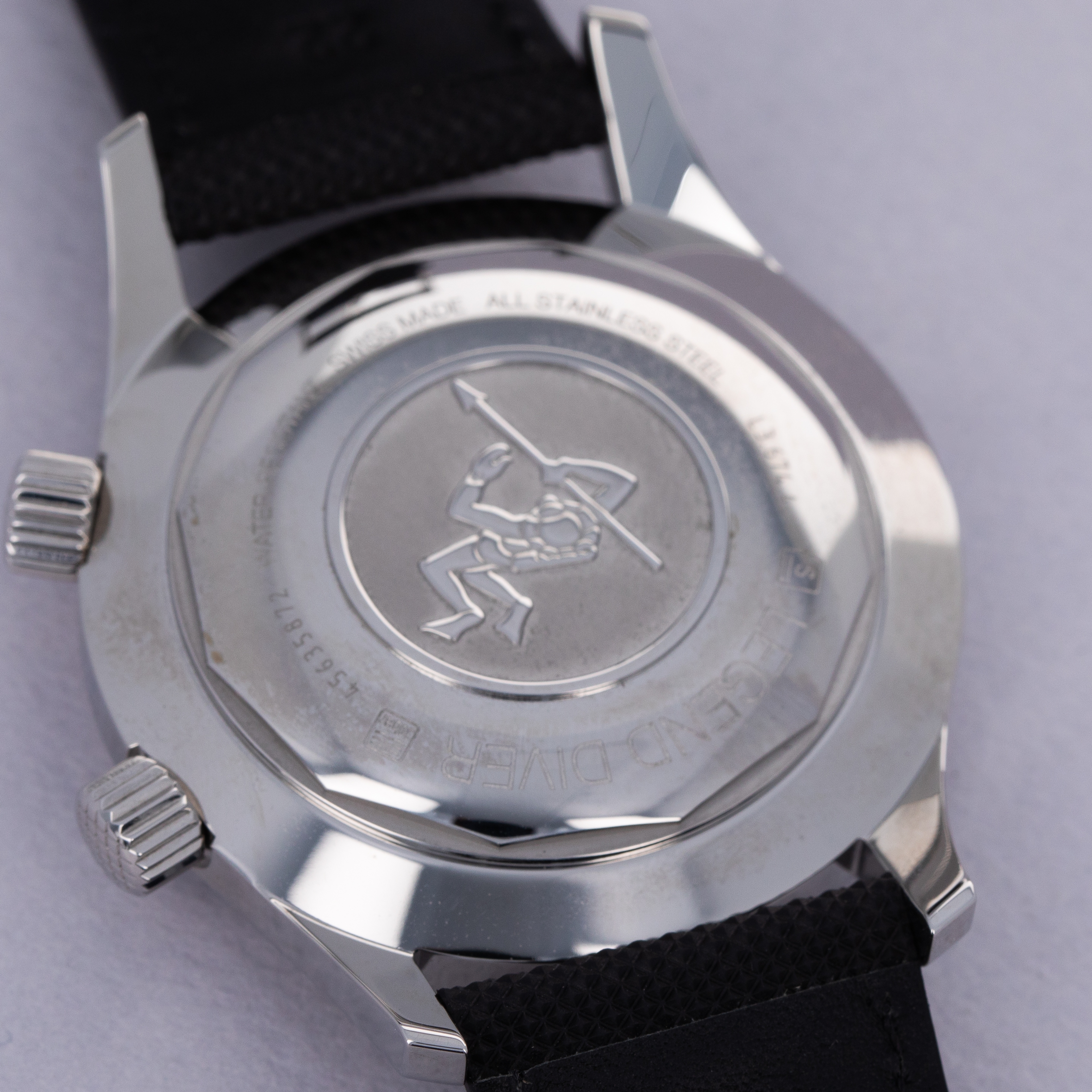 Fitted with the exact same dial layout as the original, the Legend Diver's black display features the model's characteristic luminescent indices and uniquely-shaped hands.