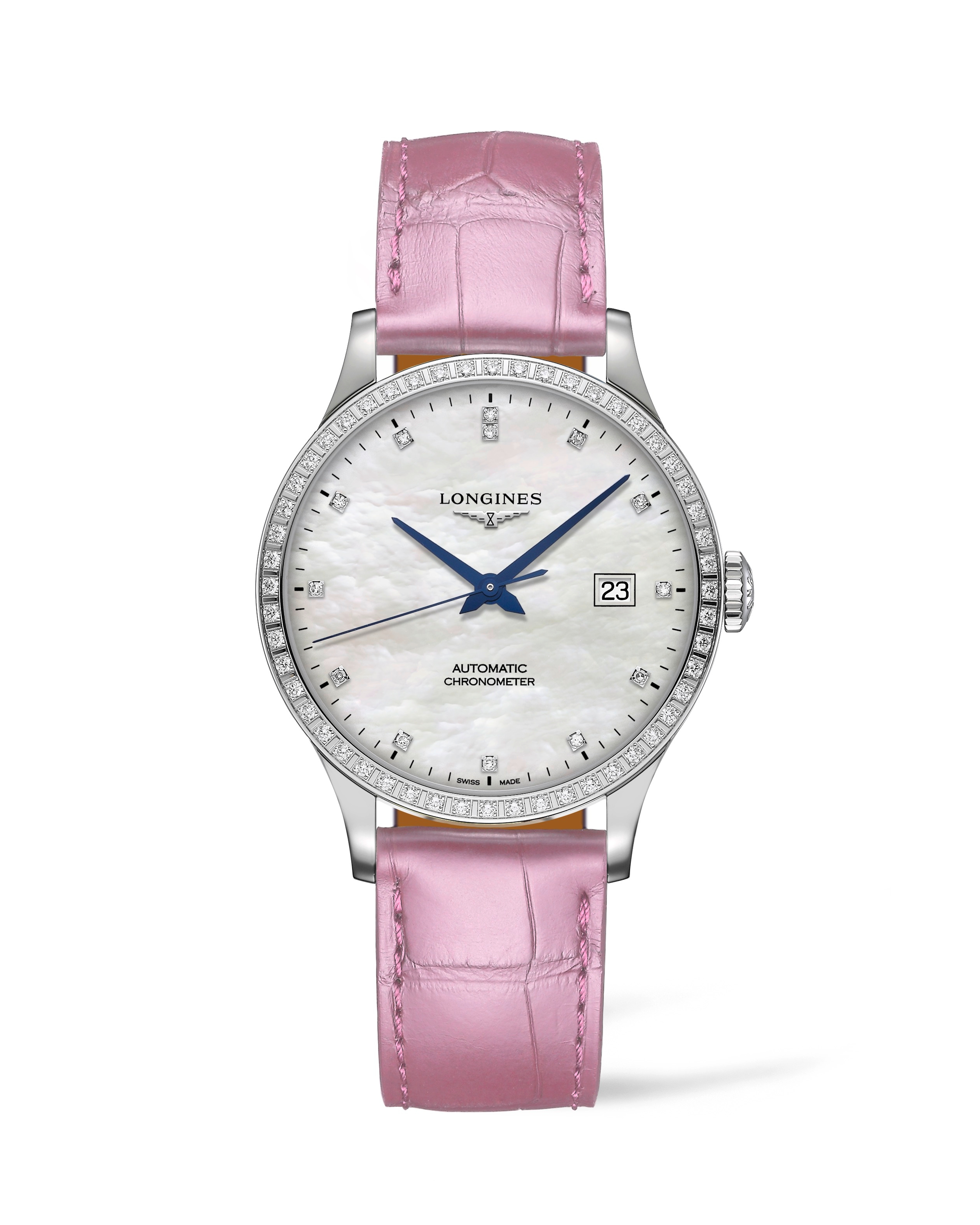 In the purest watchmaking traditions of Longines, the watches in the Record collection combine classic elegance with technical excellence. These exceptional timepieces are renowned for their extreme precision and the entire collection is certified as “chronometers” by the Swiss Official Chronometer Testing Institute (COSC). This bespoke limited edition timepiece features a full-diamond bezel, white mother-of-pearl dial and a pink alligator strap. It is one of the 35 pieces engraved with an exclusive number as a collector’s item.