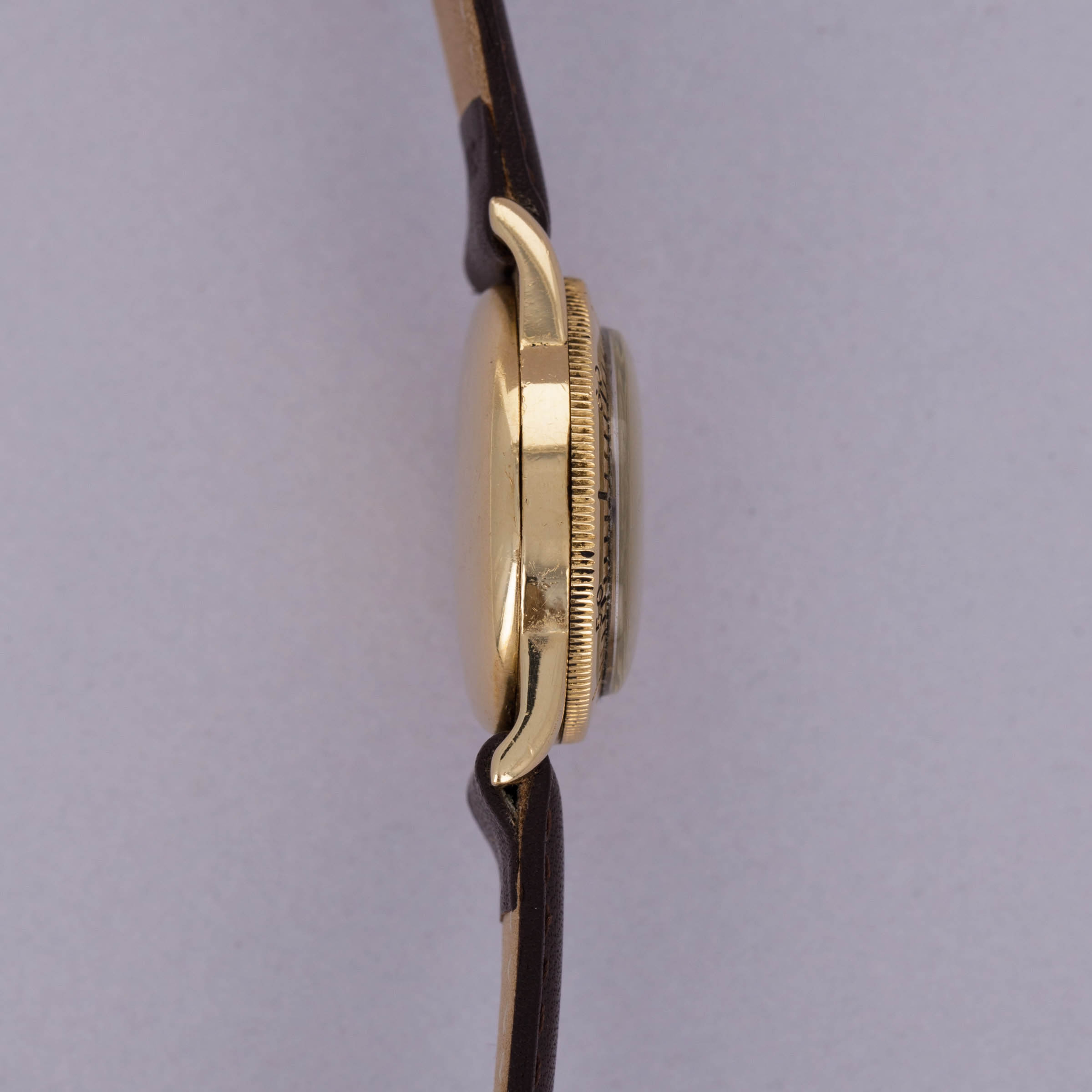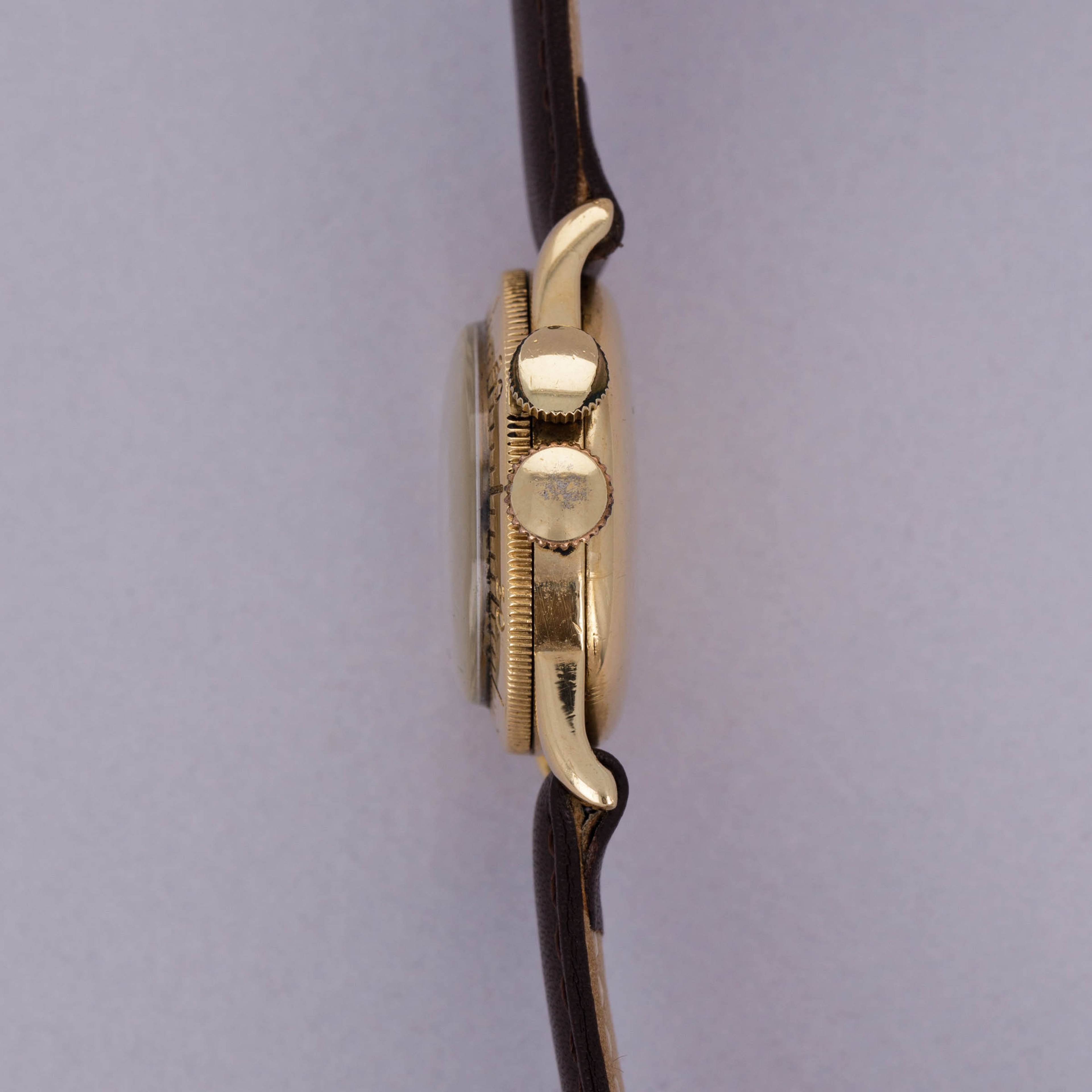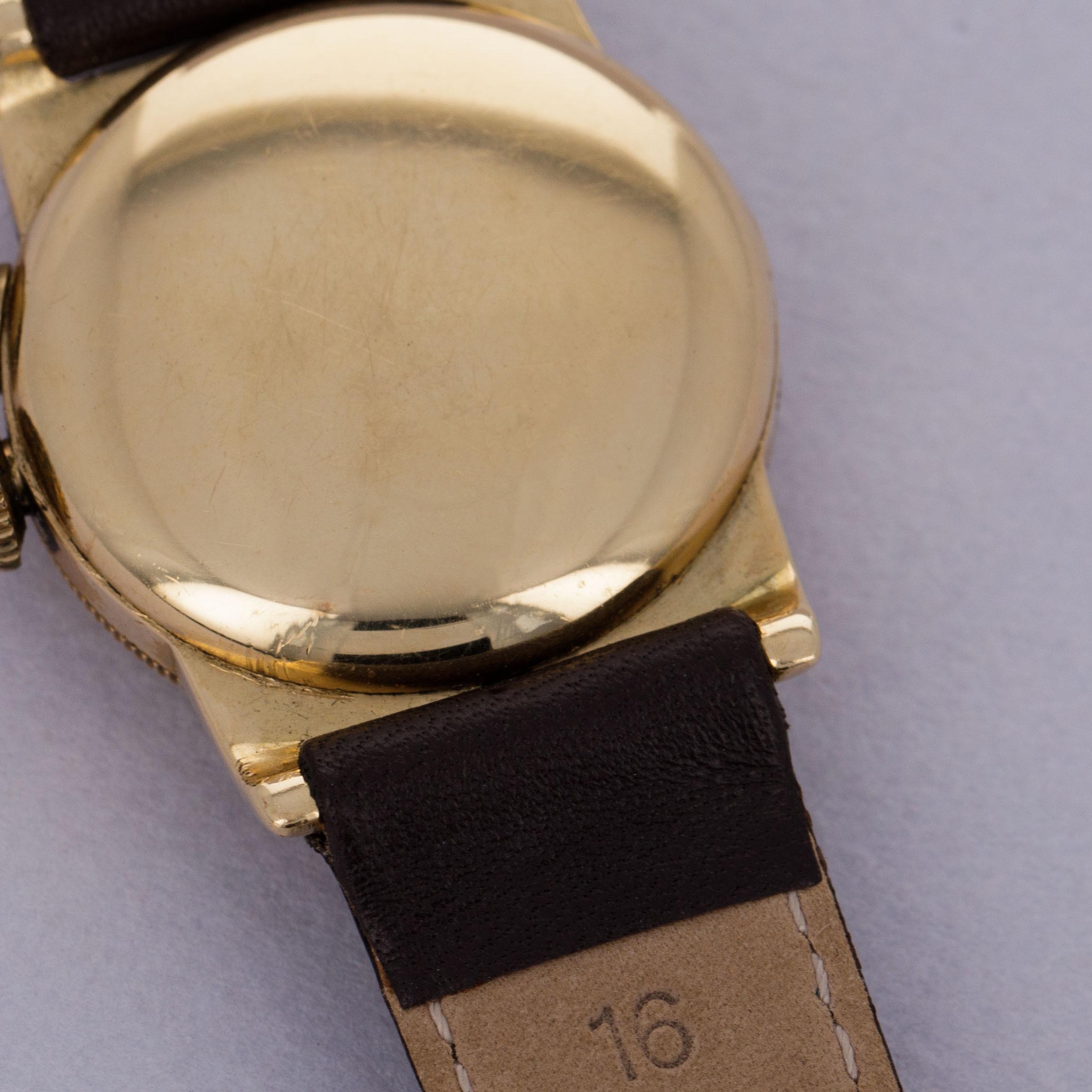 Watch is in good overall condition. 14kt YG case is in good condition, with heavy surface wear visible on the case. Dial is an early refinish and is heavily crazed and worn. Hands are relumed. Please note timekeeping is very poor and a service is needed.