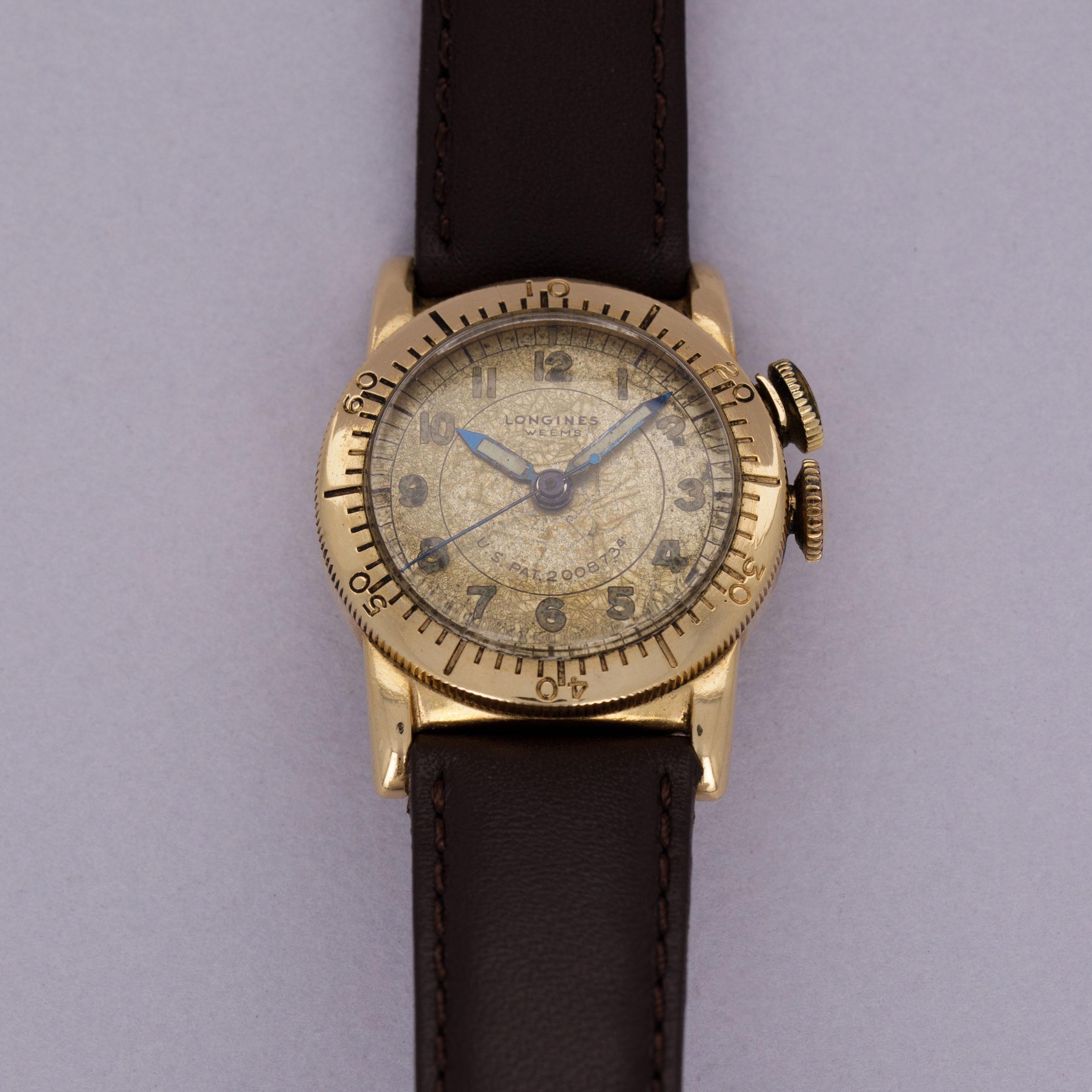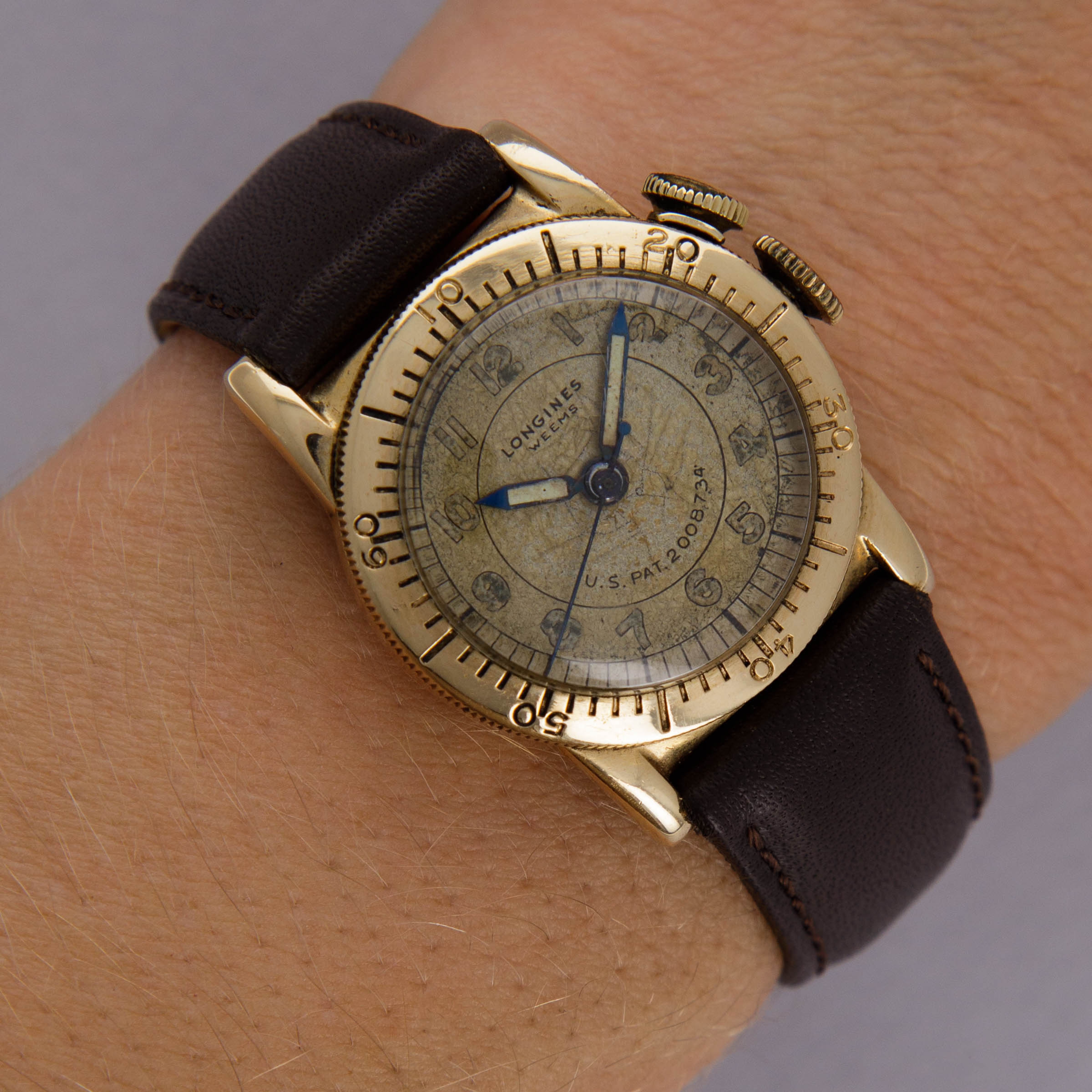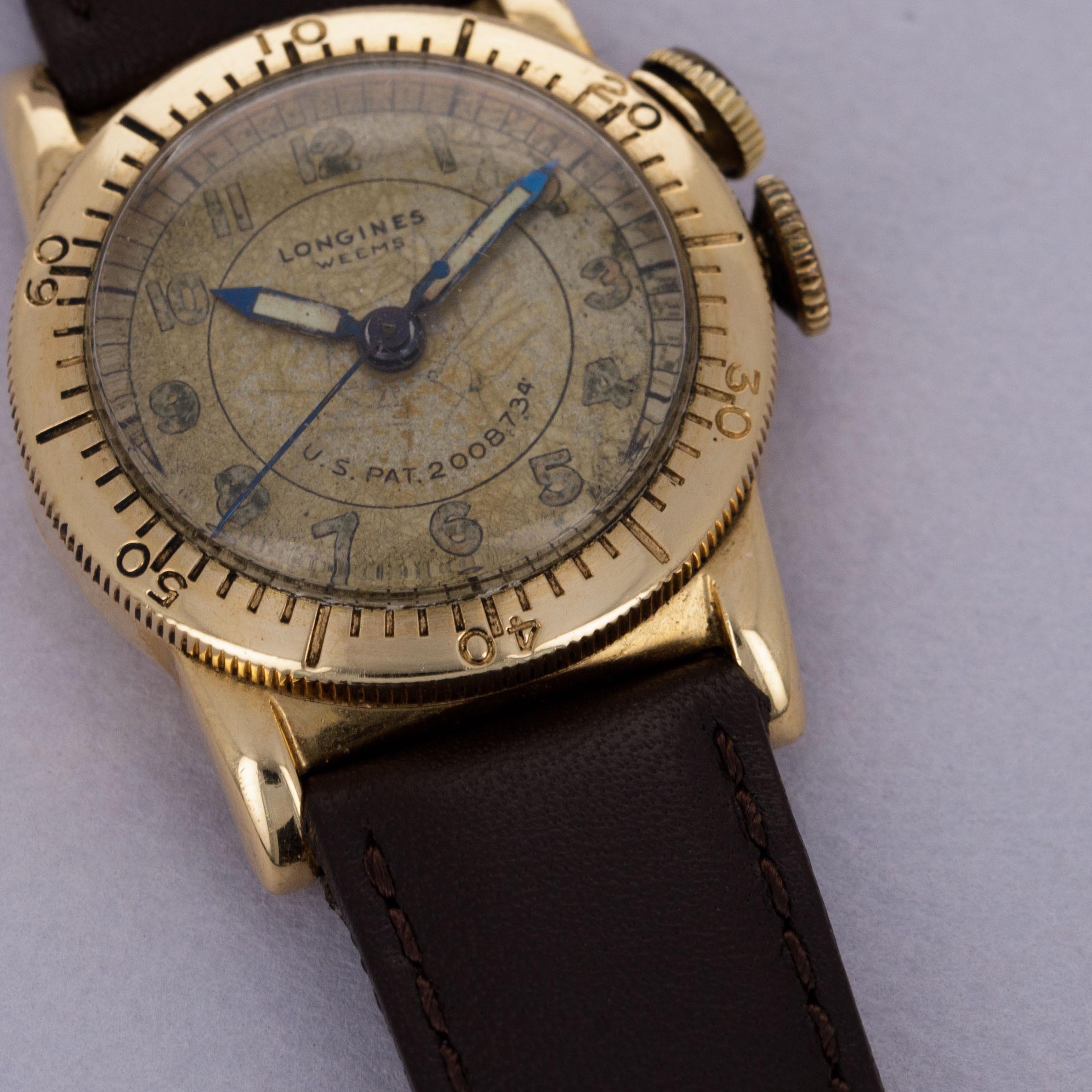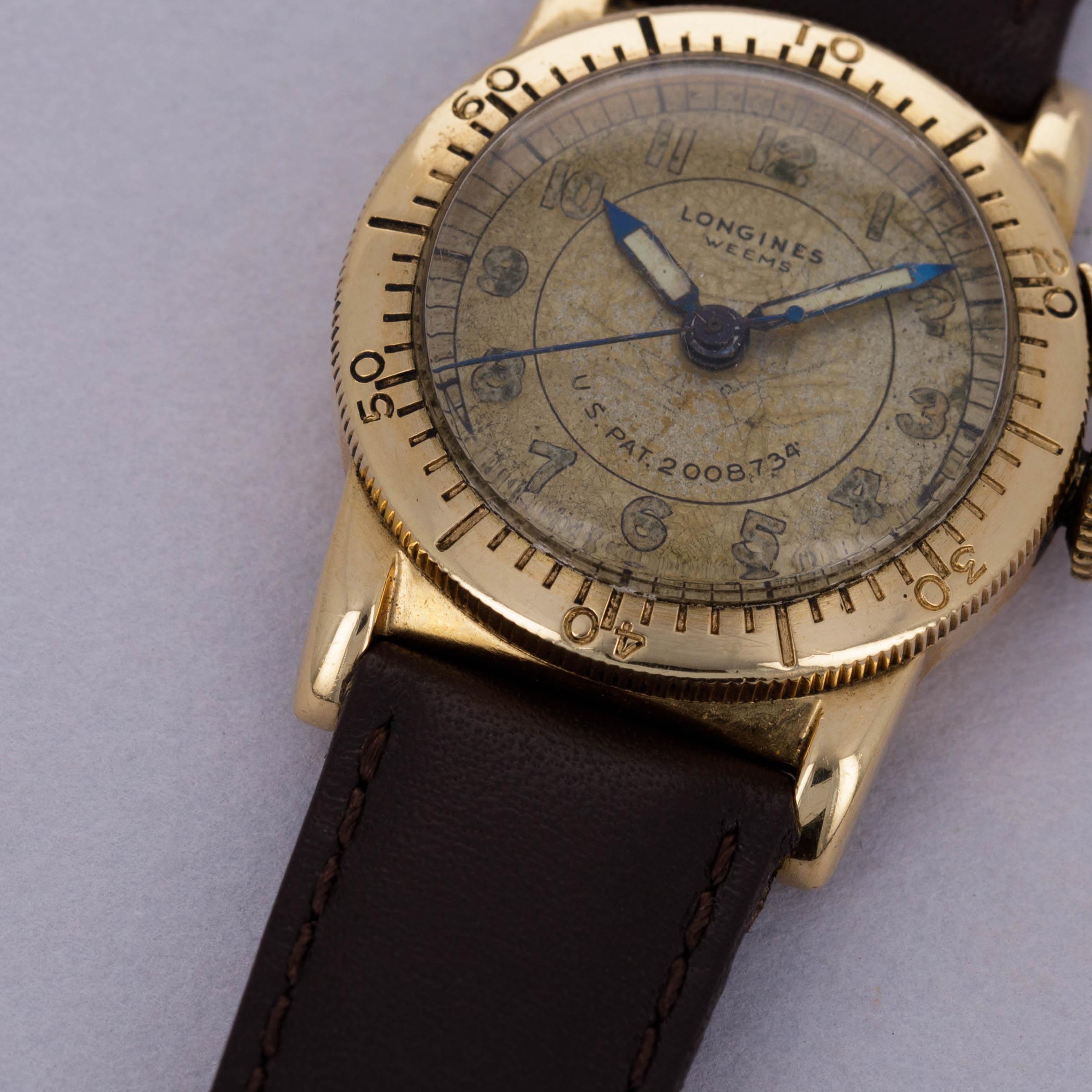 Named after the Weems system of navigation that allowed the user to determine their geographical longitude, the watch that we have offered here is one of Longines’ most unique horological contributions to aviation, the Weems Aviator’s Watch. Created in the mid 1930s as per the US Patent number on its dial, the Weems Aviator’s Watch was created to aid pilots in determining elapsed time, with its lockable rotating bezel. Made in a selection of metals, the Weems features a dual crown system, with one functioning as a normal winding and setting crown and the other, at 2 o’clock, being used to lock and unlock the bezel. Made with the 1930s and 1940’s sizing standards in mind, the Weems measures 28mm in diameter, but thanks to its bezel, two crowns and long lugs it wears slightly larger. Boasting an aged dial that has taken on a champagne sort of color thanks to how it has darkened, this example was military-issued, as evidenced by its luminous Arabic numerals and hands, both of which were swapped with applied Breguet numerals and feuille hands on the later civilian-issued examples.