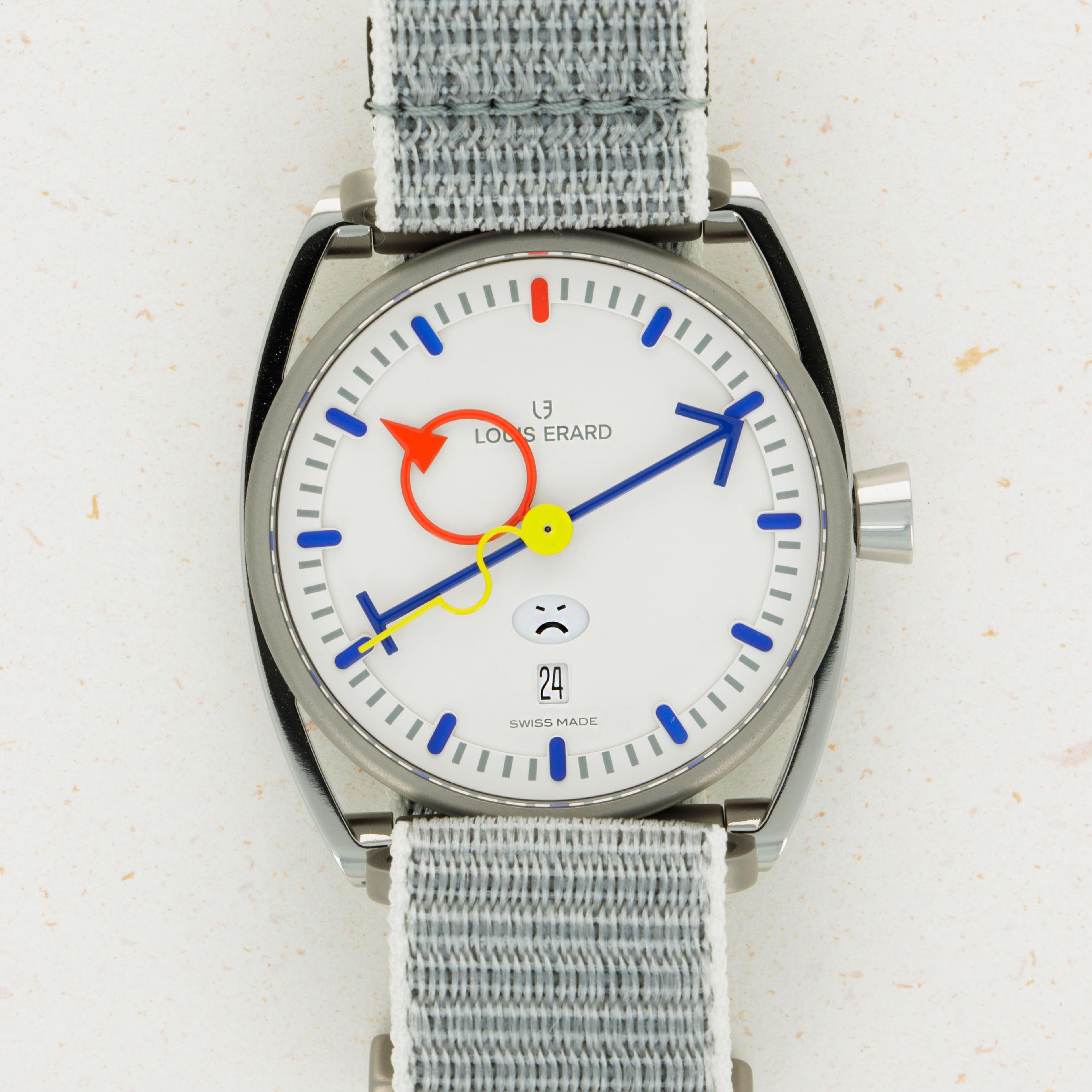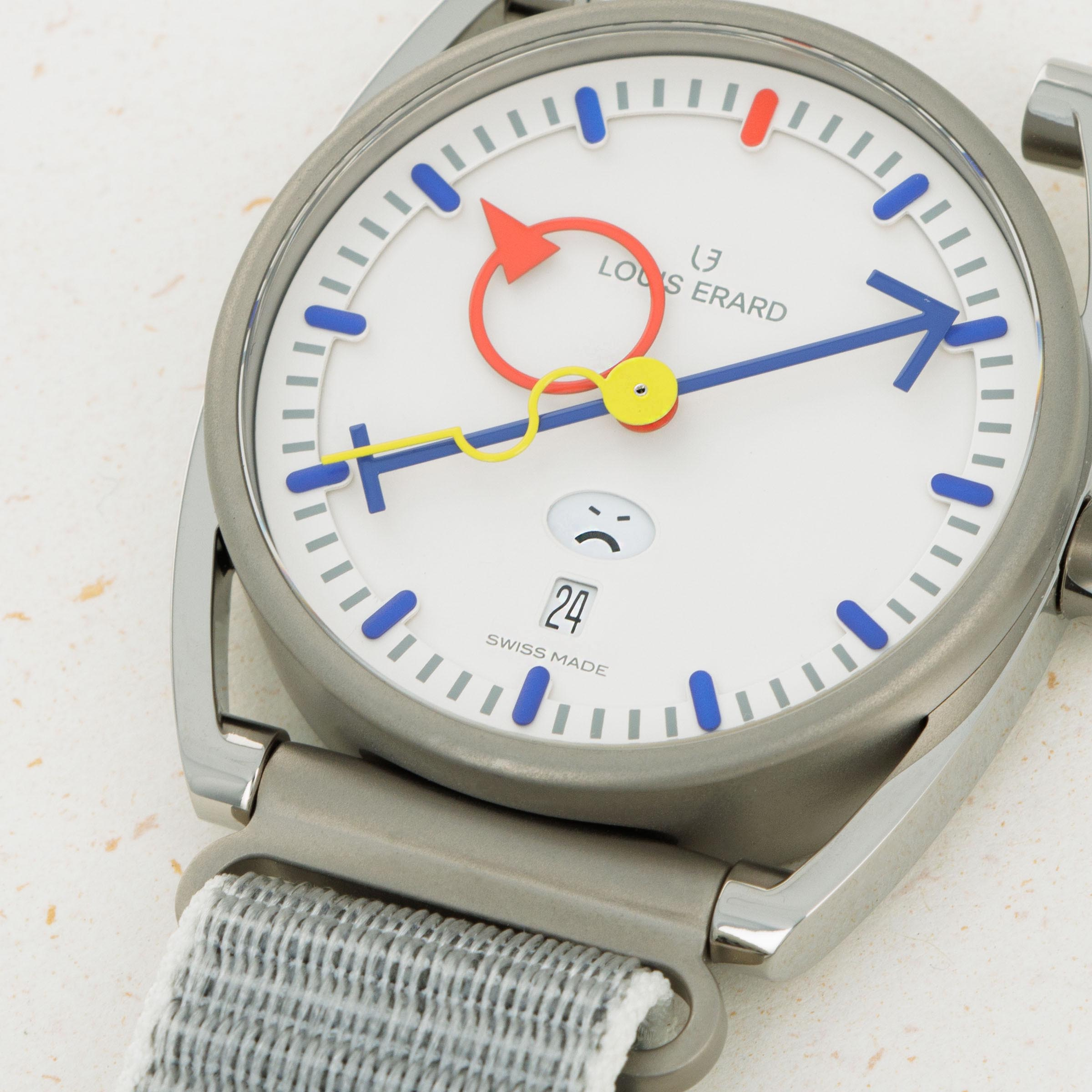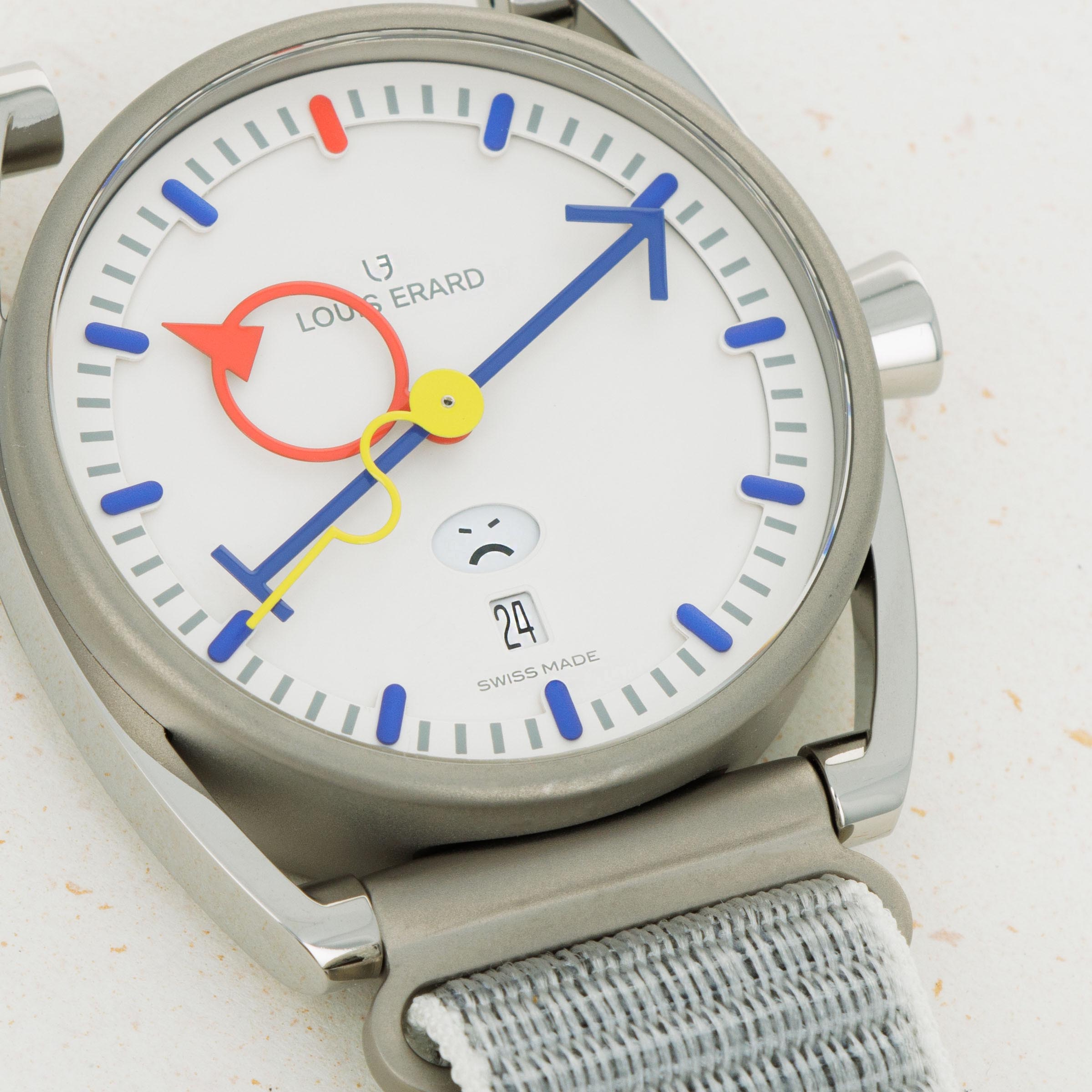 Founded in 1929, Louis Erard is a watchmaker that is filled with heritage and history. Acquired in the 1990s before it was relaunched during the independent watchmaking boom of the early 2000s, in 2003, the brand has established a strong design language that doesn't break the bank. Since then, Louis Erard has built a passionate customer base that continues to grow thanks to the popularity and success of their collaborative projects and impressive individual exploits. One of their most successful collaborations is with famed French designer and watchmaking industry veteran Alain Silberstein. Released in 2022 as Louis Erard's third collaboration with Alain Silberstein, the Le Triptyque Louis Erard x Alain Silberstein was a collection of three different timepieces that each featured a unique set of functions and layout while also being limited to just 178 pieces each. Offered here, we have the Day-Date variant, or the La Semaine Blanche as it is known, that follows on from the pair's original 2019 collaboration. Featuring a 40mm case, the La Semaine Blanche is an exceedingly unique timepiece with vertical sidebars or 'brancards' that are not a common sight in watchmaking. Made from micro-blasted grade 2 titanium, its lugs, case, and bezel all sport a matte finish, while its grade 5 titanium vertical sidebars feature a polished finish. Sporting an incredibly unique dial, the La Semaine Blanche’s opaline silver dial features Alain's visual style in abundance. With multi-colored whimsical-shaped hands made from various shapes, the La Semaine Blanche blends yellow with red and blue to create a visual delight and allow each constituent of its display to remain clear, and legible. Building on this whimsical take on timekeeping, the La Semaine Blanche also features a Day and Date display. While its date display is a rather classical numerical representation of the date in an aperture at 6 o’clock, the day display is rather Silberstein-esque. Instead of merely stating the day, the La Semaine Blanche features seven different colored faces that feature various emotions as the days progress and the weekend beckons closer.