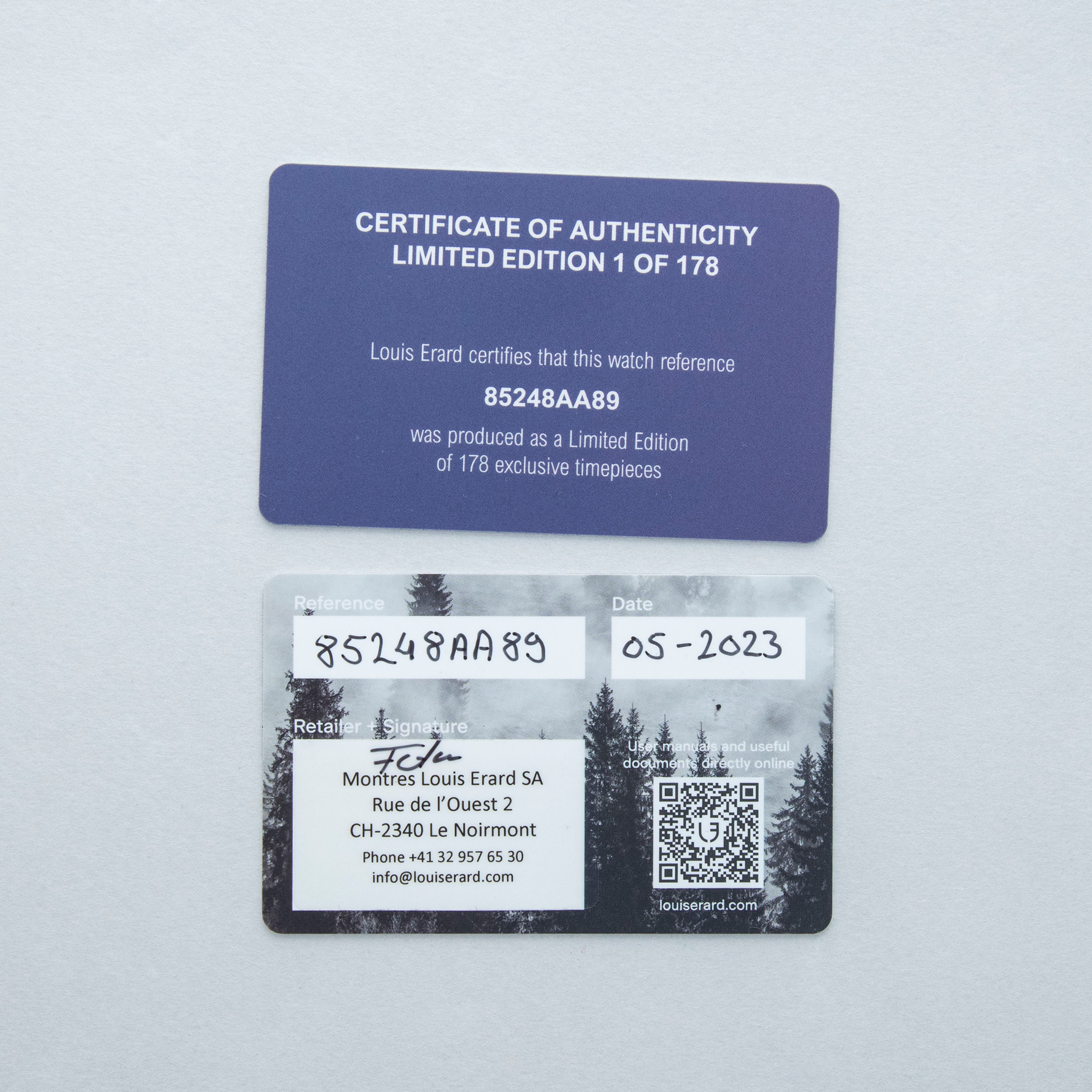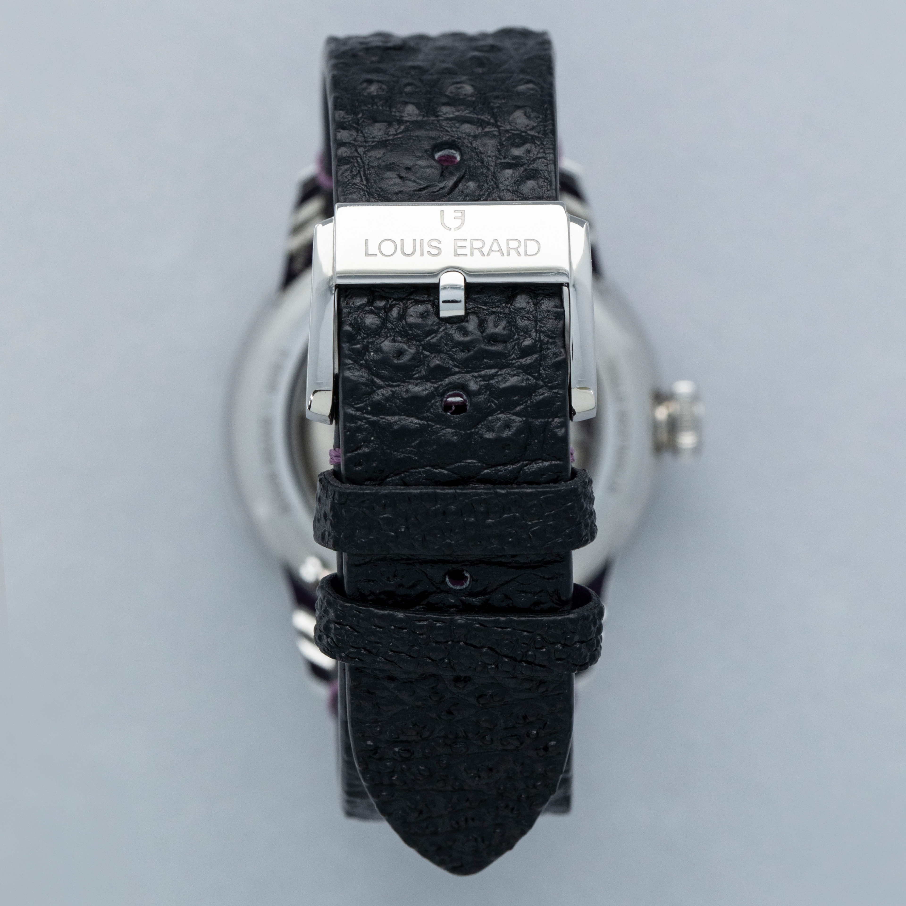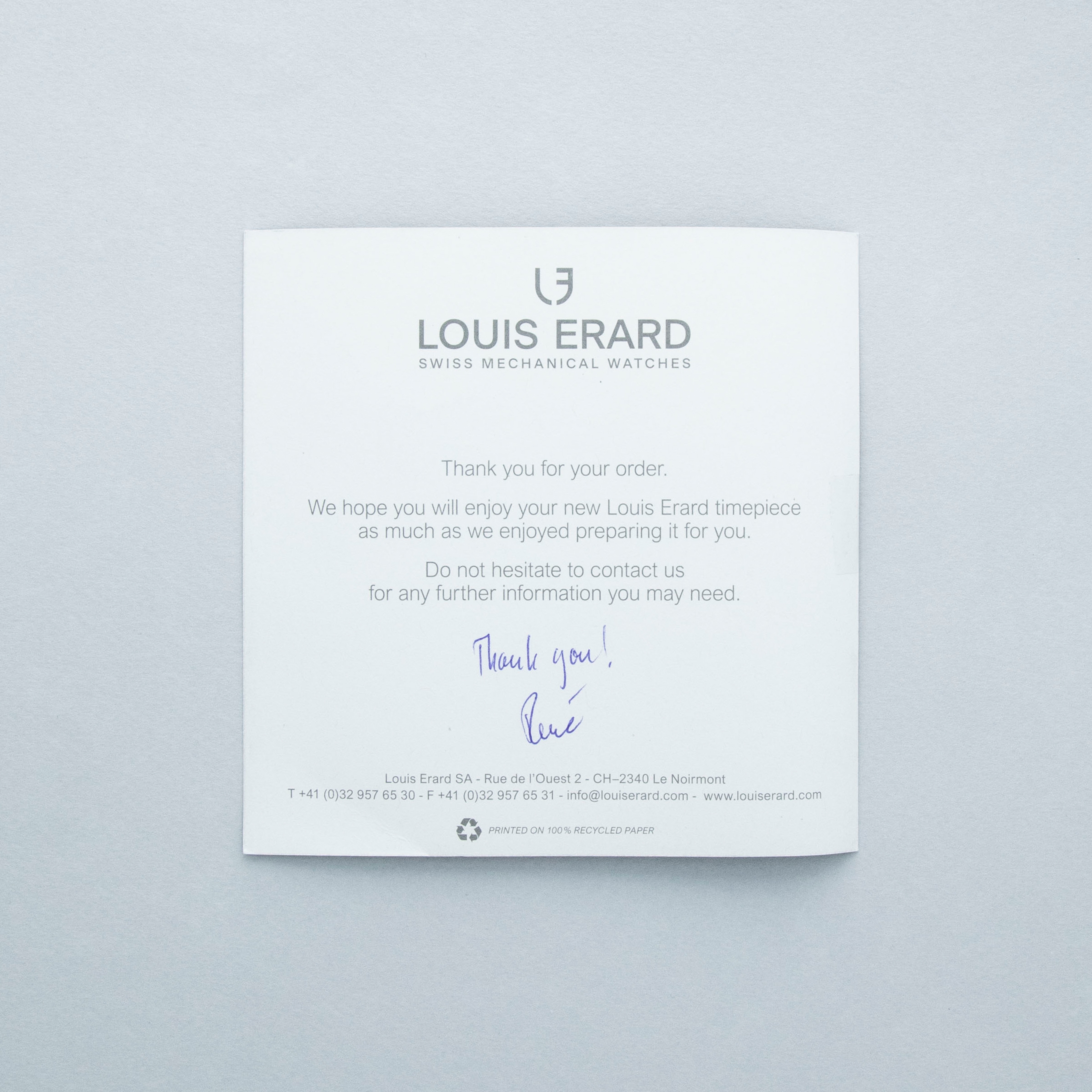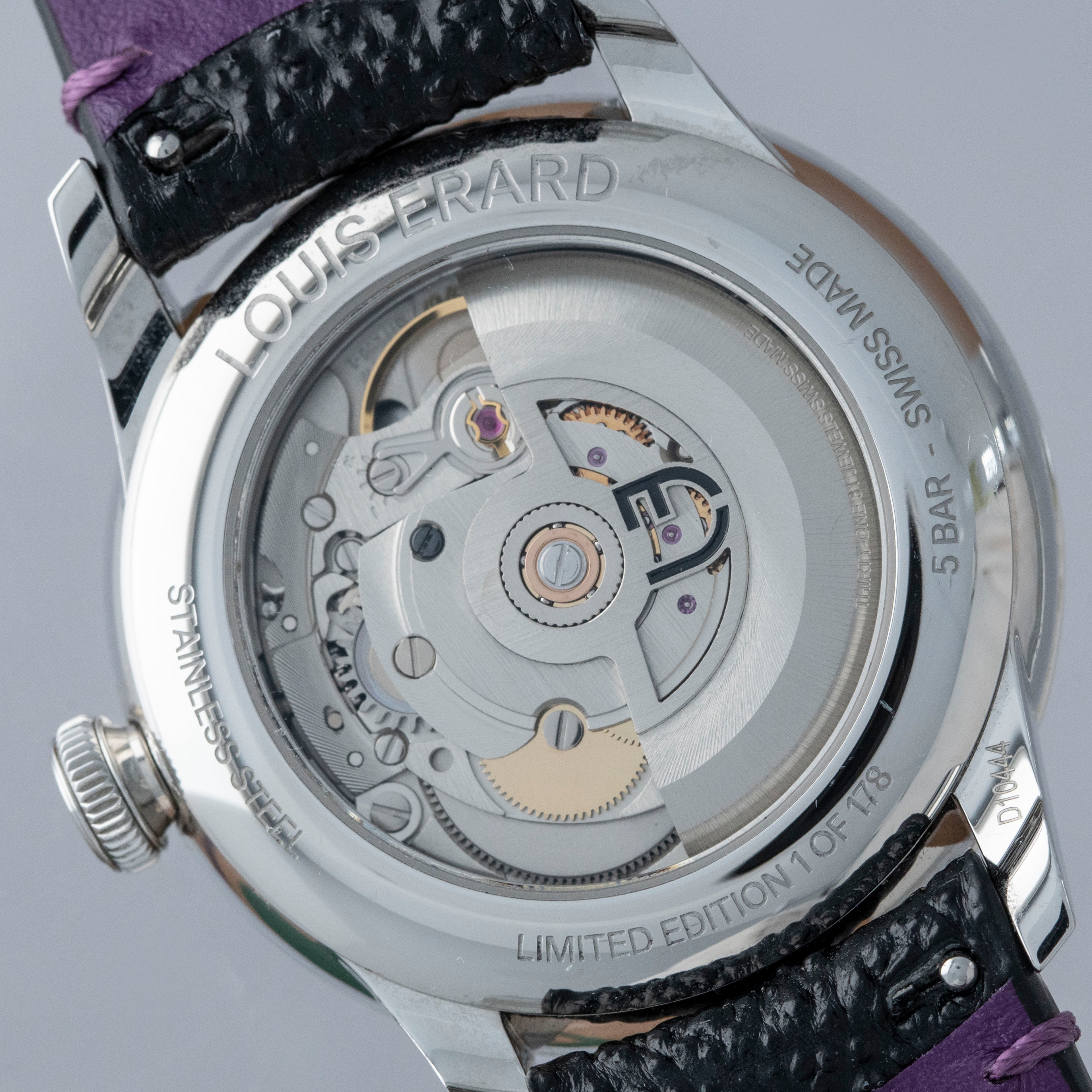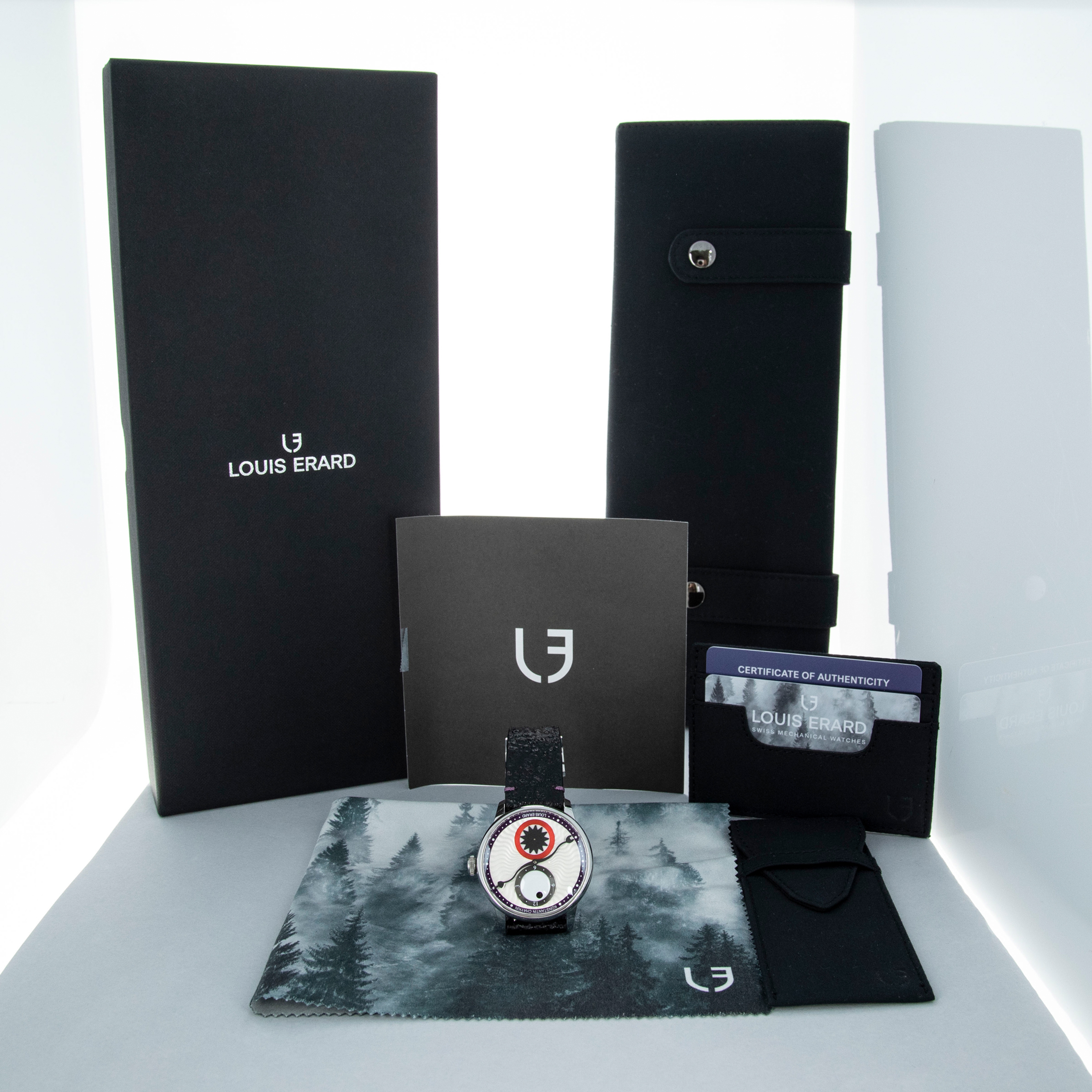 The watch is in overall excellent condition. The steel case has light scratches on the polished bezel and case sides. The display case back has very well-defined engravings around the edge, with some light marks. The dial and hands are near-mint. It is fitted with a black leather Louis Erard strap with a steel pin buckle in excellent condition. The watch comes with its box, large pouch, travel pouch, warranty card, card holder, cloth, and other paperwork.