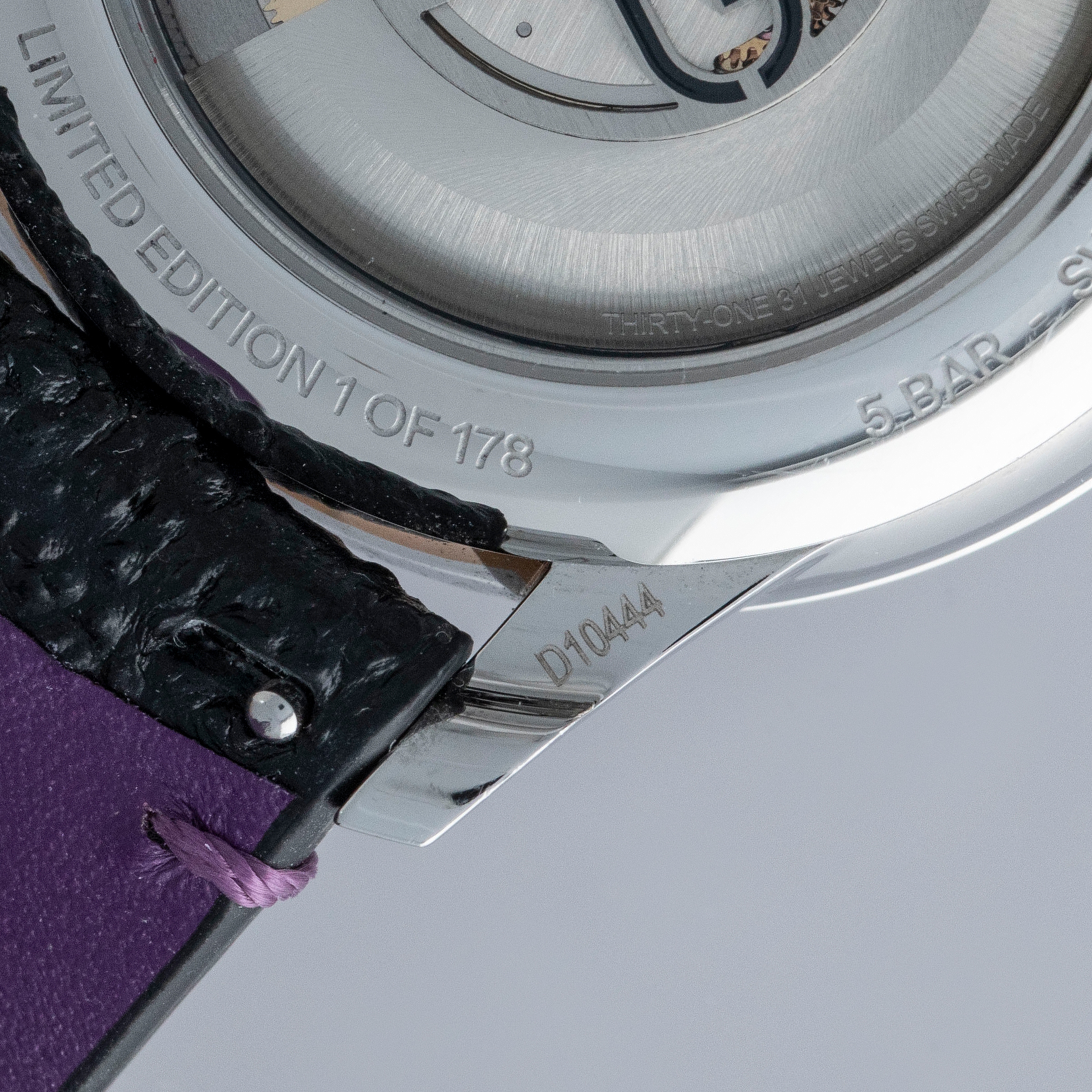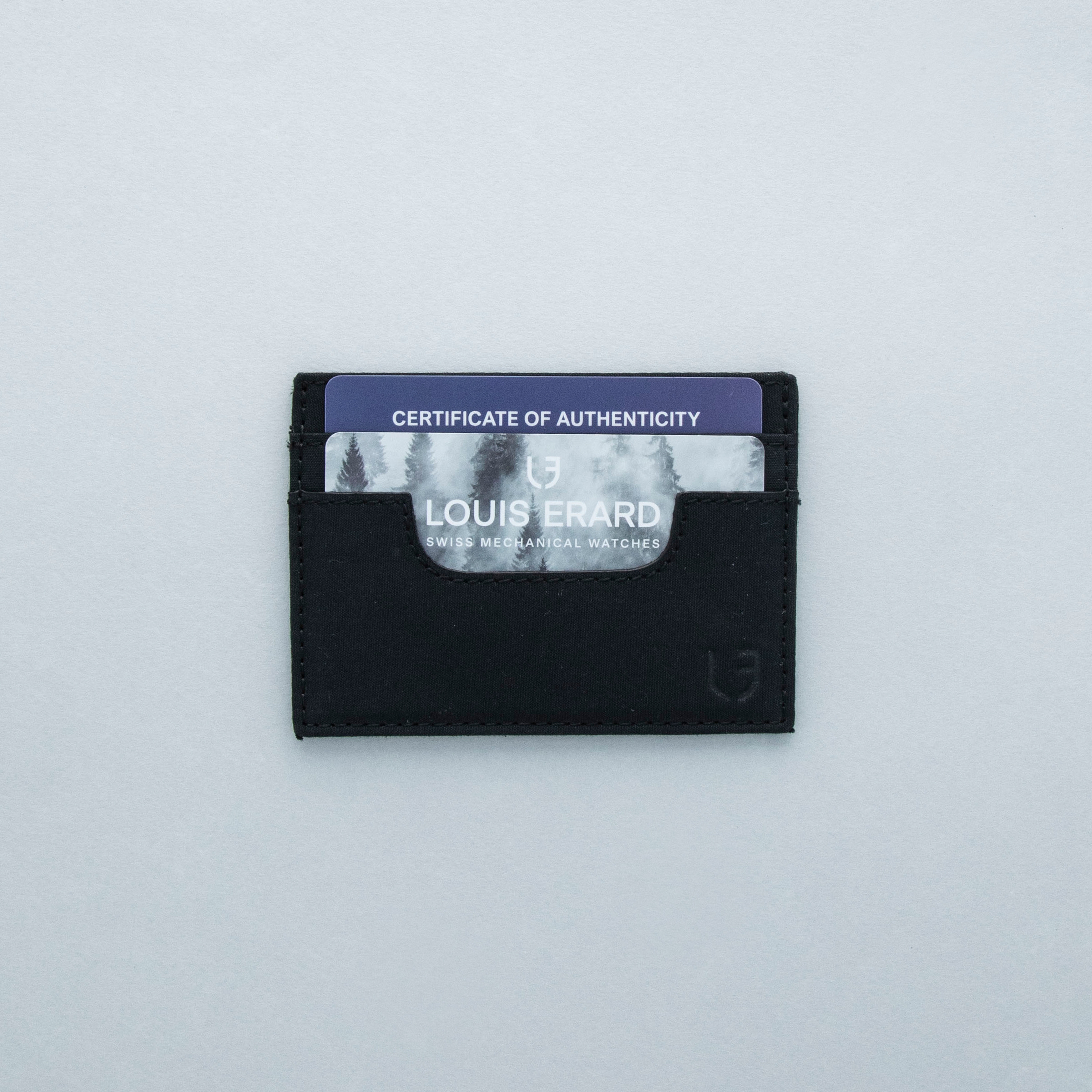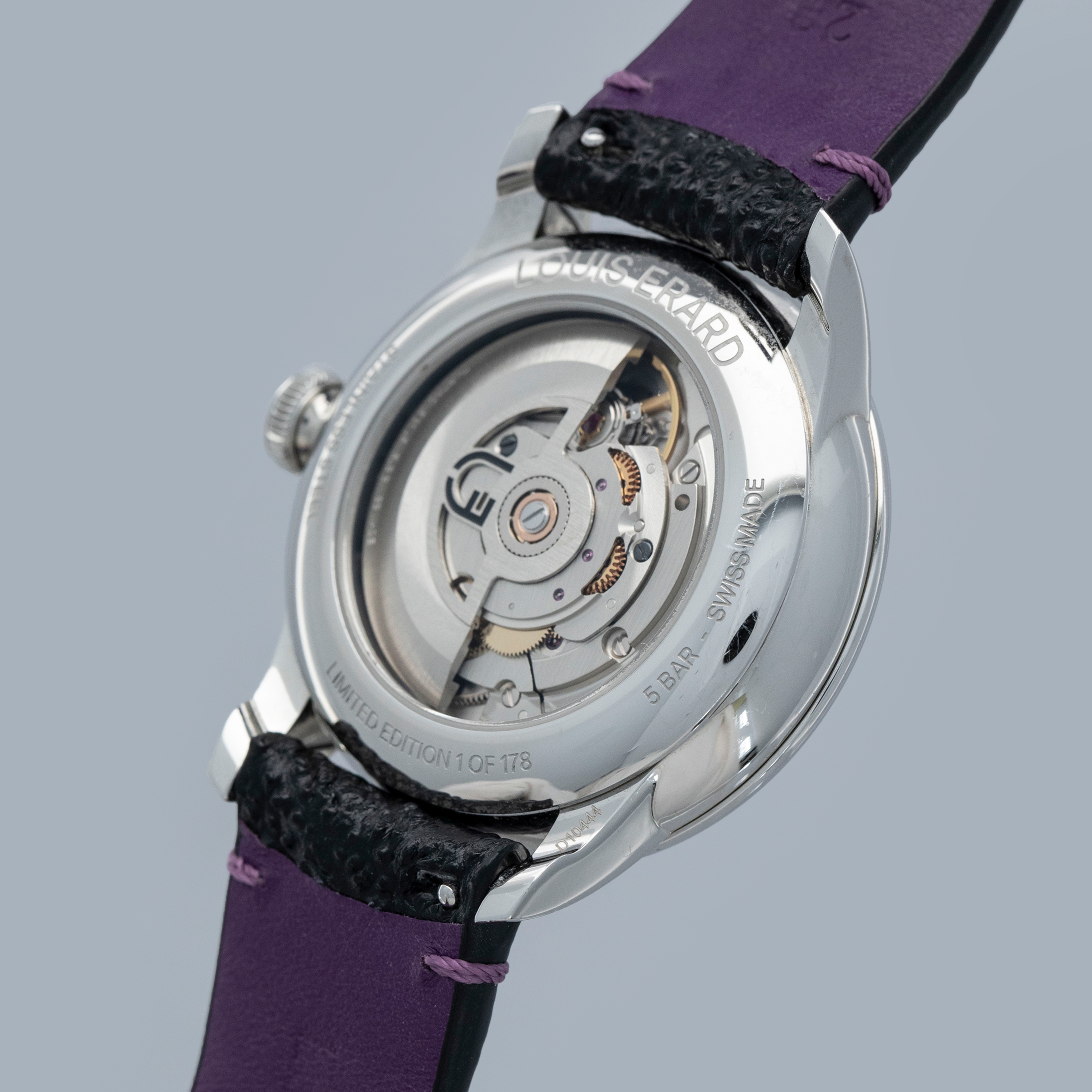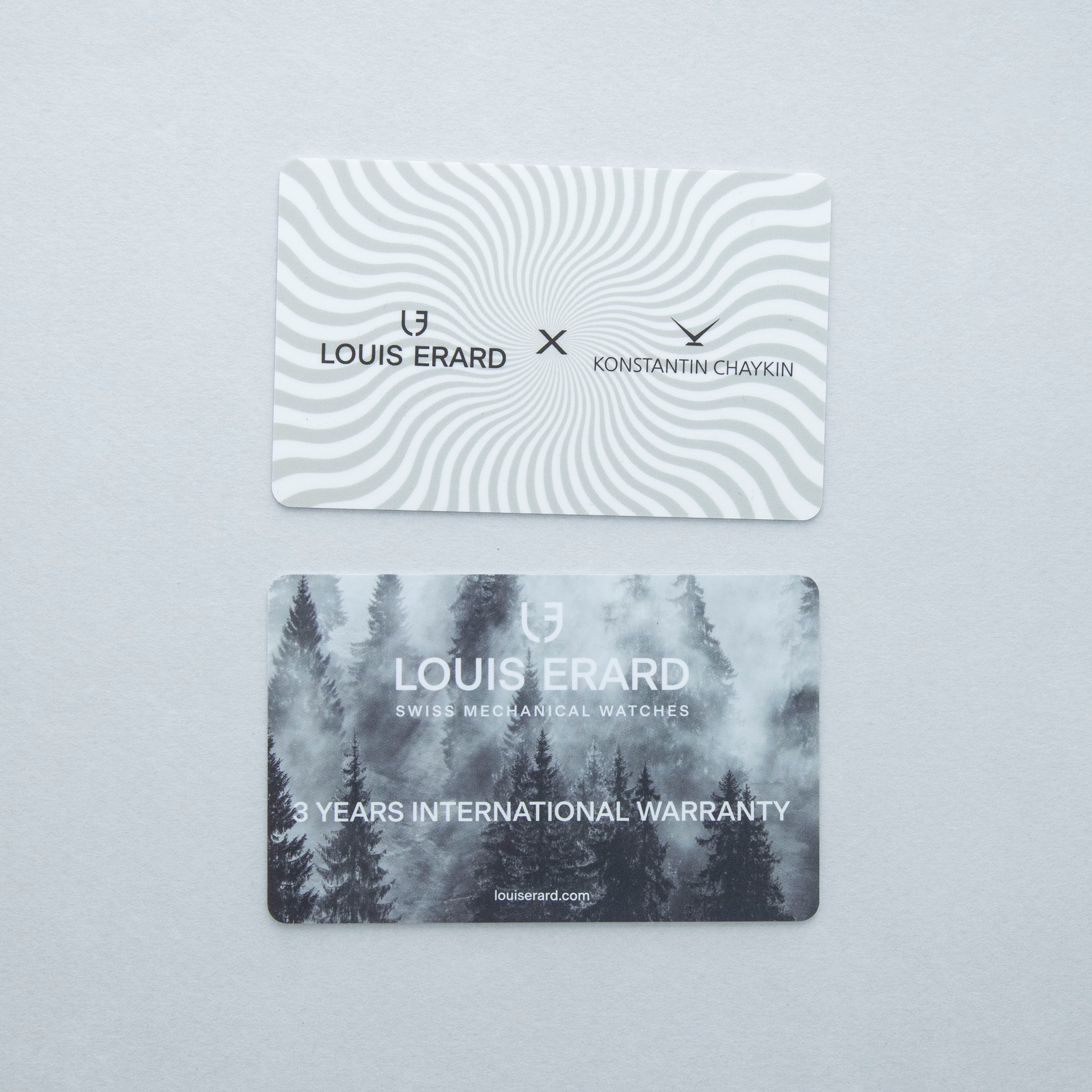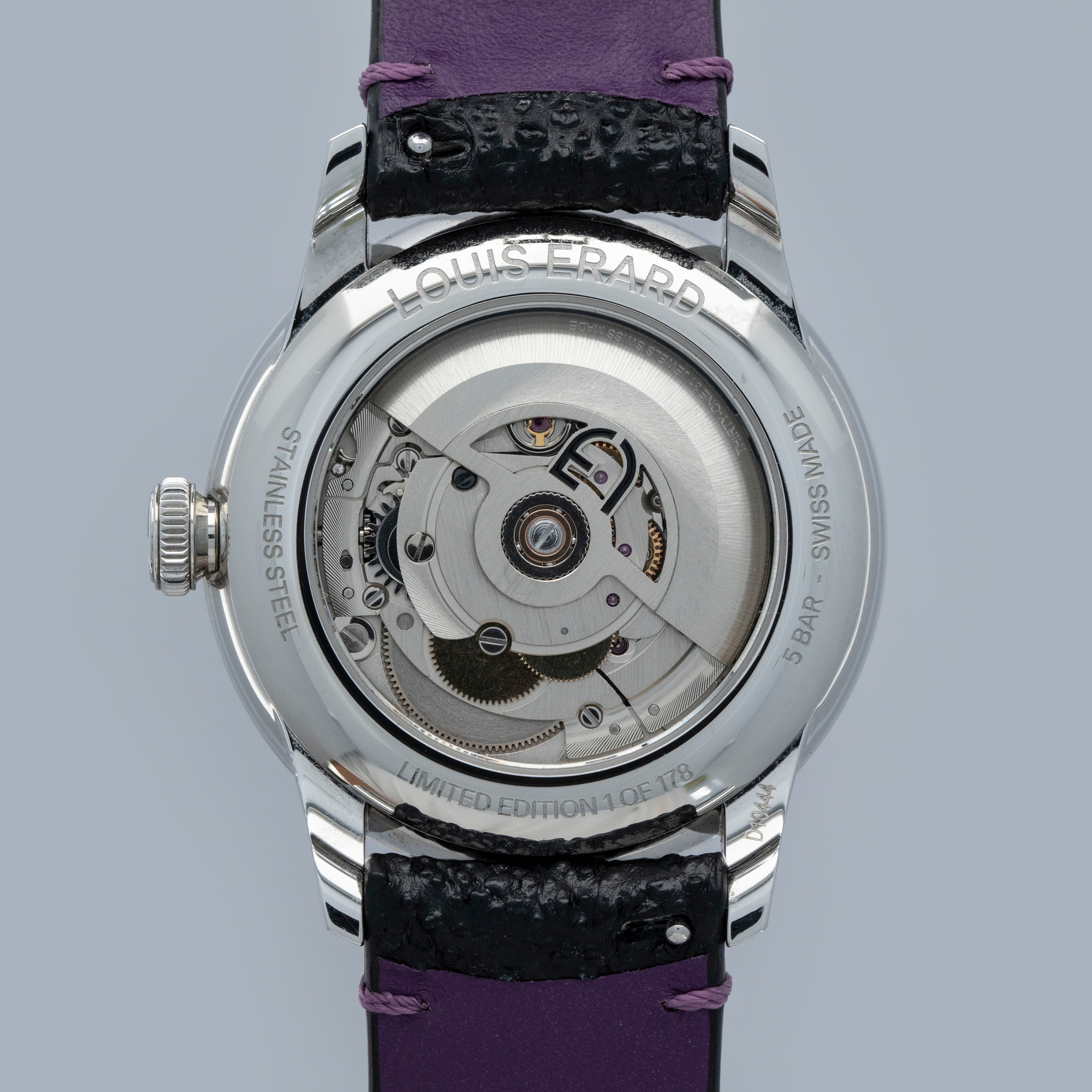 The watch is in overall excellent condition. The steel case has light scratches on the polished bezel and case sides. The display case back has very well-defined engravings around the edge, with some light marks. The dial and hands are near-mint. It is fitted with a black leather Louis Erard strap with a steel pin buckle in excellent condition. The watch comes with its box, large pouch, travel pouch, warranty card, card holder, cloth, and other paperwork.