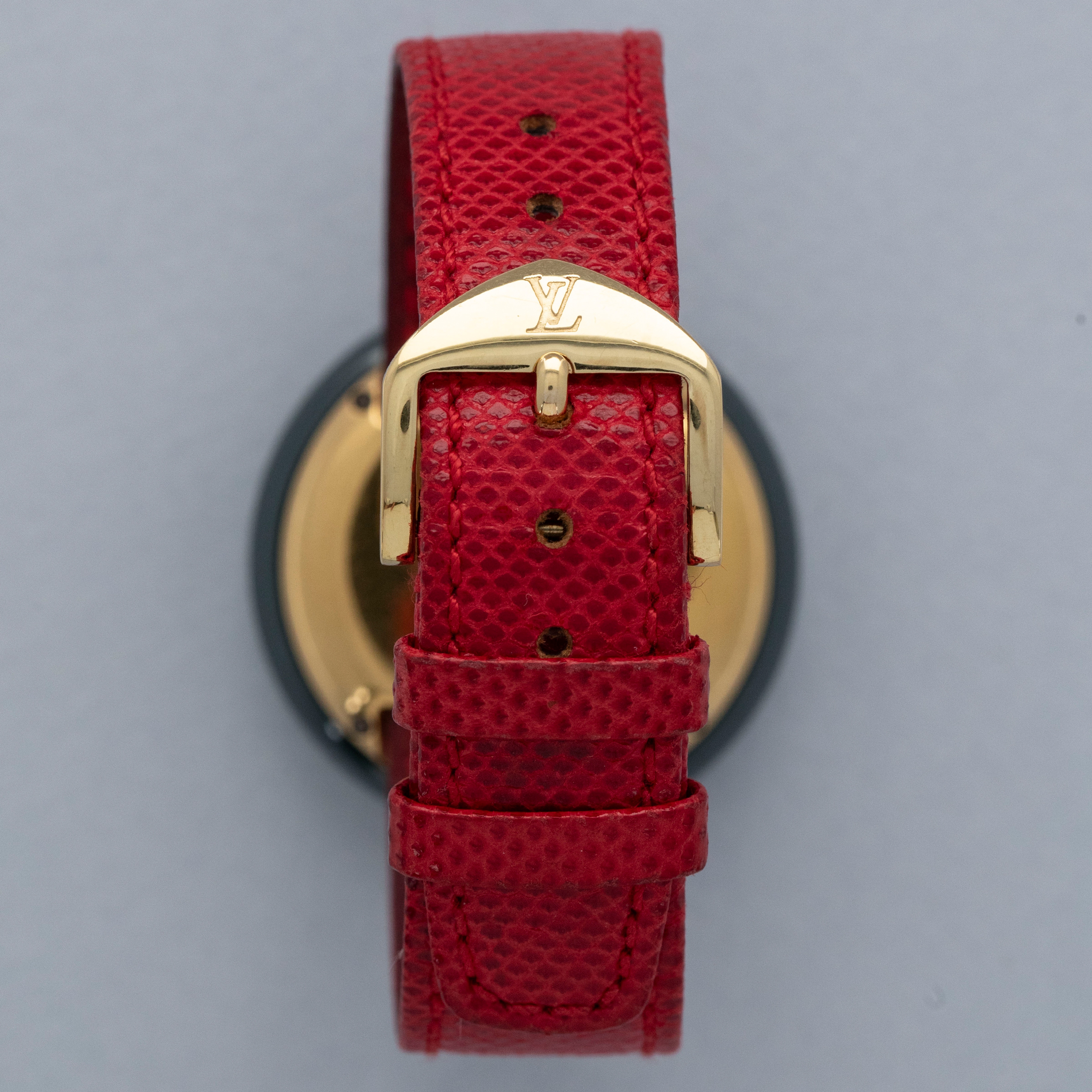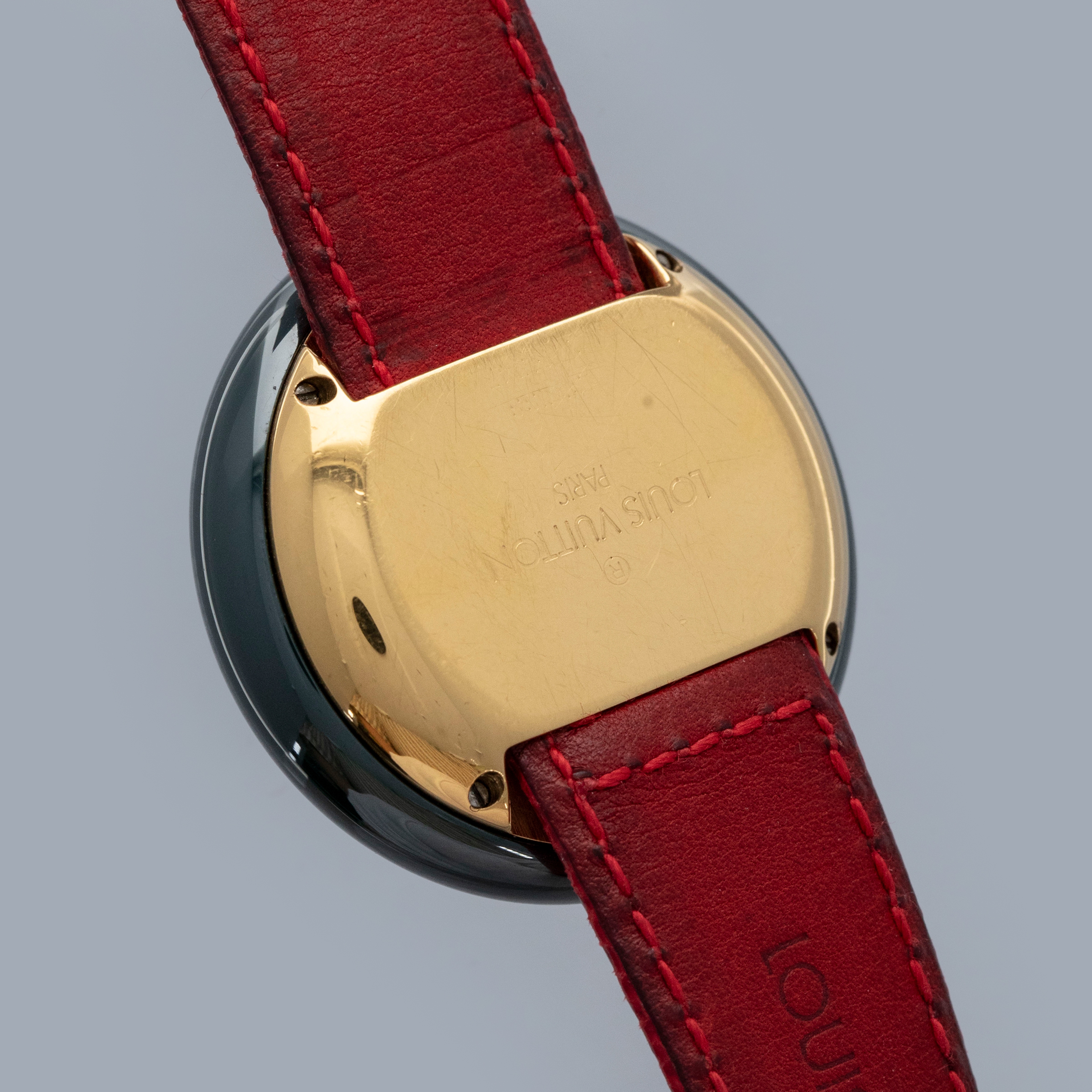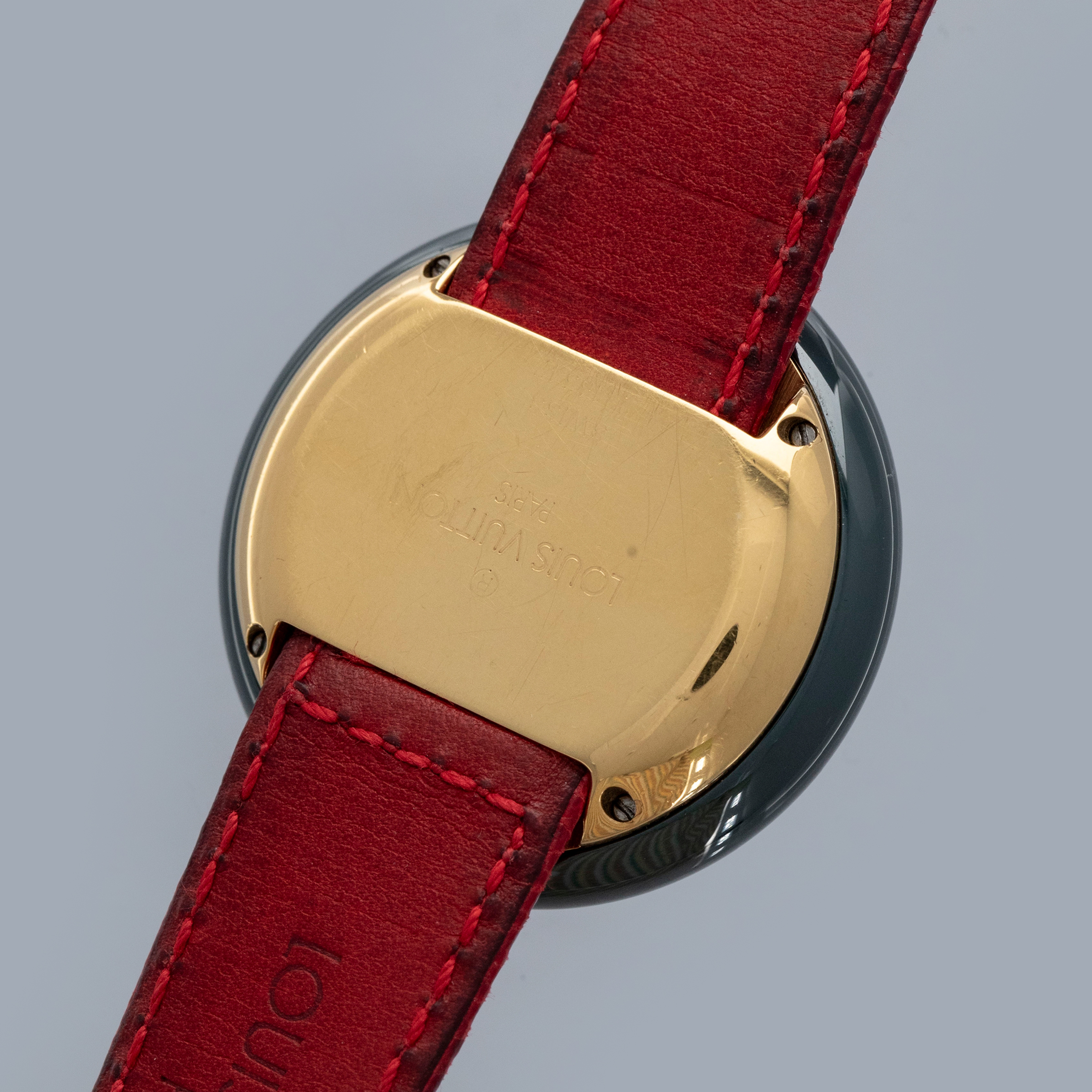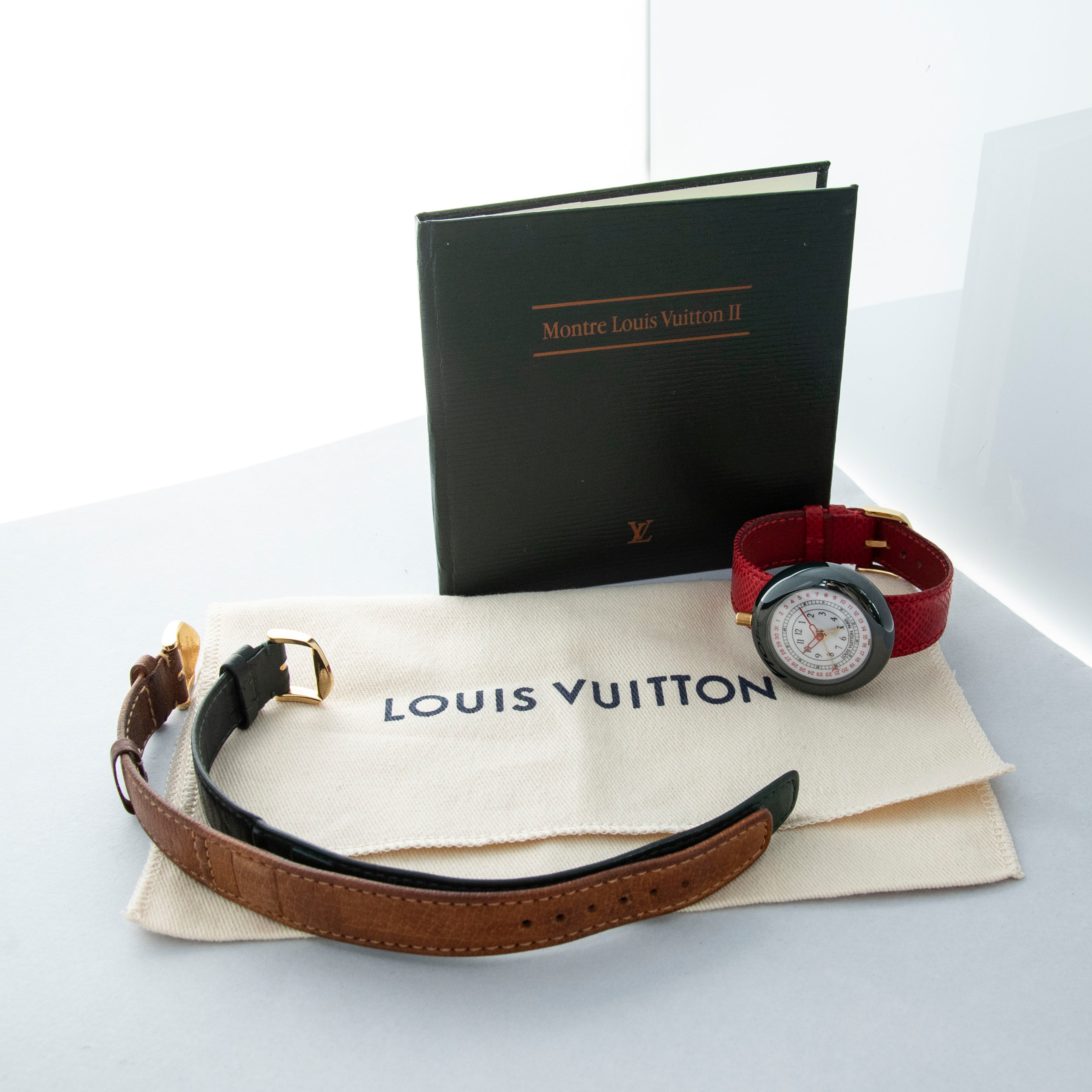 The watch is in overall excellent condition. The ceramic case shows little wear, while the gold-plated case back has light scratches and marks. There is some wear to the screw heads on the case back, which retains well-defined engravings. The dial and hands are near-mint. The leather strap is excellent and comes with the original LV-signed gold-plated buckle. The watch comes complete with its booklet, Louis Vuitton cloth bag, and two spare LV straps.
