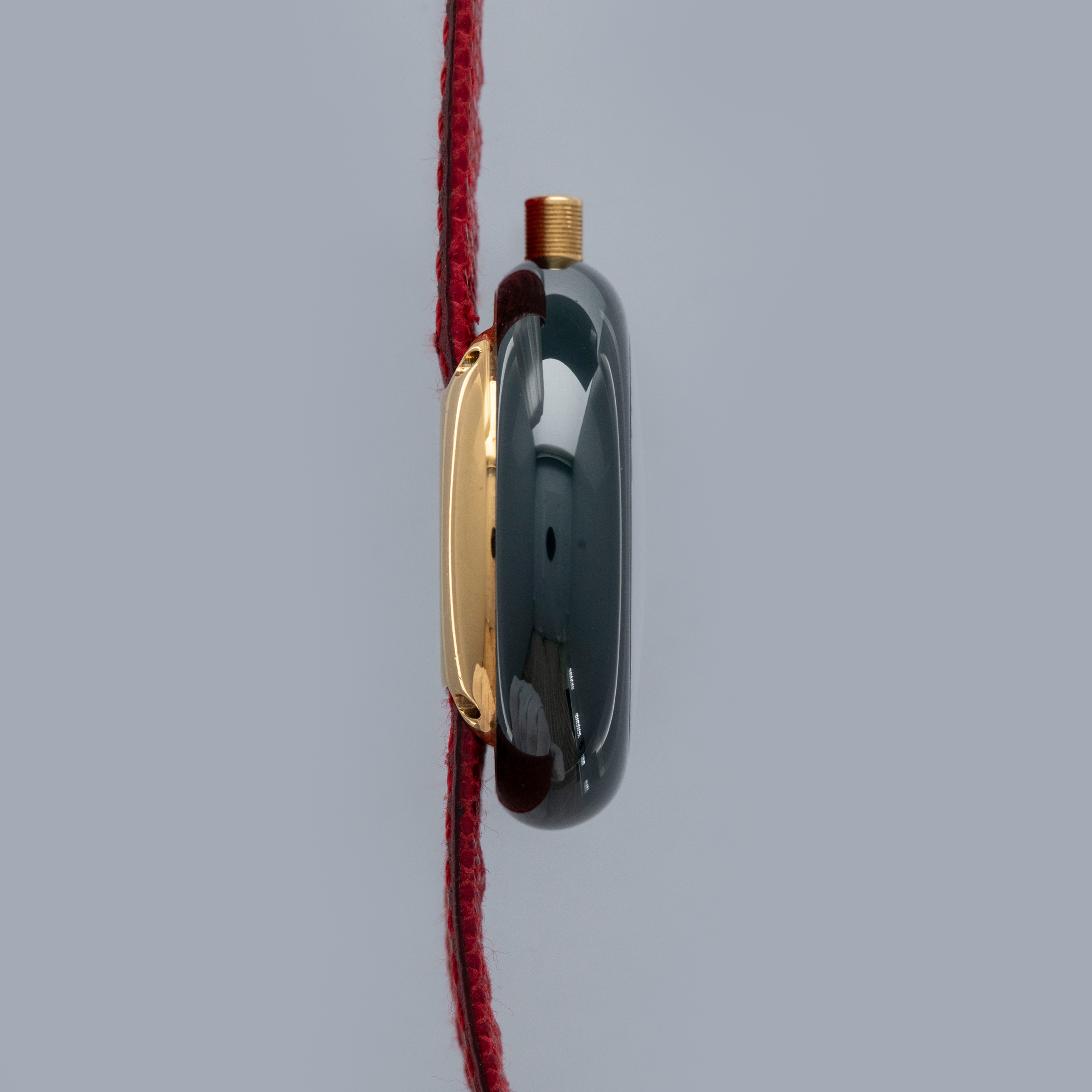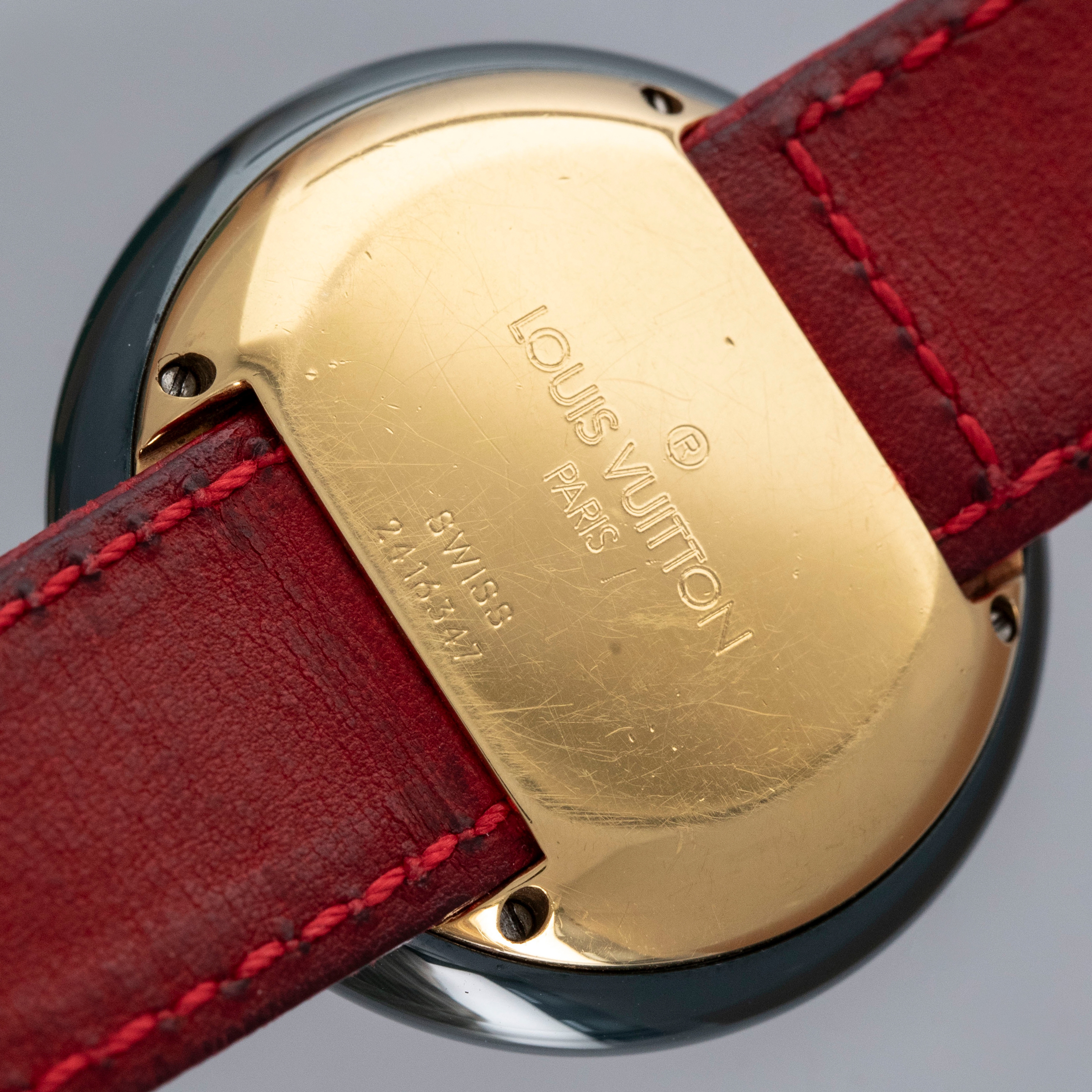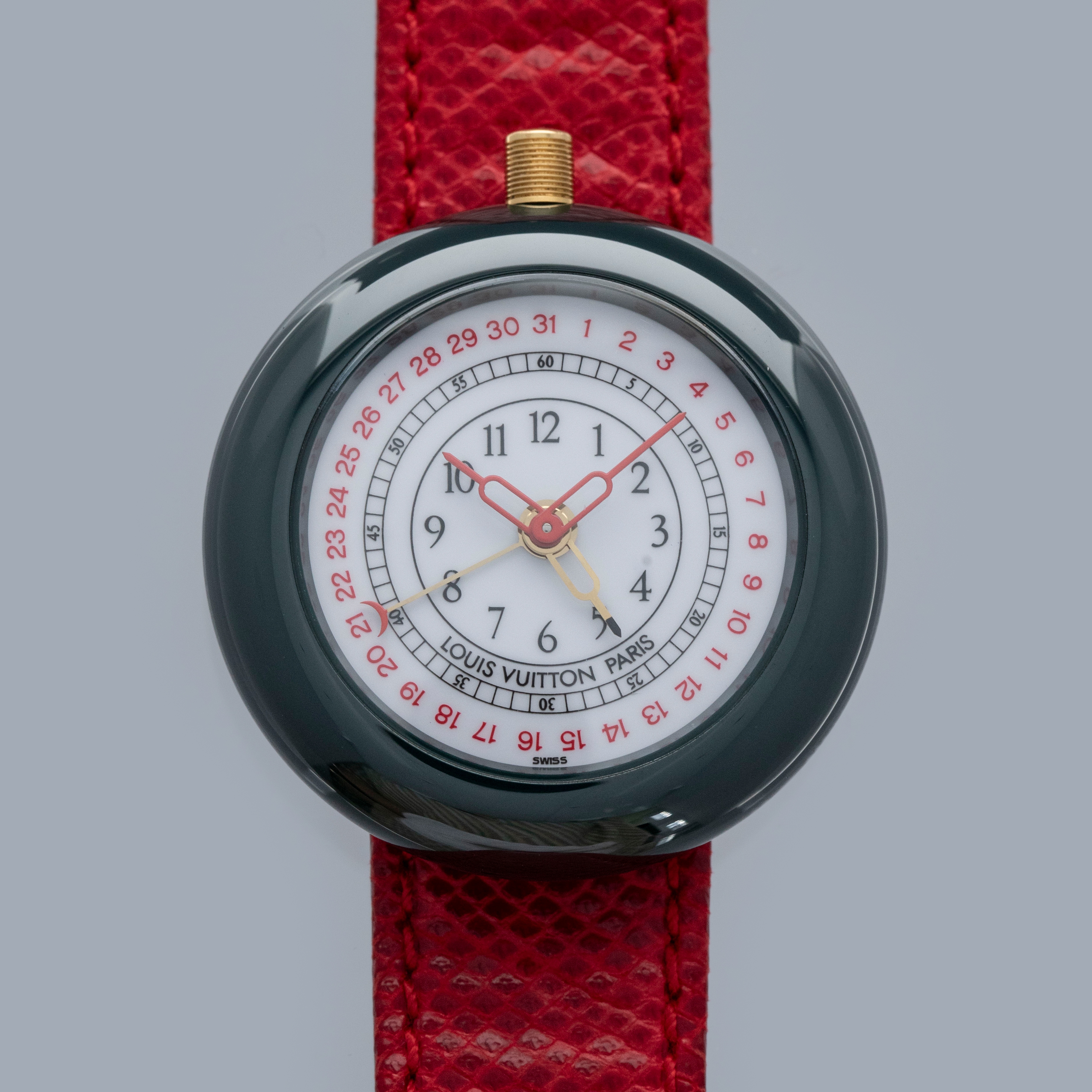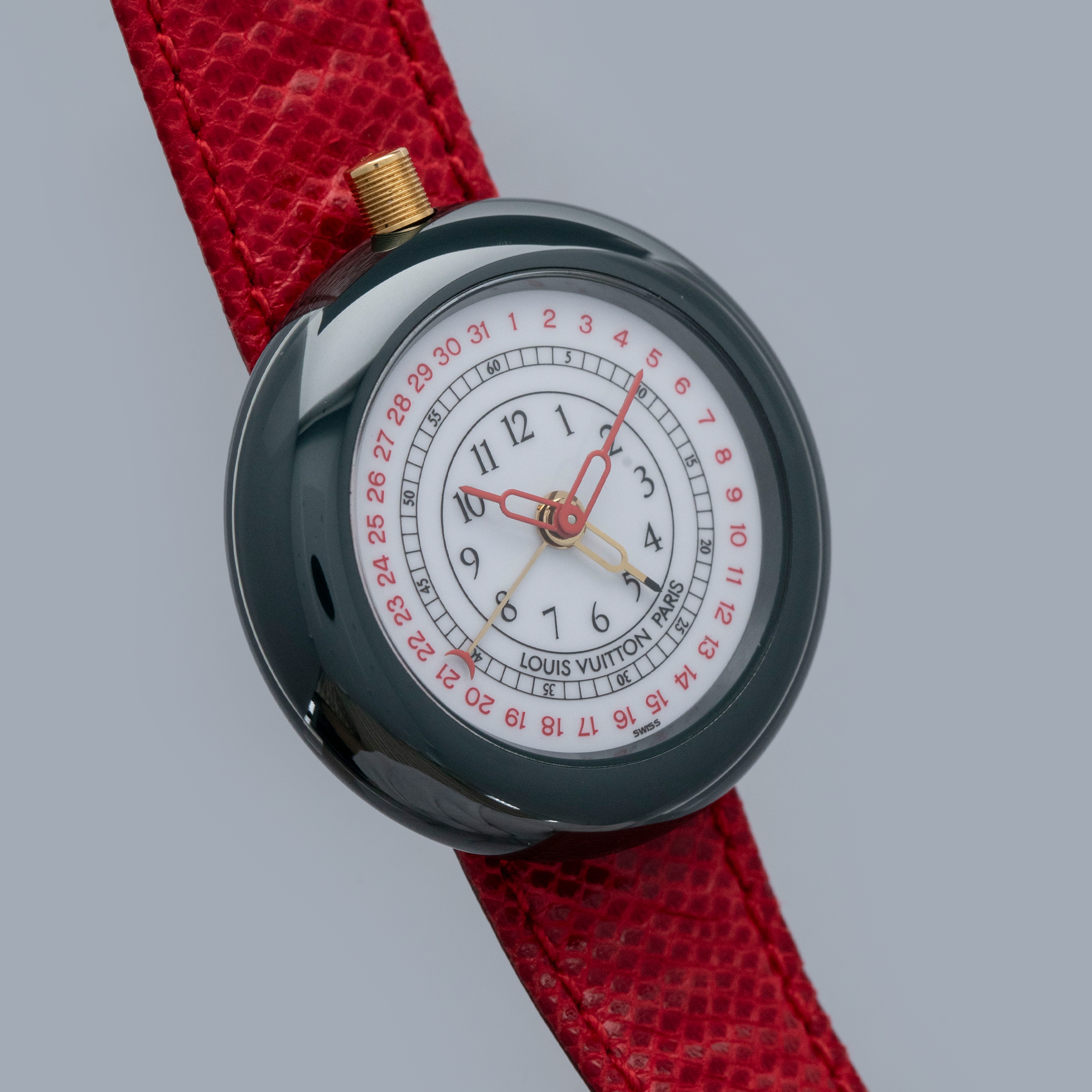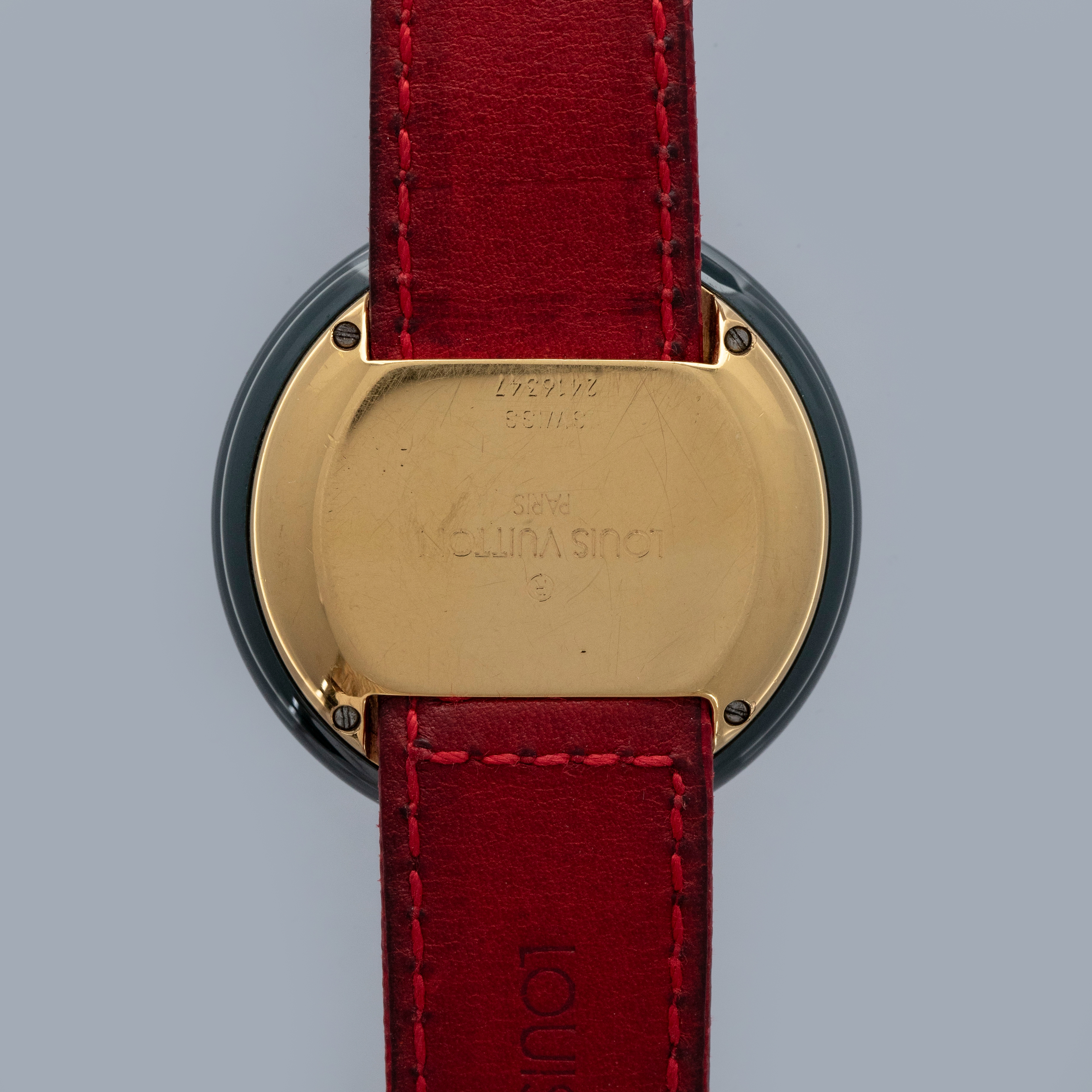 The watch is in overall excellent condition. The ceramic case shows little wear, while the gold-plated case back has light scratches and marks. There is some wear to the screw heads on the case back, which retains well-defined engravings. The dial and hands are near-mint. The leather strap is excellent and comes with the original LV-signed gold-plated buckle. The watch comes complete with its booklet, Louis Vuitton cloth bag, and two spare LV straps.