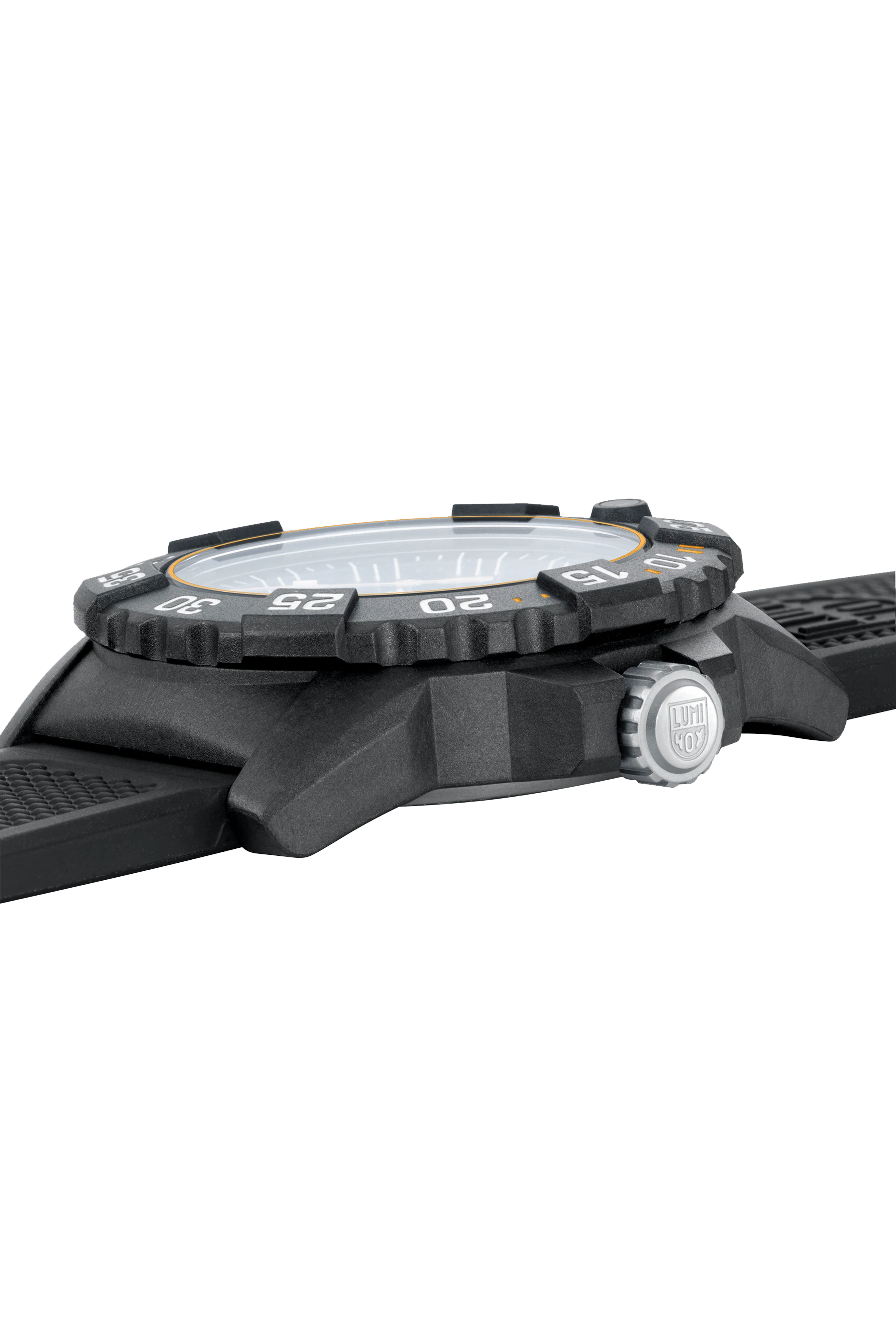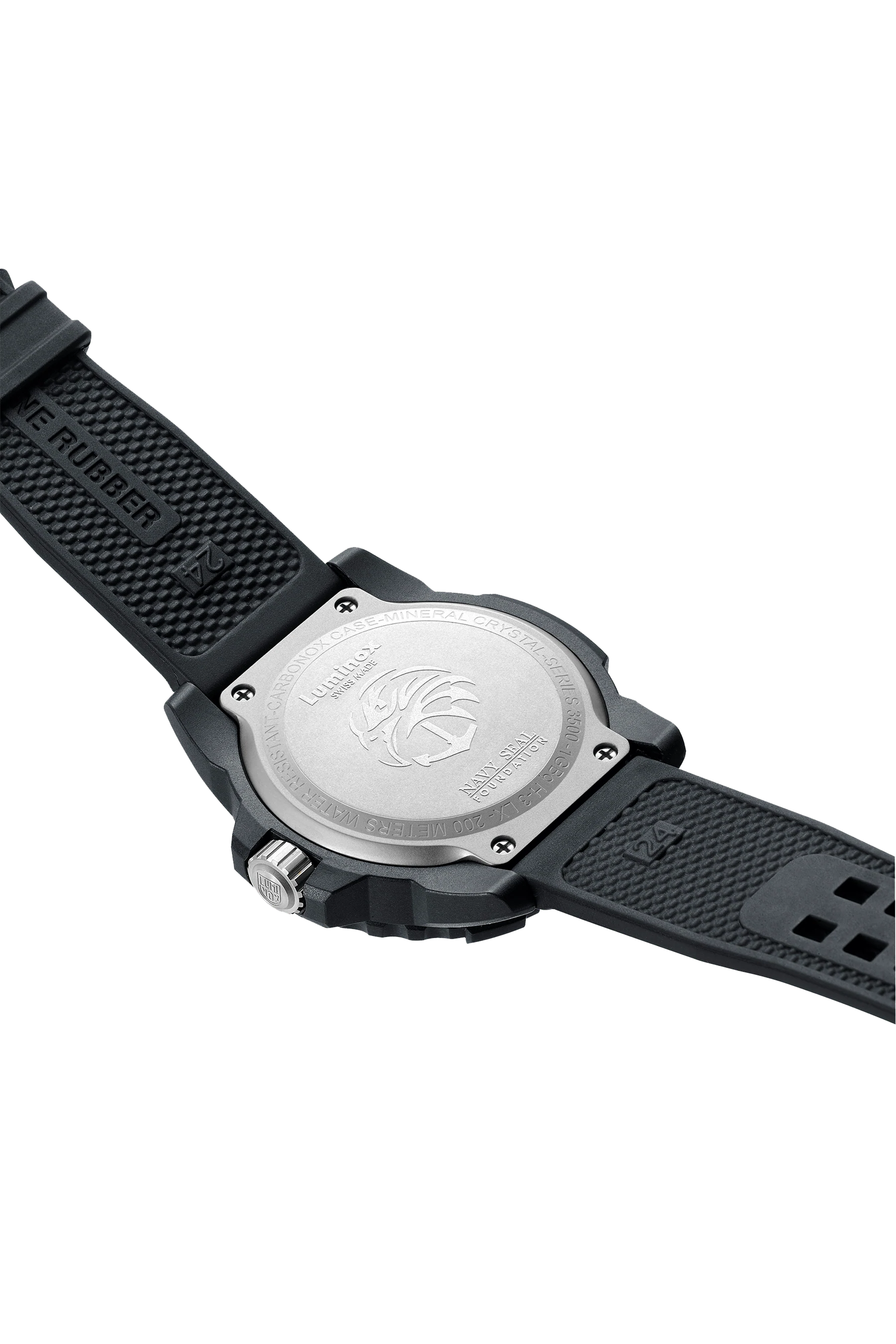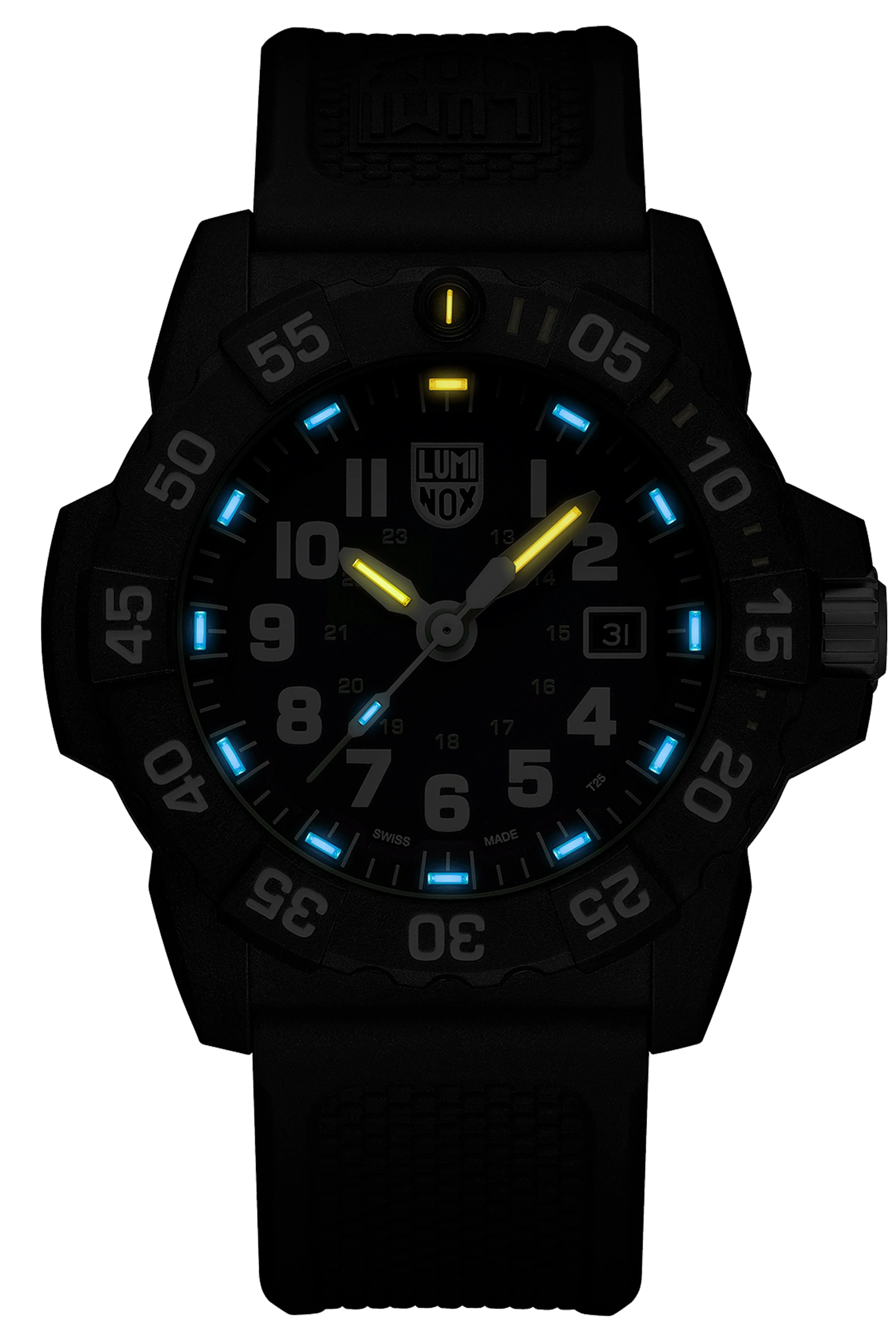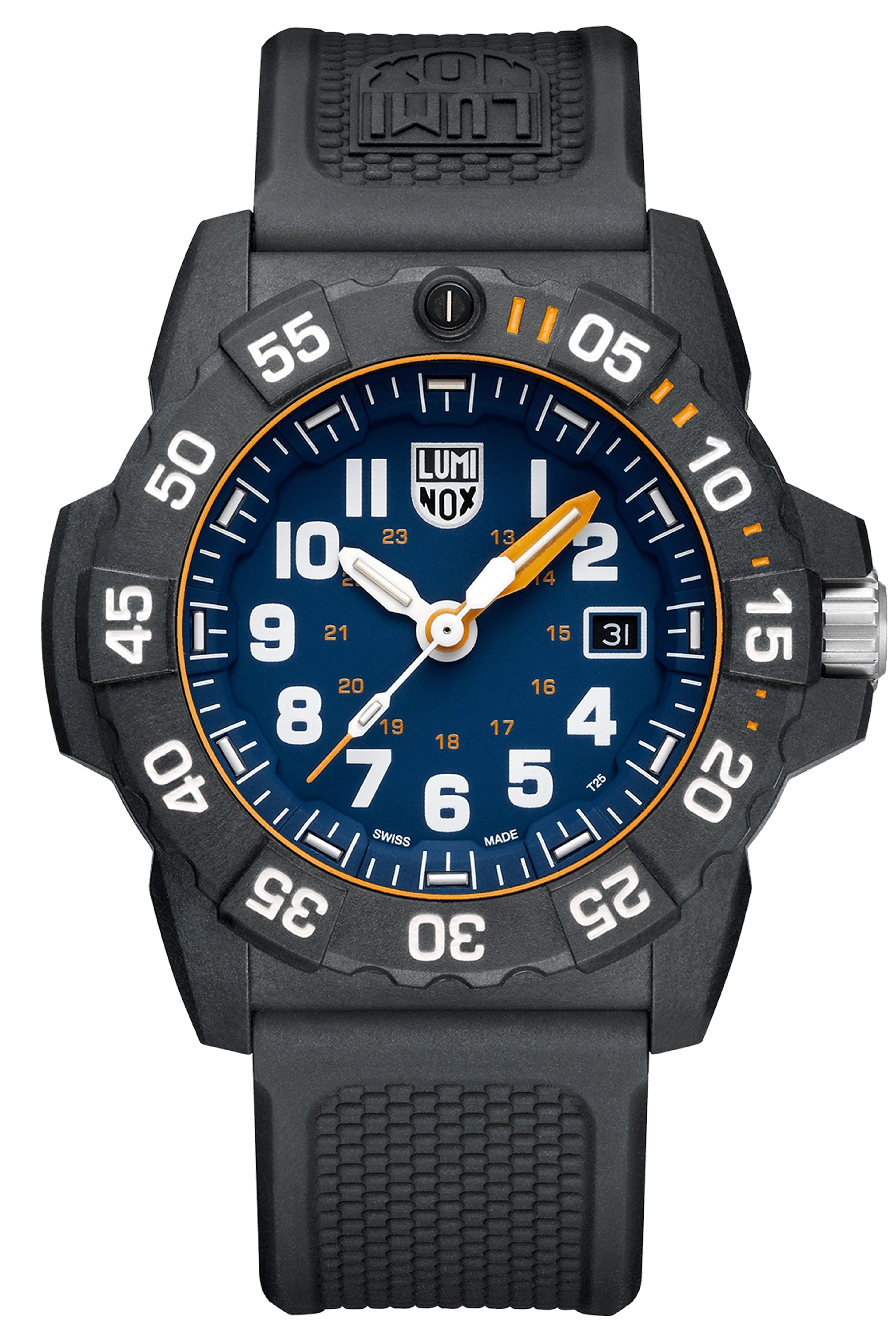 Carbonox case dive watch designed to represent the Navy Seals Foundation, of which Luminox is a partner. The blue and gold colorway represents the colors of the foundation by day, and the blue and yellow glowing tubes represent the foundation in the dark.