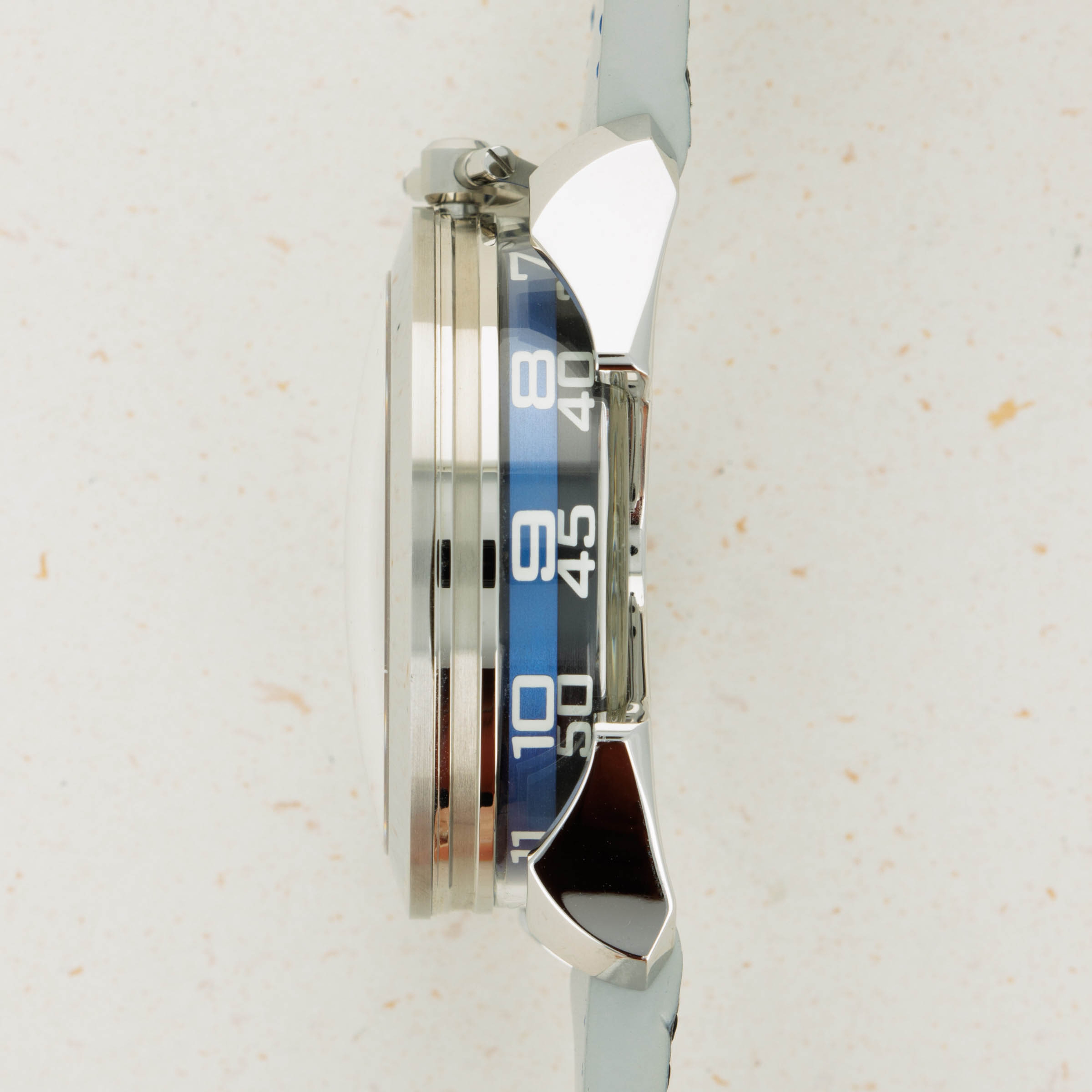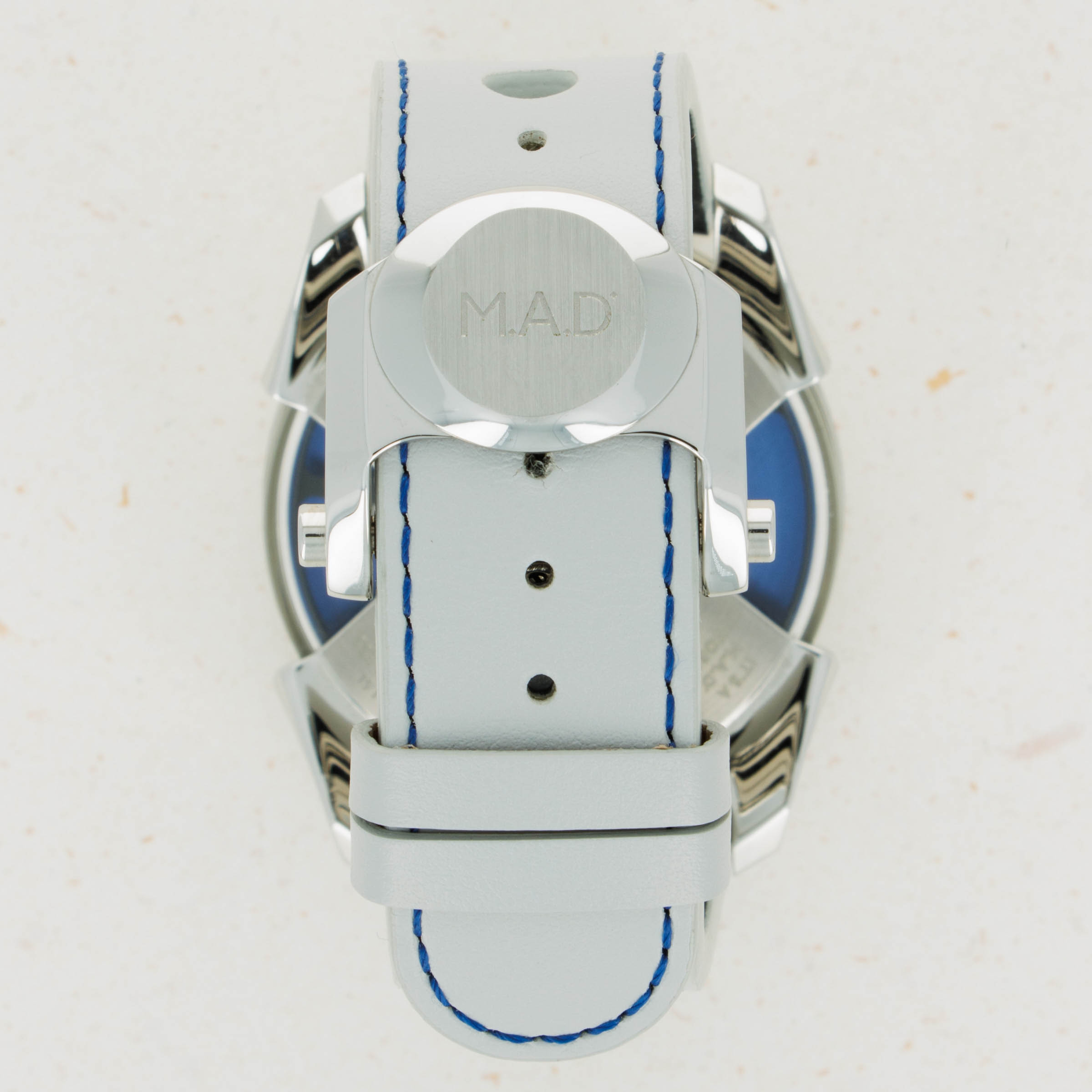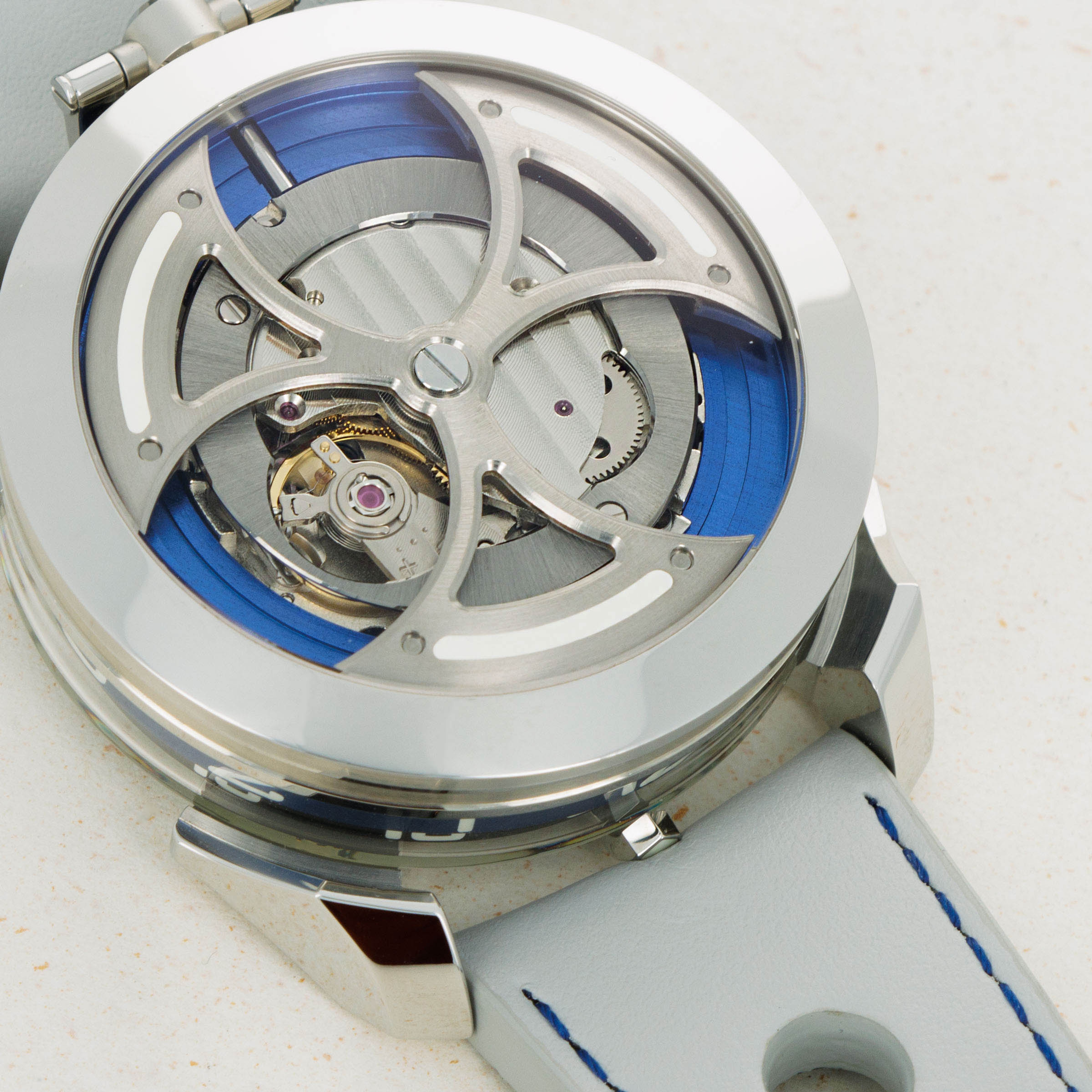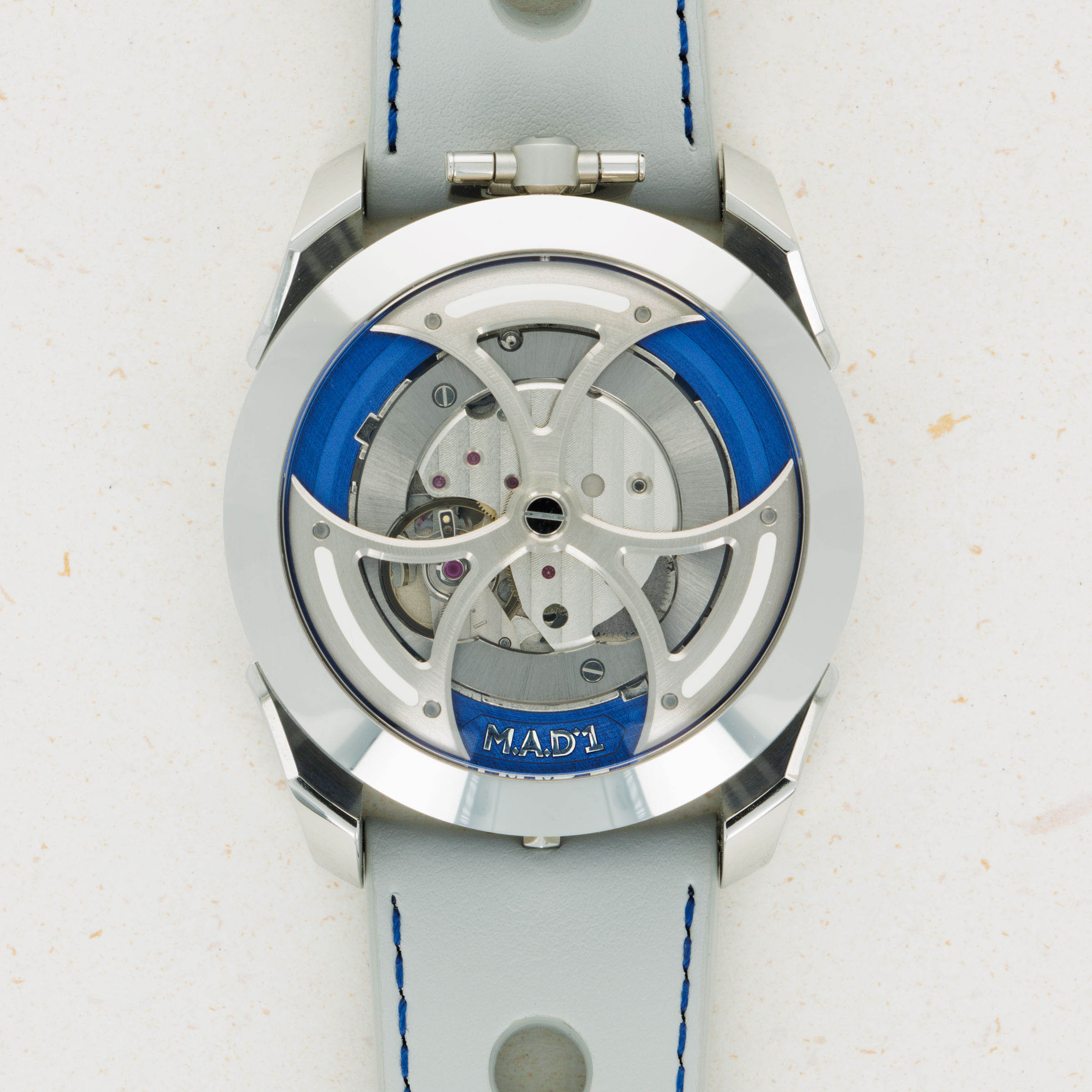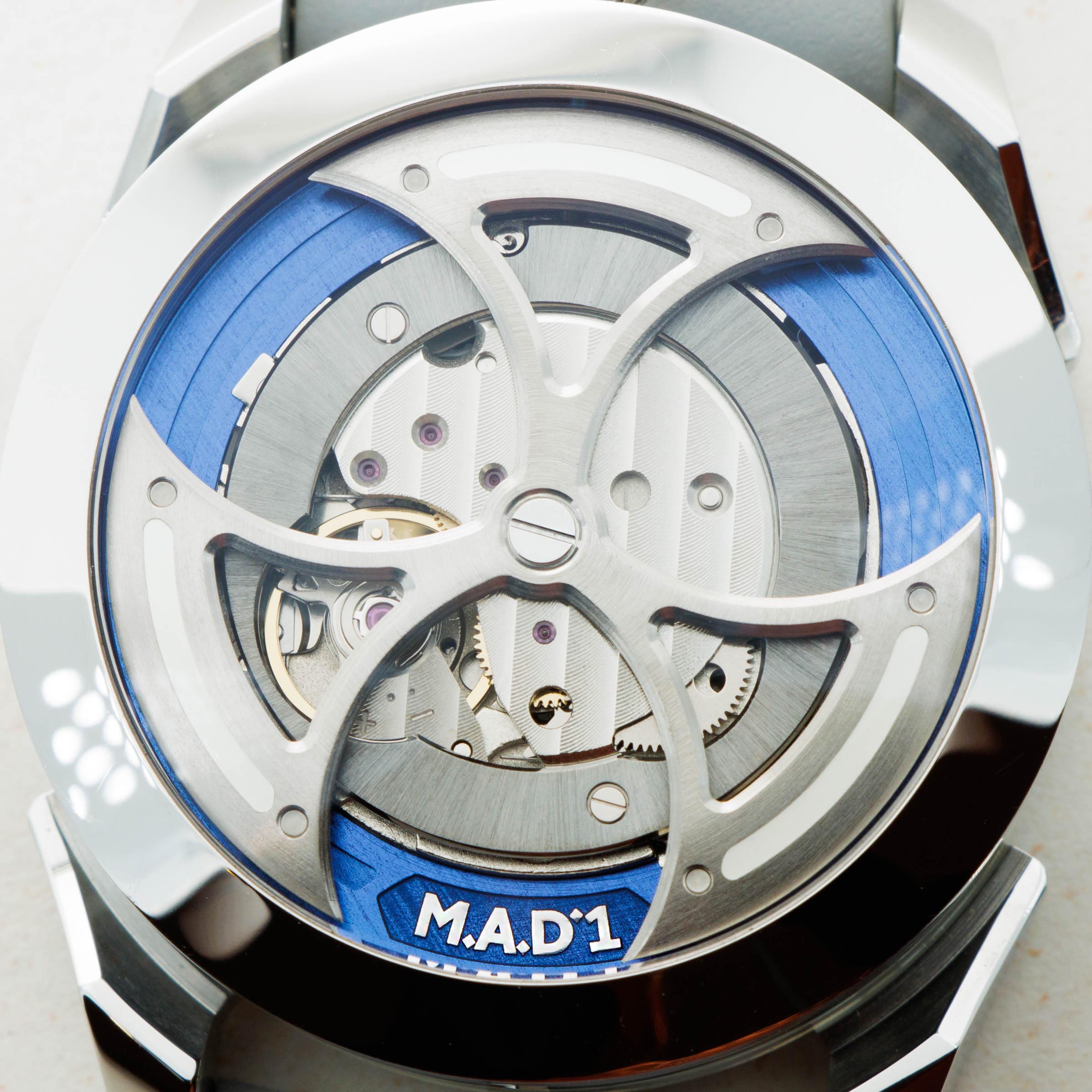 Powered by the heavily modified and upside-down Miyota cal. 821A, the M.A.D. 1's party trick is its incredibly fast spinning triple-blade top-mounted winding rotor which sits atop a blue ring. Quite the spectacle.