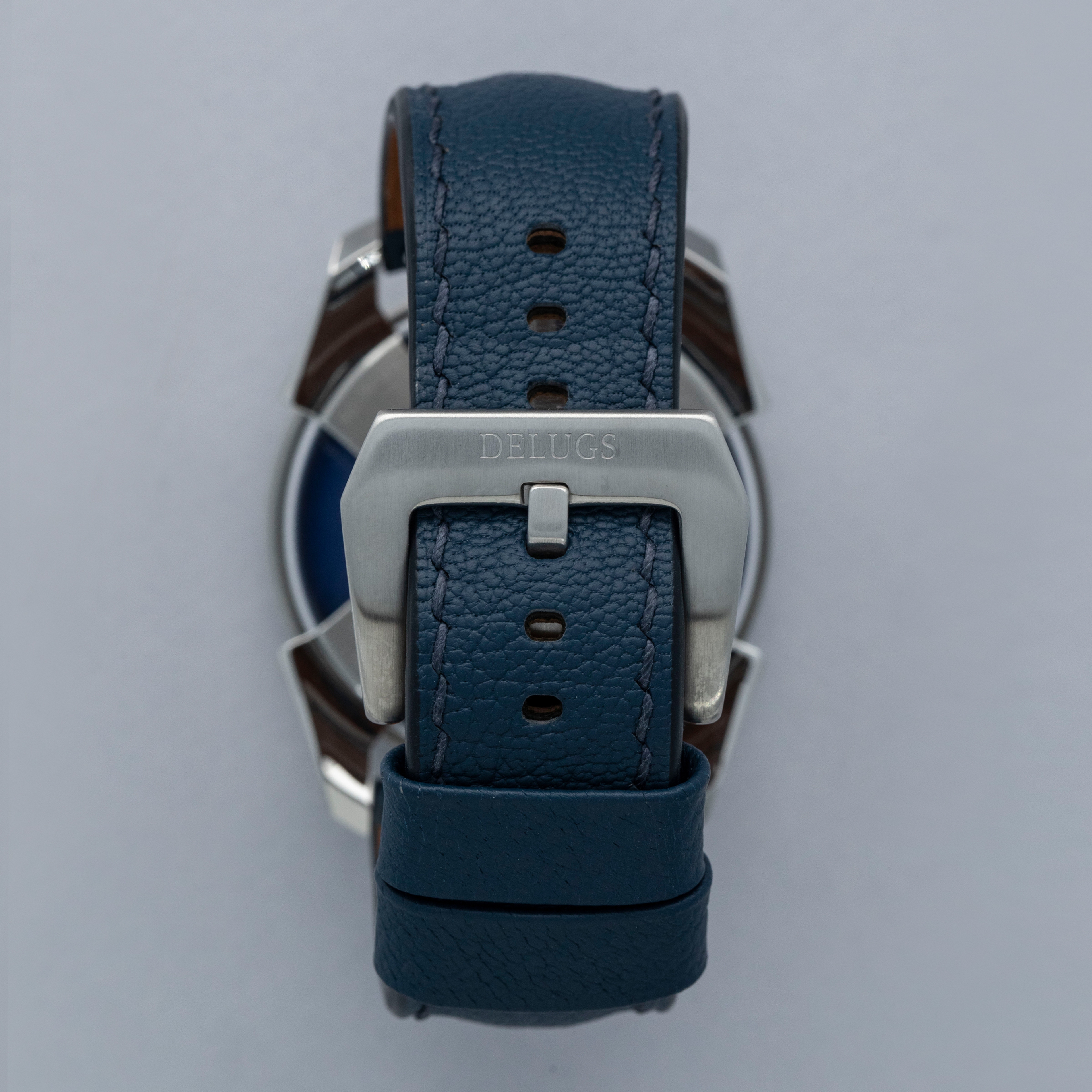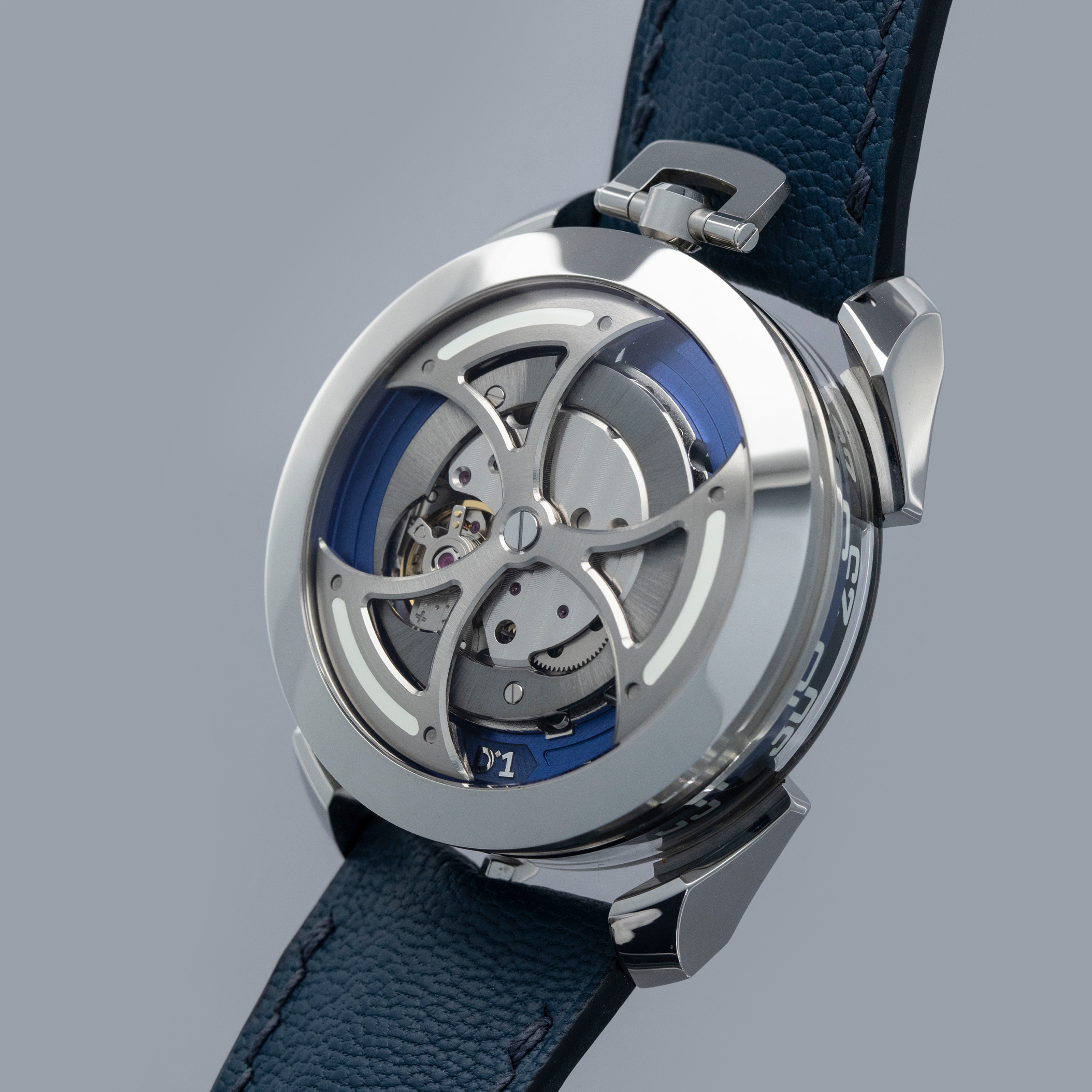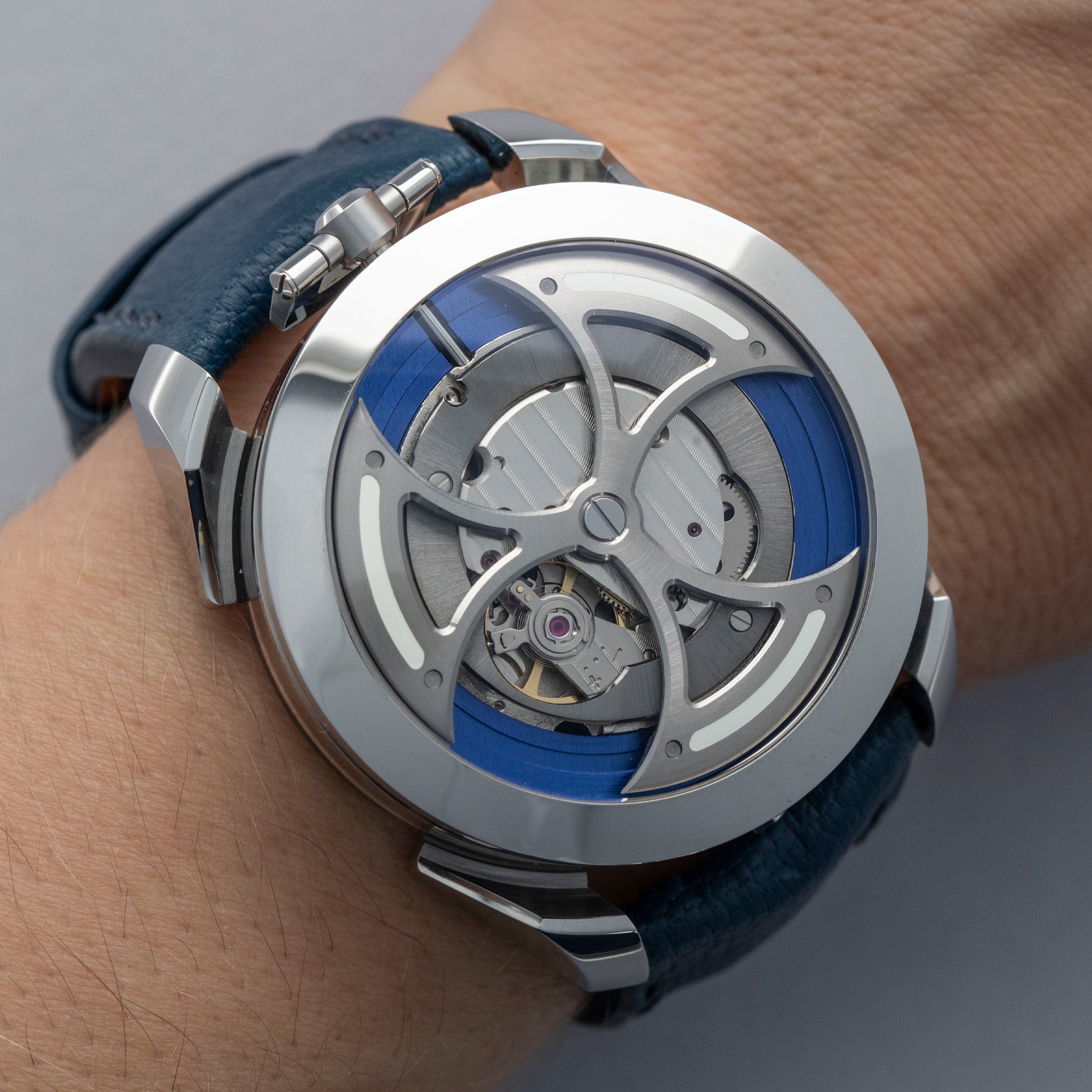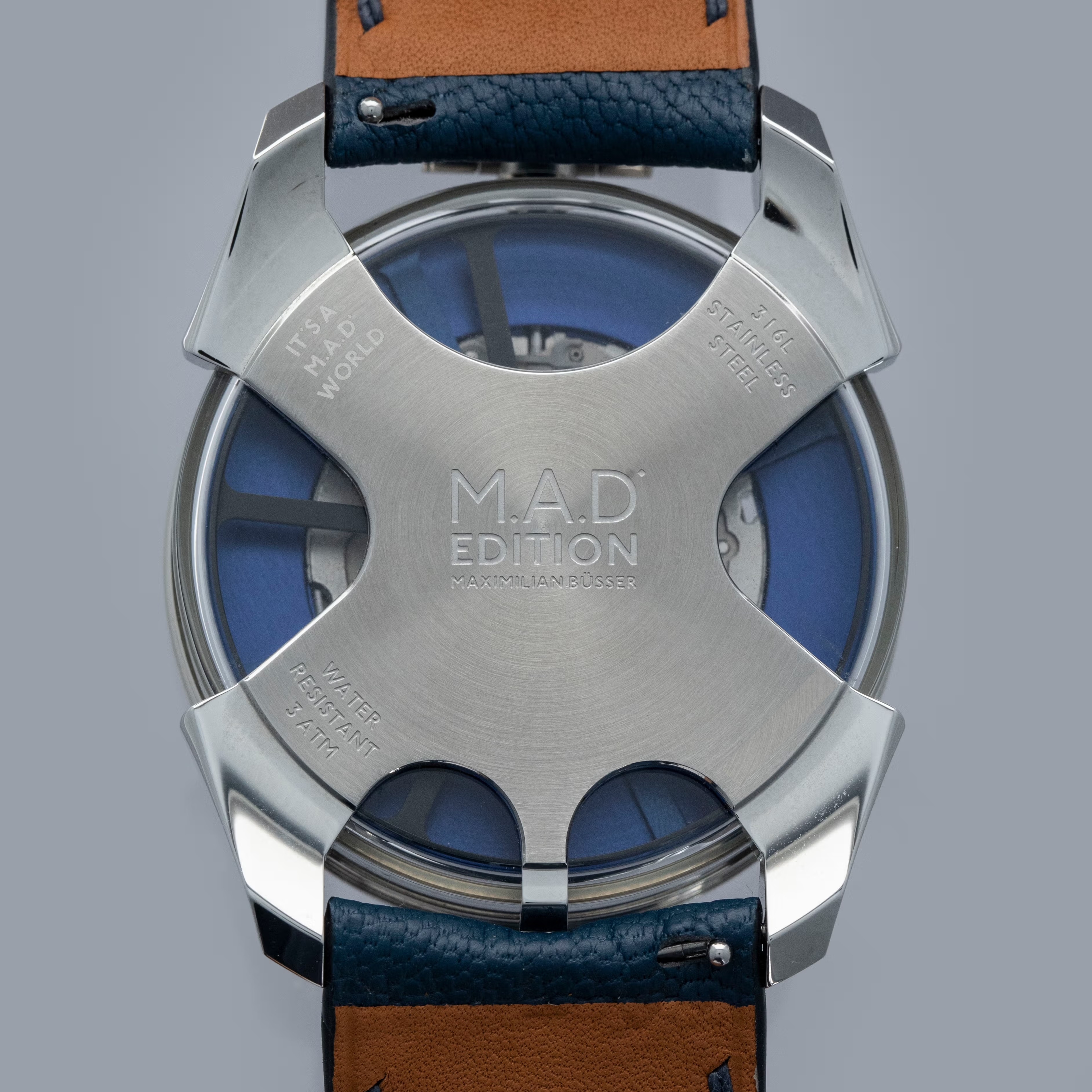Powered by the heavily modified and upside-down Miyota cal. 821A, the M.A.D. 1's party trick is its incredibly fast spinning triple-blade top-mounted winding rotor which sits atop a blue ring. Quite the spectacle.