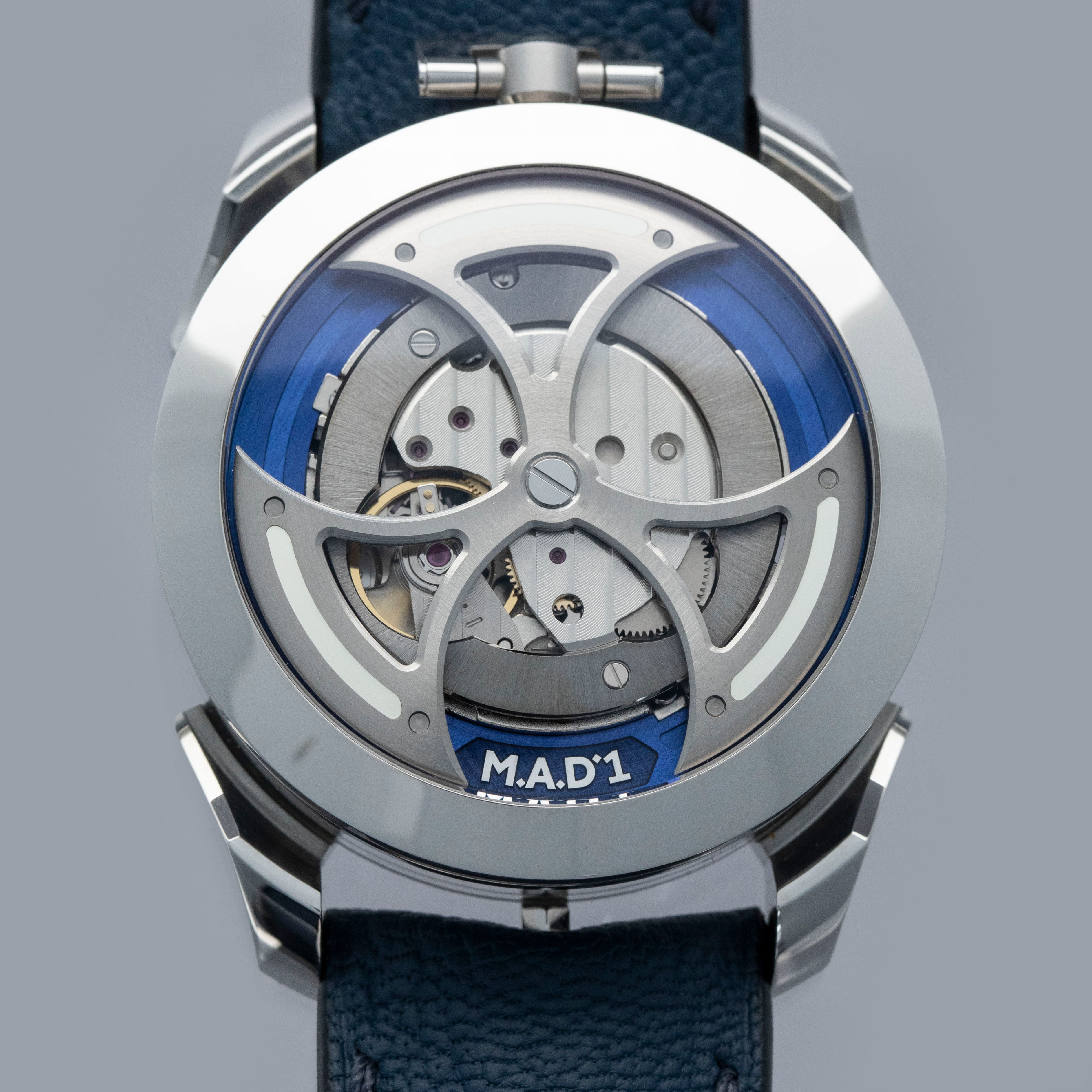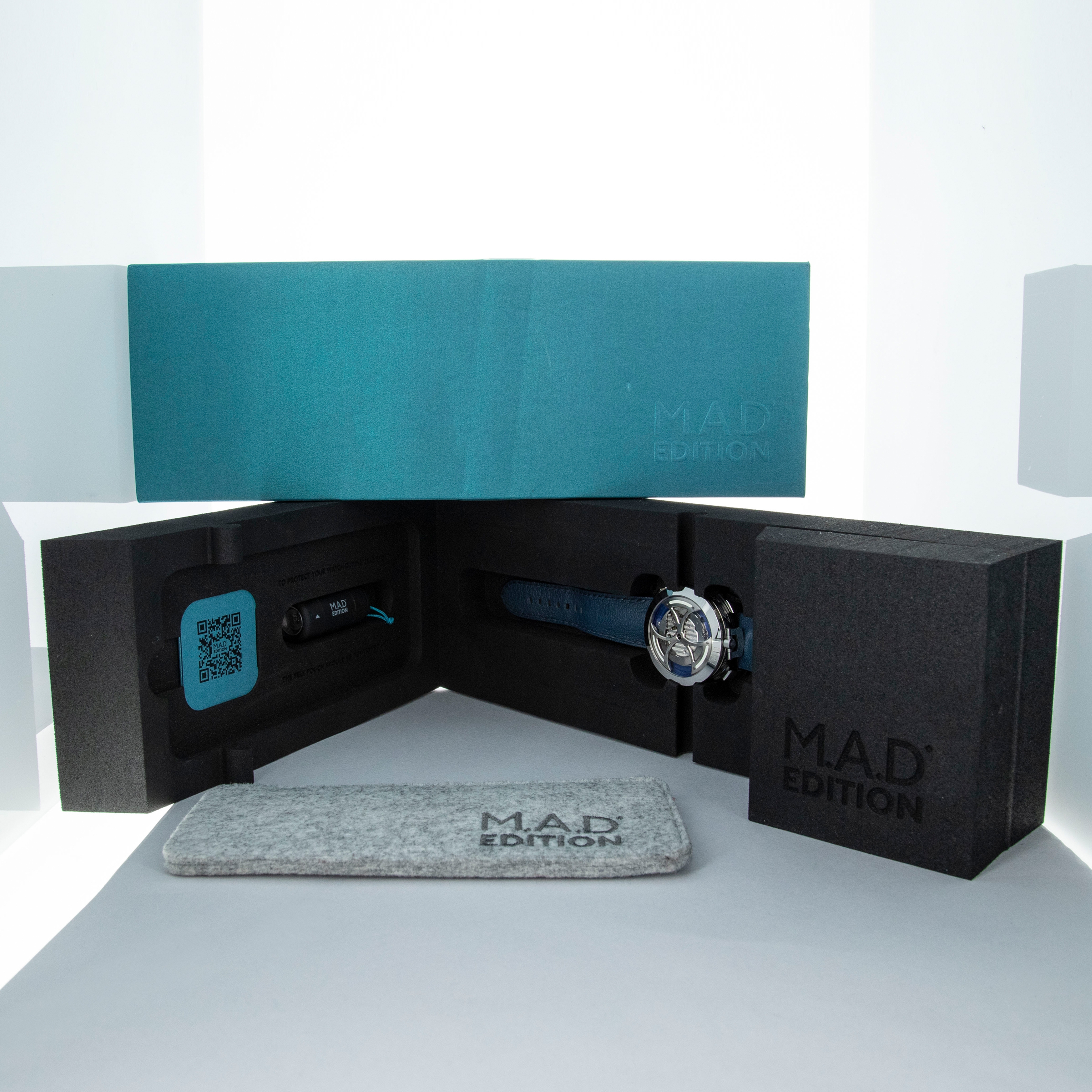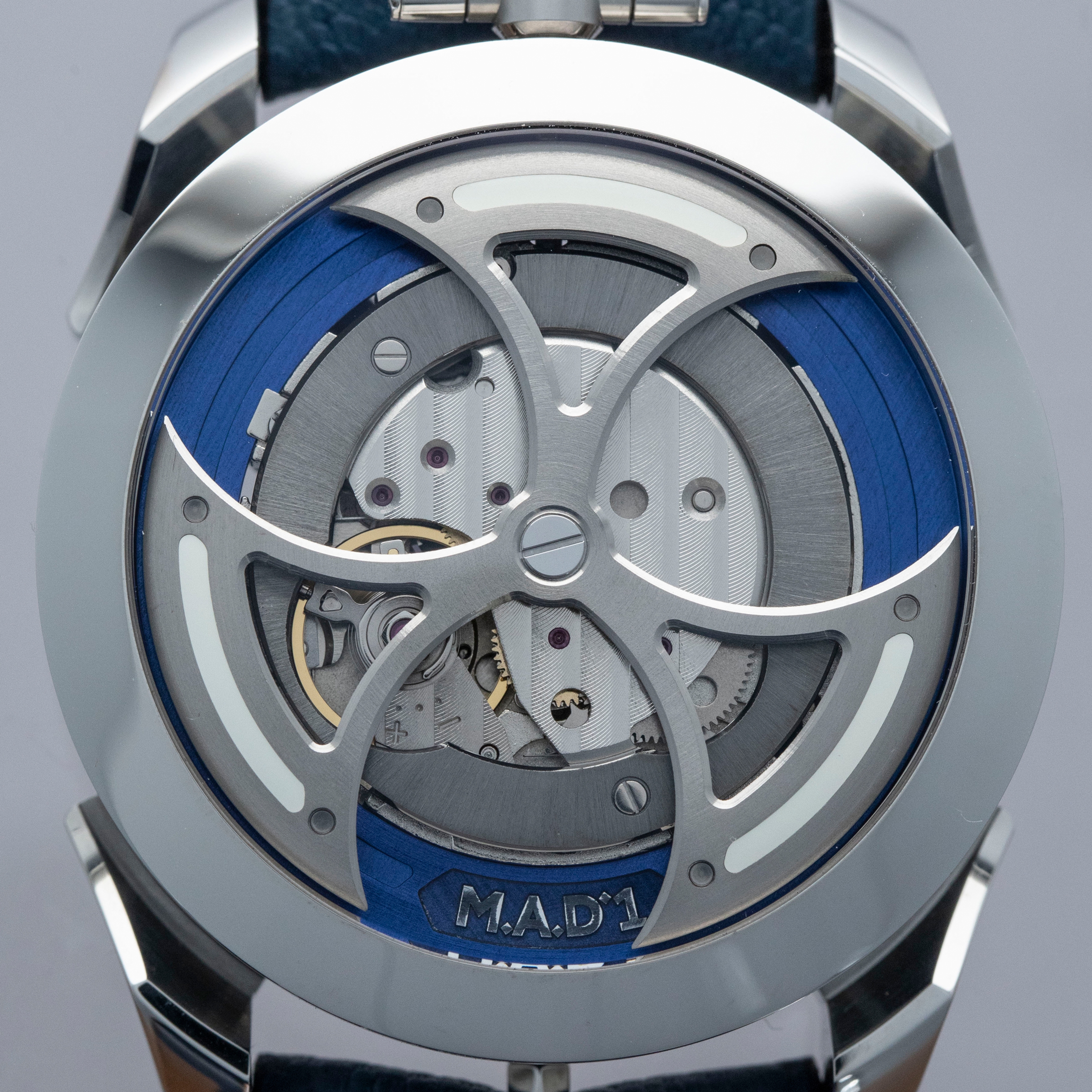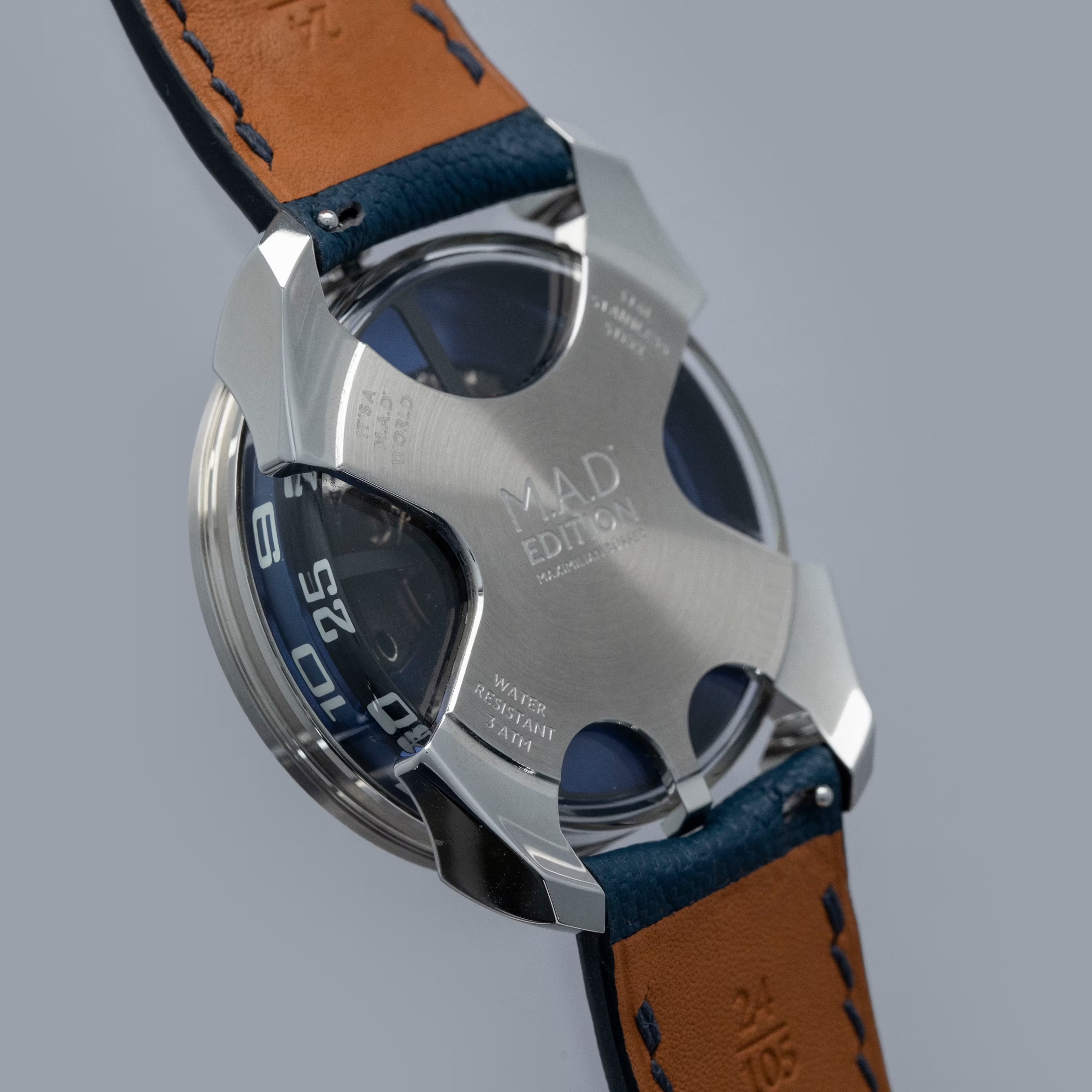 Famed for his flamboyant and eccentric designs, Maximilian Busser of MB&F is perhaps one of the best-known watchmaking CEOs in the world of horology. While his incredibly keen eye for detail has helped establish MB&F at the zenith of watchmaking, it is no surprise that collectors around the world, who he calls the Tribe, have been drawn to his charismatic devotion to his collectors. Powered by this devotion, Max began designing a new timepiece in 2020 that would blend his incredibly unique design language with a price tag that would be far more palatable than what MB&F timepieces are usually accompanied by. Offered only to a small selection of MB&F’s most-valued collectors and friends, the M.A.D. Edition 1 is the result of that design process. Powered by a heavily modified automatic Miyota cal. 821A, the M.A.D. Edition 1 features a lateral time display and a titanium and tungsten triple-blade winding rotor that sits atop its case and spins incredibly fast above a blue aluminum ring. This is then matched by the blue aluminum ring that rotates around the case as the hour display, which features a grey minute ring beneath it which rotates the very same way. An incredibly personal piece of design from Max’s perspective and an incredibly cool-looking and rare timepiece from the wider-watch community’s perspective, the M.A.D. 1 is as rare a timepiece as it is unique, and this is the perfect opportunity to add one to your collection.