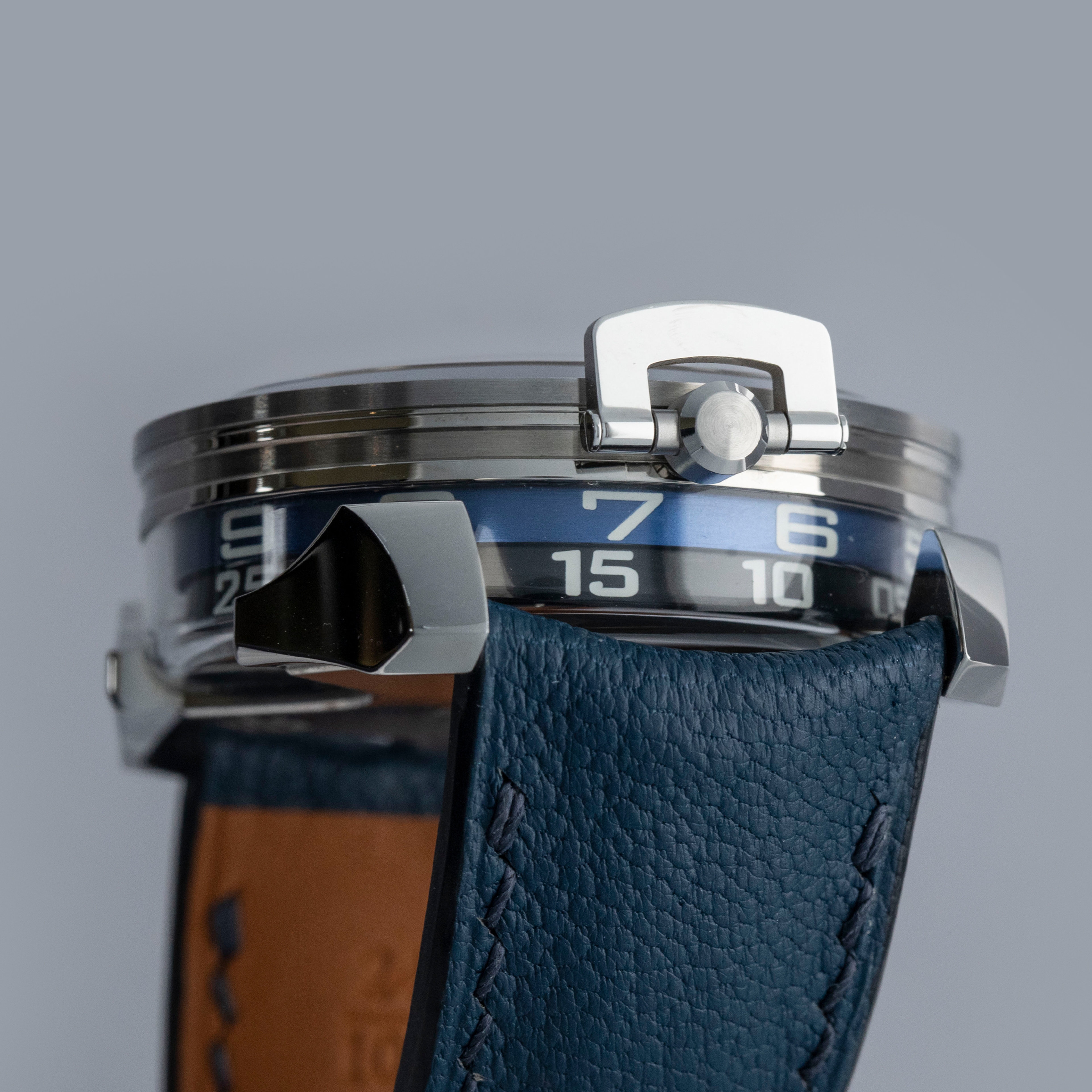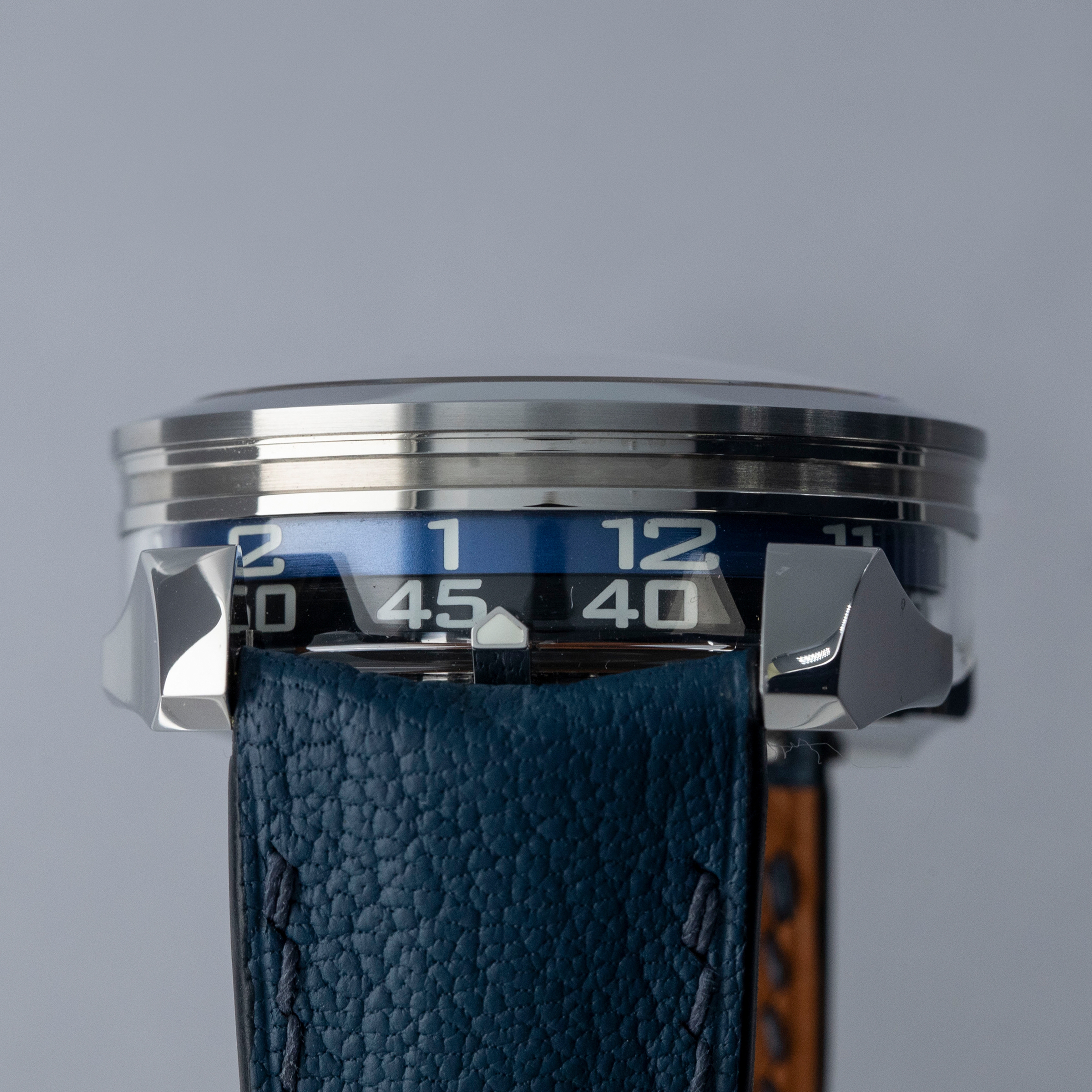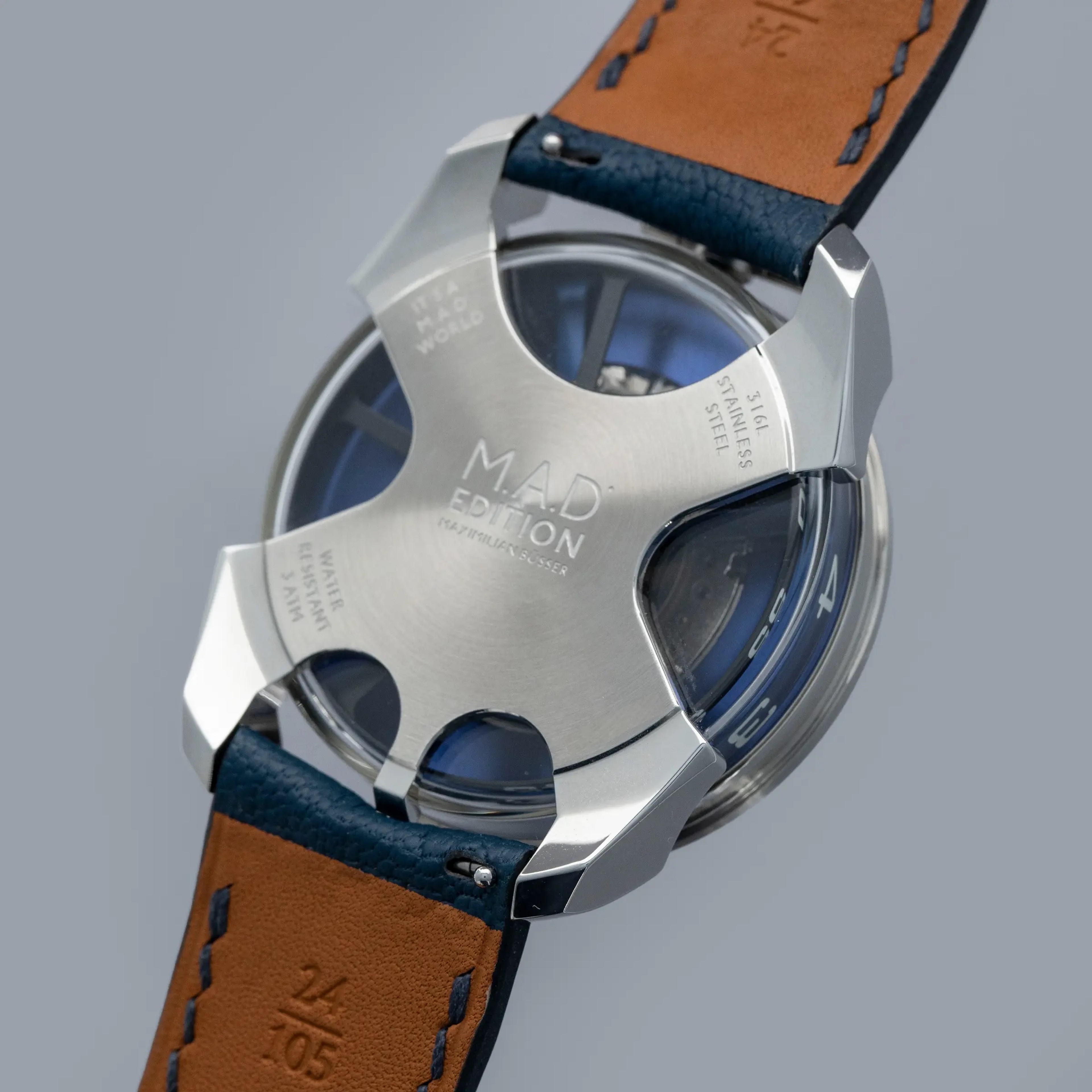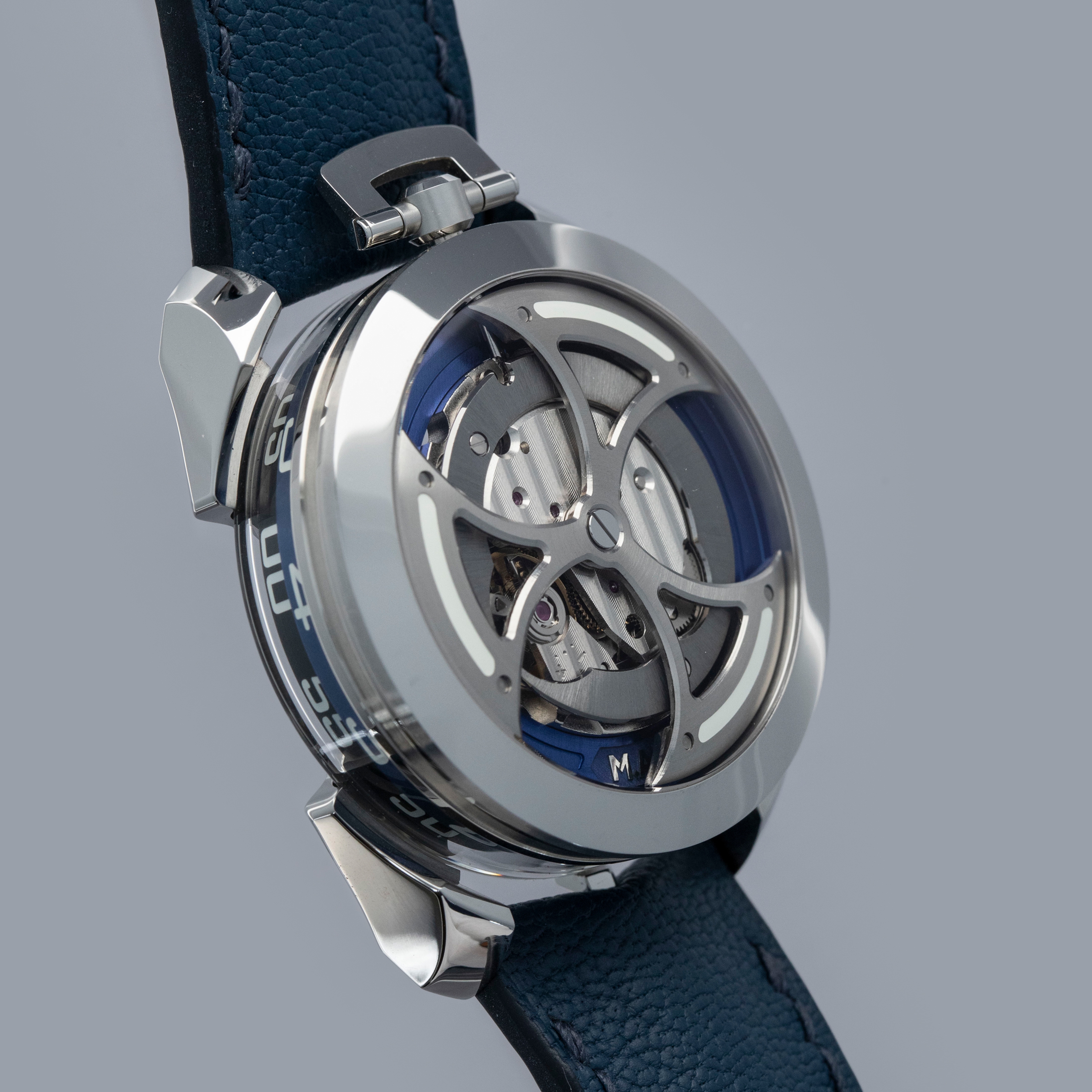 Famed for his flamboyant and eccentric designs, Maximilian Busser of MB&F is perhaps one of the best-known watchmaking CEOs in the world of horology. While his incredibly keen eye for detail has helped establish MB&F at the zenith of watchmaking, it is no surprise that collectors around the world, who he calls the Tribe, have been drawn to his charismatic devotion to his collectors. Powered by this devotion, Max began designing a new timepiece in 2020 that would blend his incredibly unique design language with a price tag that would be far more palatable than what MB&F timepieces are usually accompanied by. Offered only to a small selection of MB&F’s most-valued collectors and friends, the M.A.D. Edition 1 is the result of that design process. Powered by a heavily modified automatic Miyota cal. 821A, the M.A.D. Edition 1 features a lateral time display and a titanium and tungsten triple-blade winding rotor that sits atop its case and spins incredibly fast above a blue aluminum ring. This is then matched by the blue aluminum ring that rotates around the case as the hour display, which features a grey minute ring beneath it which rotates the very same way. An incredibly personal piece of design from Max’s perspective and an incredibly cool-looking and rare timepiece from the wider-watch community’s perspective, the M.A.D. 1 is as rare a timepiece as it is unique, and this is the perfect opportunity to add one to your collection.