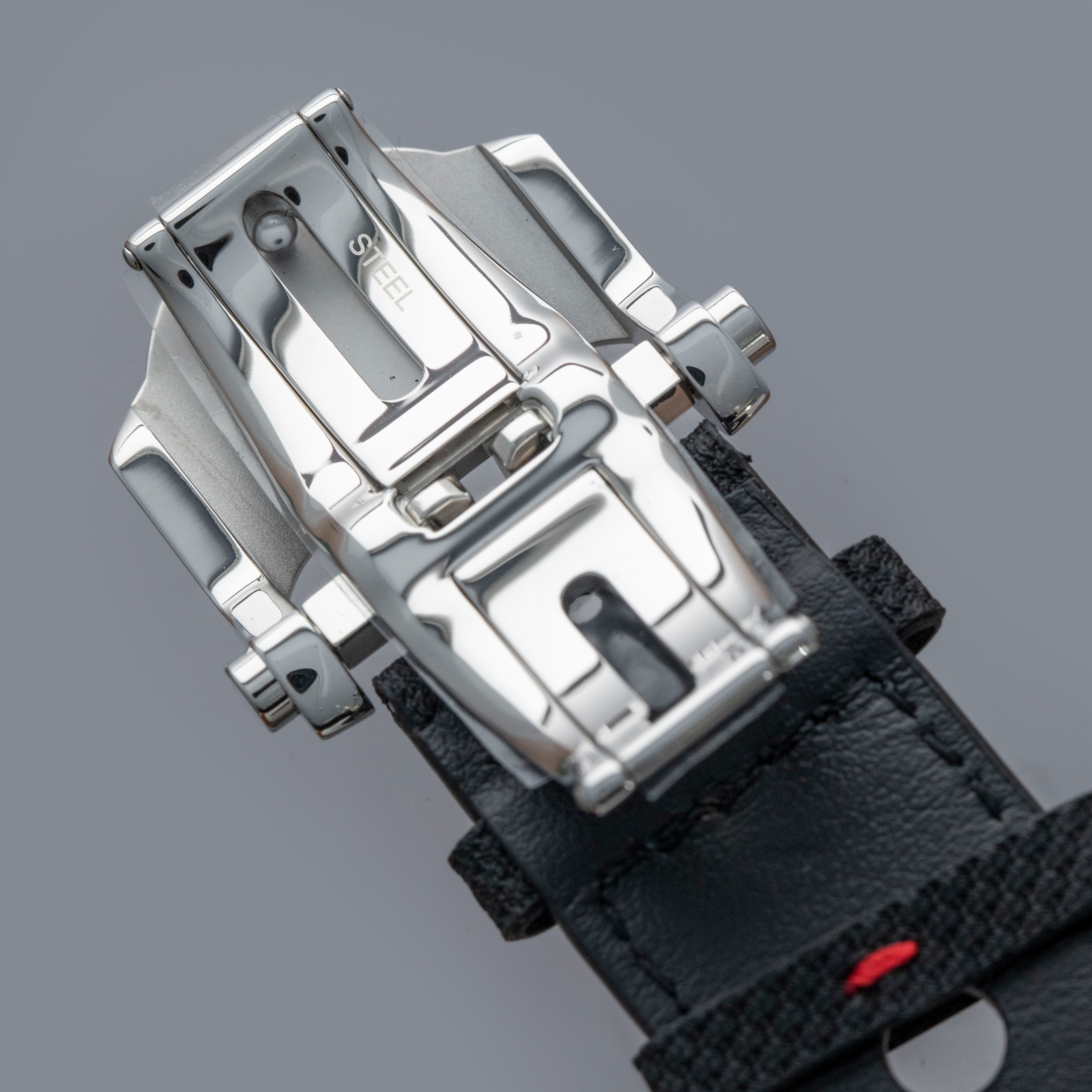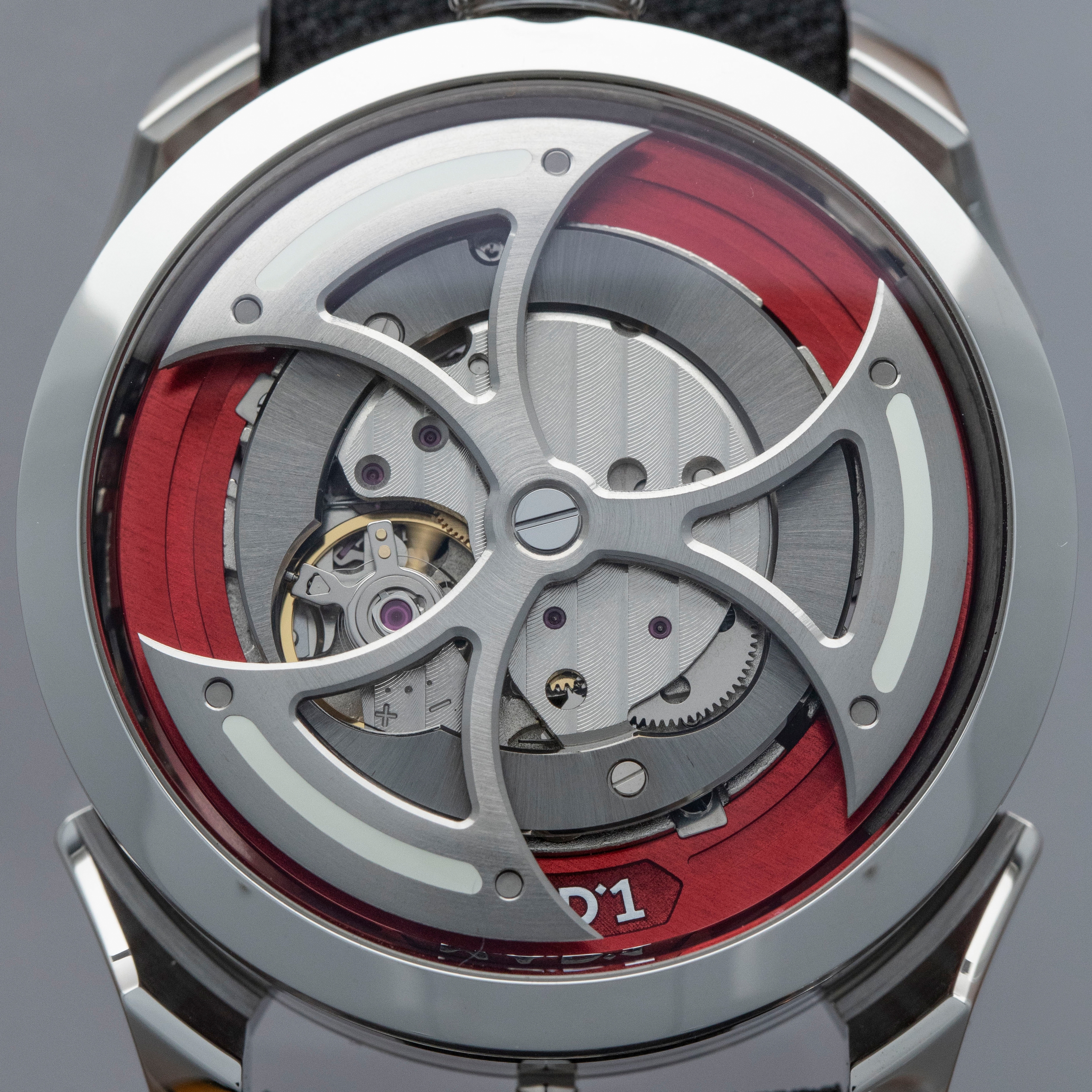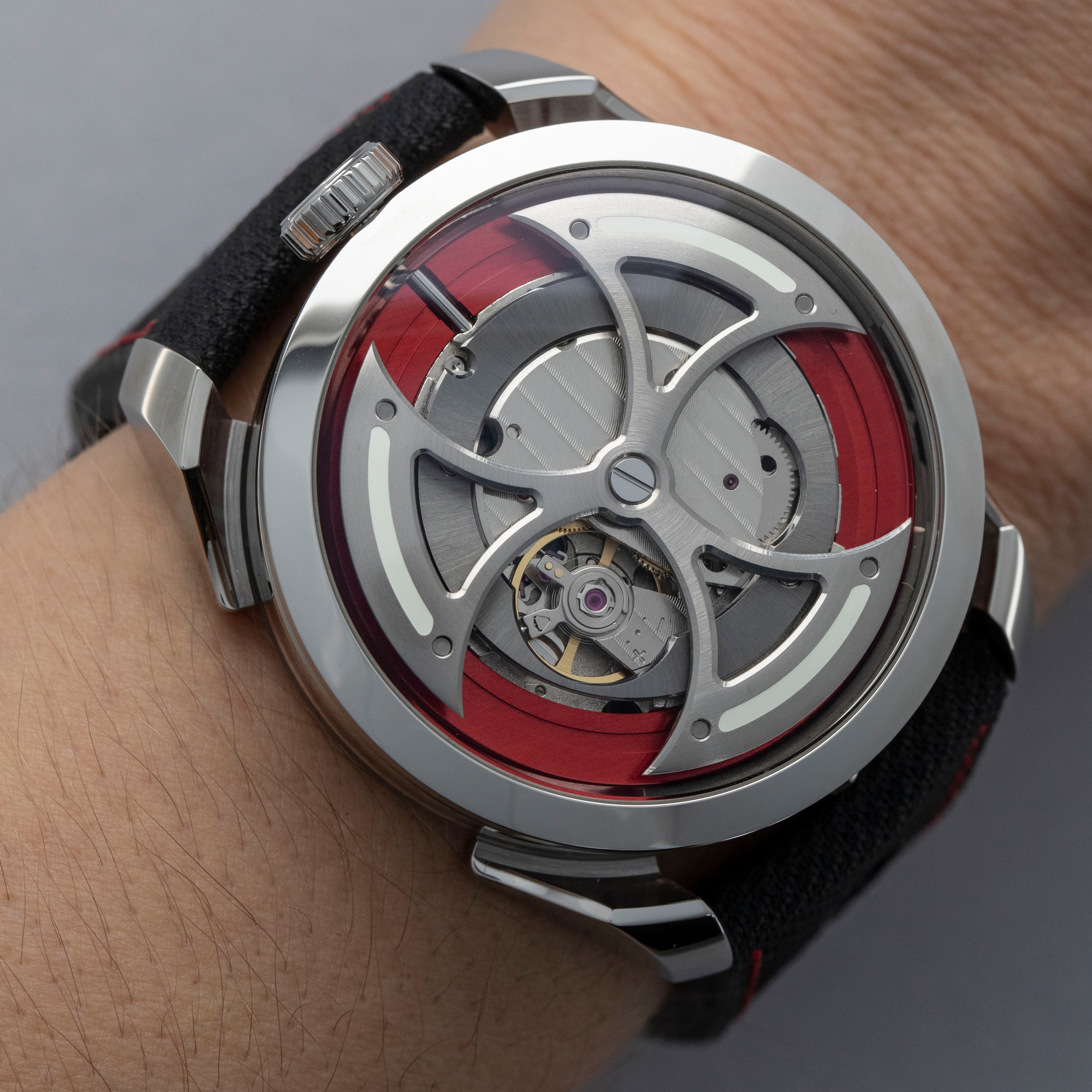 Powered by the heavily modified and upside-down Miyota cal. 821A, the M.A.D. 1's party trick is its incredibly fast spinning triple-blade top-mounted winding rotor which sits atop a red ring. Quite the spectacle.