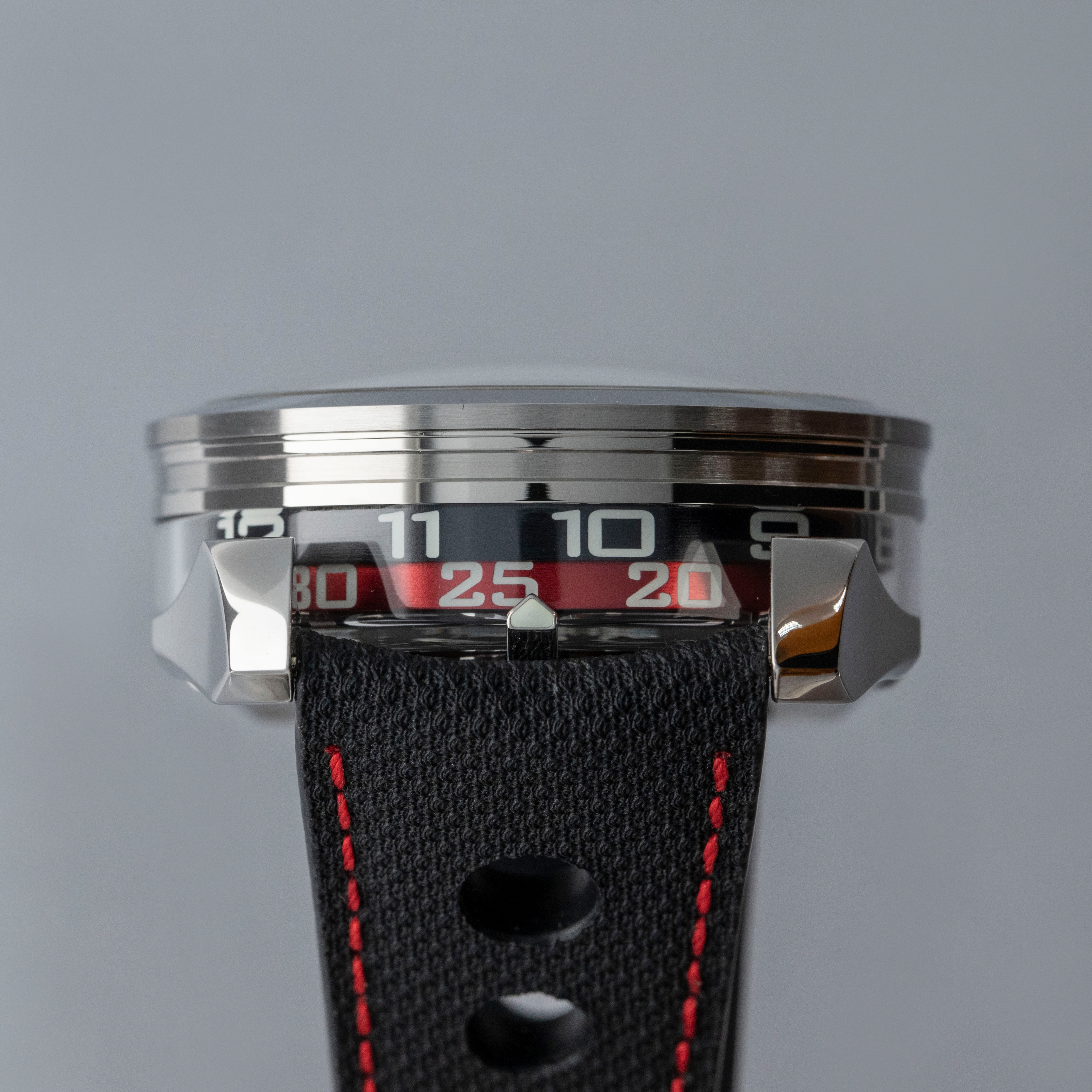 While tall at 18.8mm, it is a practical element of the M.A.D. 1's display with its unique lateral time indication using two aluminum rings that rotate around its stainless steel case to display the hours and minutes.