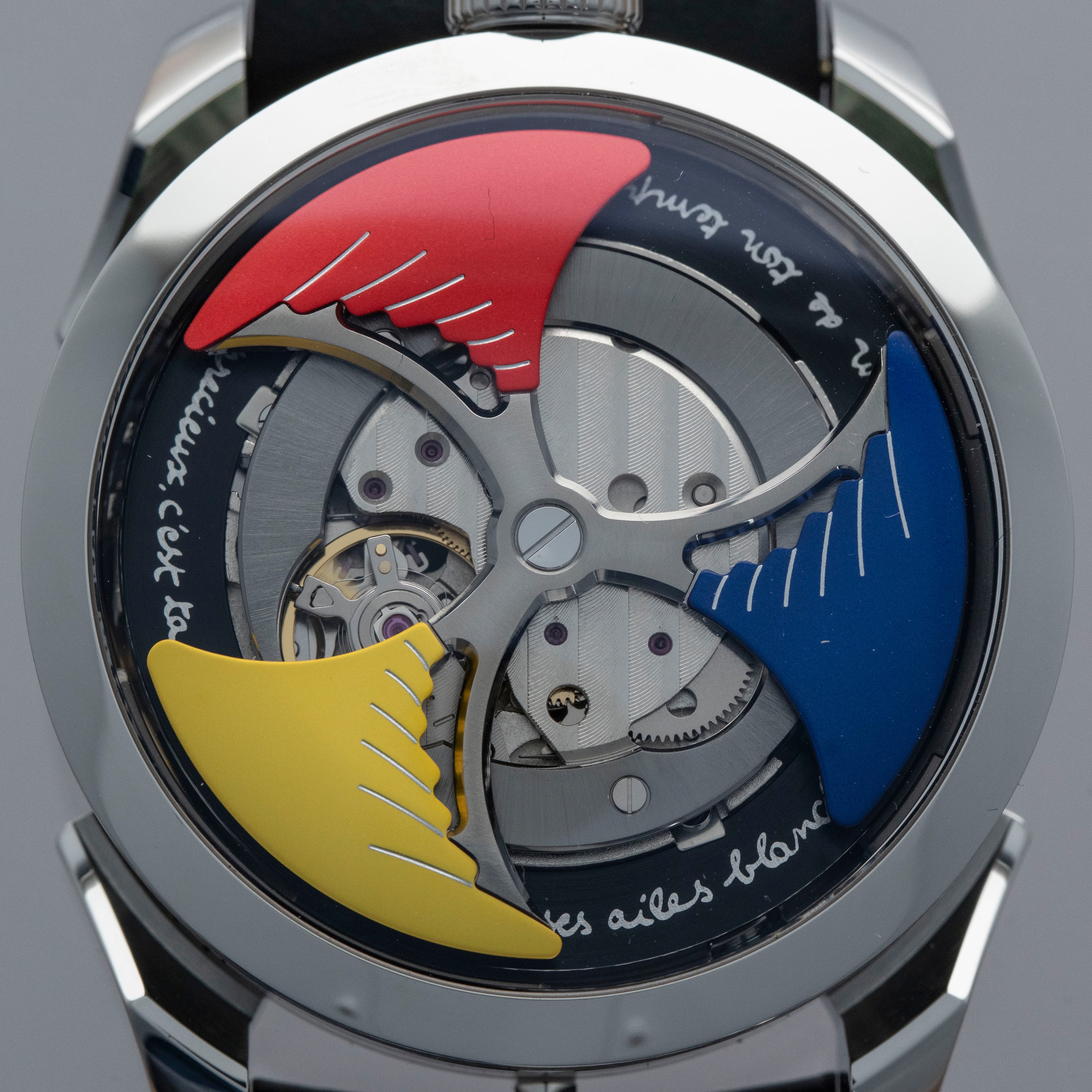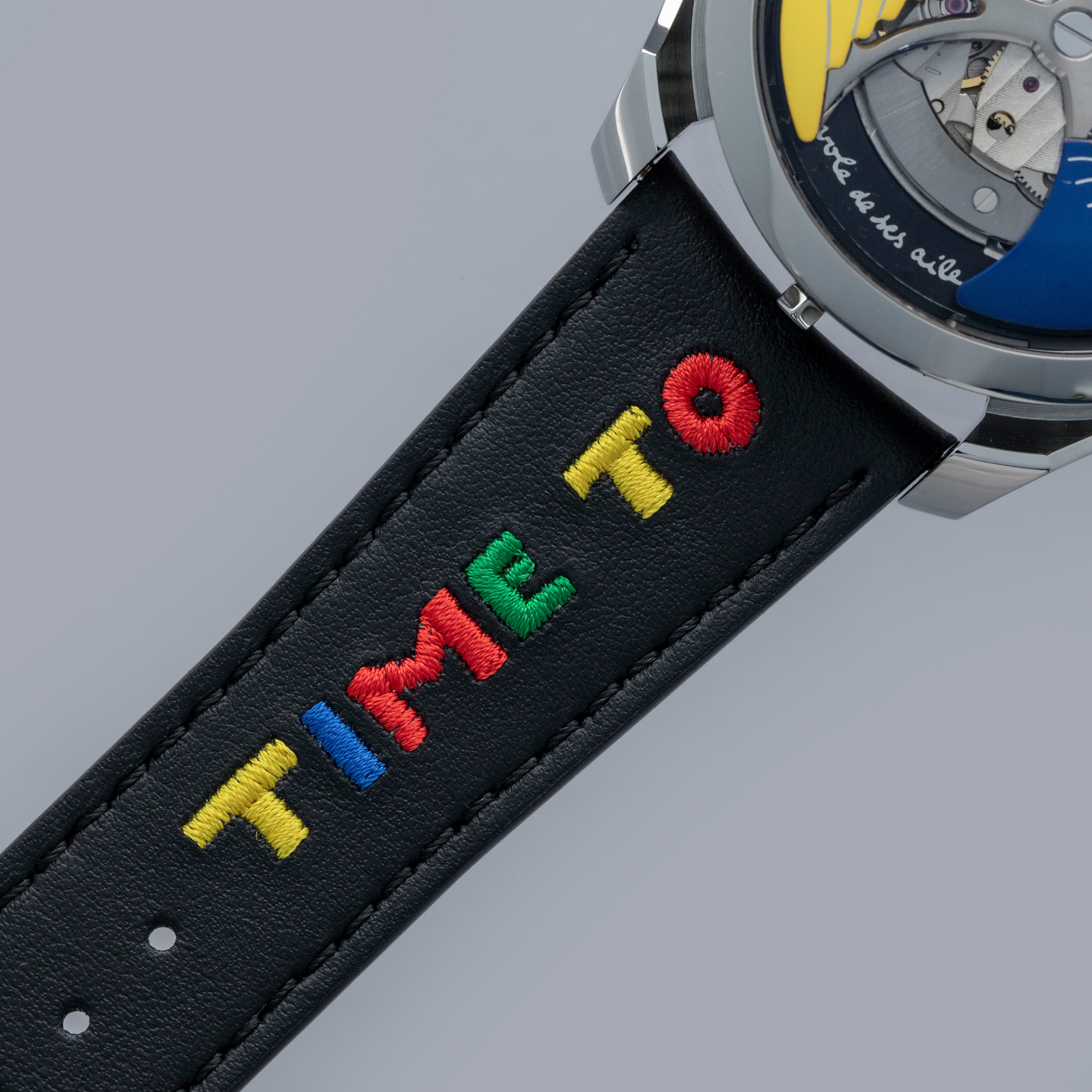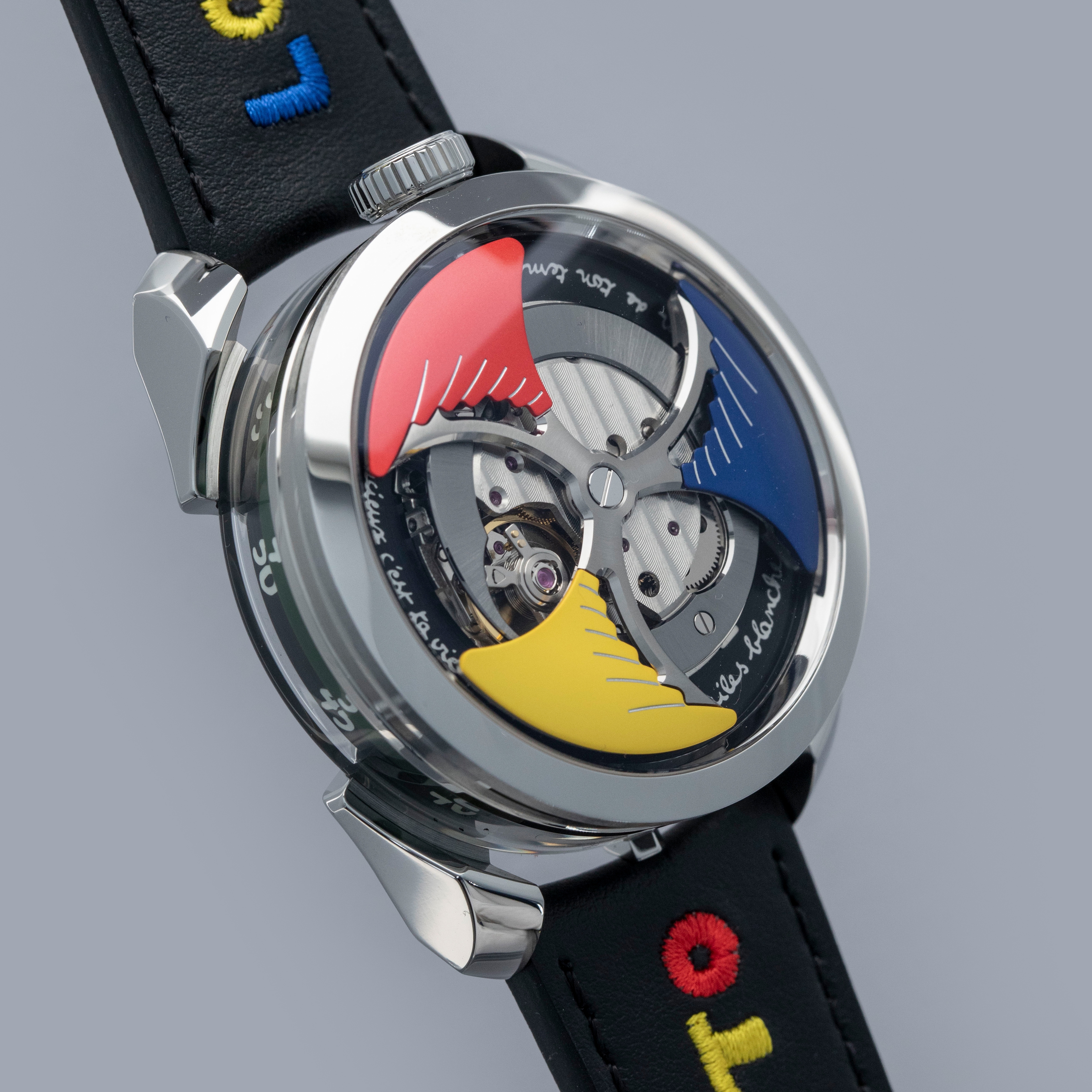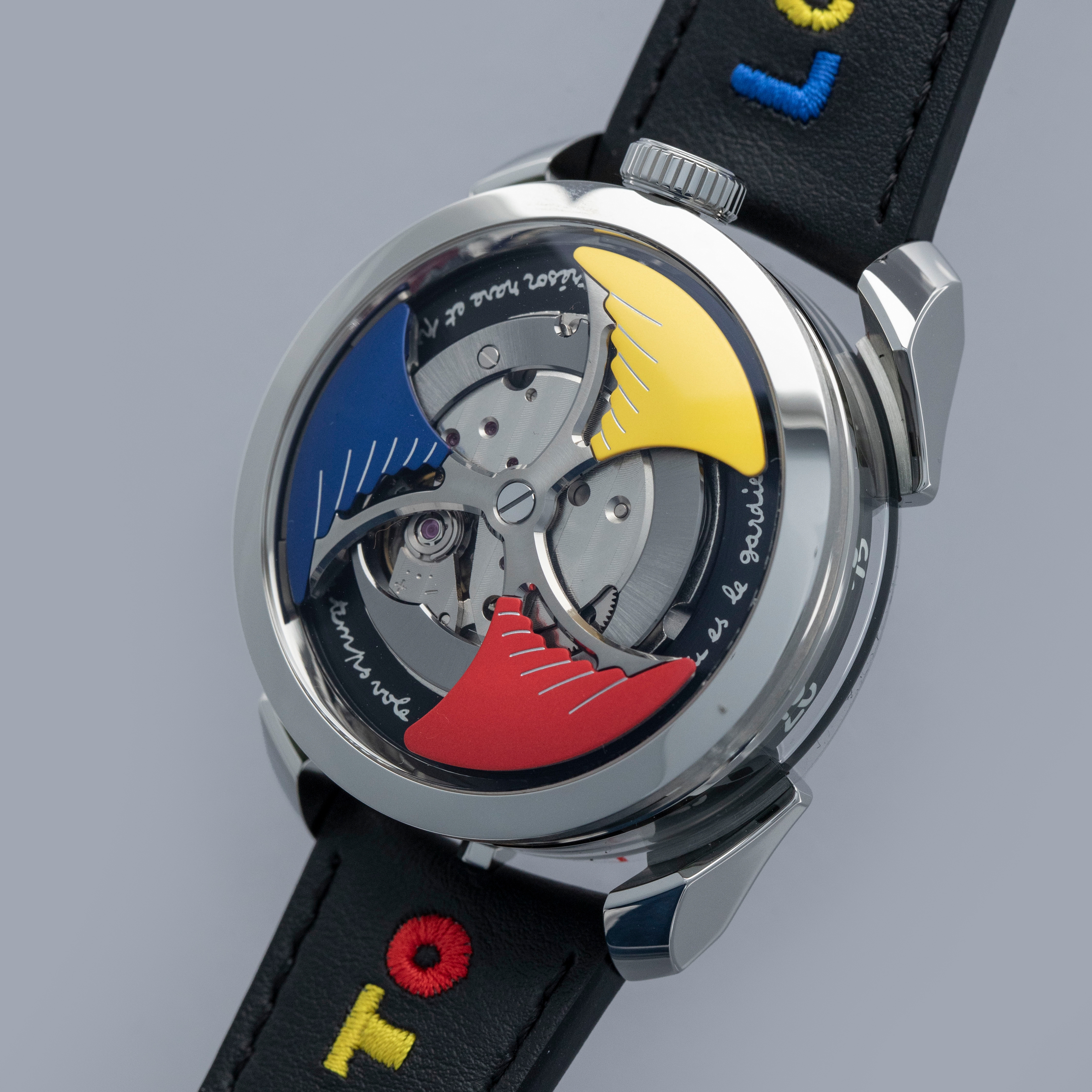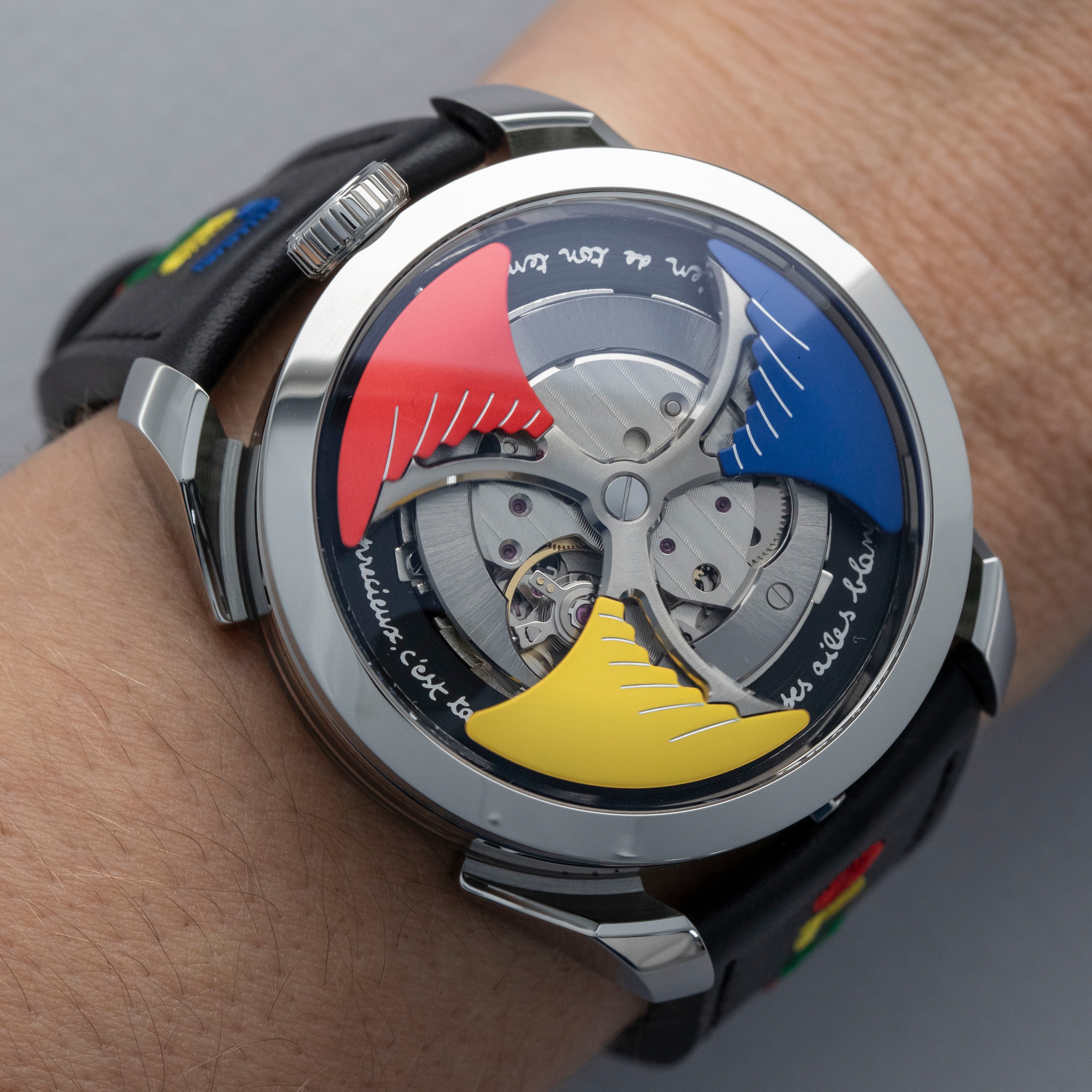 Powered by the heavily modified and upside-down Miyota cal. 821A, the M.A.D. 1's party trick is its incredibly fast spinning triple-blade top-mounted winding rotor which sits atop a green ring. Quite the spectacle, especially with the Time to Love's combination of blue, yellow and red.