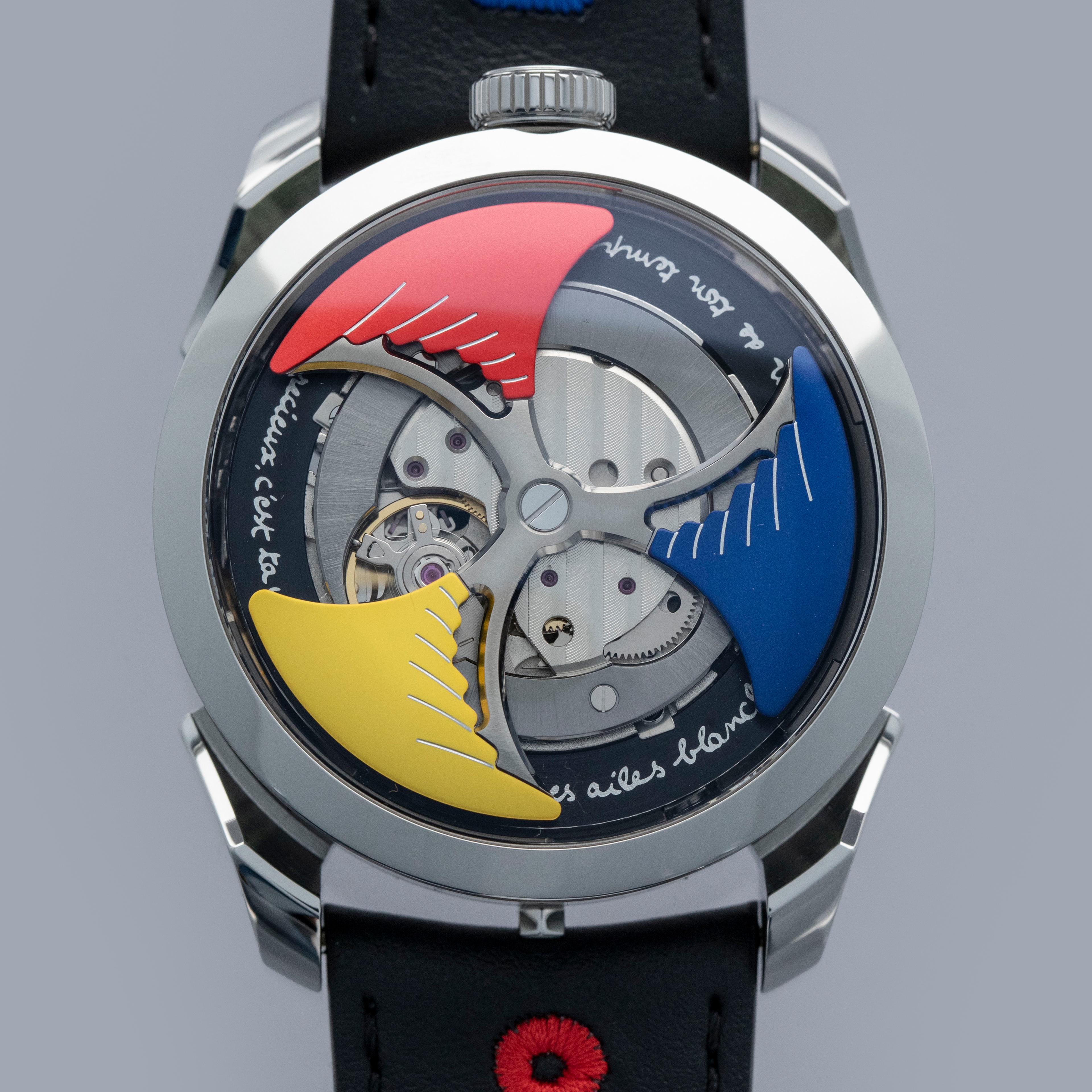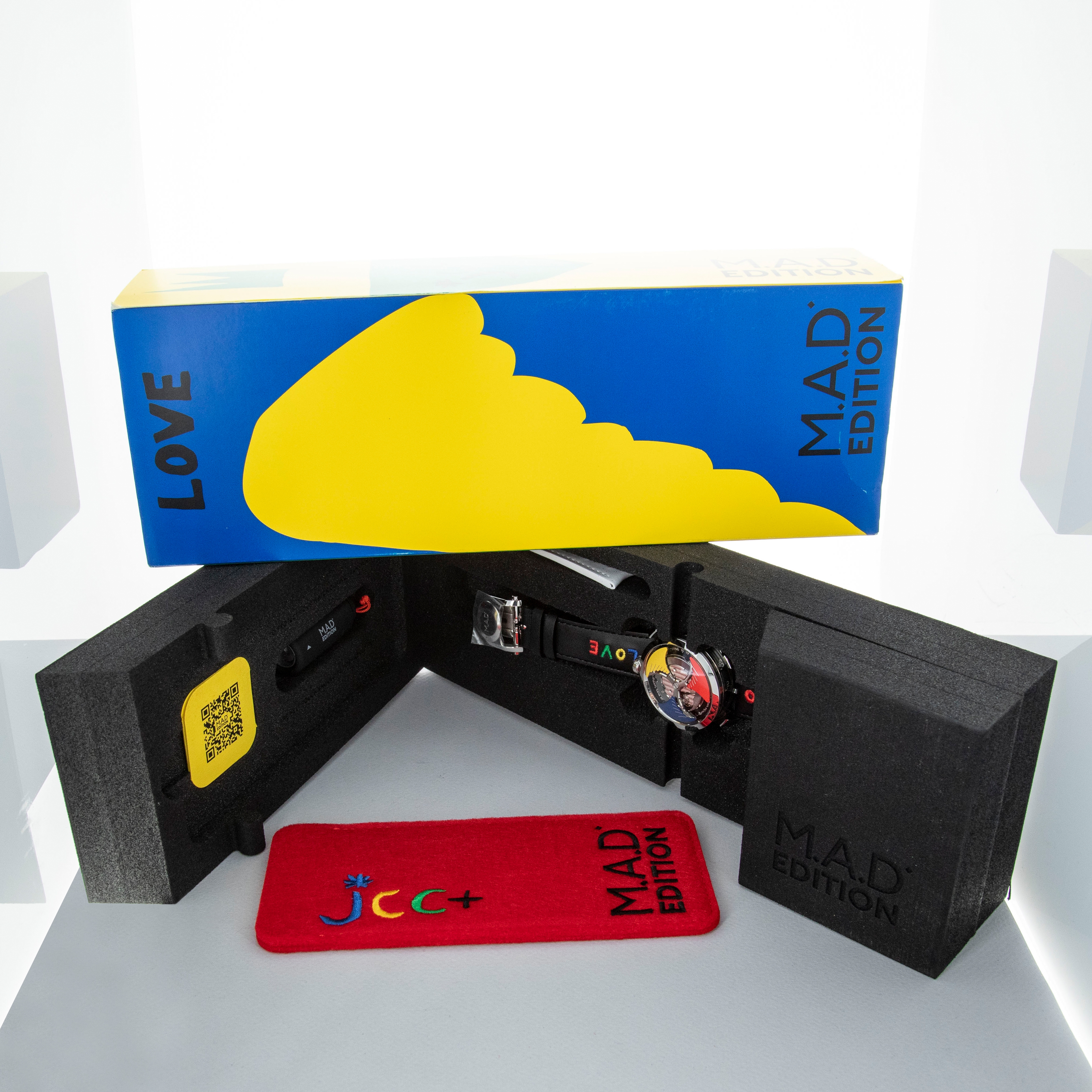 Famed for his flamboyant and eccentric designs, Maximilian Busser of MB&F is perhaps one of the best-known watchmaking CEOs in the world of horology. While his incredibly keen eye for detail has helped establish MB&F at the zenith of watchmaking, it is no surprise that collectors around the world, who he calls the Tribe, have been drawn to his charismatic devotion to his collectors. Powered by this devotion, Max began designing a new timepiece in 2020 that would blend his incredibly unique design language with a price tag that would be far more palatable than what MB&F timepieces are usually accompanied by. Offered only to a small selection of MB&F’s most-valued collectors and friends, the M.A.D. Edition 1 Blue was the result of that design process. Powered by a heavily modified automatic Miyota cal. 821A, the M.A.D. Edition 1 features a lateral time display and a titanium and tungsten triple-blade winding rotor that sits atop its case and spins incredibly fast above a colored aluminum ring. This is then matched by another aluminum ring, that rotates around the case as the hour display, which features a grey minute ring beneath it which rotates the very same way. An incredibly personal piece of design from Max’s perspective and an incredibly cool-looking and rare timepiece from the wider-watch community’s perspective, the M.A.D. 1 is as rare a timepiece as it is unique, and this is the perfect opportunity to add one to your collection. Offered here we have the first limited-edition M.A.D. 1, the M.A.D. 1 Time to Love, a collaboration with French designer Jean-Charles de Castelbajac, known for his colorful creations; an aesthetic that the Time to Love M.A.D. 1 very much follows with its colorful winding rotor and straps. Limited to just 999 pieces, this collection was significantly more sought-after and harder to get than previous M.A.D. 1 variants, and that is saying something.