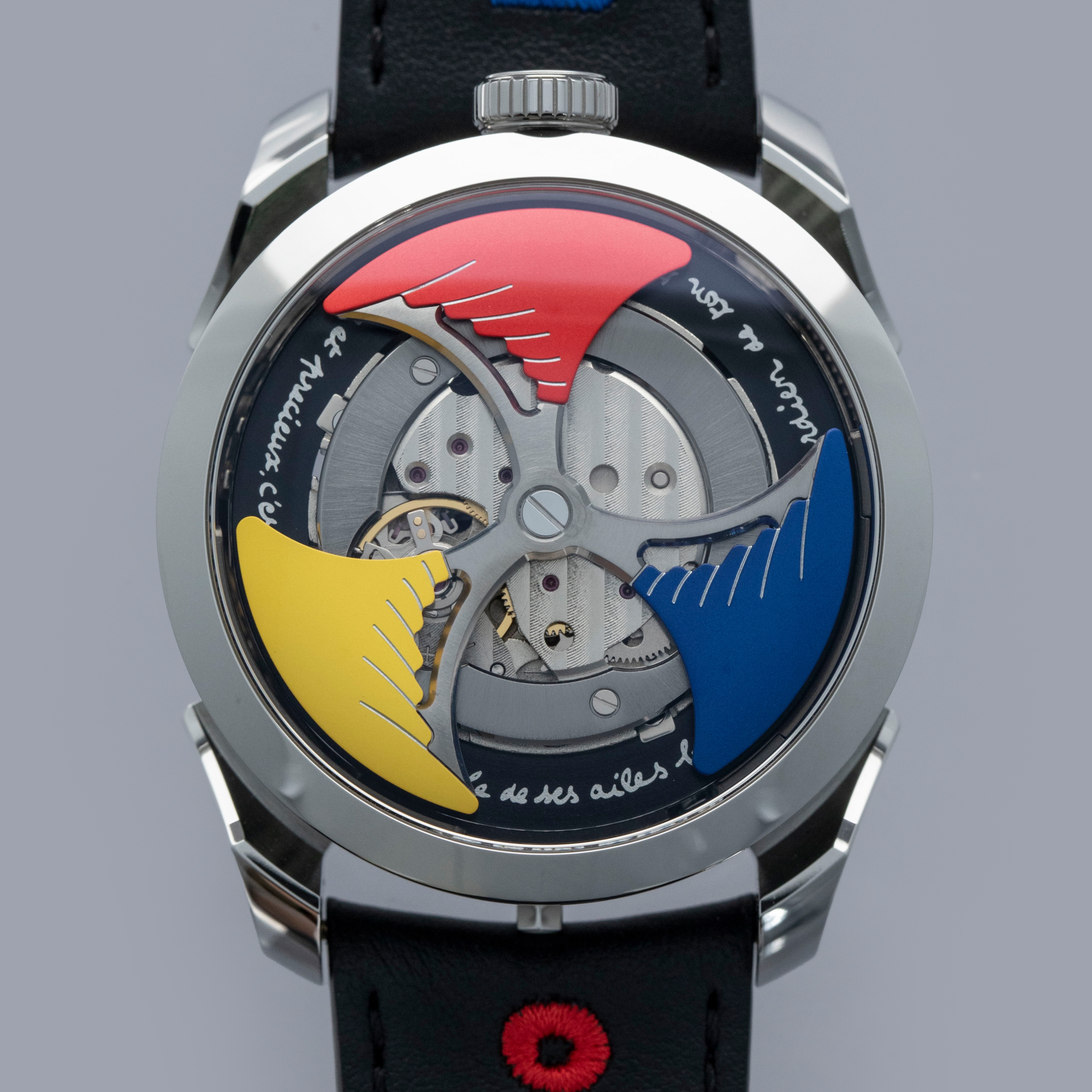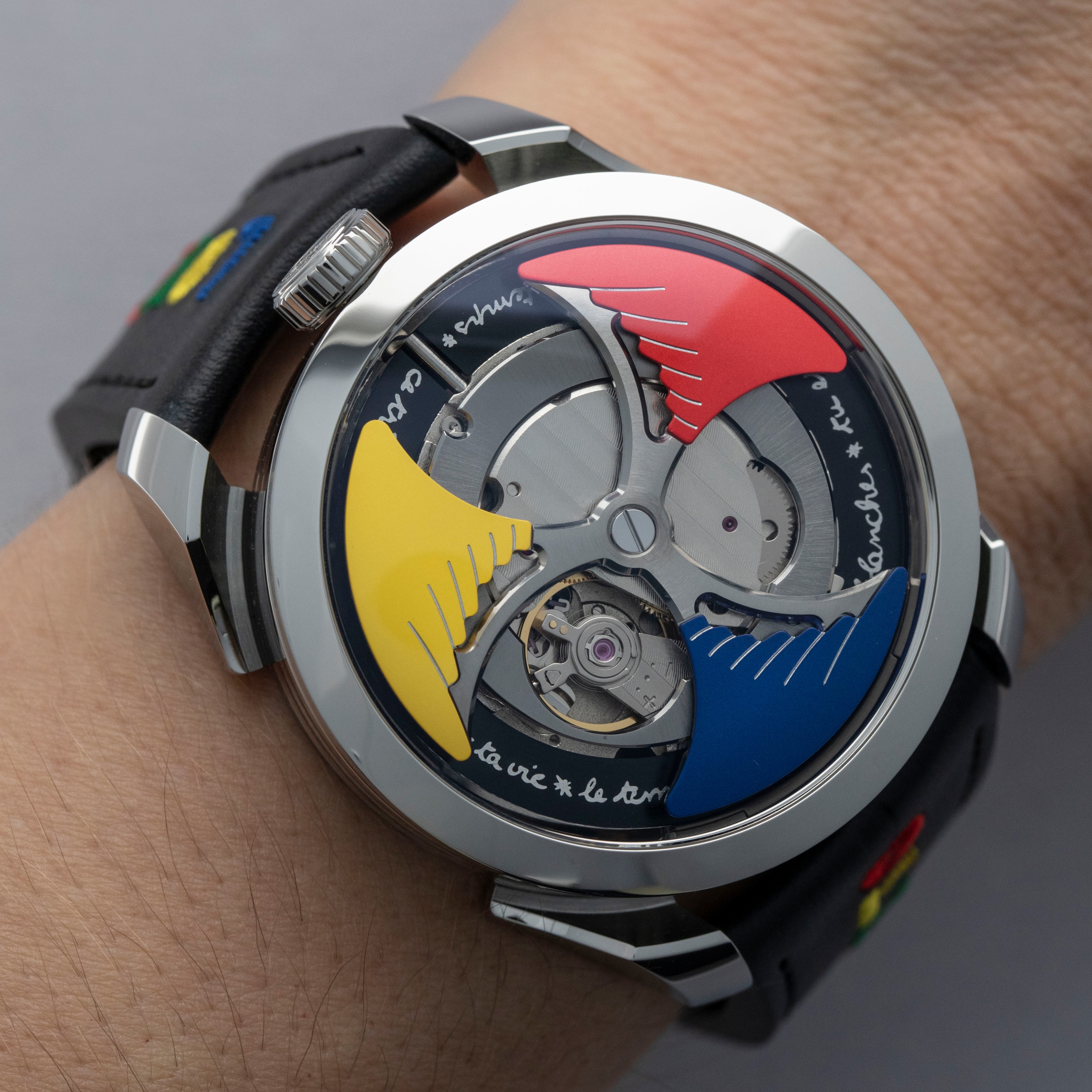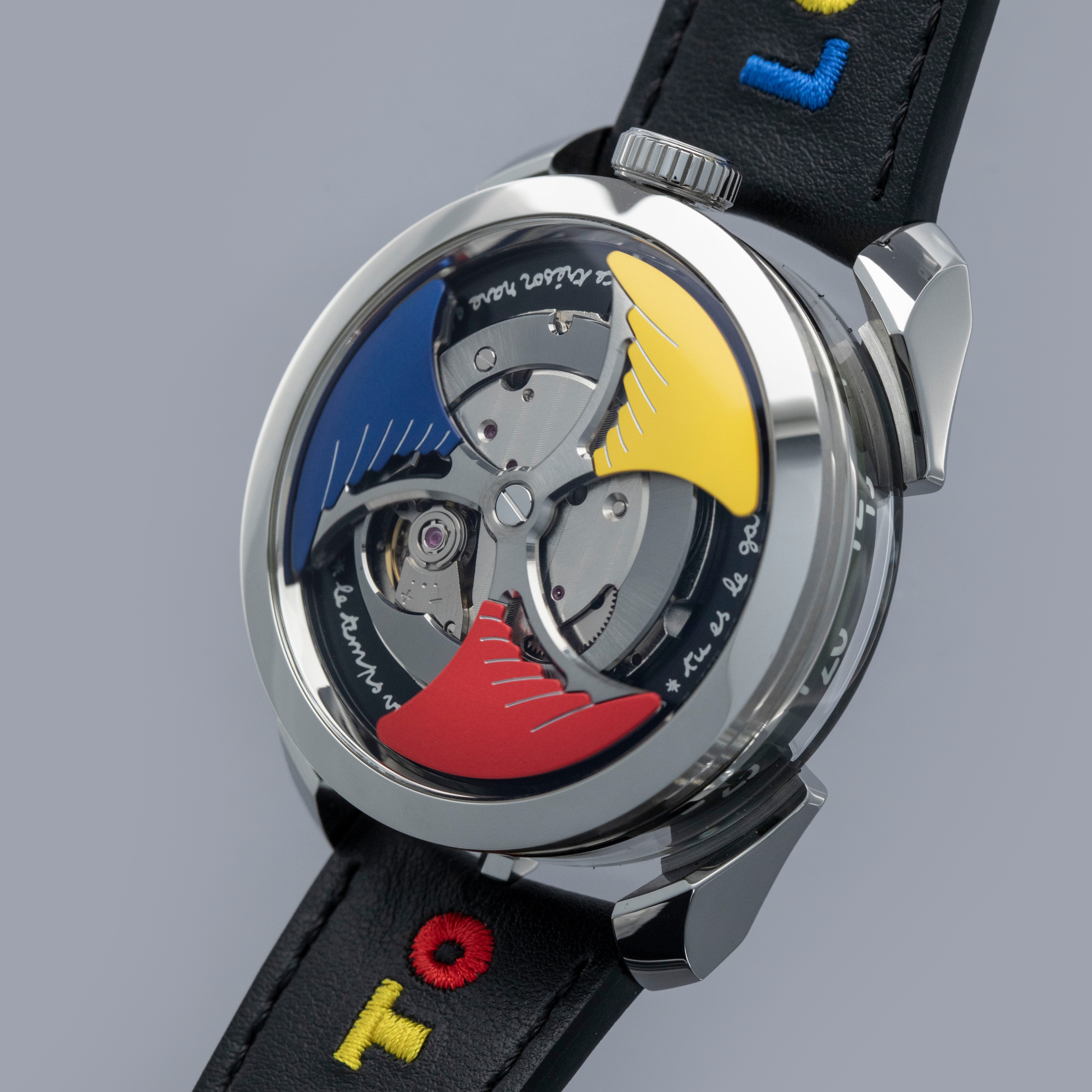 Powered by the heavily modified and upside-down Miyota cal. 821A, the M.A.D. 1's party trick is its incredibly fast spinning triple-blade top-mounted winding rotor which sits atop a green ring. Quite the spectacle, especially with the Time to Love's combination of blue, yellow and red.