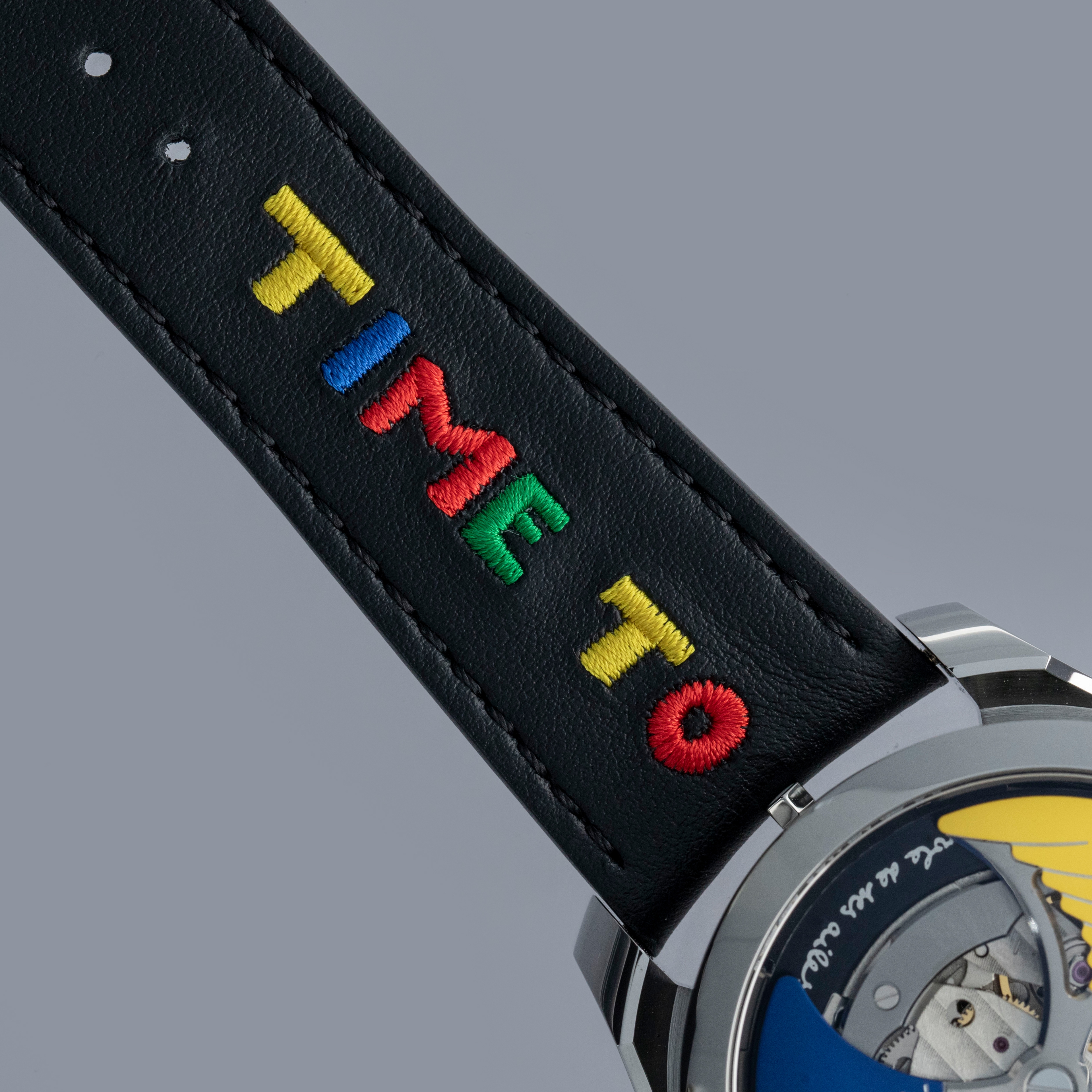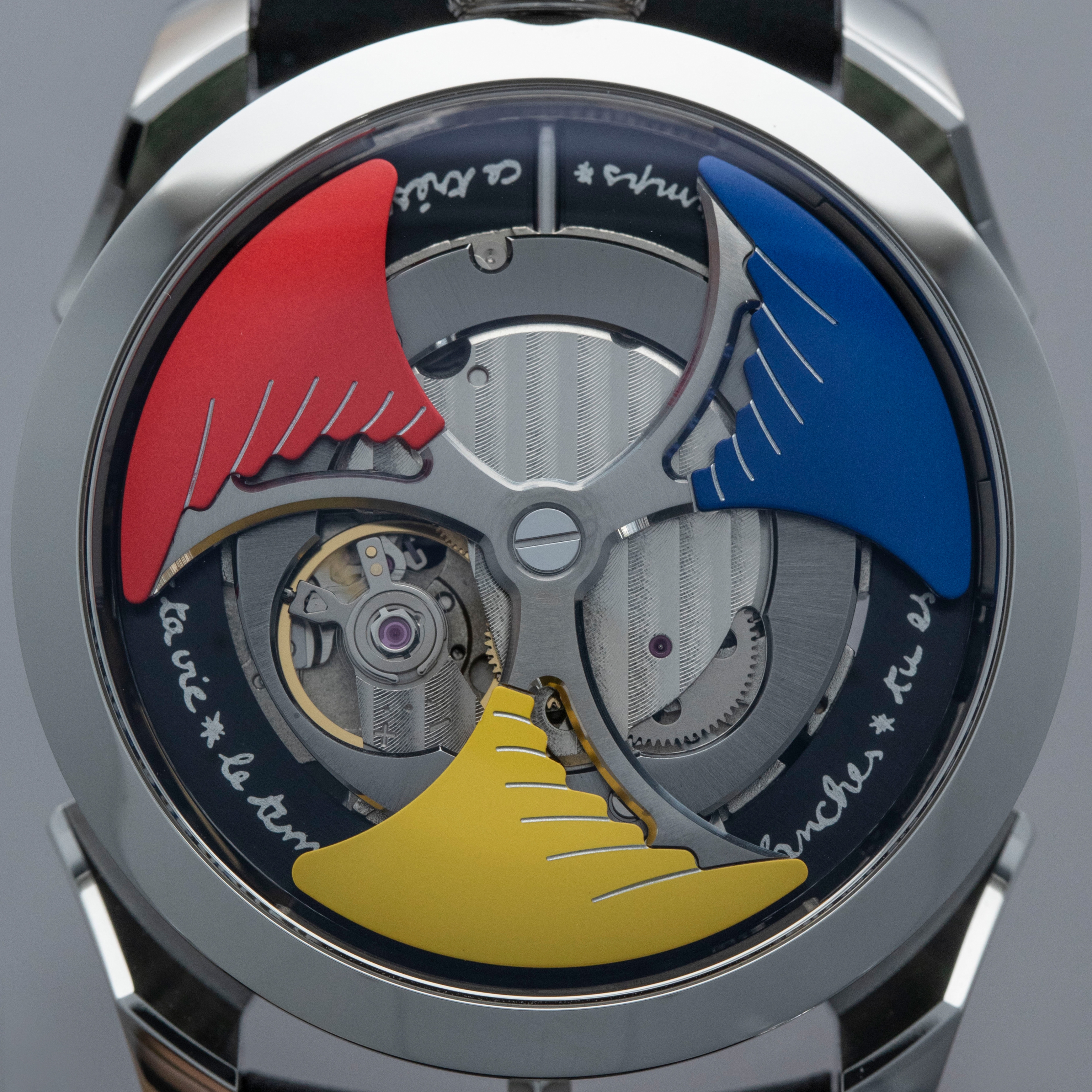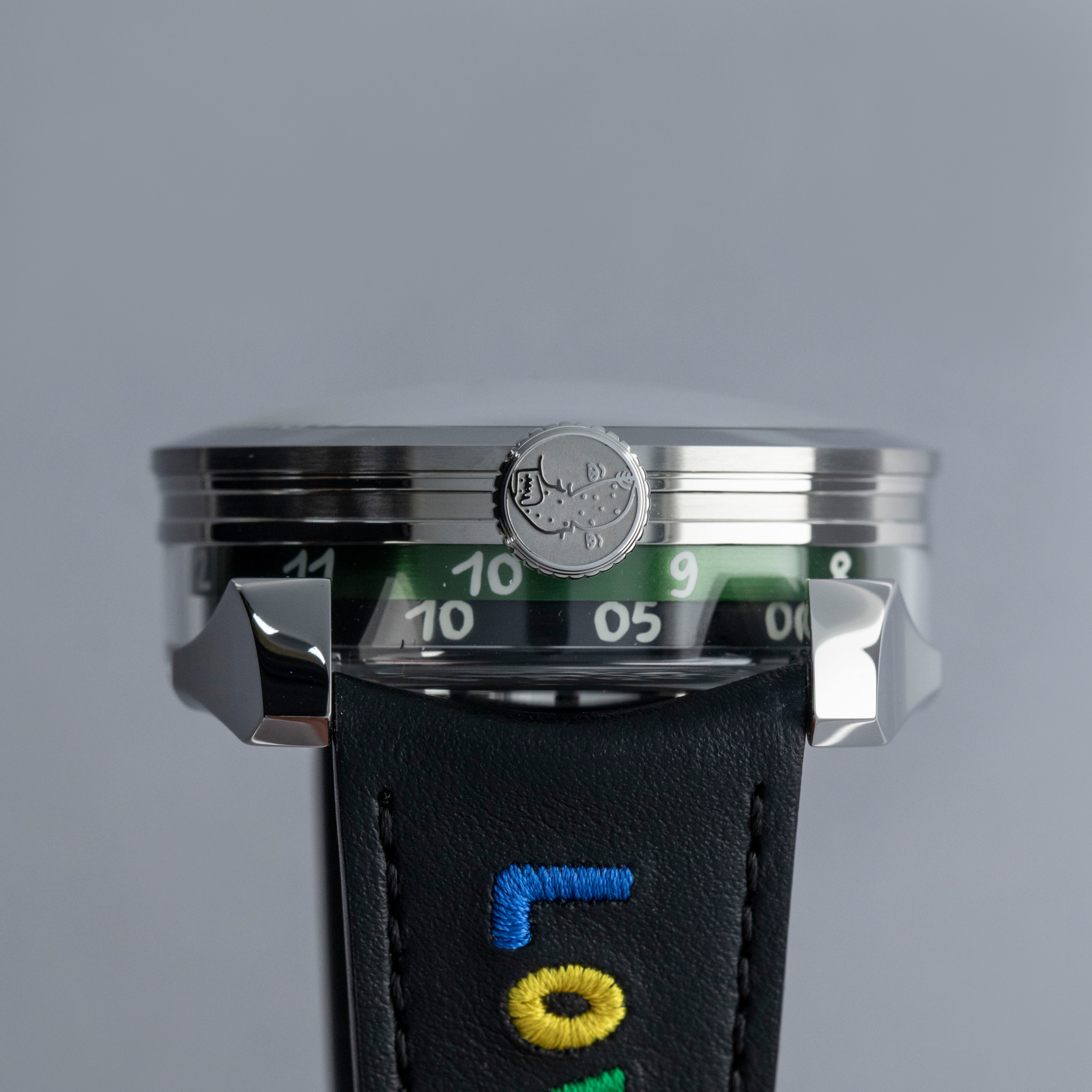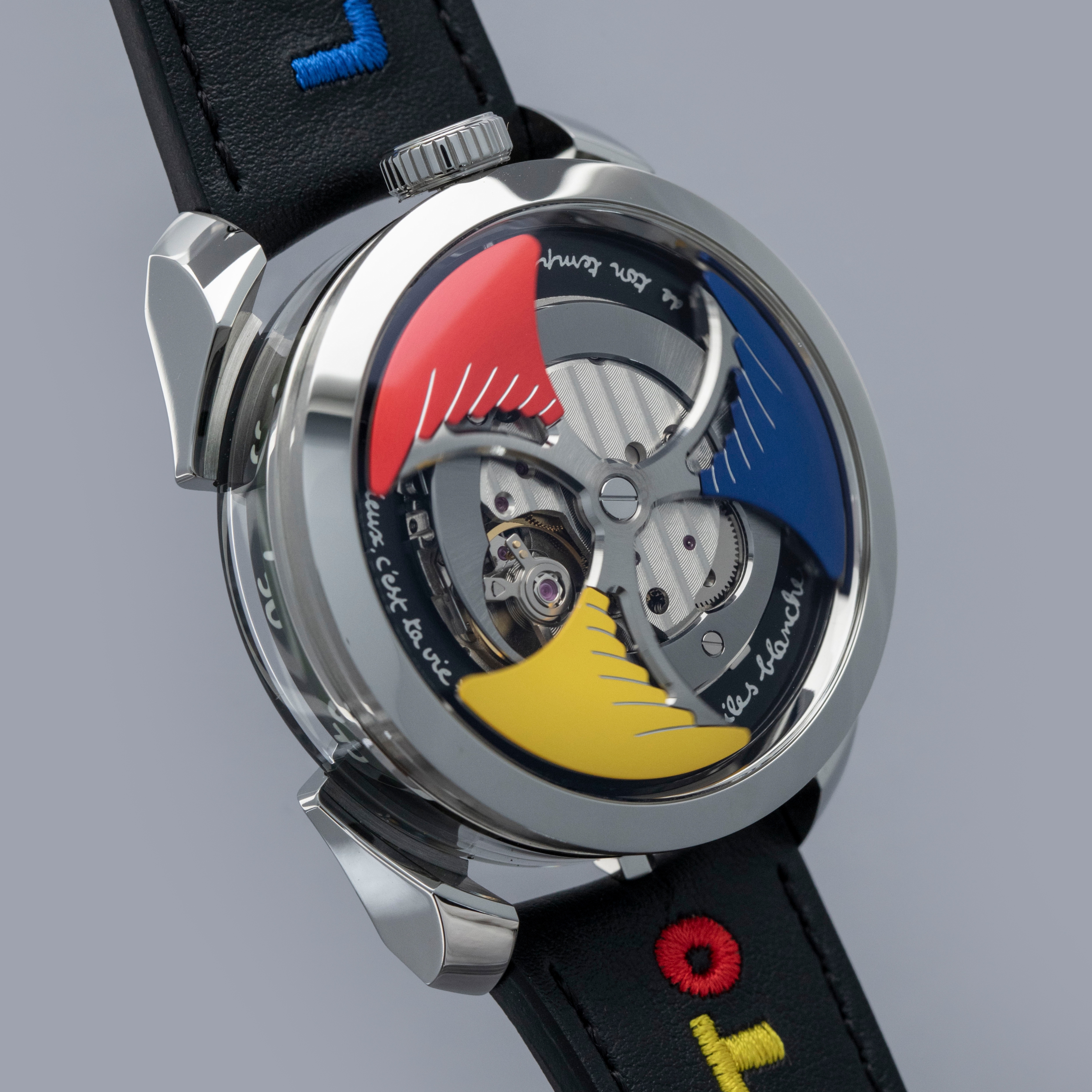 Powered by the heavily modified and upside-down Miyota cal. 821A, the M.A.D. 1's party trick is its incredibly fast spinning triple-blade top-mounted winding rotor which sits atop a green ring. Quite the spectacle, especially with the Time to Love's combination of blue, yellow and red.