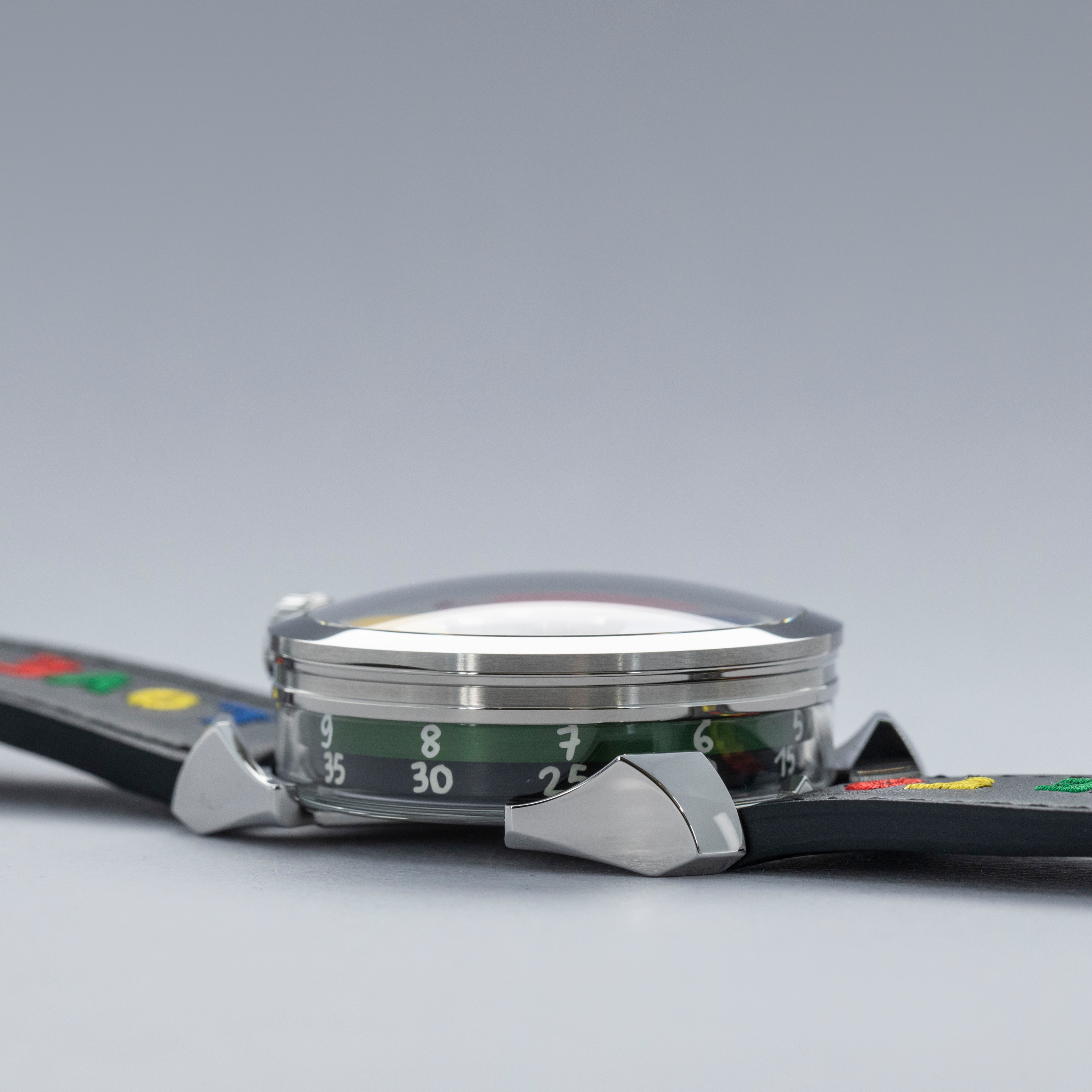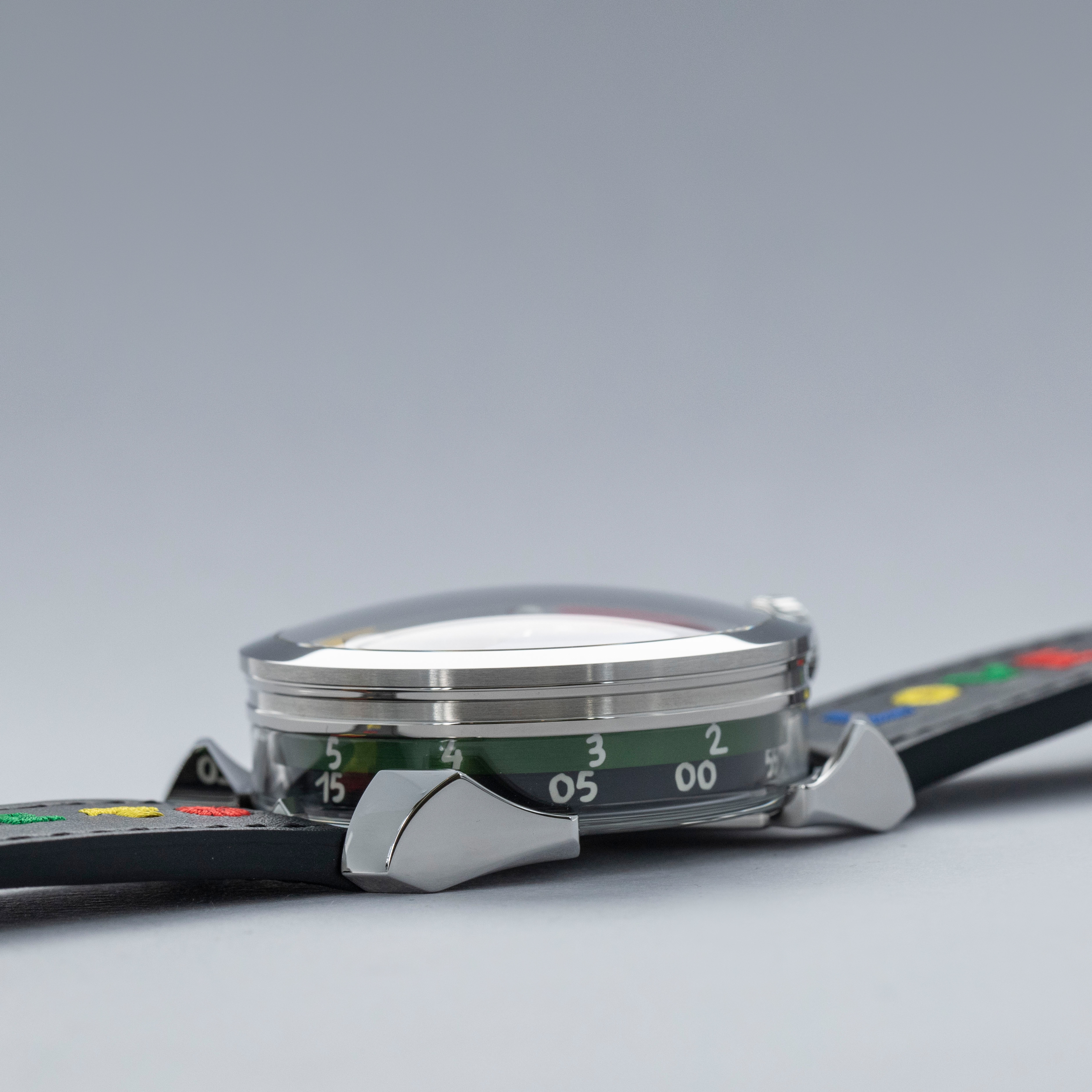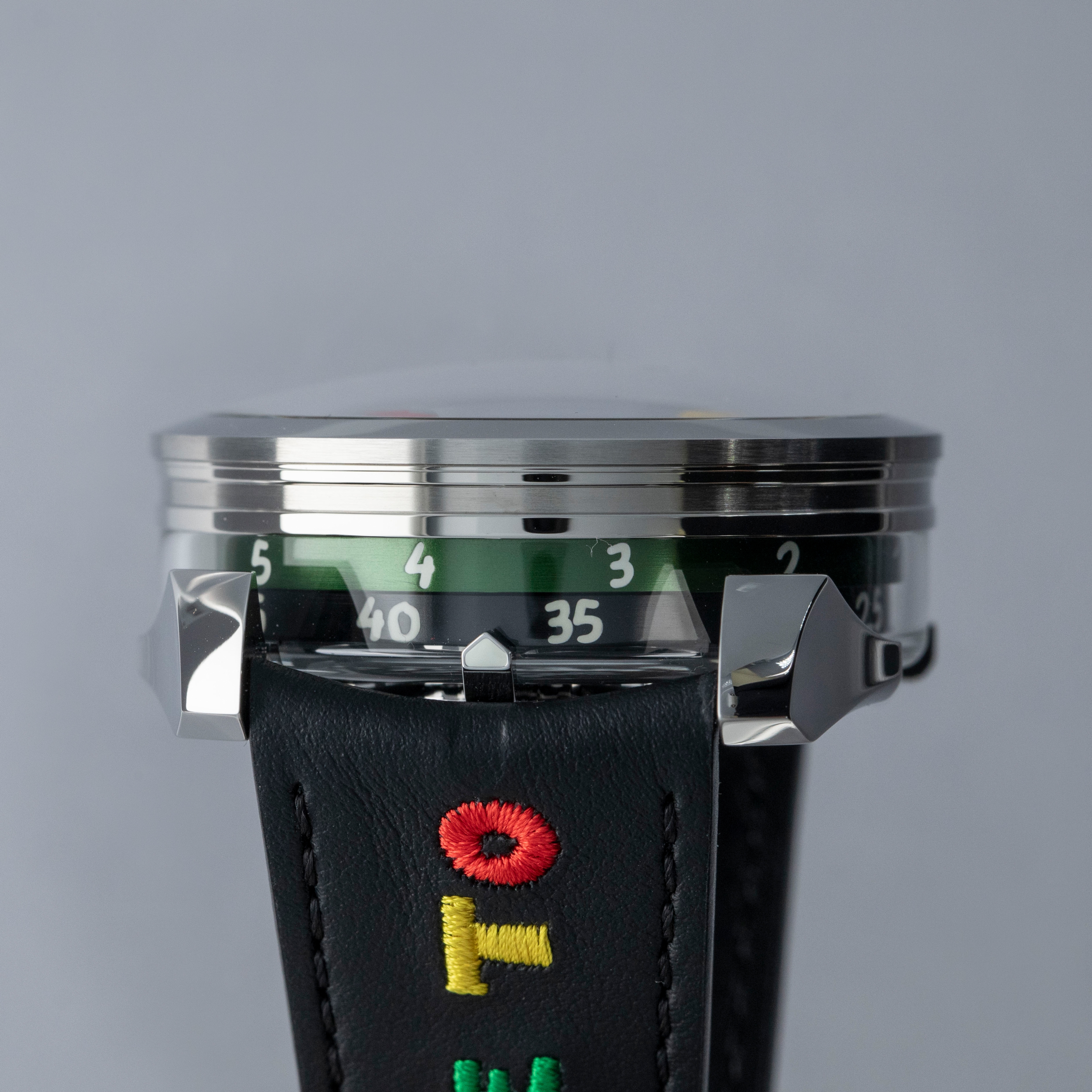While tall at 18.8mm, it is a practical element of the M.A.D. 1's display with its unique lateral time indication using two aluminum rings that rotate around its stainless steel case to display the hours and minutes.