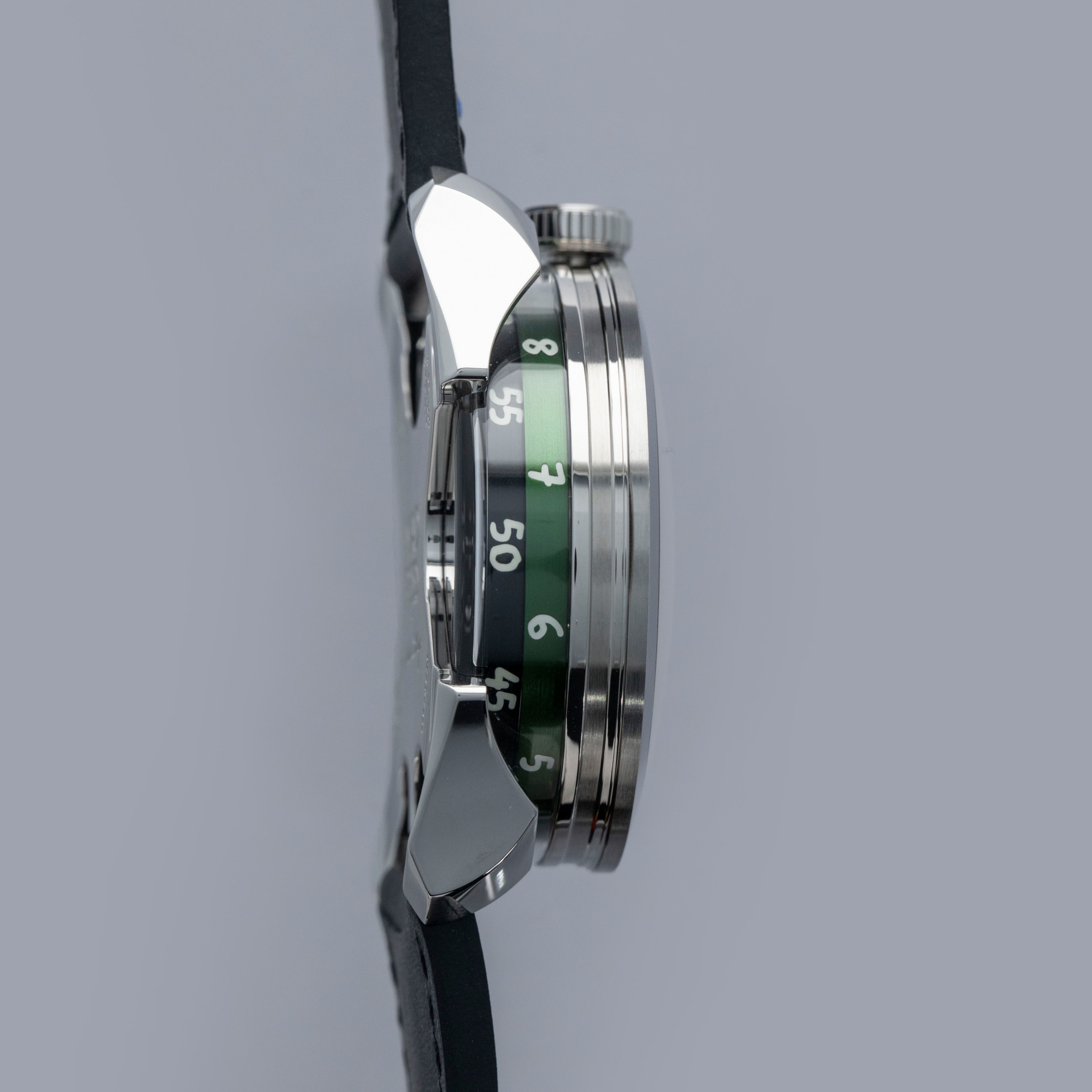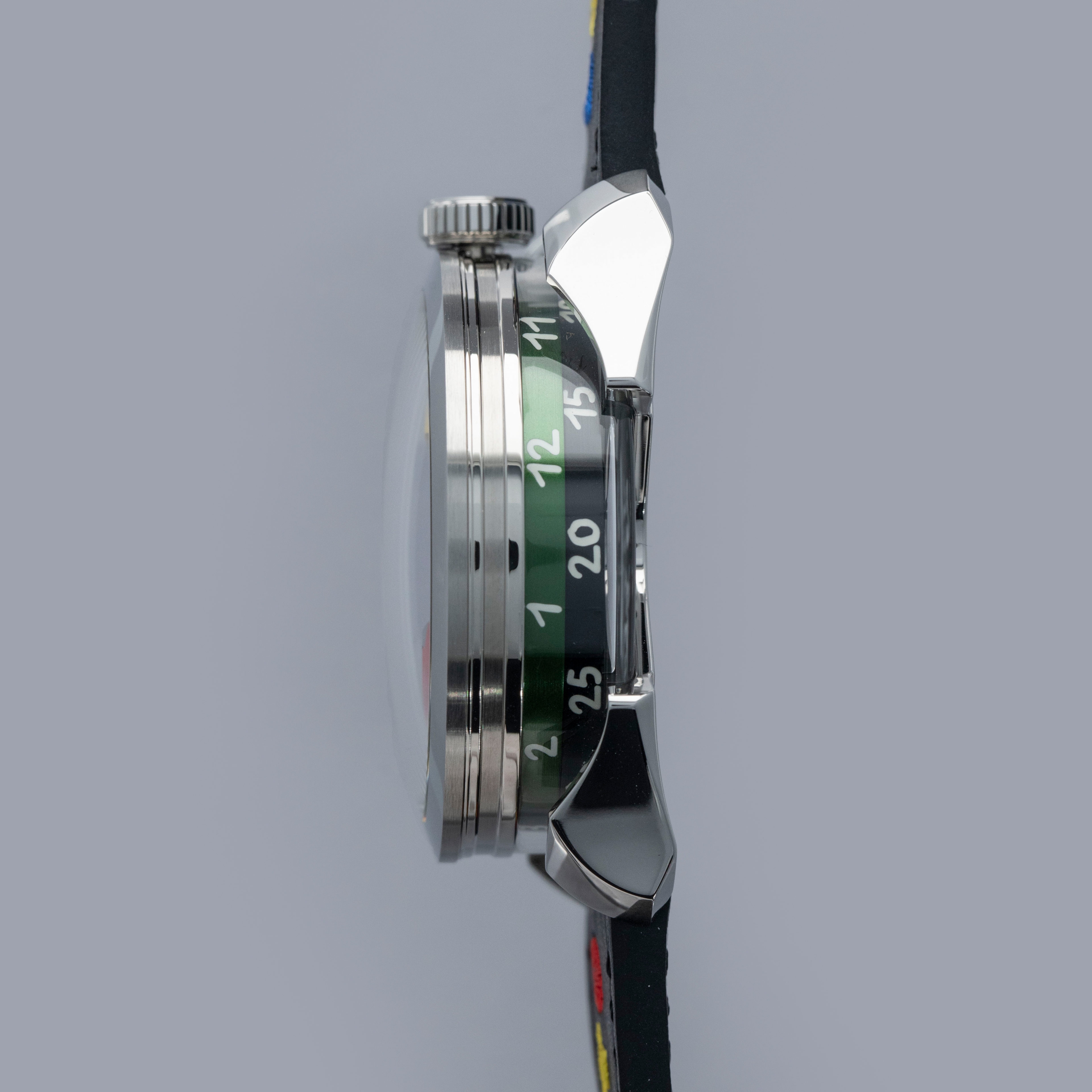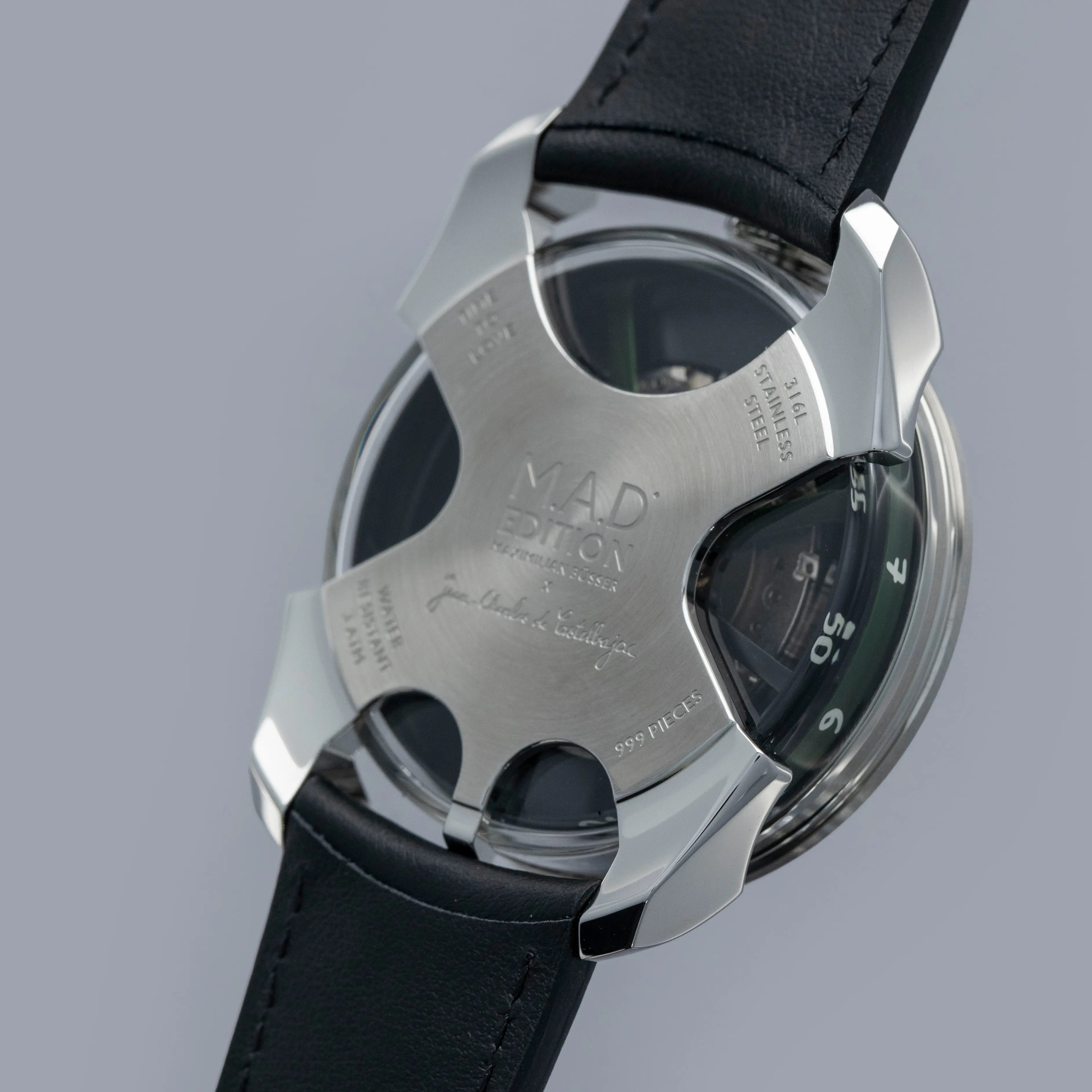 While tall at 18.8mm, it is a practical element of the M.A.D. 1's display with its unique lateral time indication using two aluminum rings that rotate around its stainless steel case to display the hours and minutes.