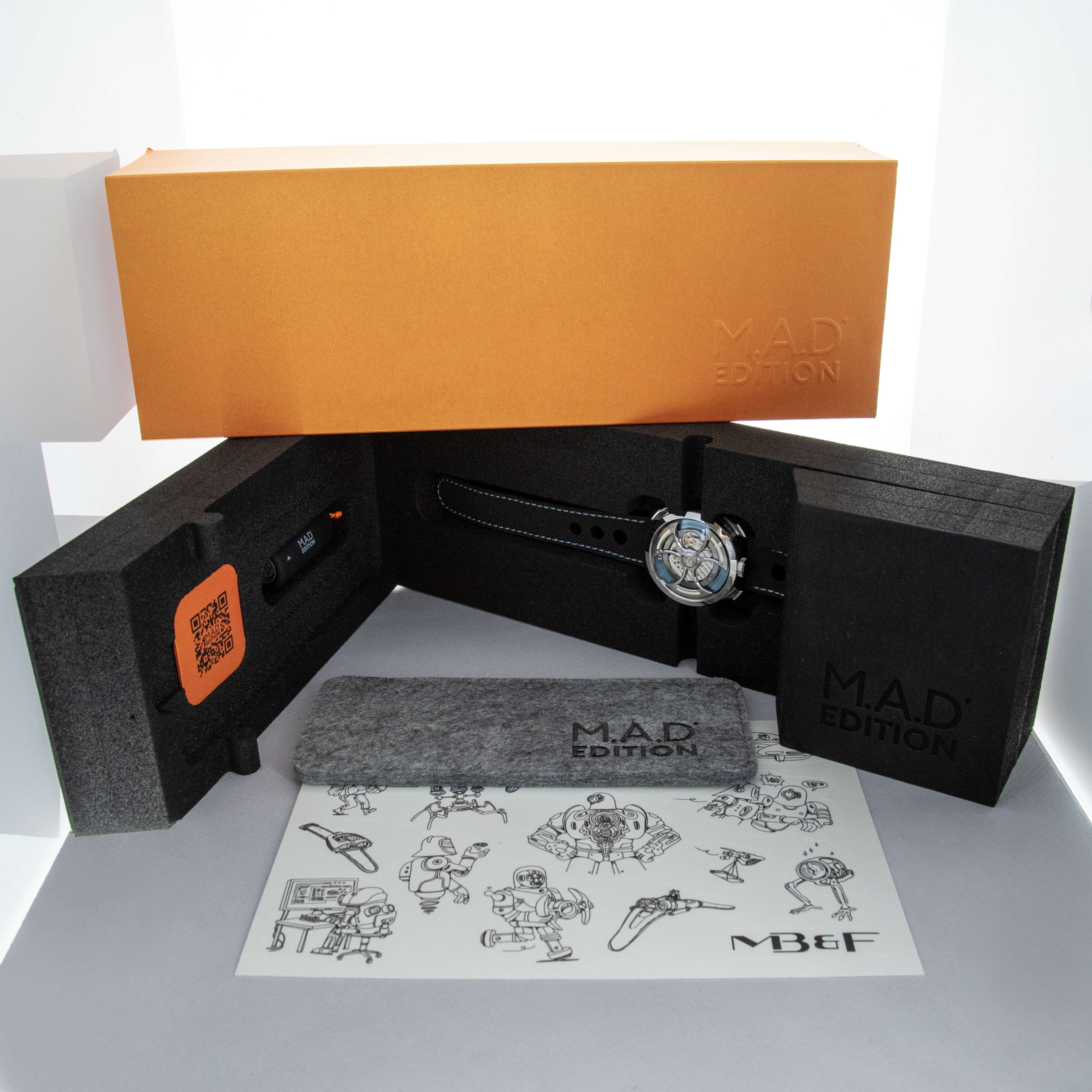 Famed for his flamboyant and eccentric designs, Maximilian Busser of MB&F is perhaps one of the best-known watchmaking CEOs in the world of horology. While his incredibly keen eye for detail has helped establish MB&F at the zenith of watchmaking, it is no surprise that collectors around the world, who he calls the Tribe, have been drawn to his charismatic devotion to his collectors. Powered by this devotion, Max began designing a new timepiece in 2020 that would blend his incredibly unique design language with a price tag that would be far more palatable than what MB&F timepieces are usually accompanied by. Offered only to a small selection of MB&F’s most-valued collectors and friends, the M.A.D. Edition 1 is the result of that design process. Powered by a heavily modified automatic Miyota cal. 821A, the M.A.D. Edition 1 features a lateral time display and a titanium and tungsten triple-blade winding rotor that sits atop its case and spins incredibly fast above a blue aluminum ring. This is then matched by the blue aluminum ring that rotates around the case as the hour display, which features a grey minute ring beneath it which rotates the very same way. An incredibly personal piece of design from Max’s perspective and an incredibly cool-looking and rare timepiece from the wider-watch community’s perspective, the M.A.D. 1 is as rare a timepiece as it is unique, and this is the perfect opportunity to add one to your collection.