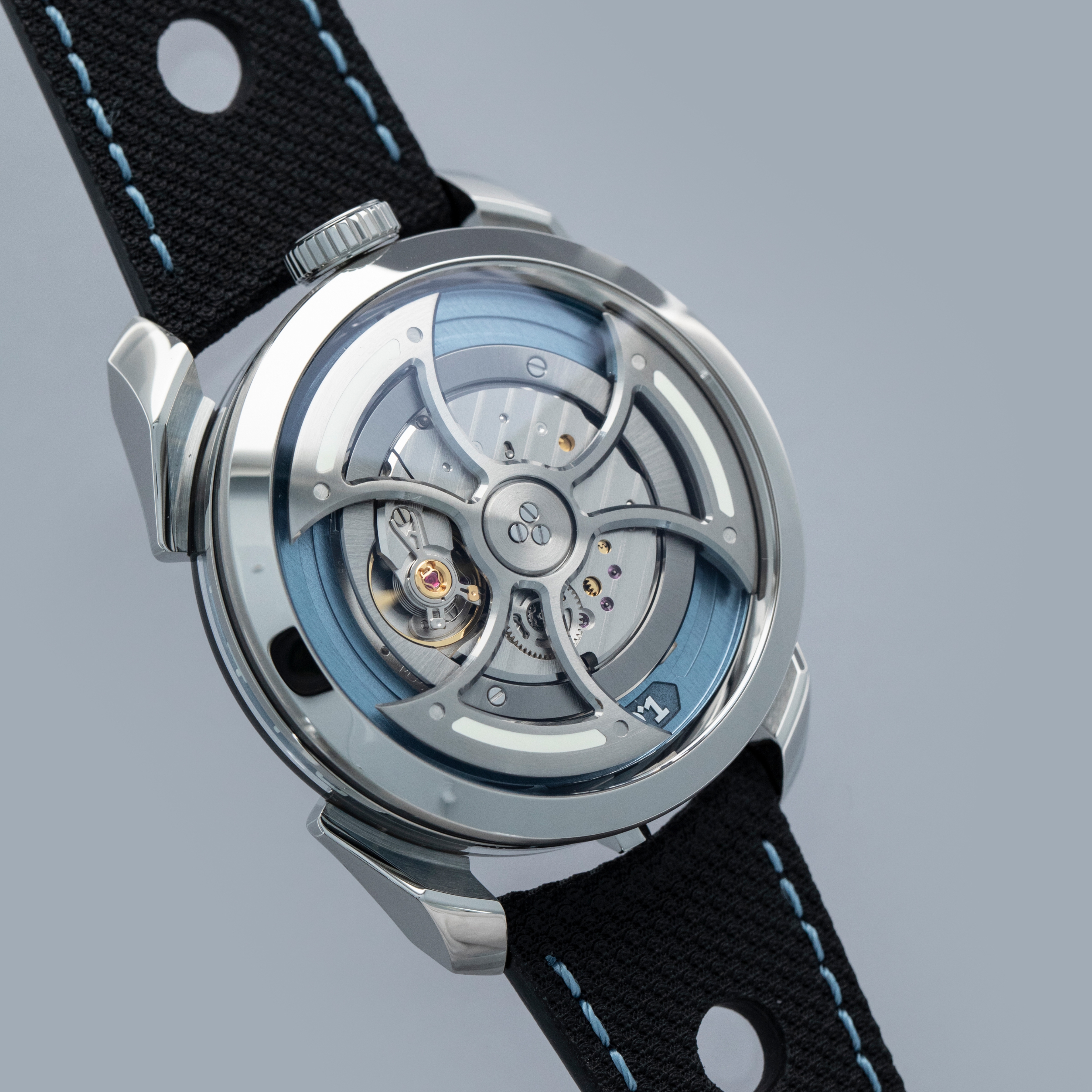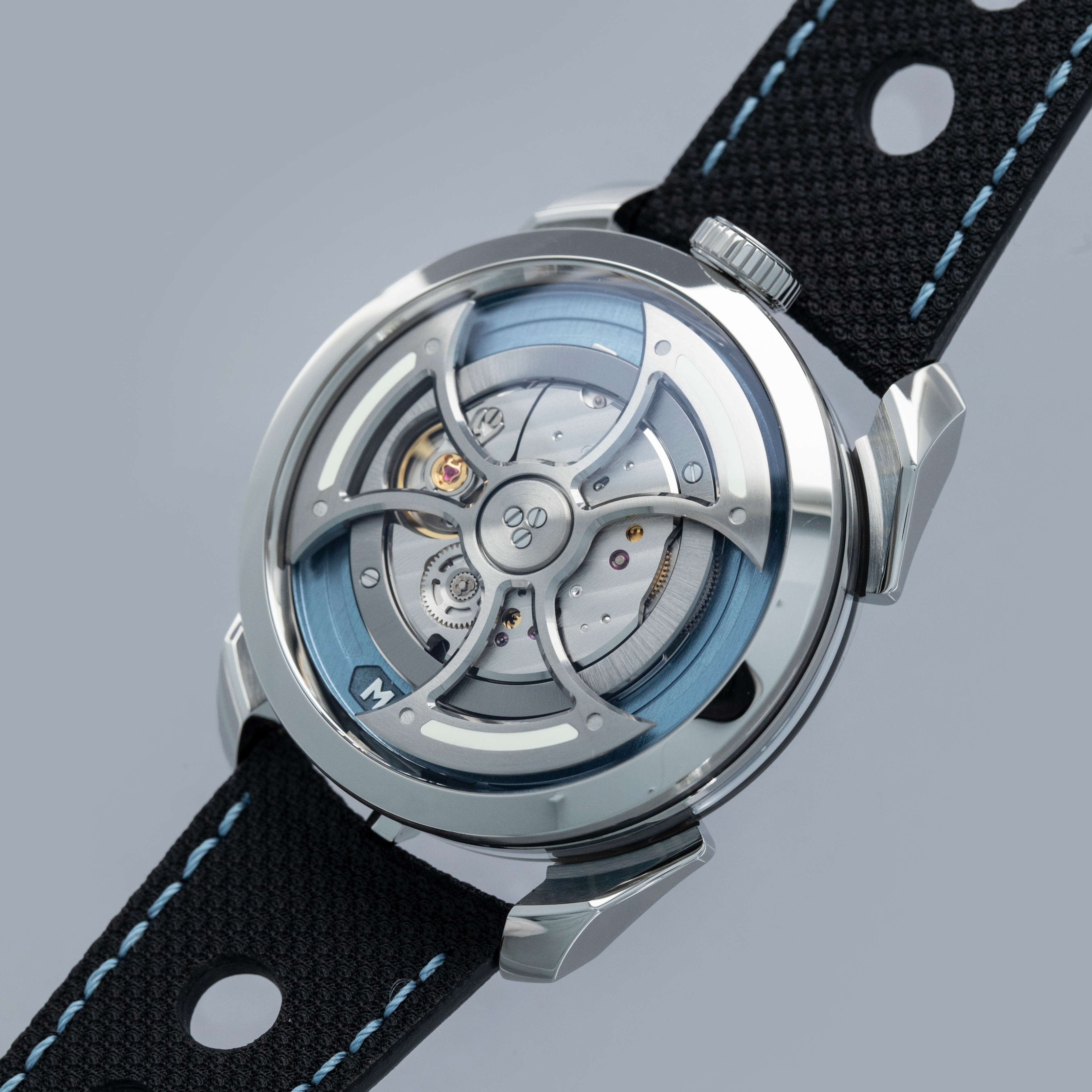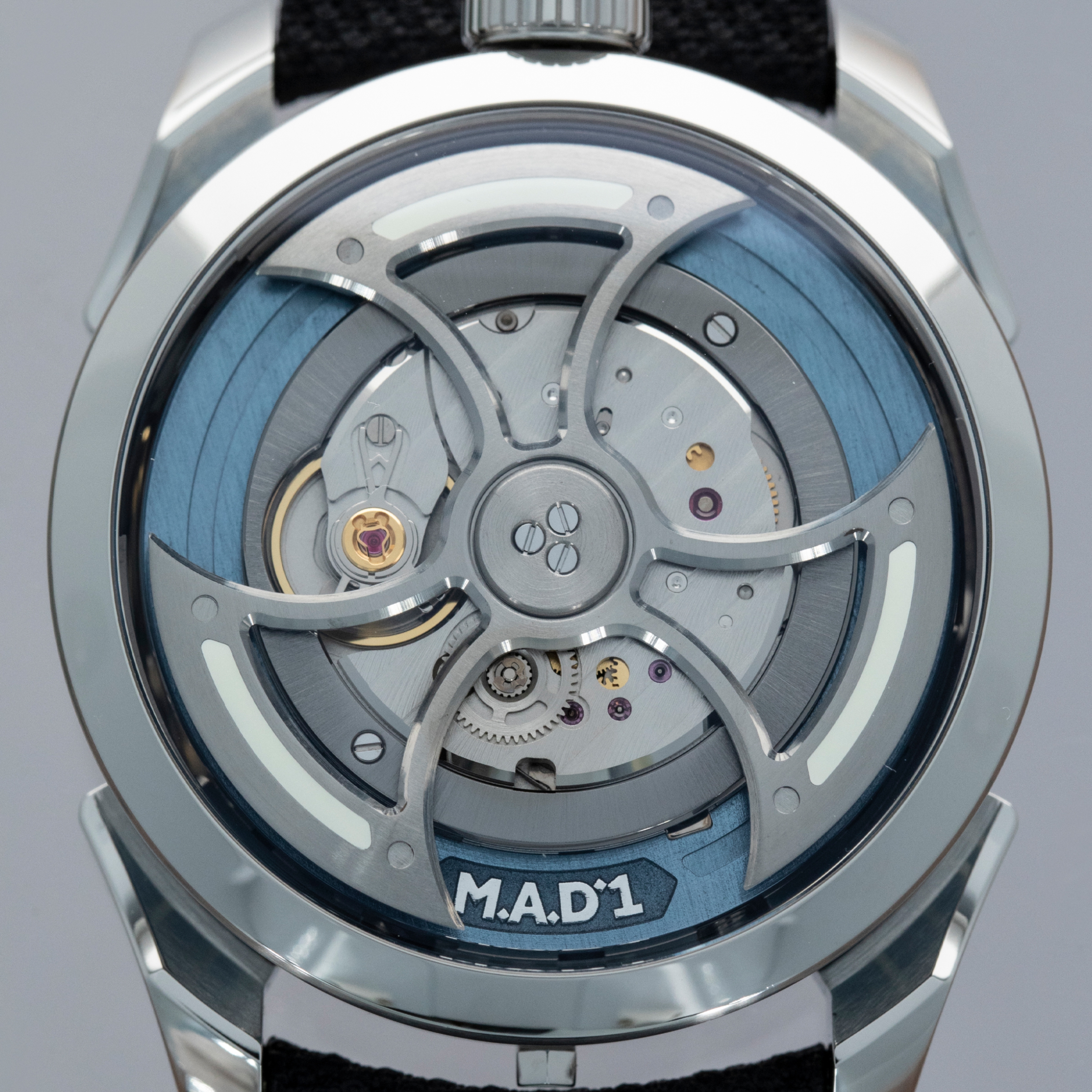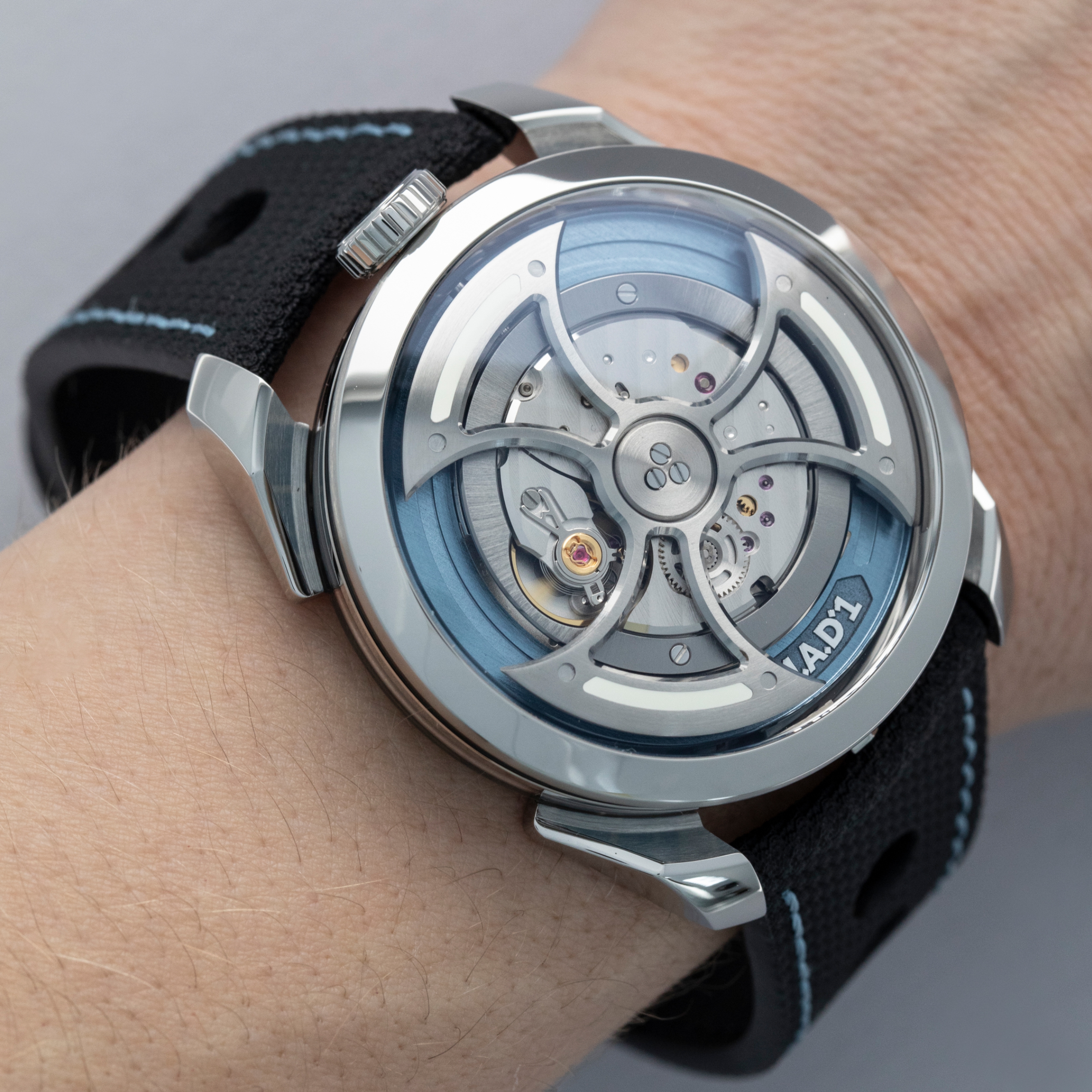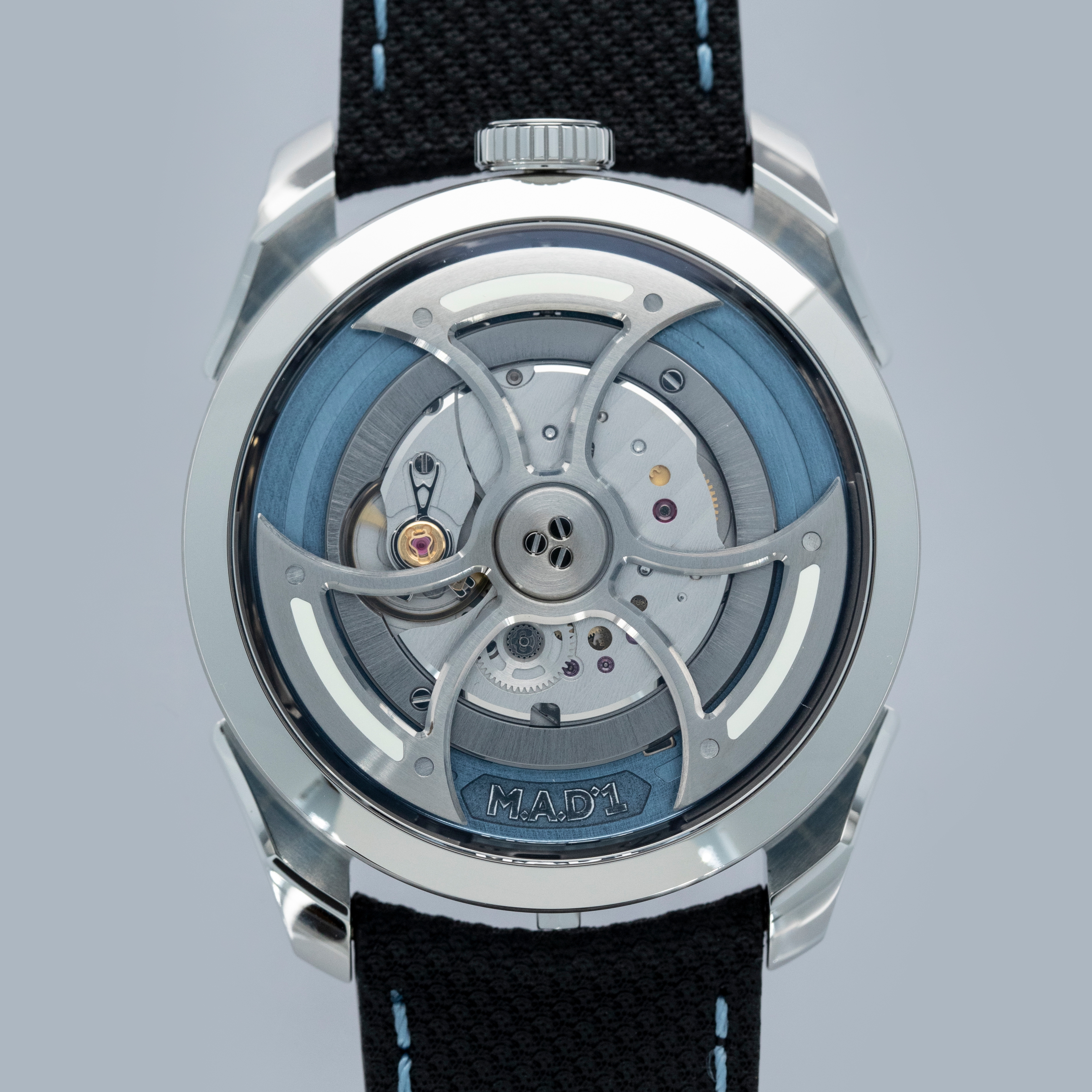 Powered by the heavily modified and upside-down La Joux-Perret cal. G101, the M.A.D. 1S's party trick is its incredibly fast spinning triple-blade top-mounted winding rotor which sits atop a blue ring. Quite the spectacle.