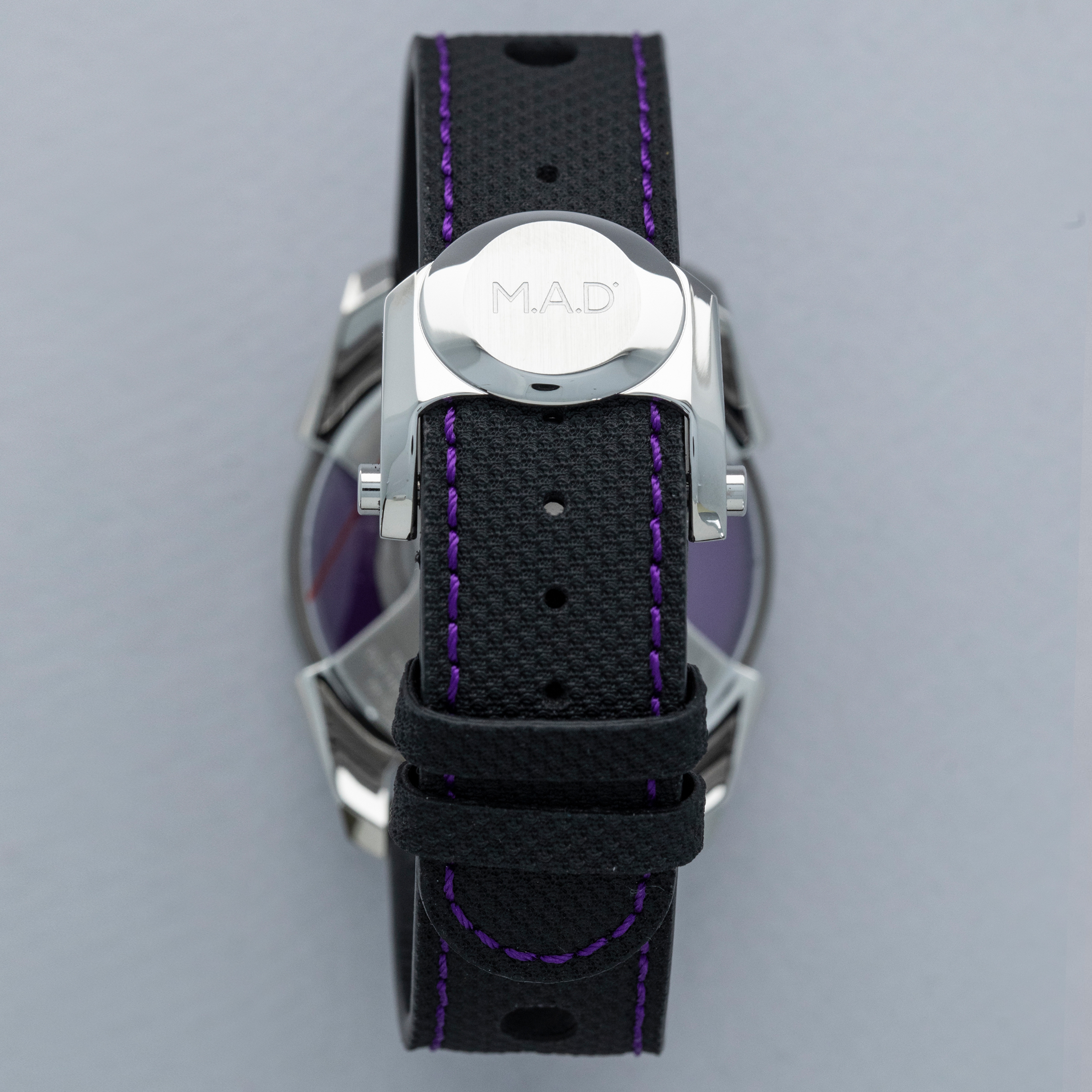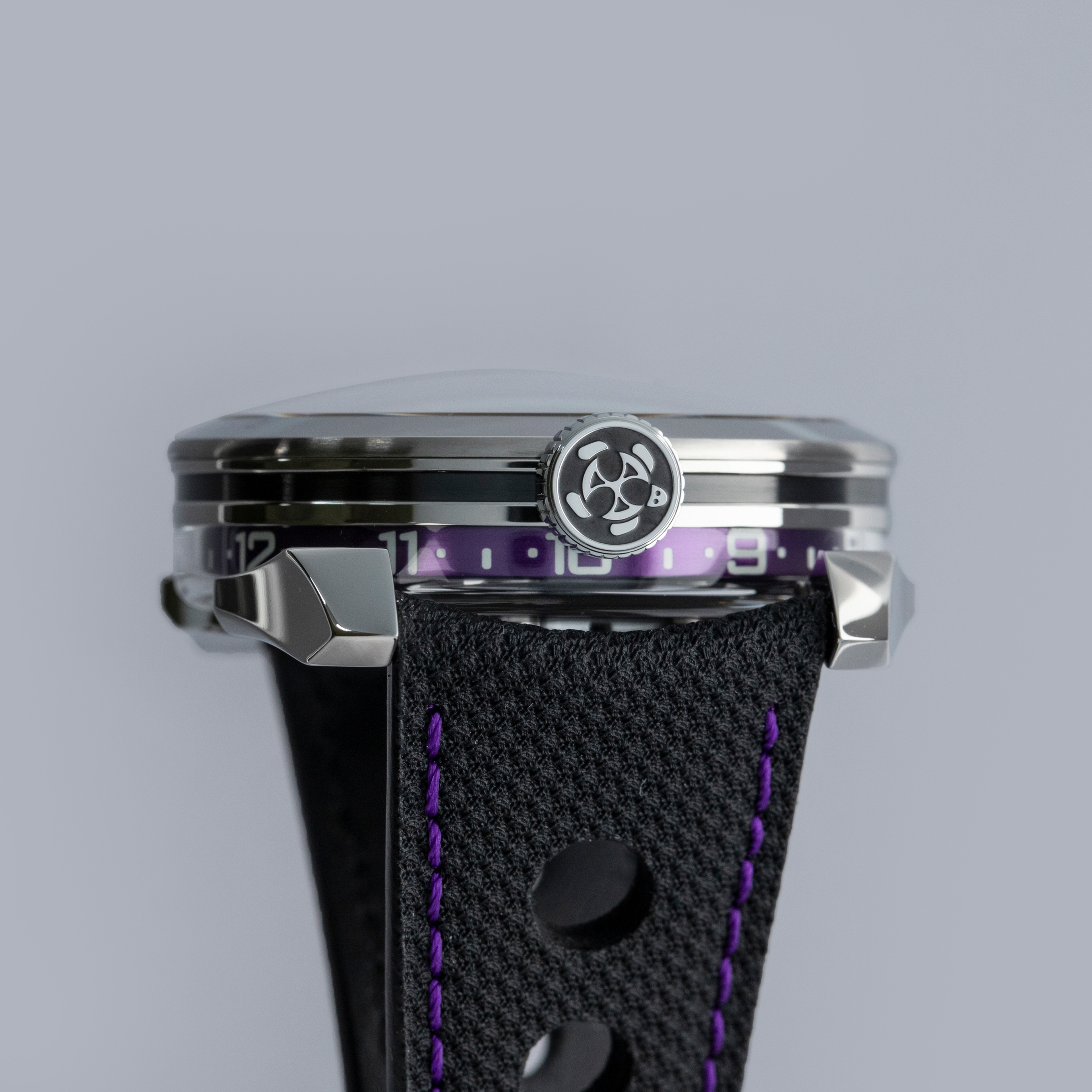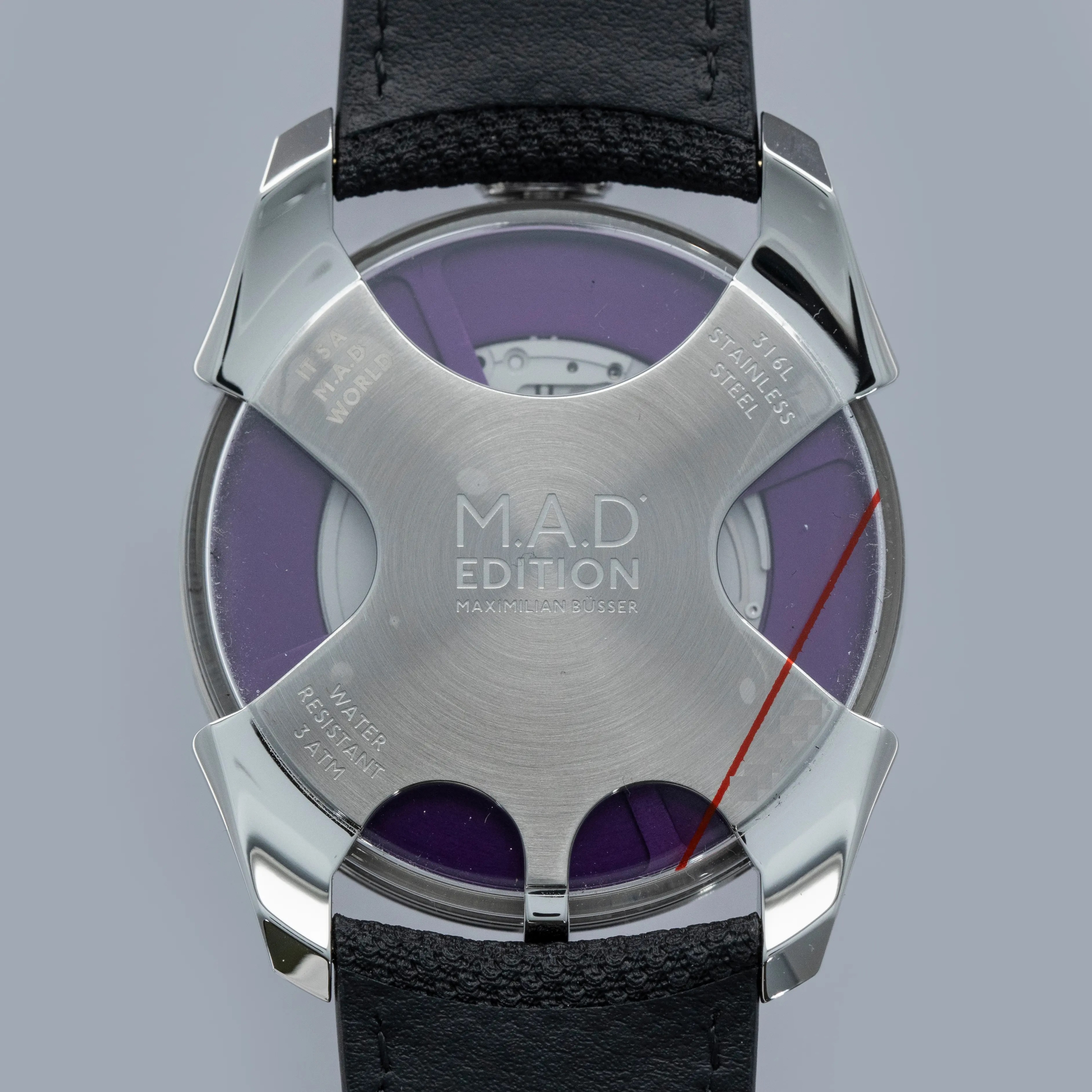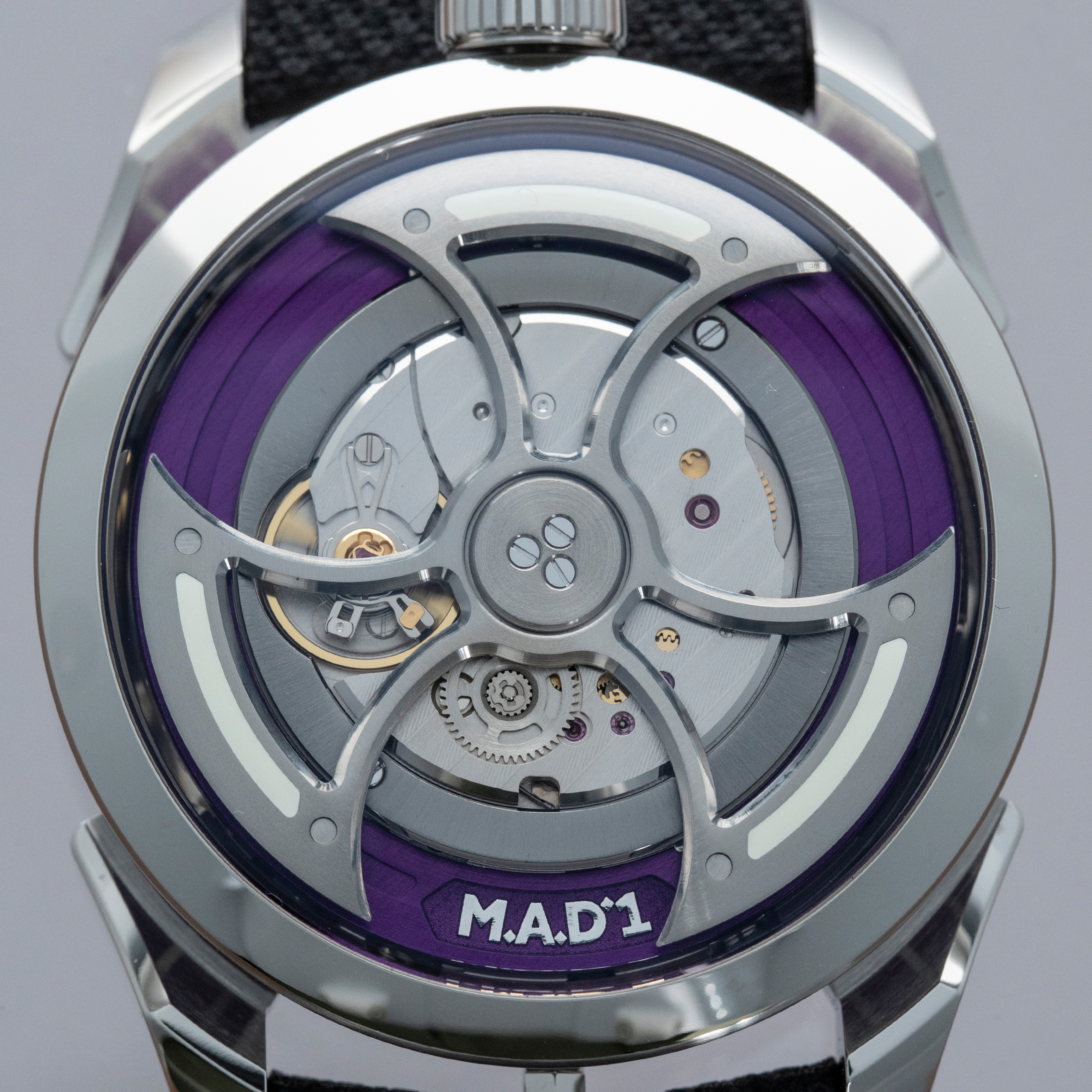 Launched in 2024 ahead of Geneva Watch Days 2024, the model that we have here is an improved version of the M.A.D.1, the M.A.D. 1S (S for “Slim”). Offered in two colorways, purple and blue, the example that we have here is the purple version, which was offered only to members of the ‘Tribe’, which are friends, family, and VIPs of the brand. Featuring the same overarching design and time display, the M.A.D. 1S swaps the 18.8mm tall profile of the M.A.D. 1 for a much slimmer 15mm – a total saving of 3.8mm that makes the watch far more wearable. This was made possible by swapping the Miyota cal. 821A that powers the M.A.D. 1 for a new movement, the La Joux-Perret cal. G101, a movement that didn't exist when the M.A.D. 1 was launched.