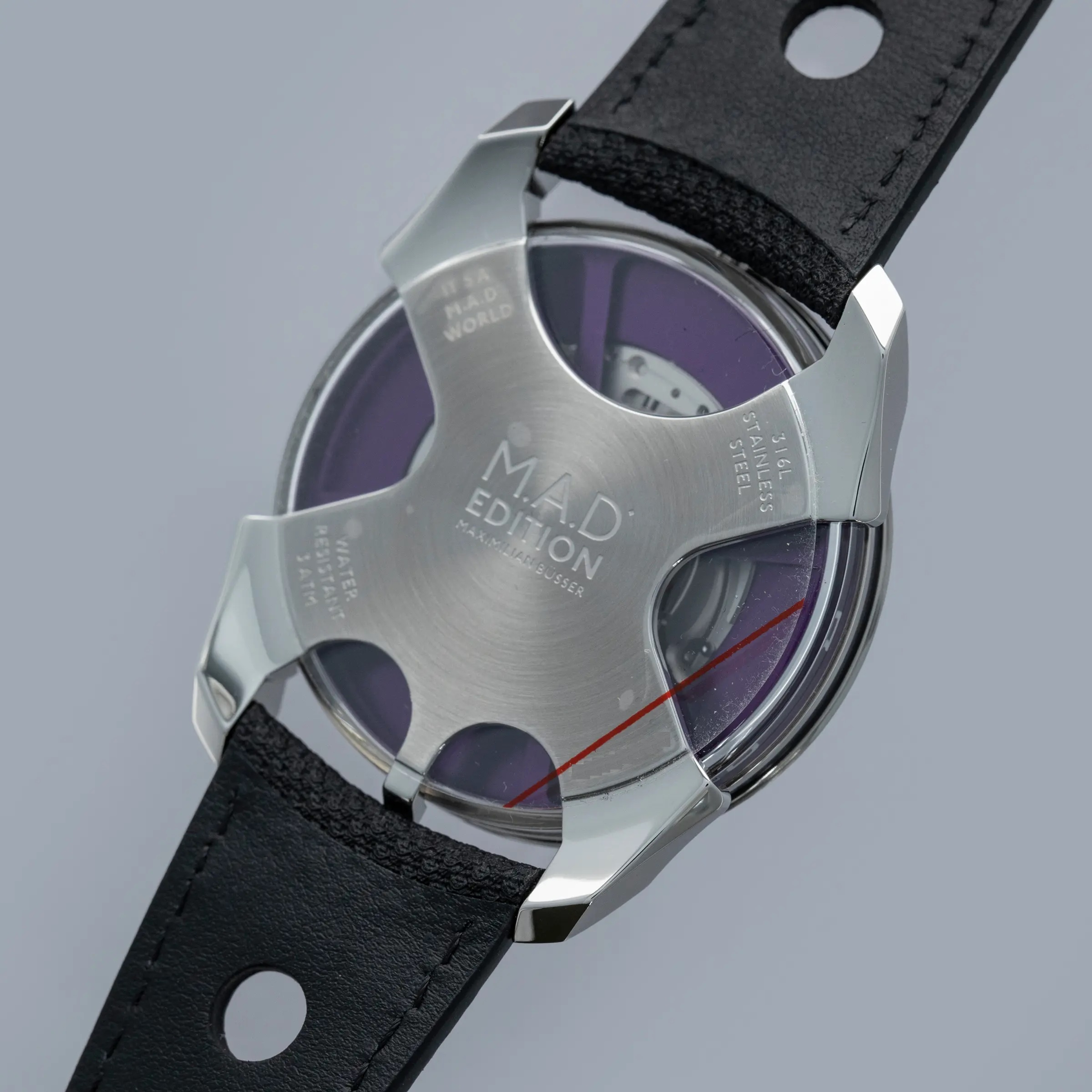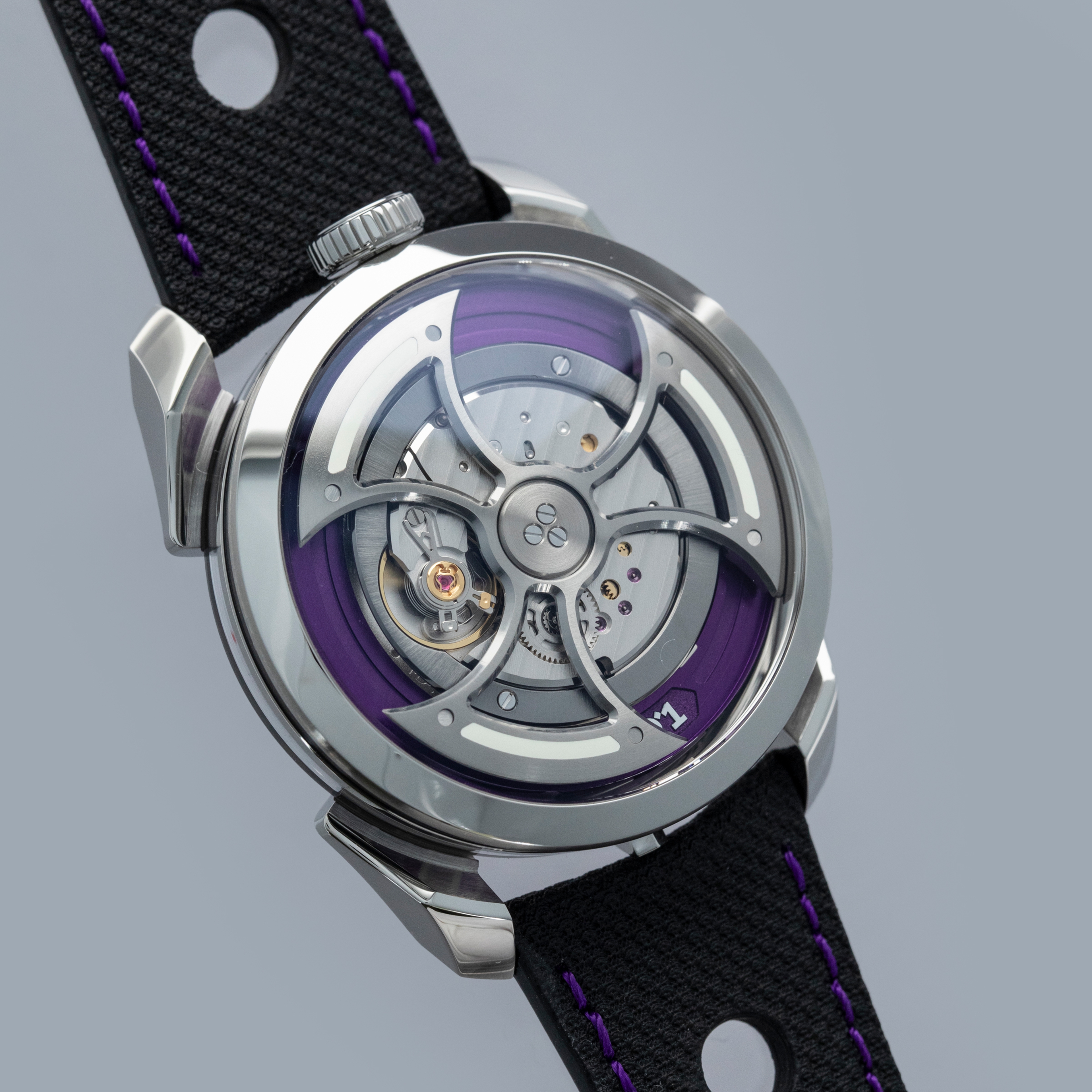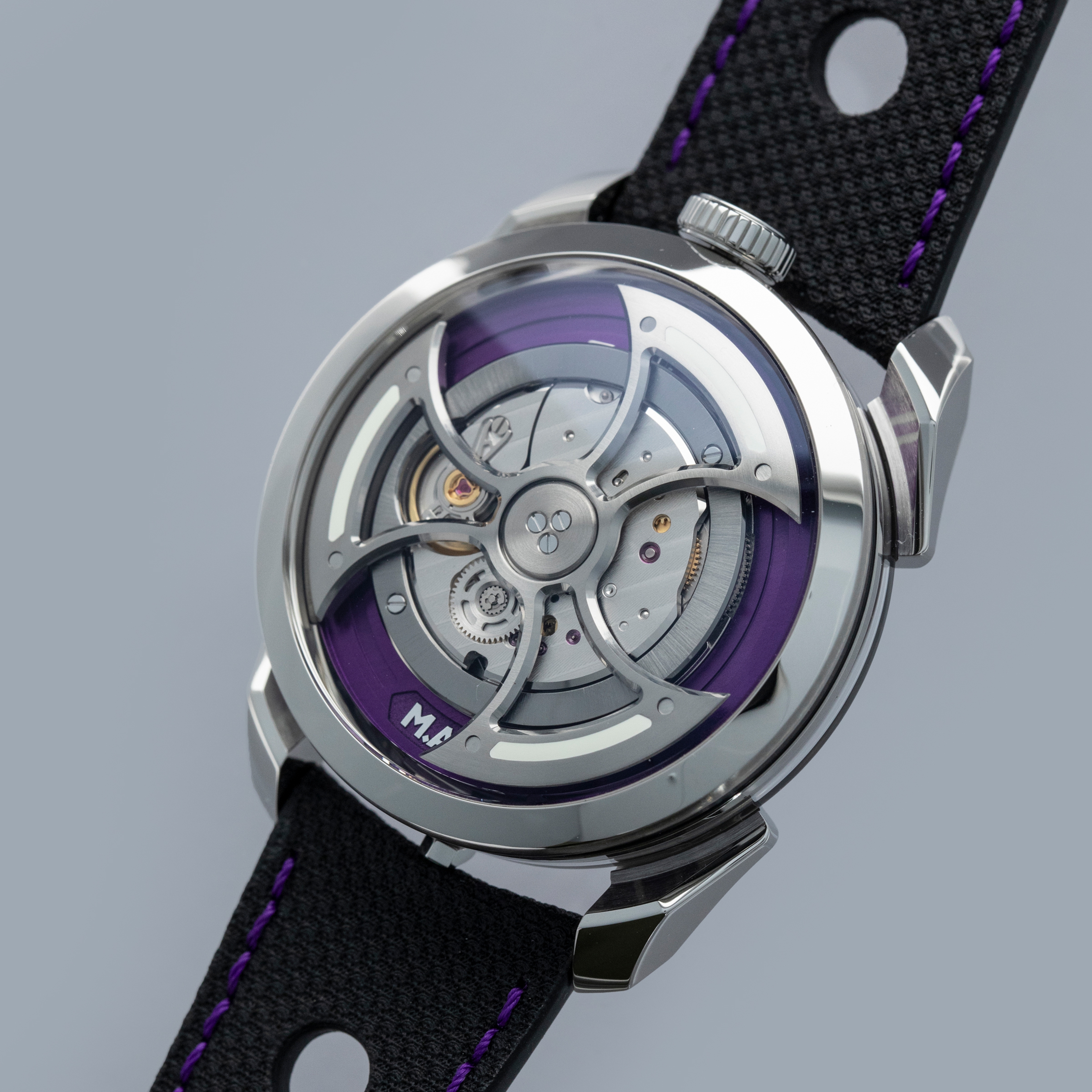 Powered by the heavily modified and upside-down La Joux-Perret cal. G101, the M.A.D. 1S's party trick is its incredibly fast spinning triple-blade top-mounted winding rotor which sits atop a purple ring. Quite the spectacle.