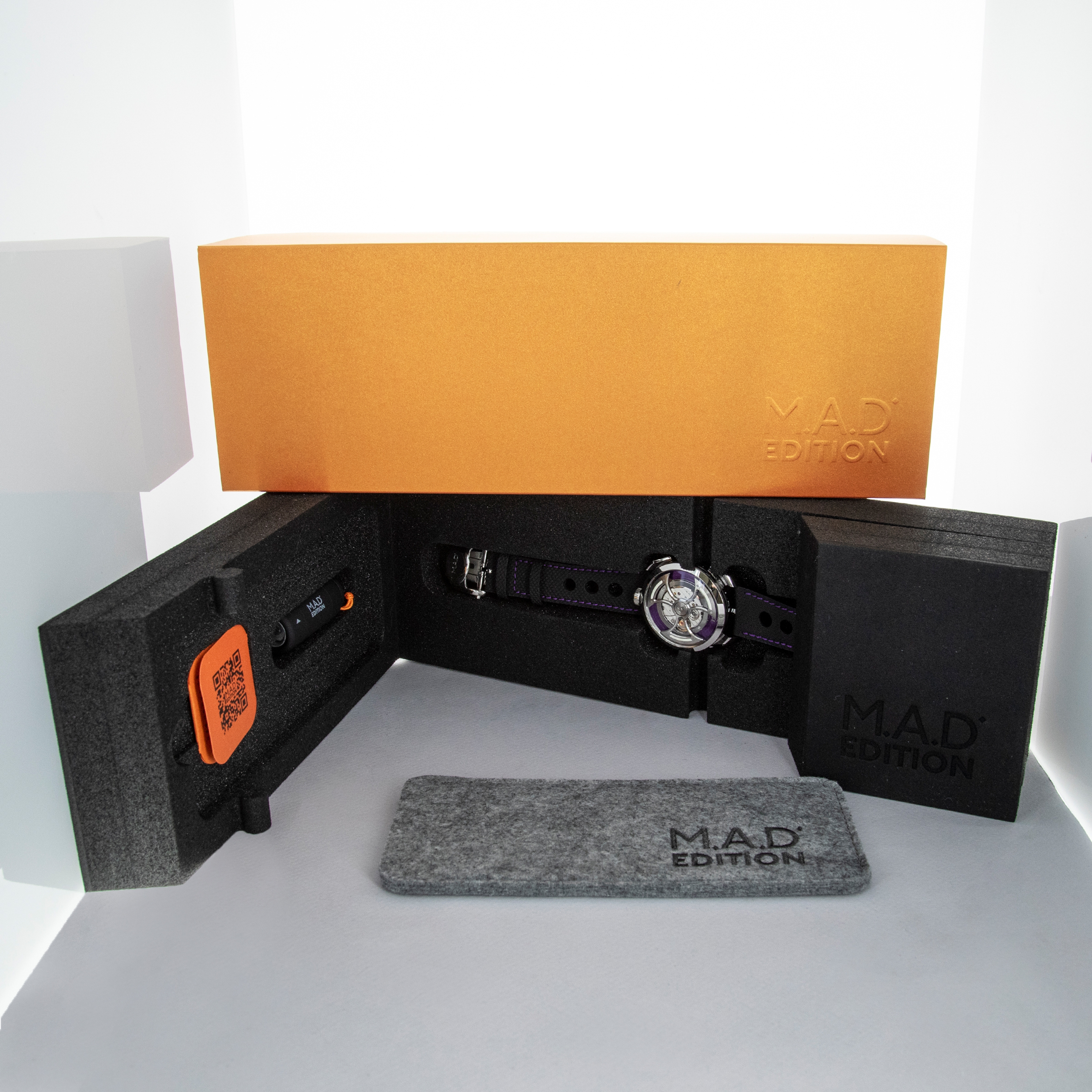 Famed for his flamboyant and eccentric designs, Maximilian Busser of MB&F is perhaps one of the best-known watchmaking CEOs in the world of horology. While his incredibly keen eye for detail has helped establish MB&F at the zenith of watchmaking, it is no surprise that collectors around the world, who he calls the Tribe, have been drawn to his charismatic devotion to his collectors. Powered by this devotion, Max began designing a new timepiece in 2020 that would blend his incredibly unique design language with a price tag that would be far more palatable than what MB&F timepieces are usually accompanied by. Offered only to a small selection of MB&F’s most-valued collectors and friends before going to a public raffle, the M.A.D. Edition 1 was the result of that design process. Powered by a heavily modified automatic Miyota cal. 821A, the M.A.D. Edition 1 features a lateral time display and a titanium and tungsten triple-blade winding rotor that sits atop its case and spins incredibly fast above an aluminum ring. This is then matched by the aluminum ring that rotates around the case as the hour display, which features a grey minute ring beneath it which rotates the very same way. An incredibly personal piece of design from Max’s perspective and an incredibly cool-looking and rare timepiece from the wider-watch community’s perspective, the M.A.D. 1 is as rare a timepiece as it is unique, and this is the perfect opportunity to add one to your collection.