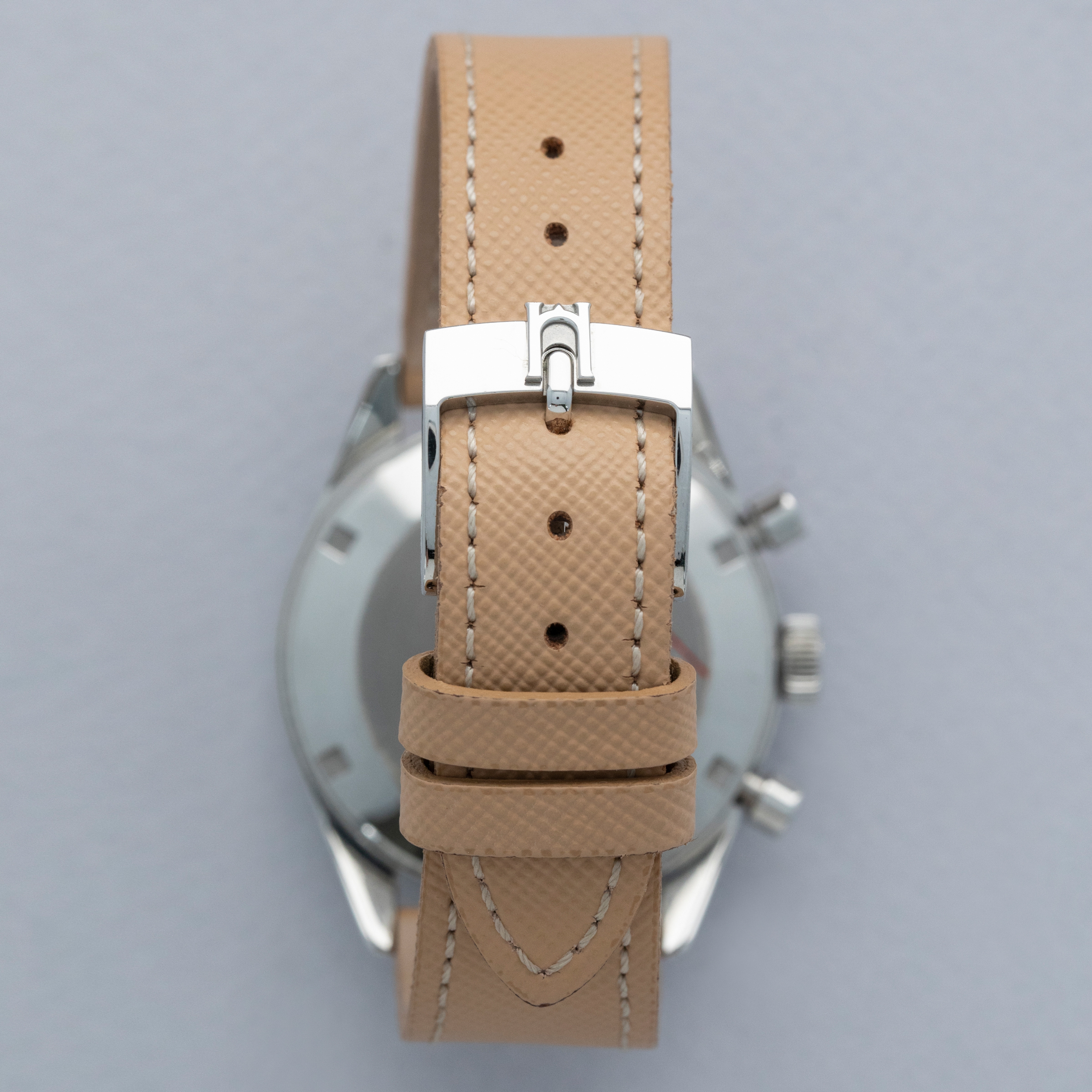 Taking inspiration from the black dial Rodania Geometers that have tropicalized over the years and turned brown, the Massena Lab Geometer's display features a dark brown color in keeping with the original. Additionally, its lume is gently aged.