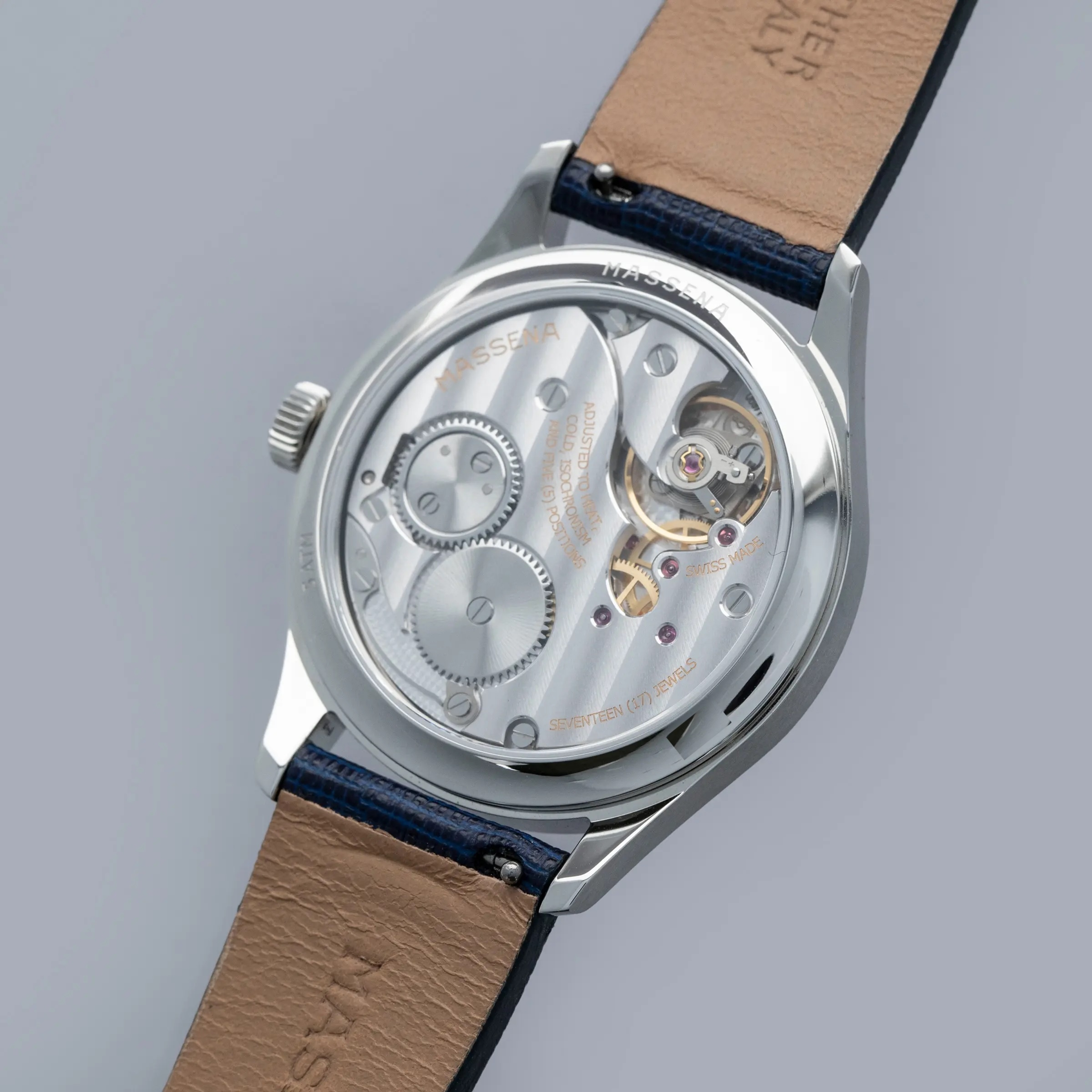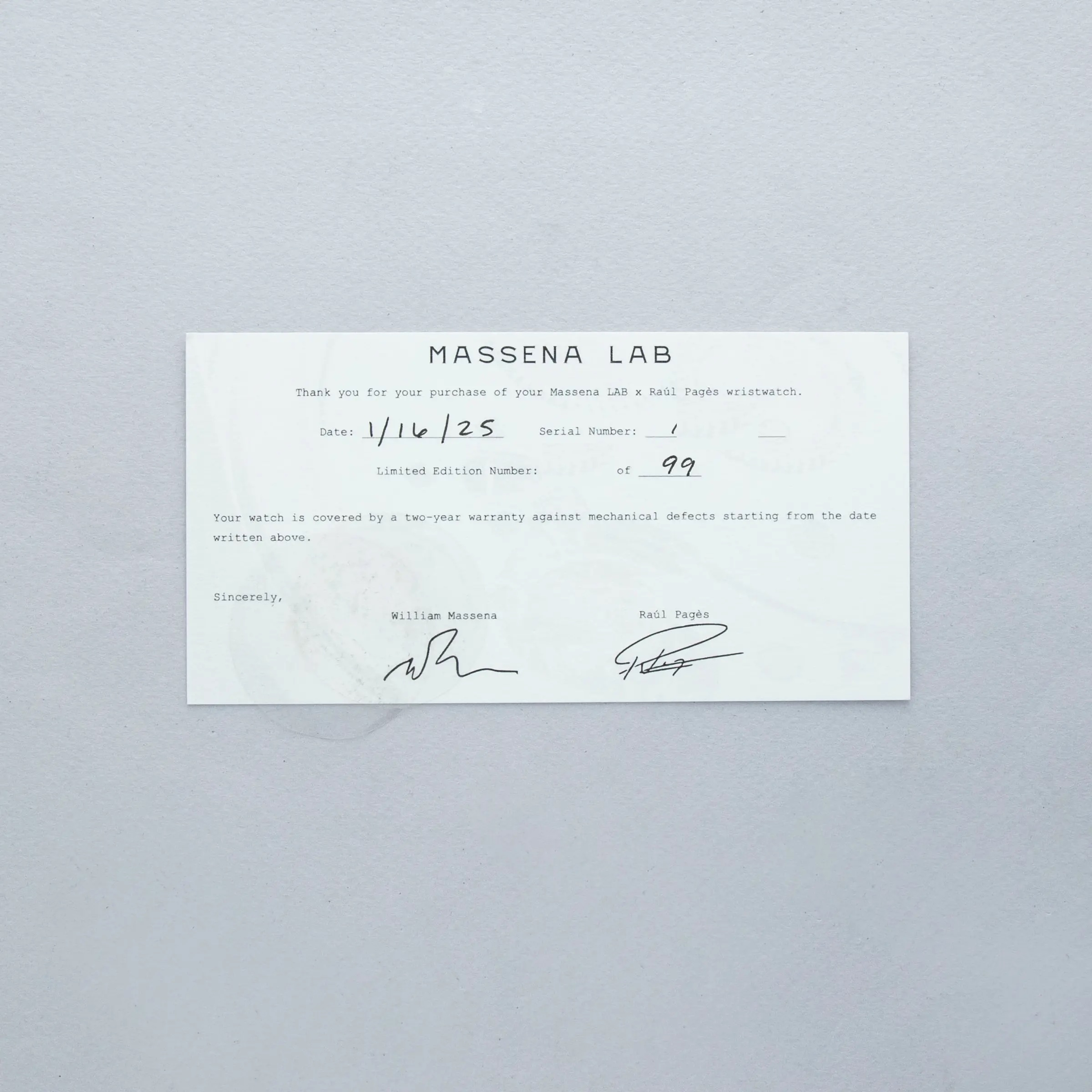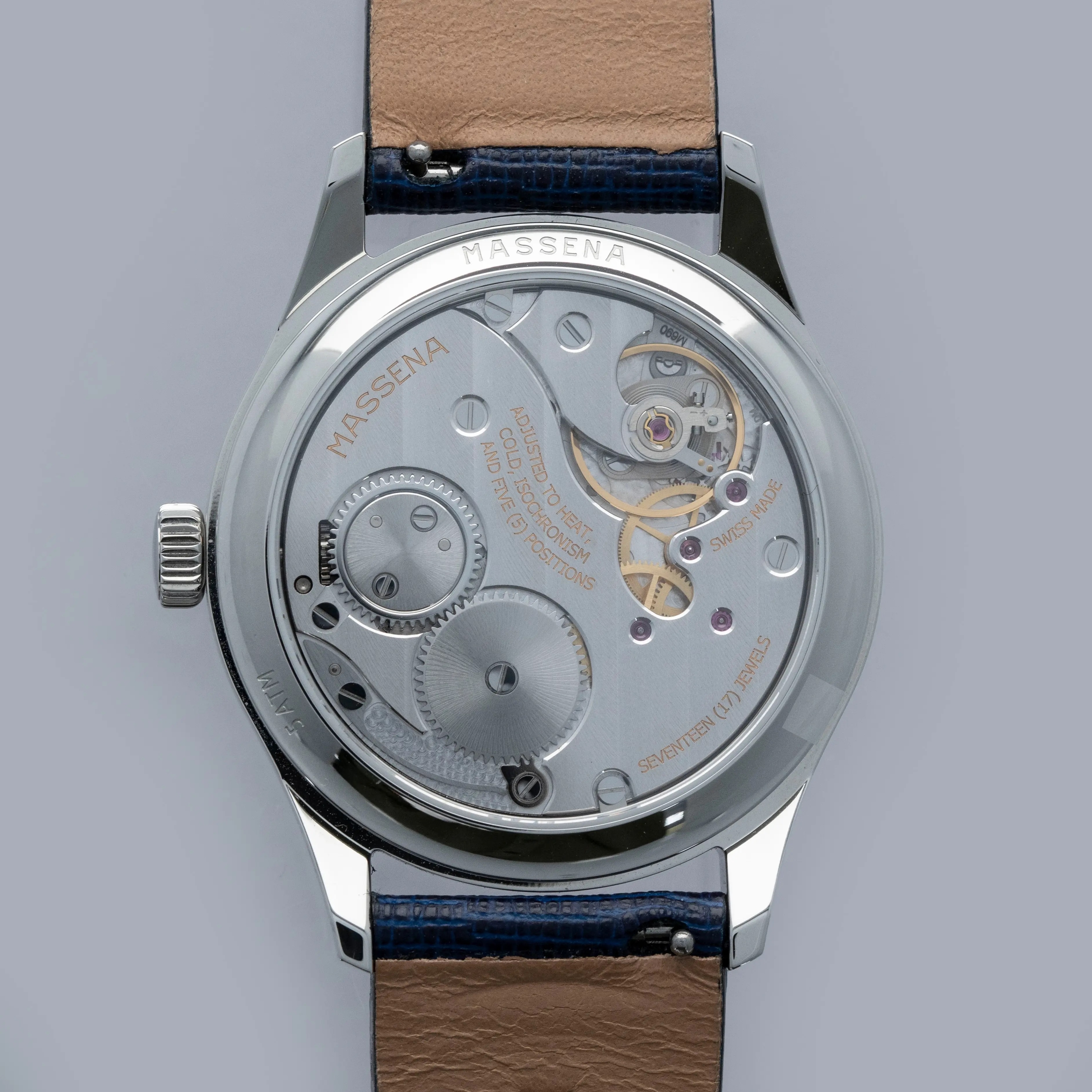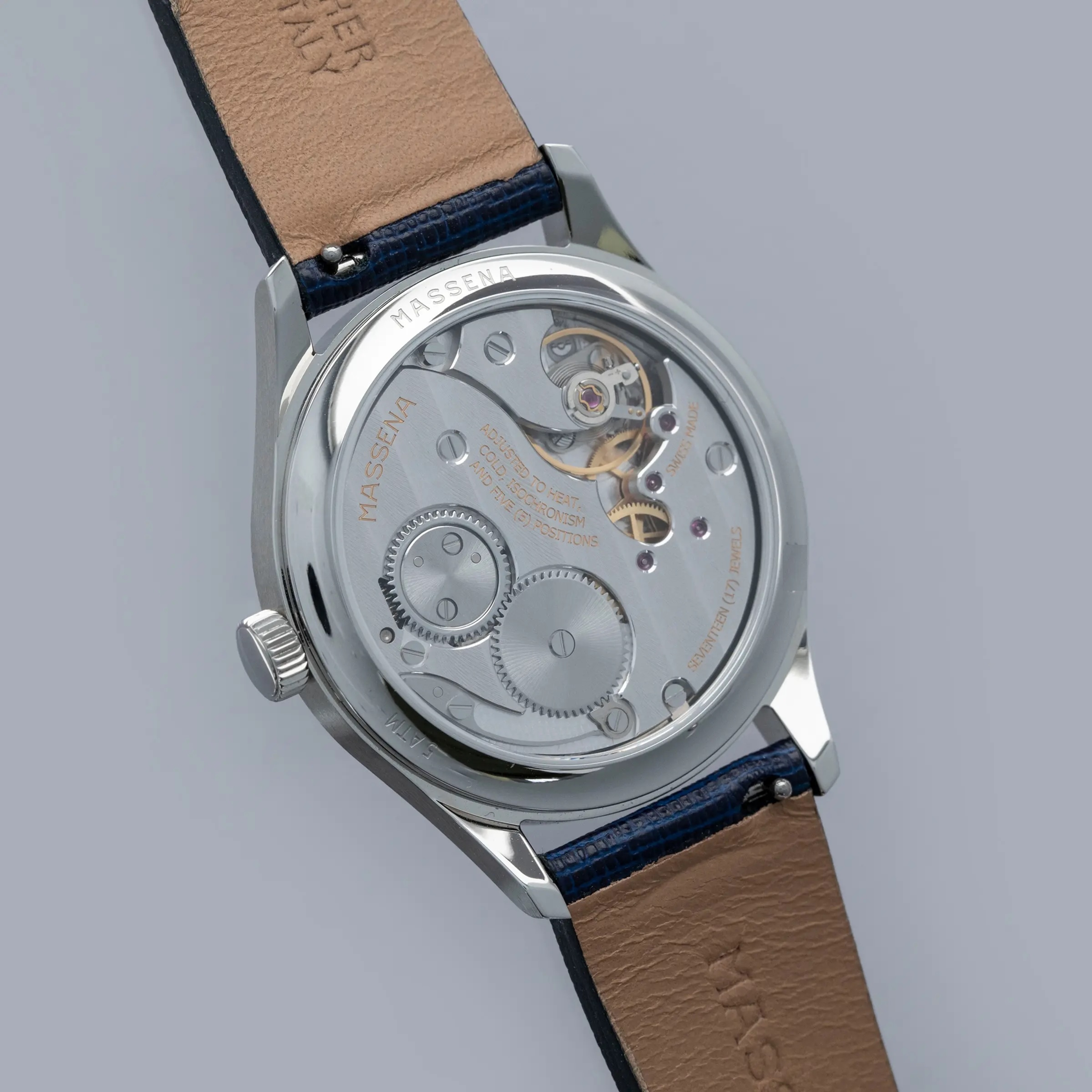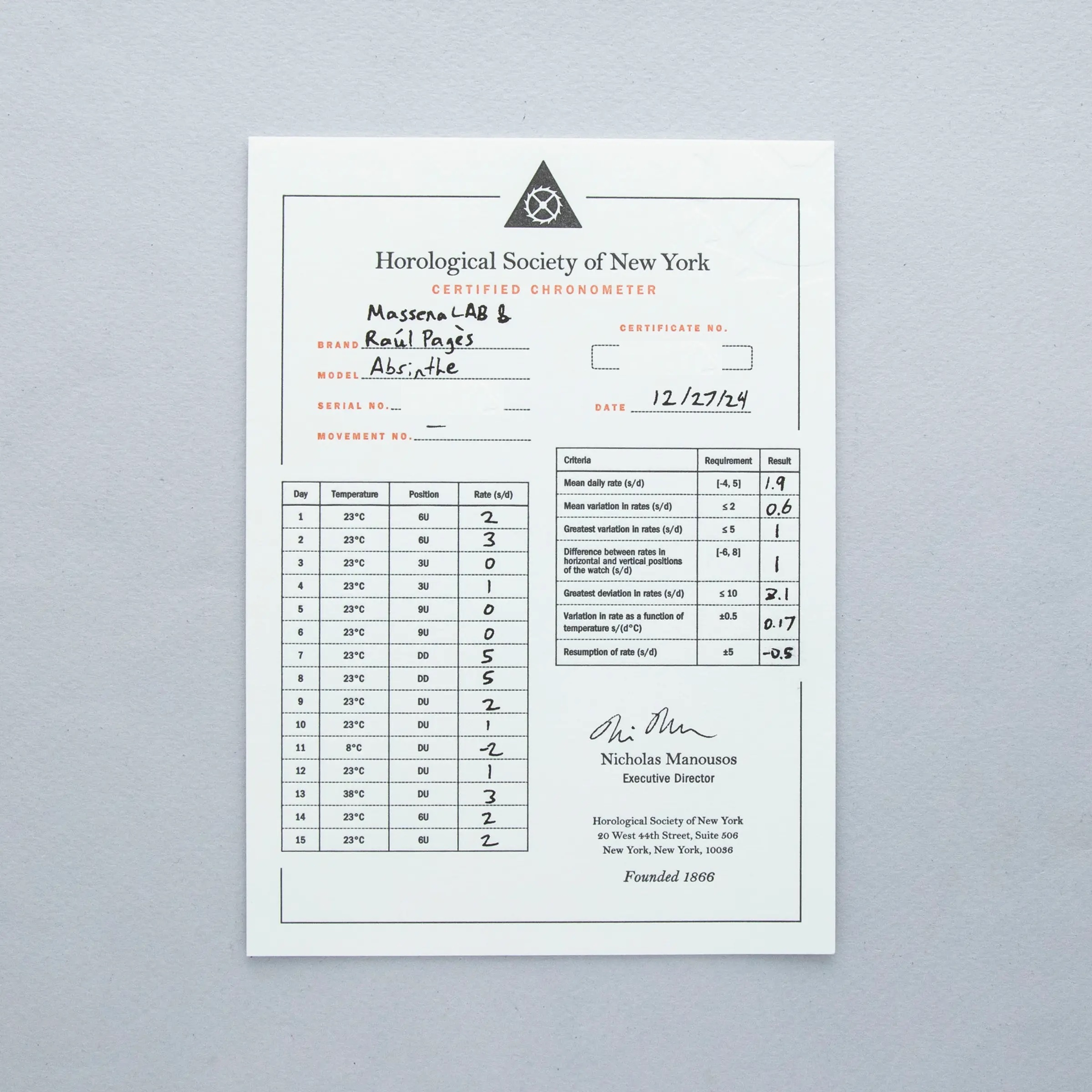 Developed collaboratively between Massena Labs and Raul Pages, the manual-wind cal. M690 was produced under the supervision of Raul Pages, with the assortment and gear train based on the Valjoux cal. 7750. Additionally, owners could send their watch to be chronometer-tested by the HSNY Chronometer Certification Program.