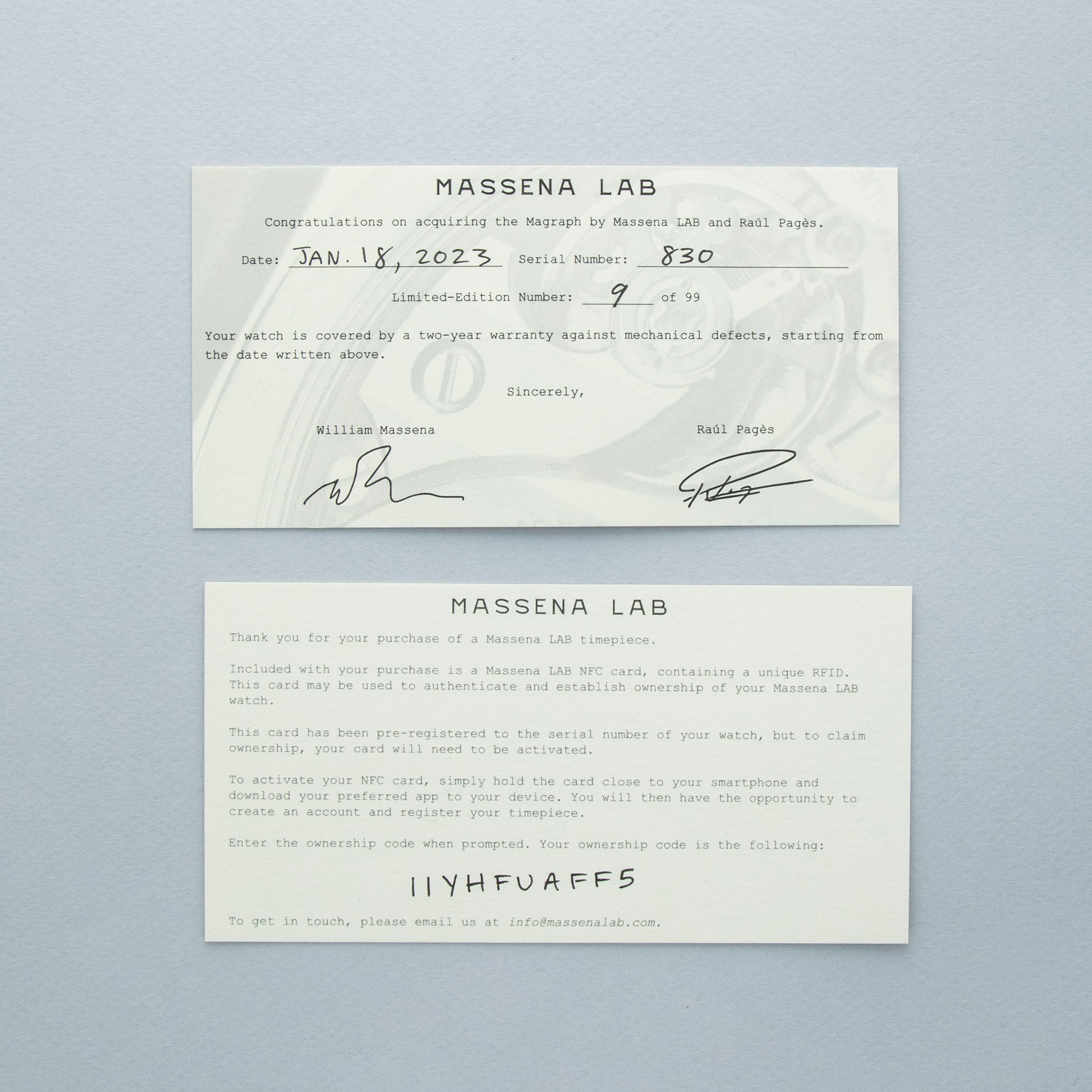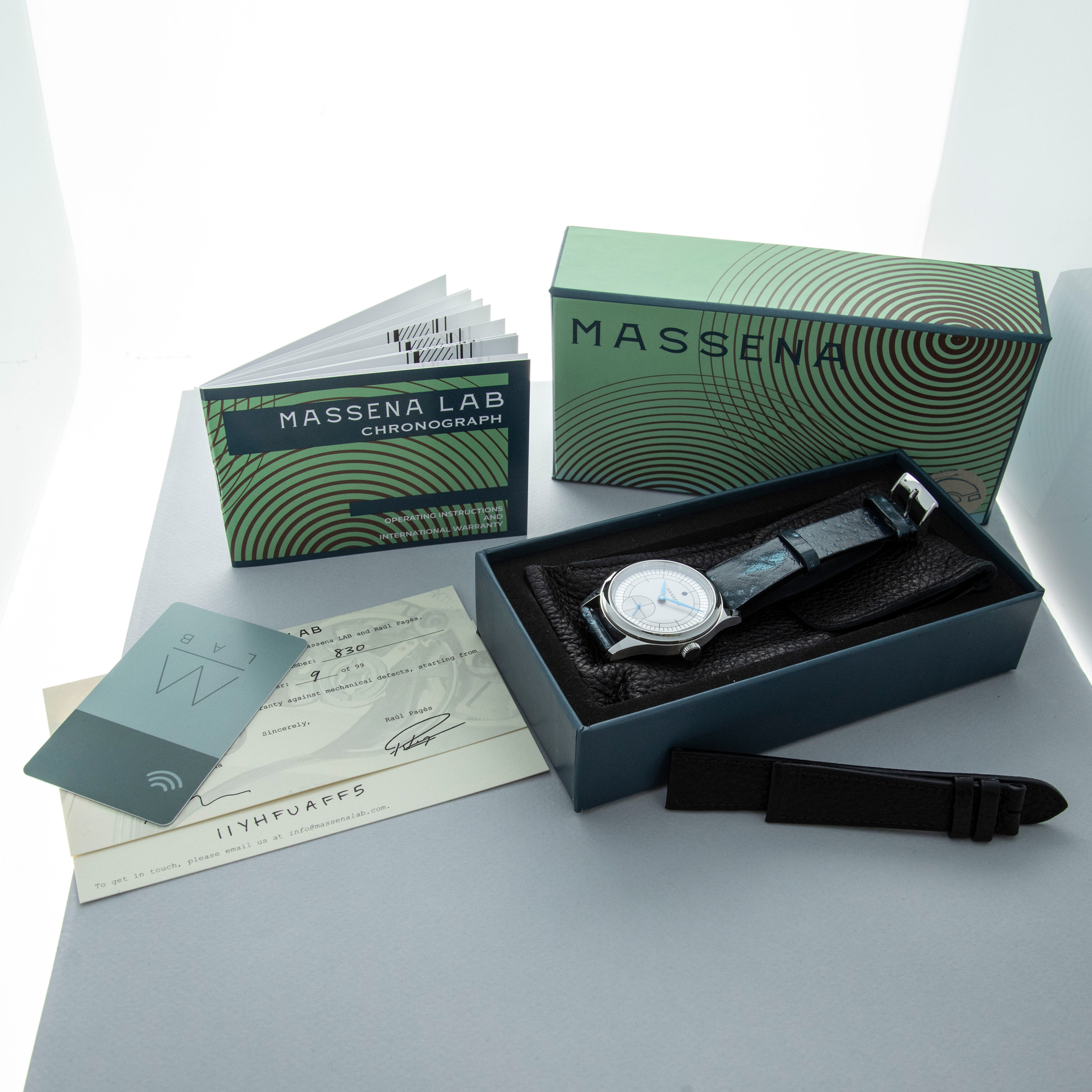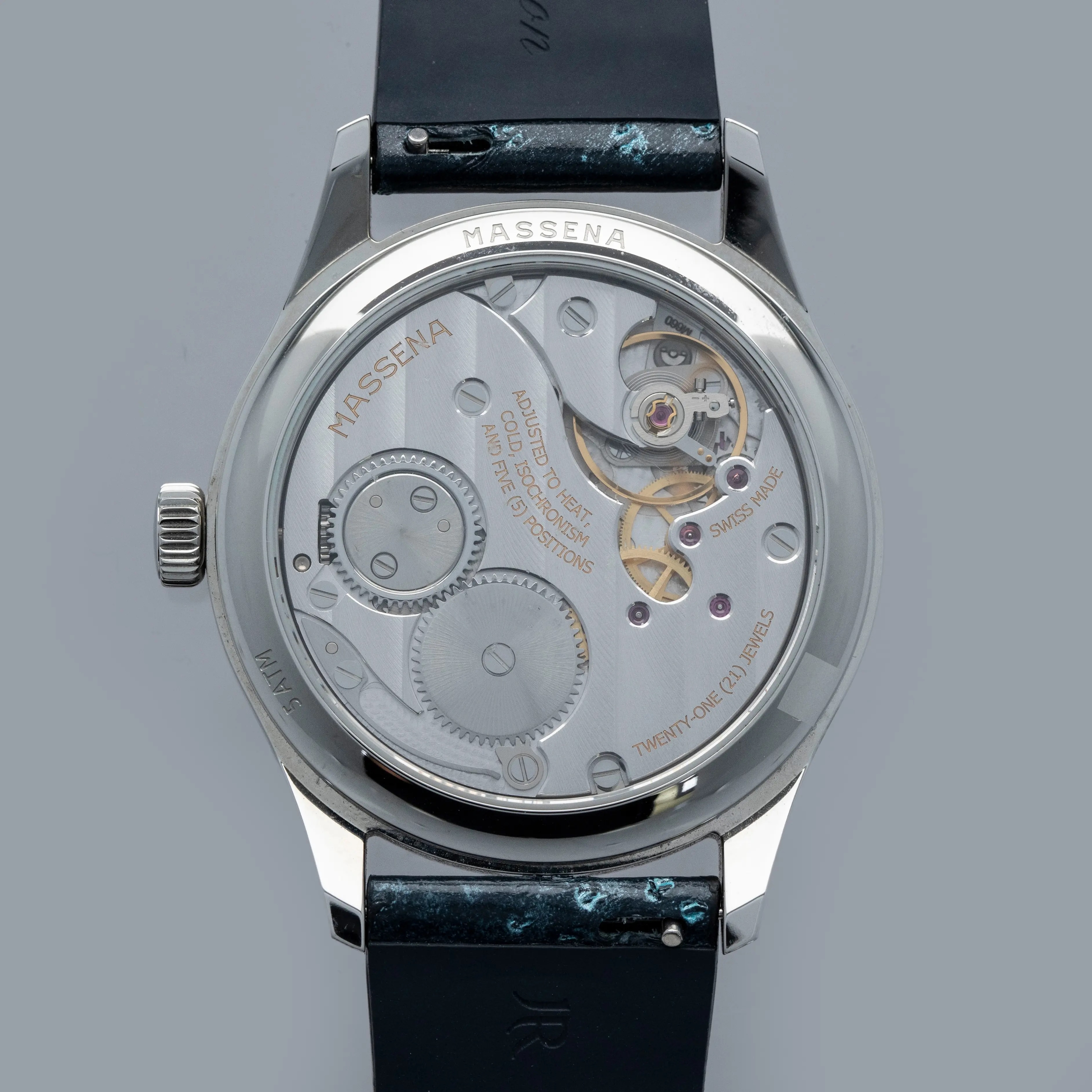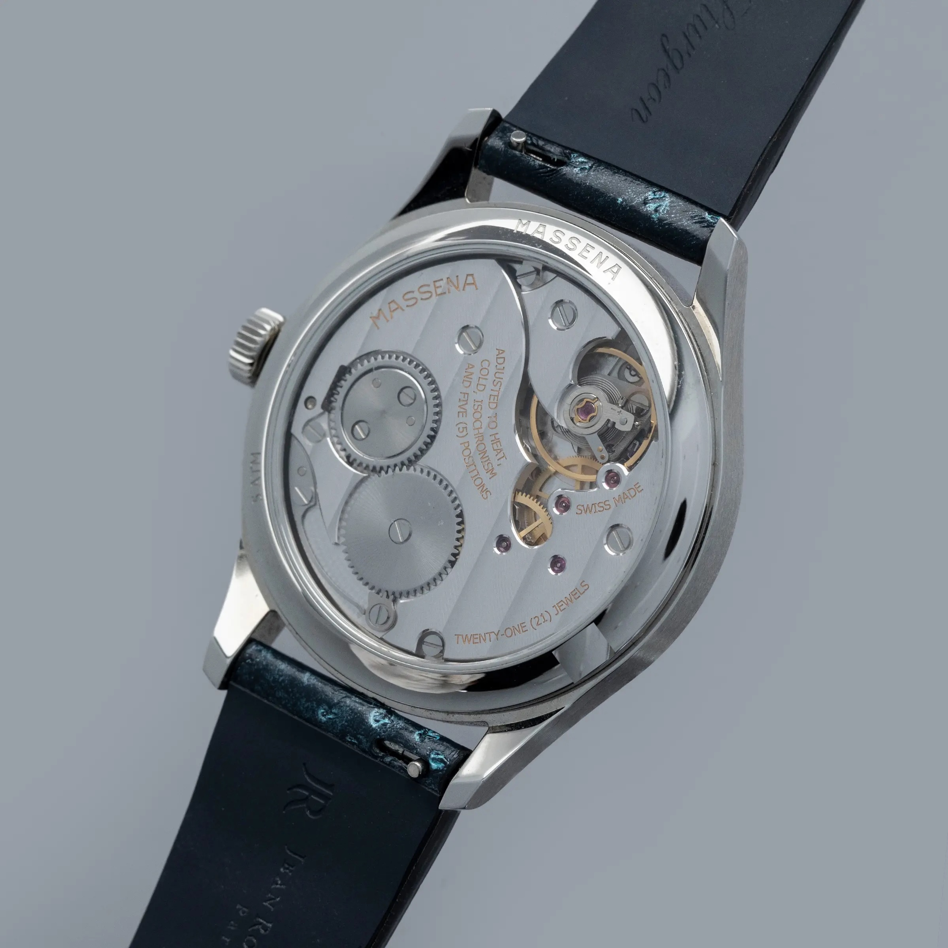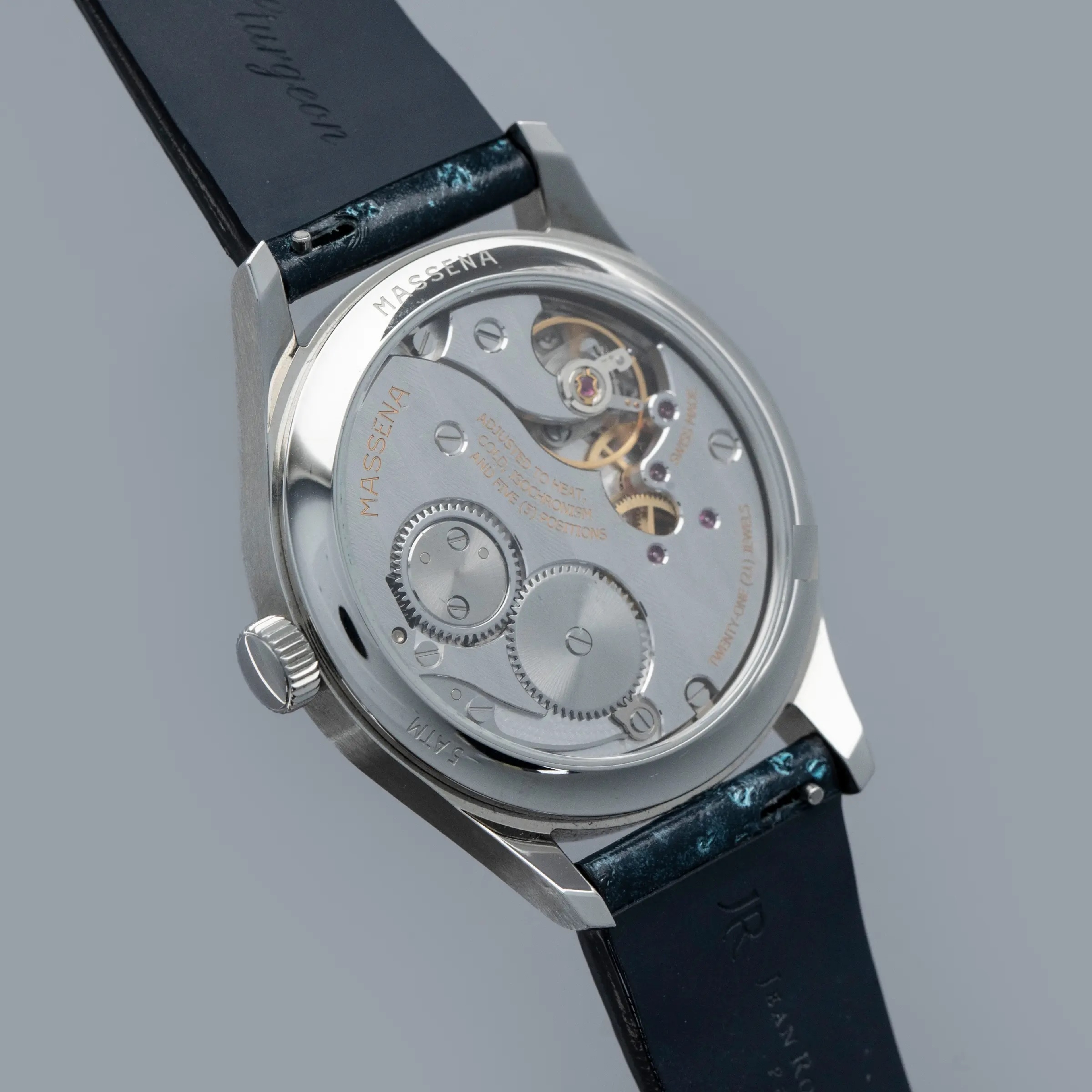 Developed collaboratively between Massena Labs and Raul Pages, the manual-wind cal. M660 was produced under the supervision of Raul Pages, with the assortment and gear train based on the Valjoux cal. 7750. Additionally, the movement boasts an impressive level of hand-finishing, which is most obvious along the hand-chamfered bridges and plates.