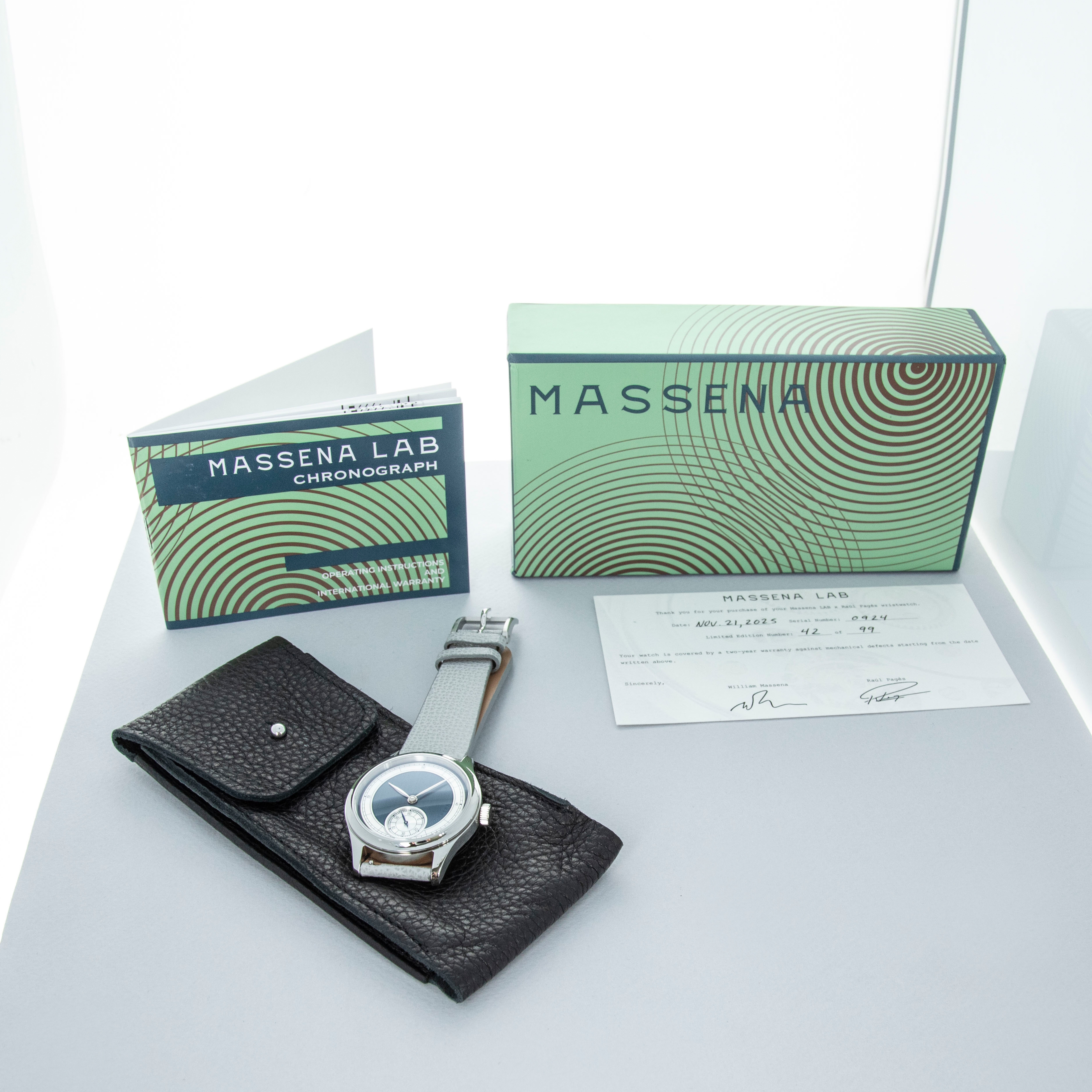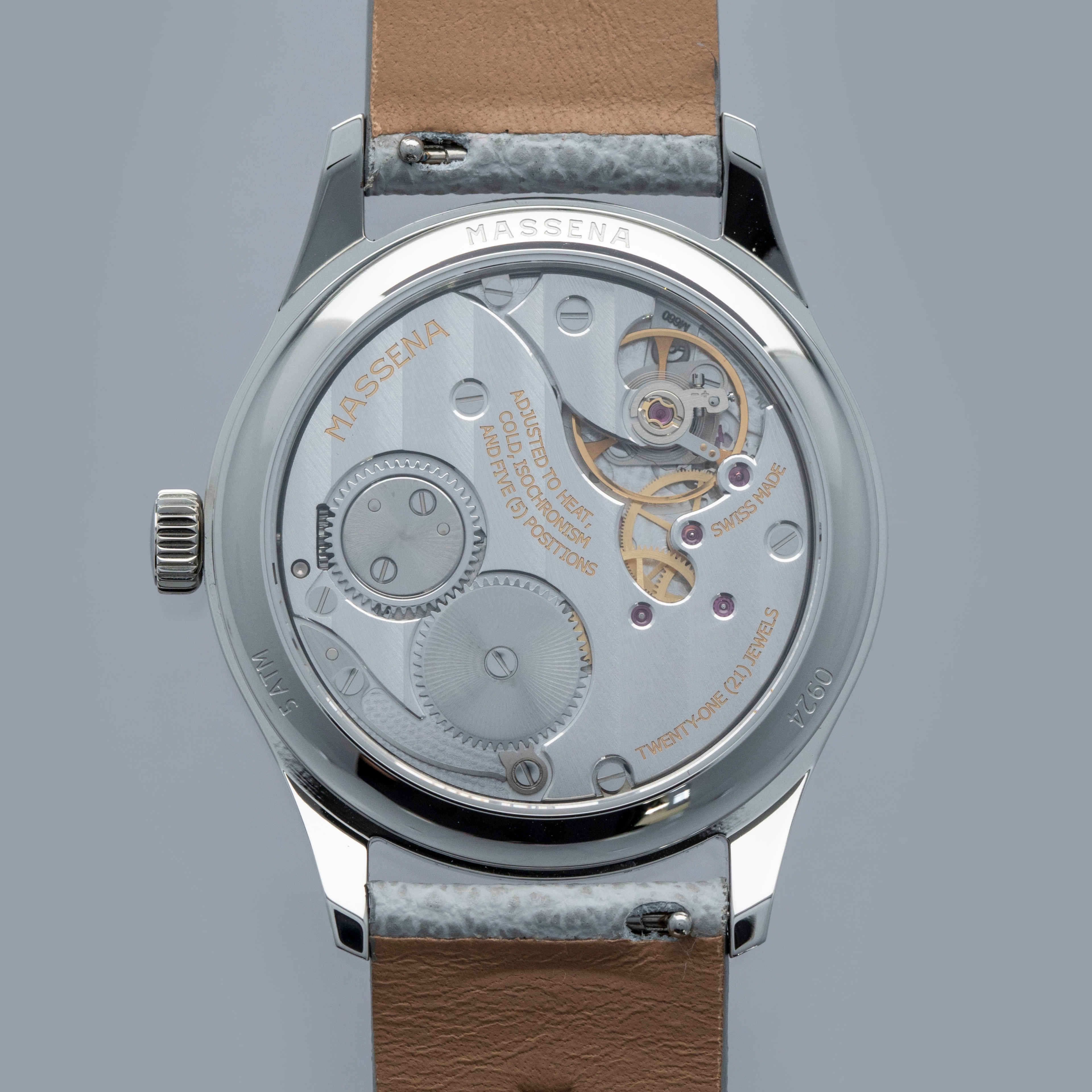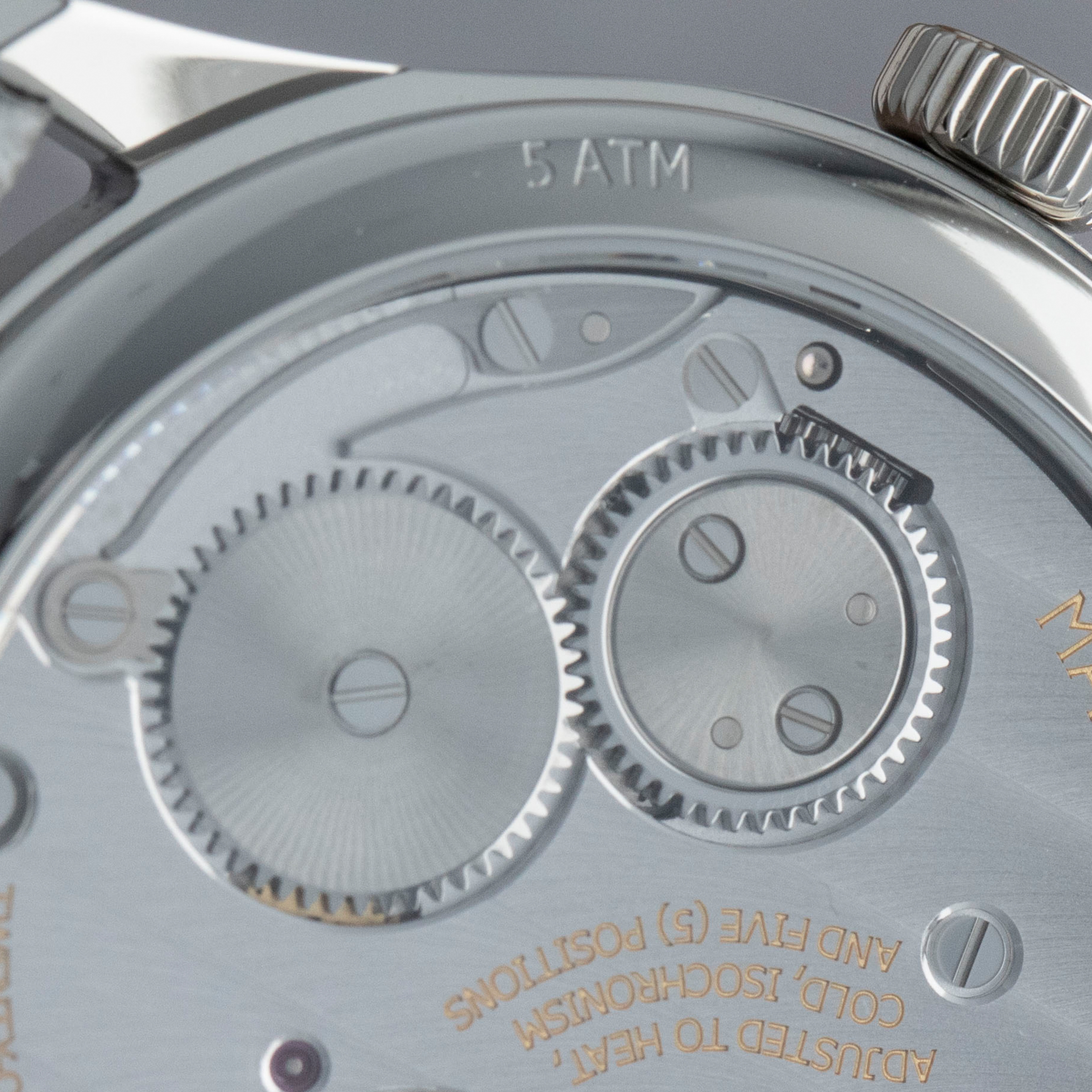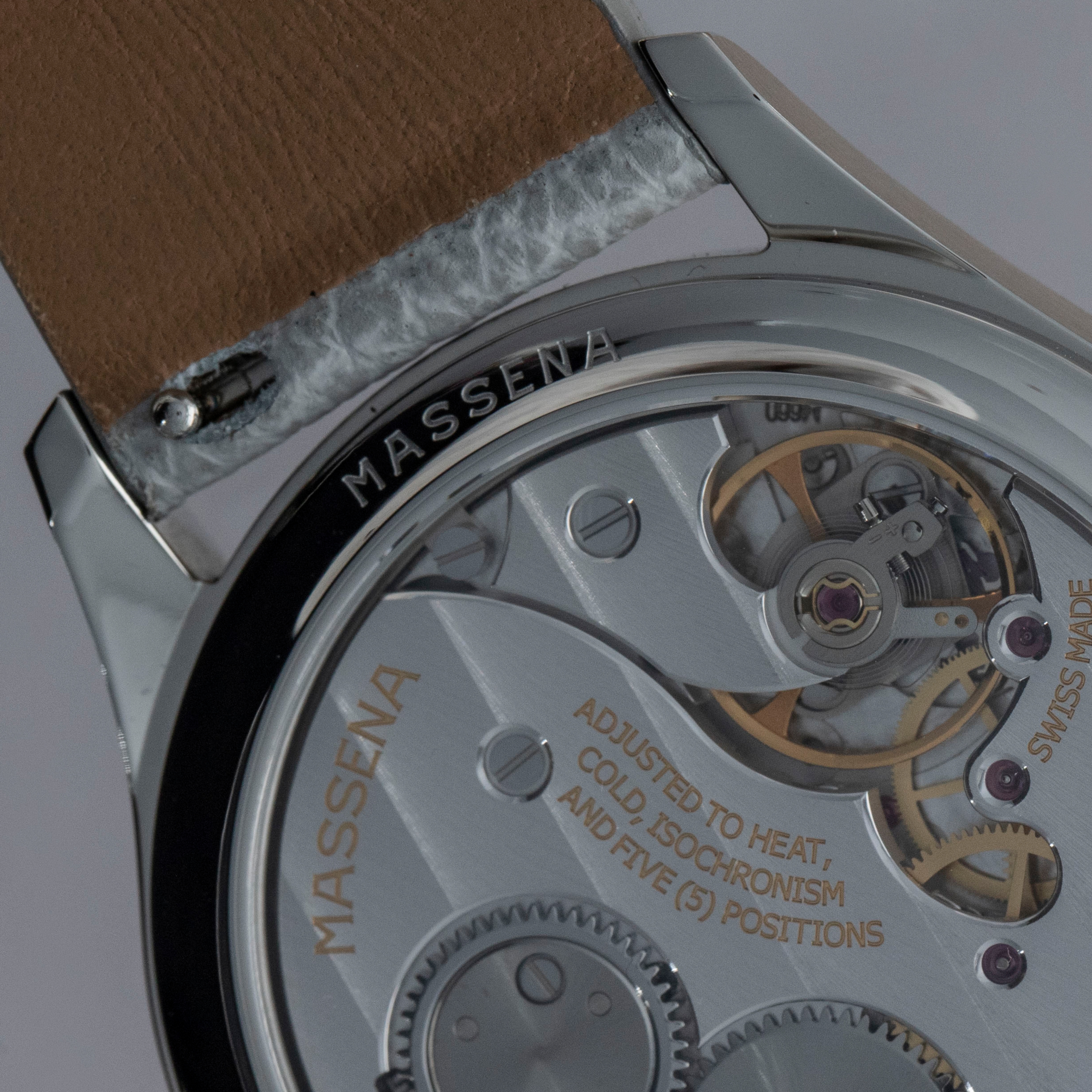 Developed collaboratively between Massena Labs and Raul Pages, the manual-wind cal. M660 was produced under the supervision of Raul Pages, with the assortment and gear train based on the Valjoux cal. 7750. Additionally, the movement boasts an impressive level of hand-finishing, which is most obvious along the hand-chamfered bridges and plates.