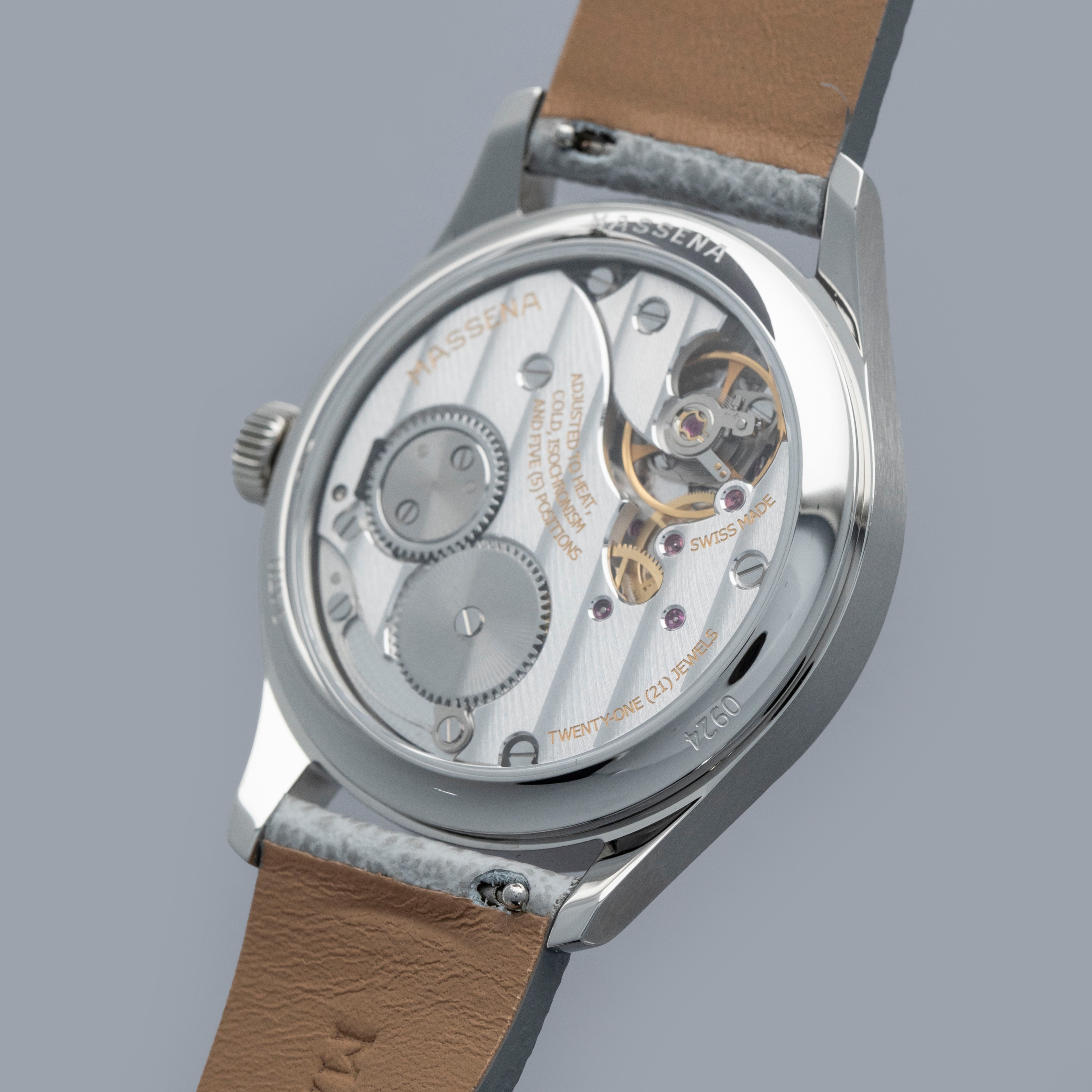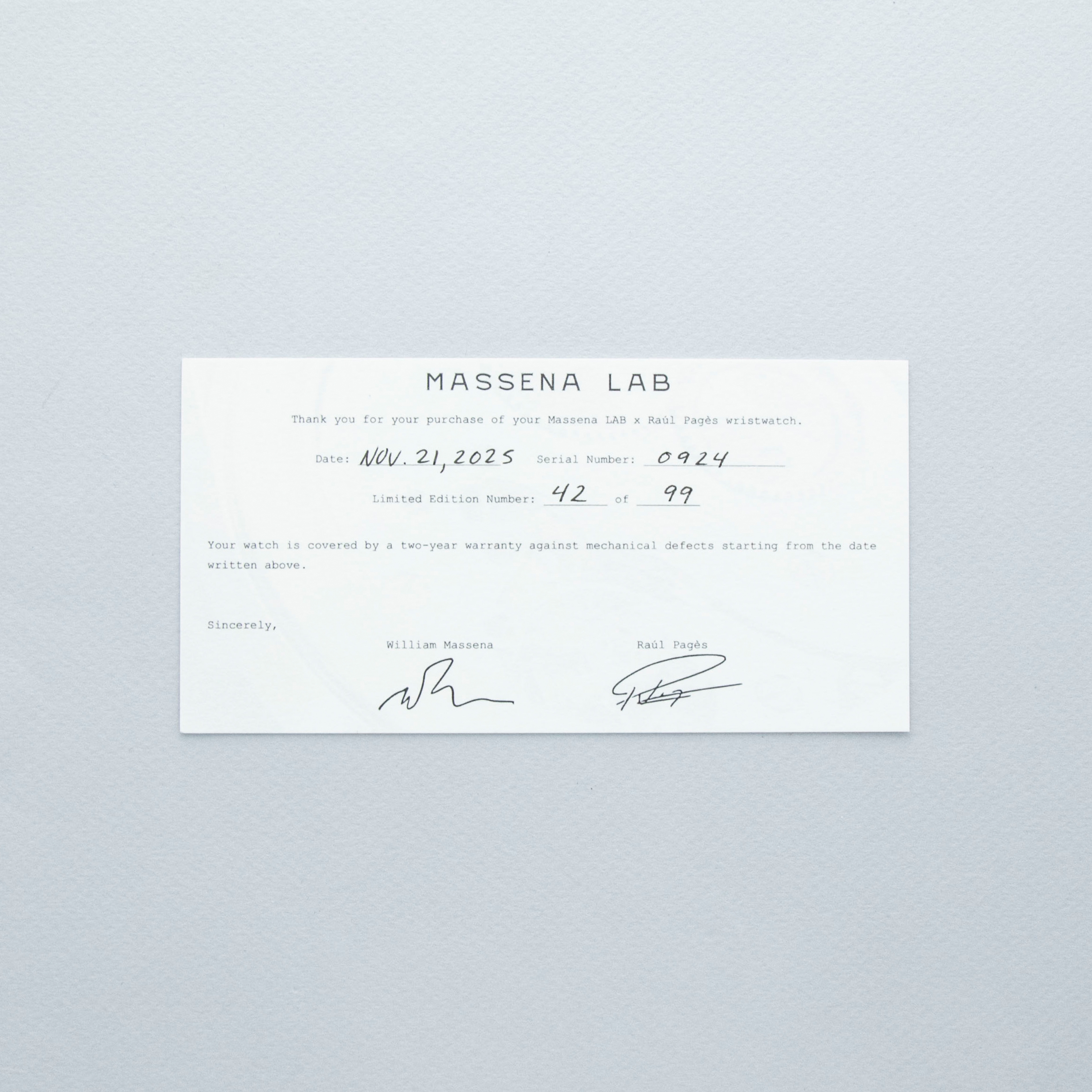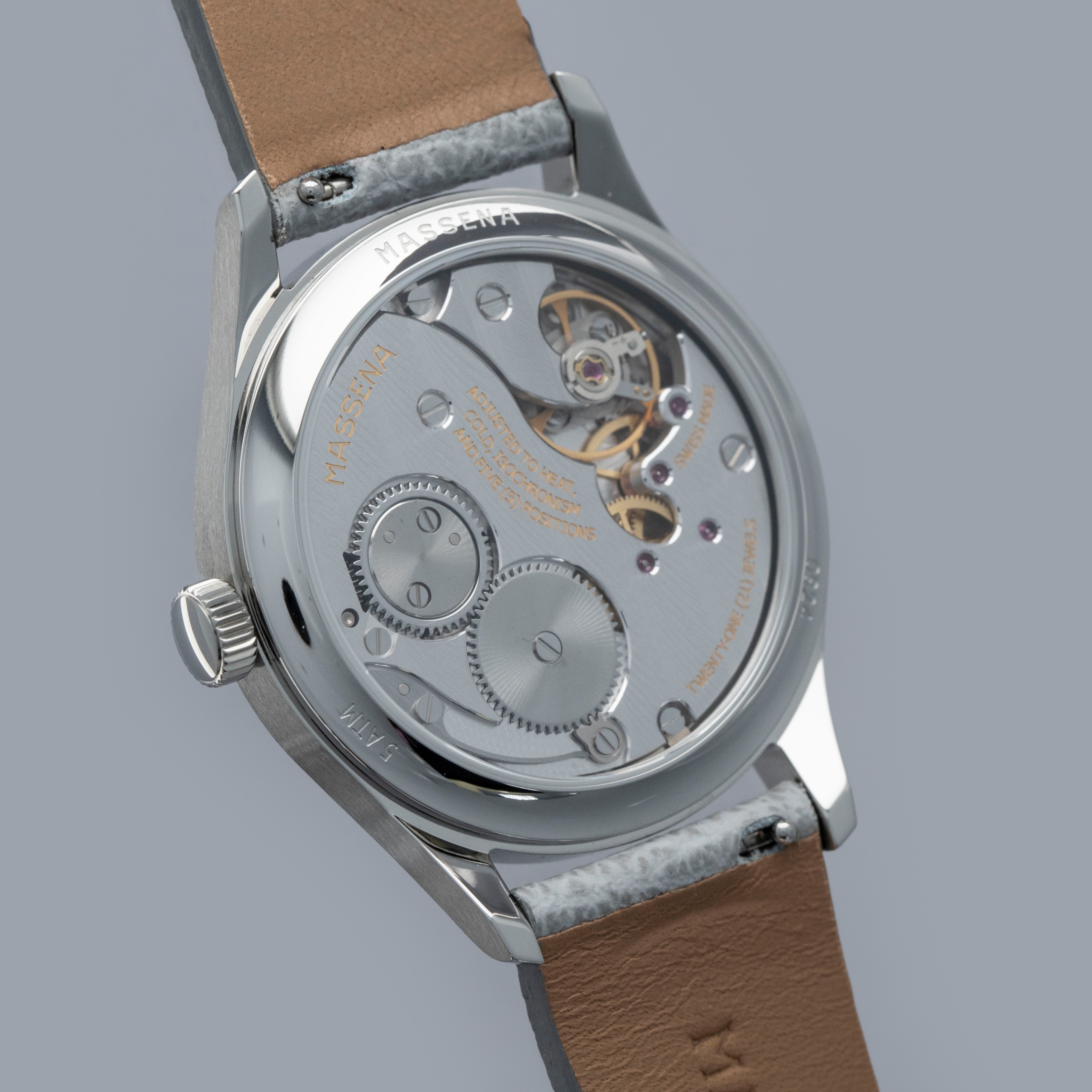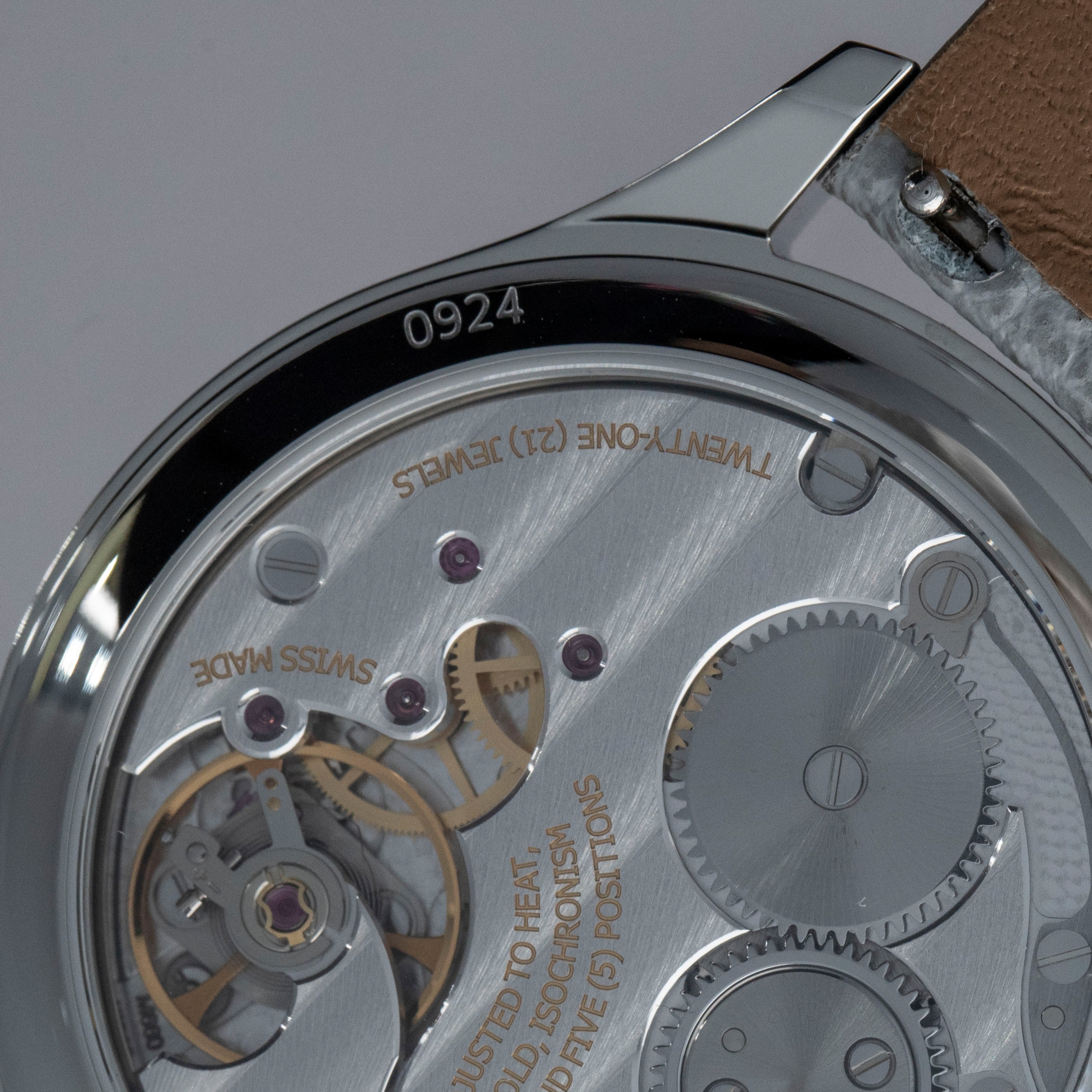 Developed collaboratively between Massena Labs and Raul Pages, the manual-wind cal. M660 was produced under the supervision of Raul Pages, with the assortment and gear train based on the Valjoux cal. 7750. Additionally, the movement boasts an impressive level of hand-finishing, which is most obvious along the hand-chamfered bridges and plates.