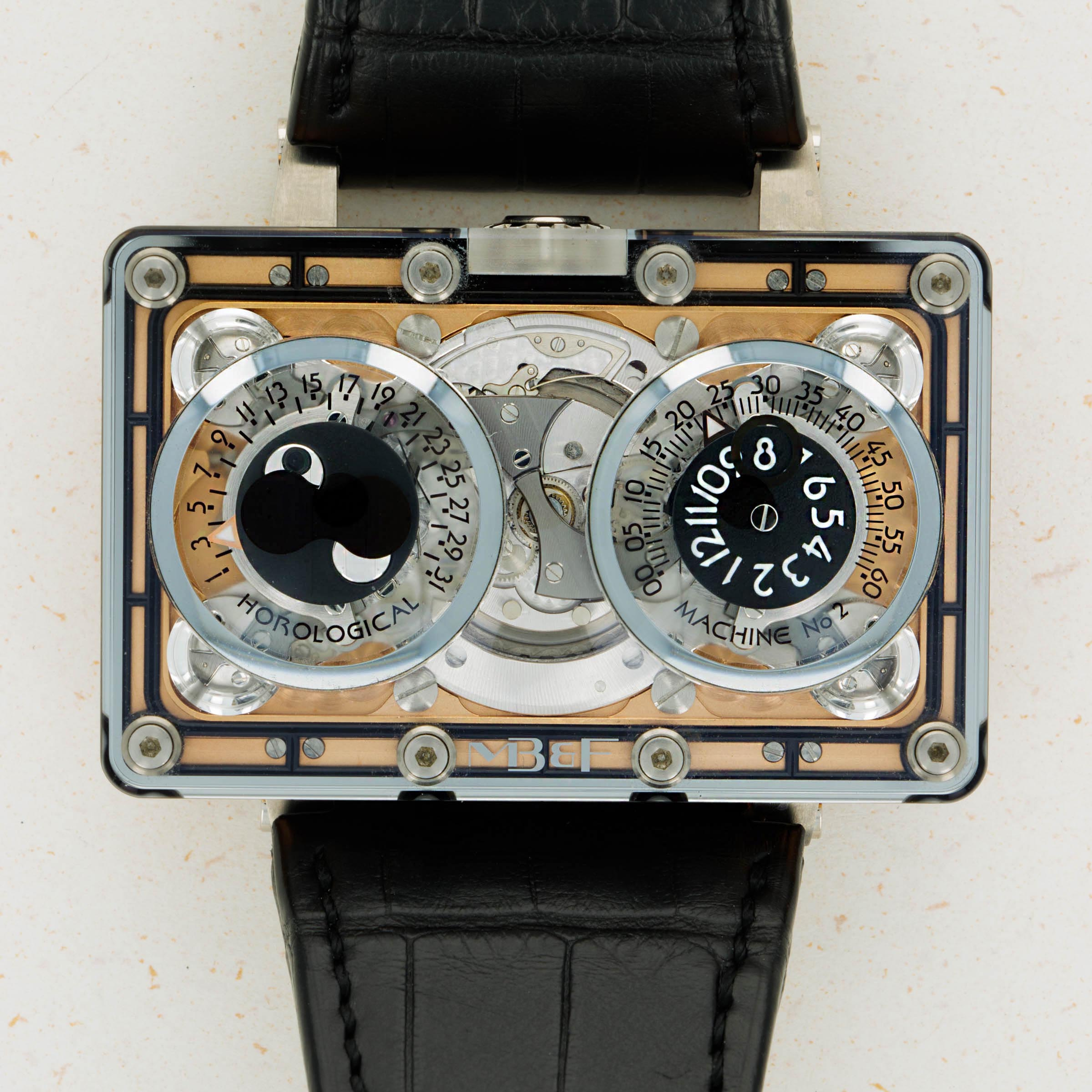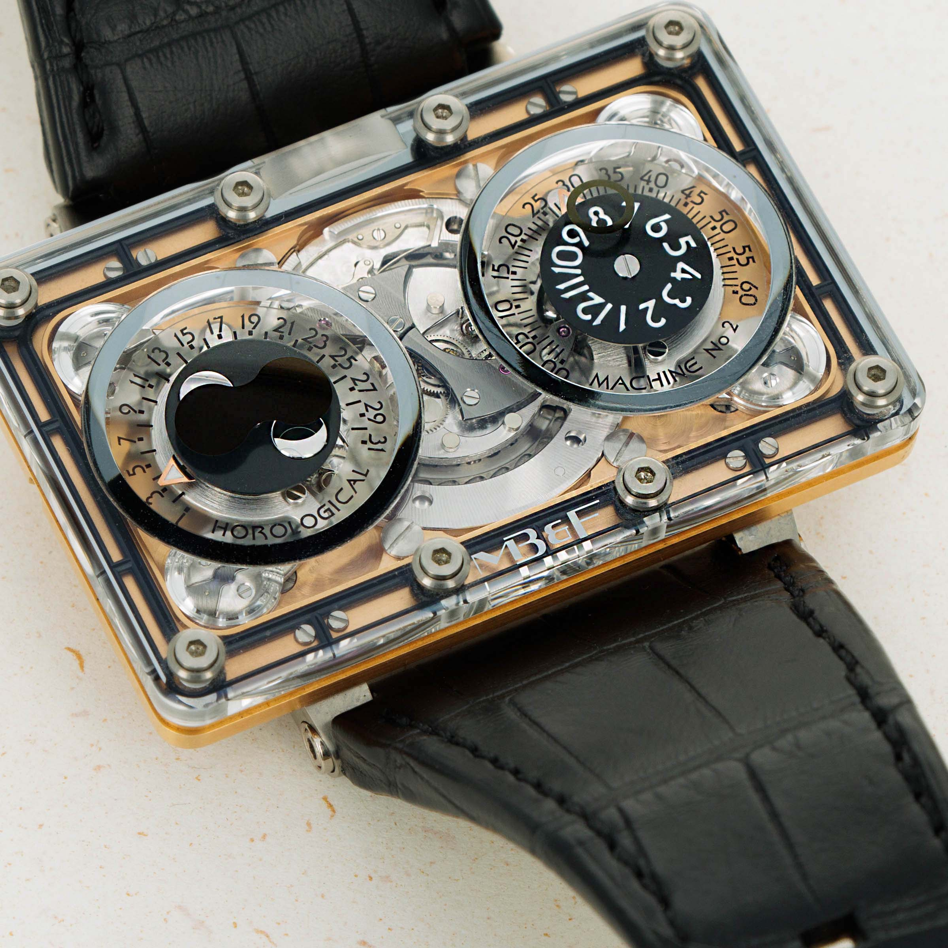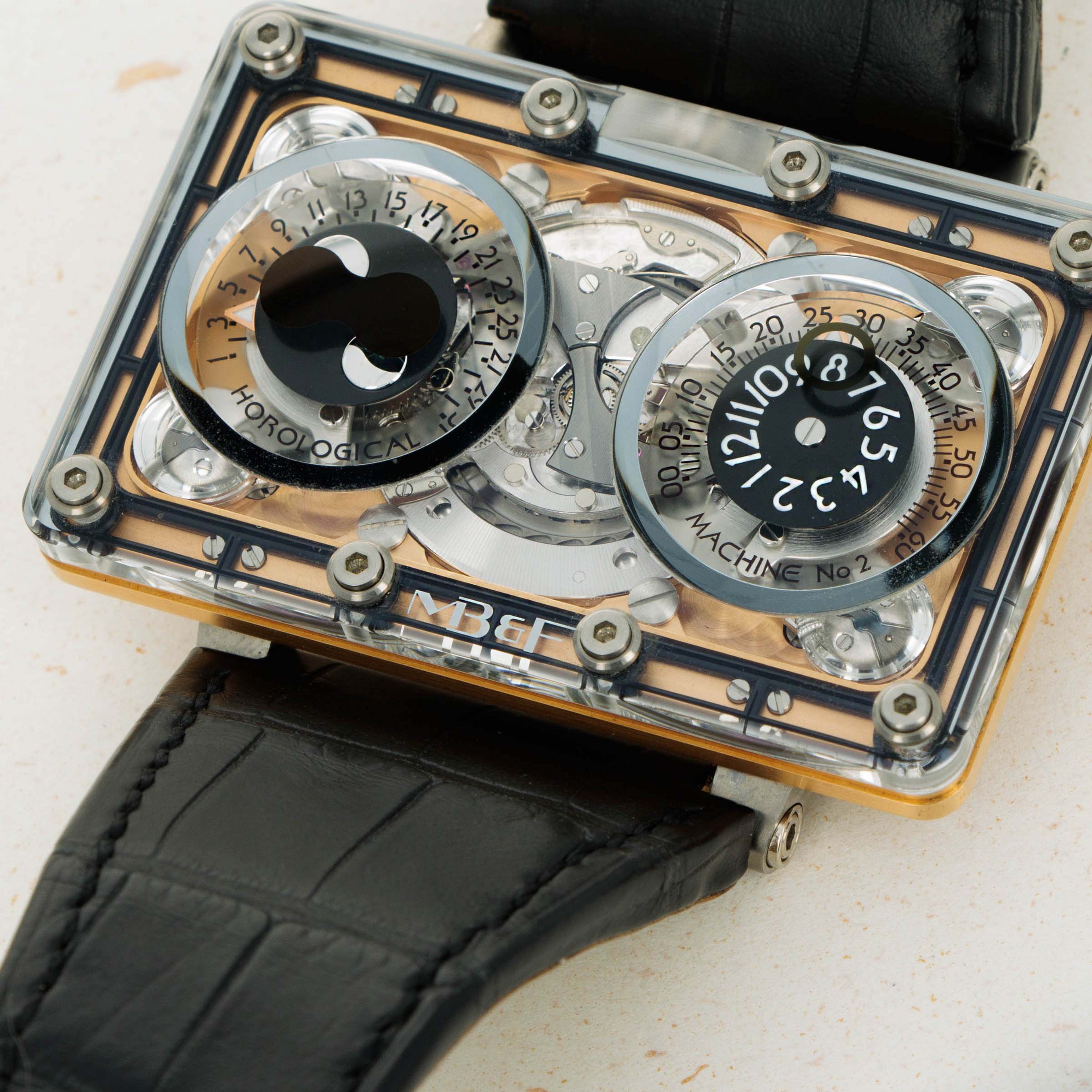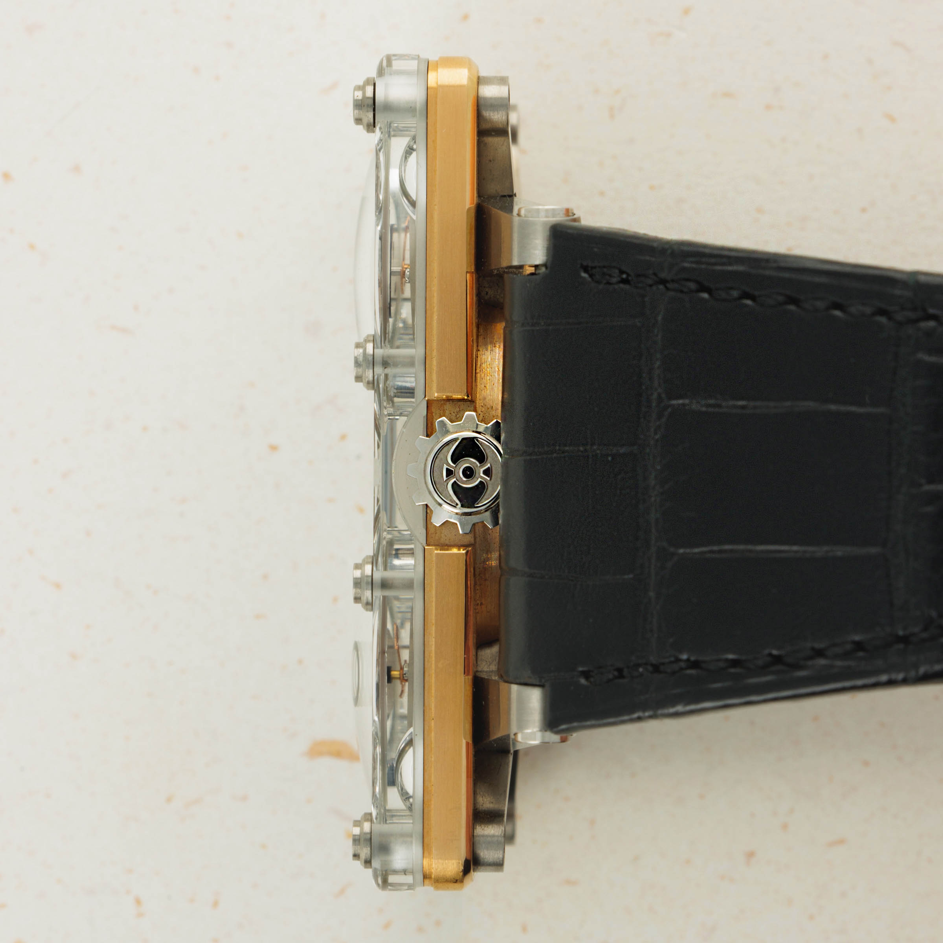 Famed for their wacky designs, incredible engineering and fresh concepts, MB&F has become one of the most influential independent watchmakers in the world. Of course, like most MB&F timepieces, the HM2 is no ordinary watch, instead a truly wonderful celebration of horological passion and wonder. Taking inspiration from as far away from the world of horology as possible, the HM2 was inspired by “the space platforms of 20th century science fiction novels.” Following such a unique source of inspiration, the HM2’s case had to be made with over 100 parts alone, of which make its flying buttresses, bolted portholes and sliding crown guard. With such a unique construction to deal with, Patrick Lété was tasked with making sure the HM2’s automatic movement would fit harmoniously inside of it, and what a job he did. On the caseback we can see the HM2’s 22k gold ‘battle-axe’ automatic winding rotor, which you may recognise from the M.A.D. 1. On the display side, the HM2 boasts a bi-hemisphere moonphase indicator at 9 o’clock and a jump hour/retrograde mechanism at 3 o’clock which combine with the construction to achieve an incredibly unique visual effect as the entire watch looks as though it came straight out of a science fiction film. Made of sapphire and 18kt red gold, the example we have here was limited to just 18 pieces and serves as a wonderful celebration of MB&F’s desire to create watches unlike anyone else in the market.