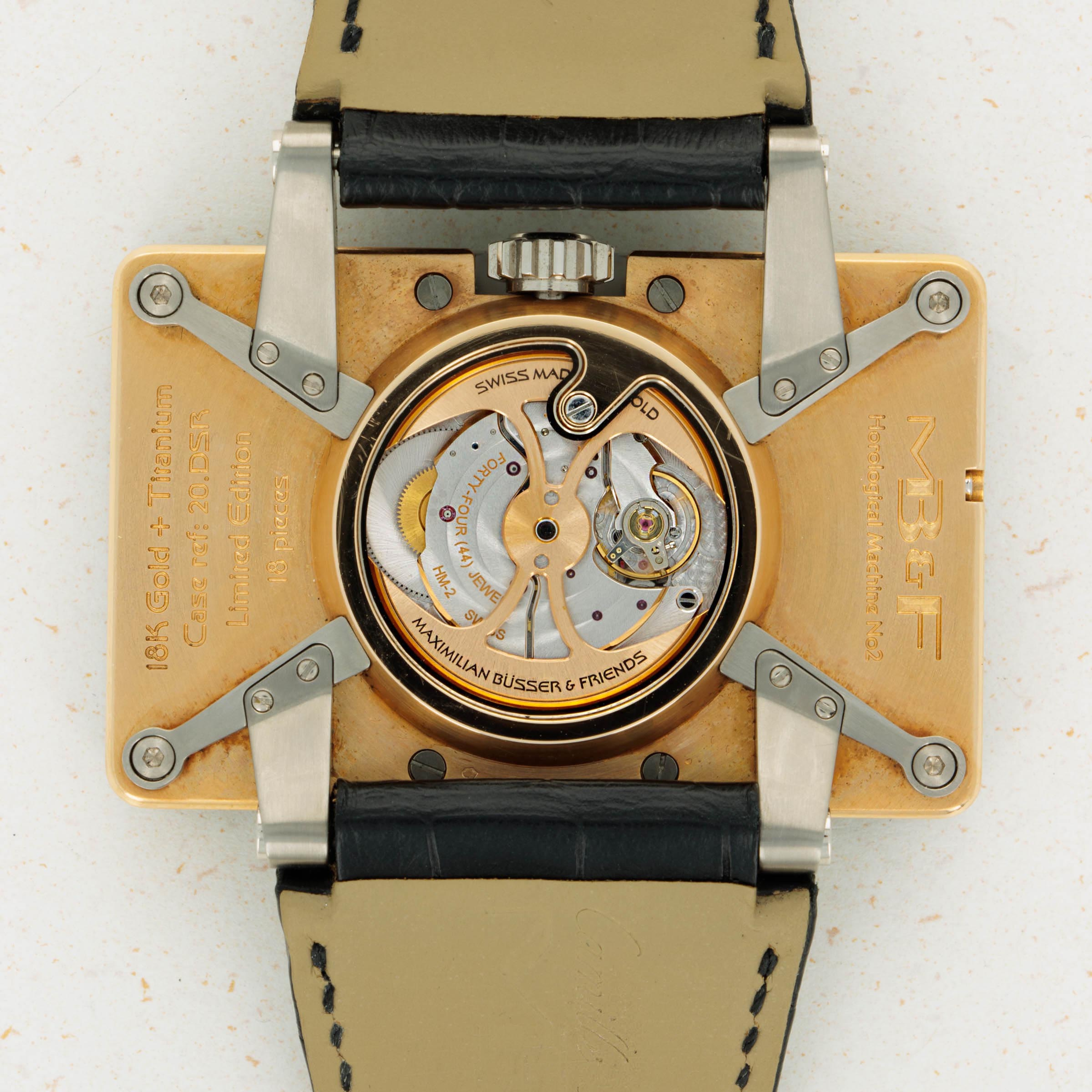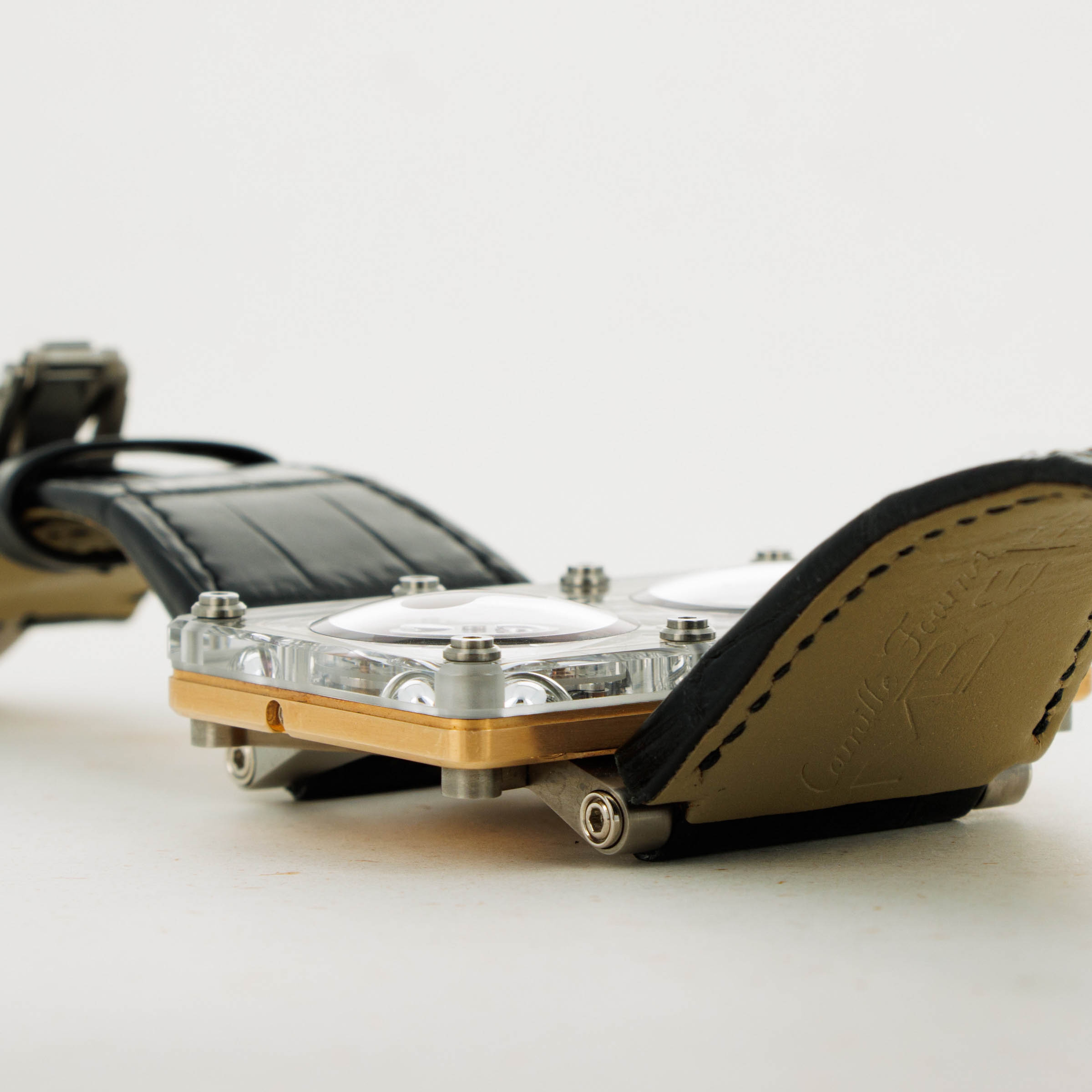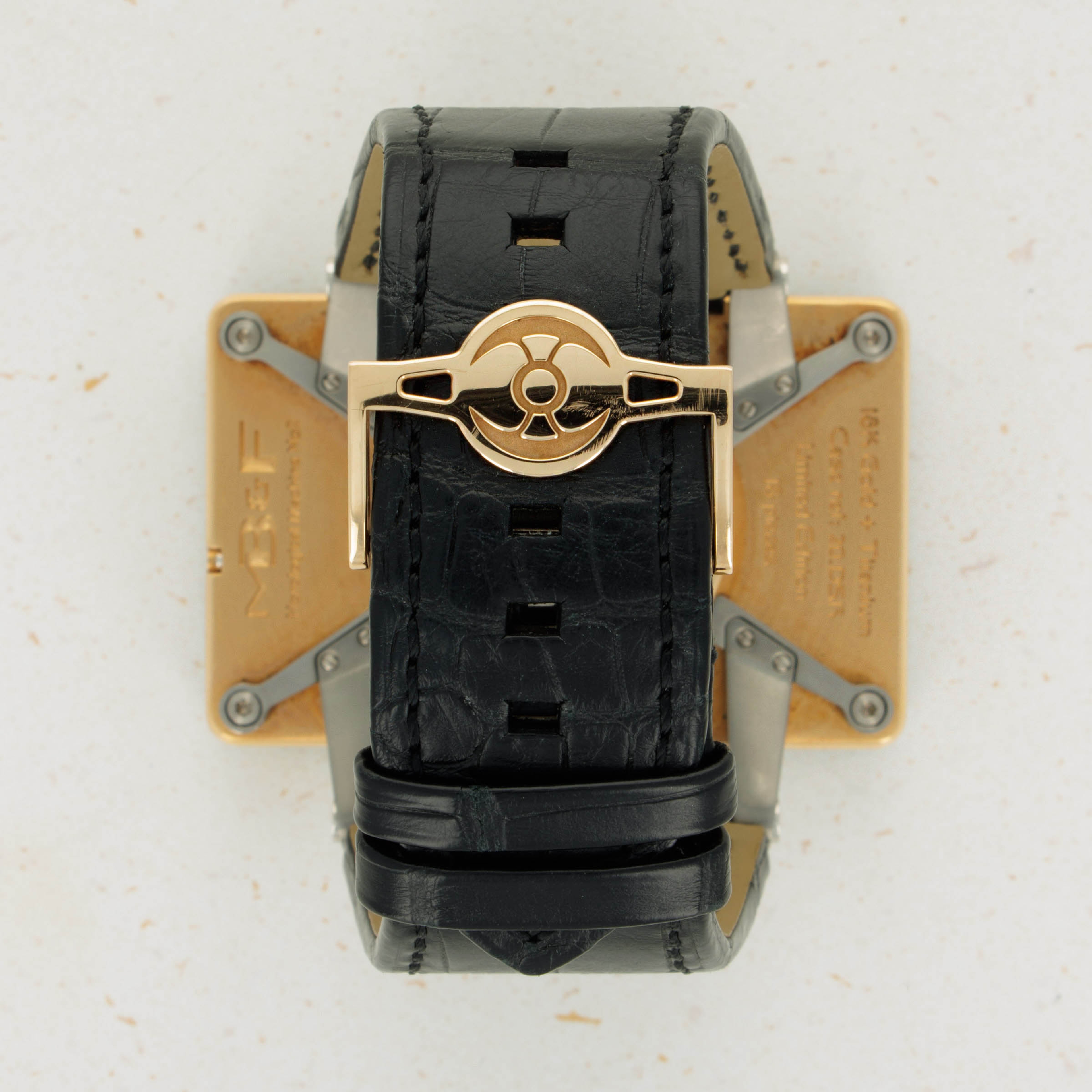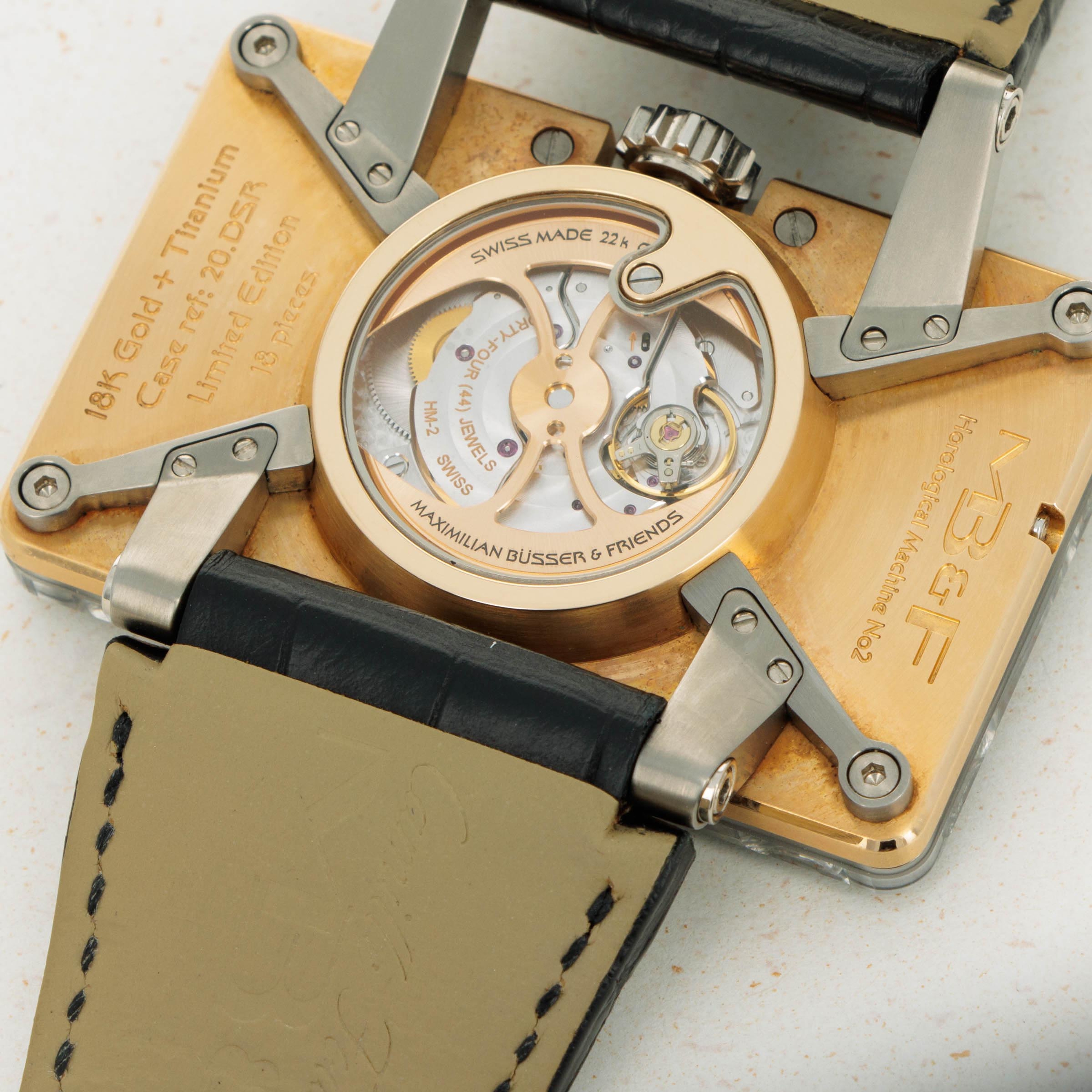 Famed for their wacky designs, incredible engineering and fresh concepts, MB&F has become one of the most influential independent watchmakers in the world. Of course, like most MB&F timepieces, the HM2 is no ordinary watch, instead a truly wonderful celebration of horological passion and wonder. Taking inspiration from as far away from the world of horology as possible, the HM2 was inspired by “the space platforms of 20th century science fiction novels.” Following such a unique source of inspiration, the HM2’s case had to be made with over 100 parts alone, of which make its flying buttresses, bolted portholes and sliding crown guard. With such a unique construction to deal with, Patrick Lété was tasked with making sure the HM2’s automatic movement would fit harmoniously inside of it, and what a job he did. On the caseback we can see the HM2’s 22k gold ‘battle-axe’ automatic winding rotor, which you may recognise from the M.A.D. 1. On the display side, the HM2 boasts a bi-hemisphere moonphase indicator at 9 o’clock and a jump hour/retrograde mechanism at 3 o’clock which combine with the construction to achieve an incredibly unique visual effect as the entire watch looks as though it came straight out of a science fiction film. Made of sapphire and 18kt red gold, the example we have here was limited to just 18 pieces and serves as a wonderful celebration of MB&F’s desire to create watches unlike anyone else in the market.