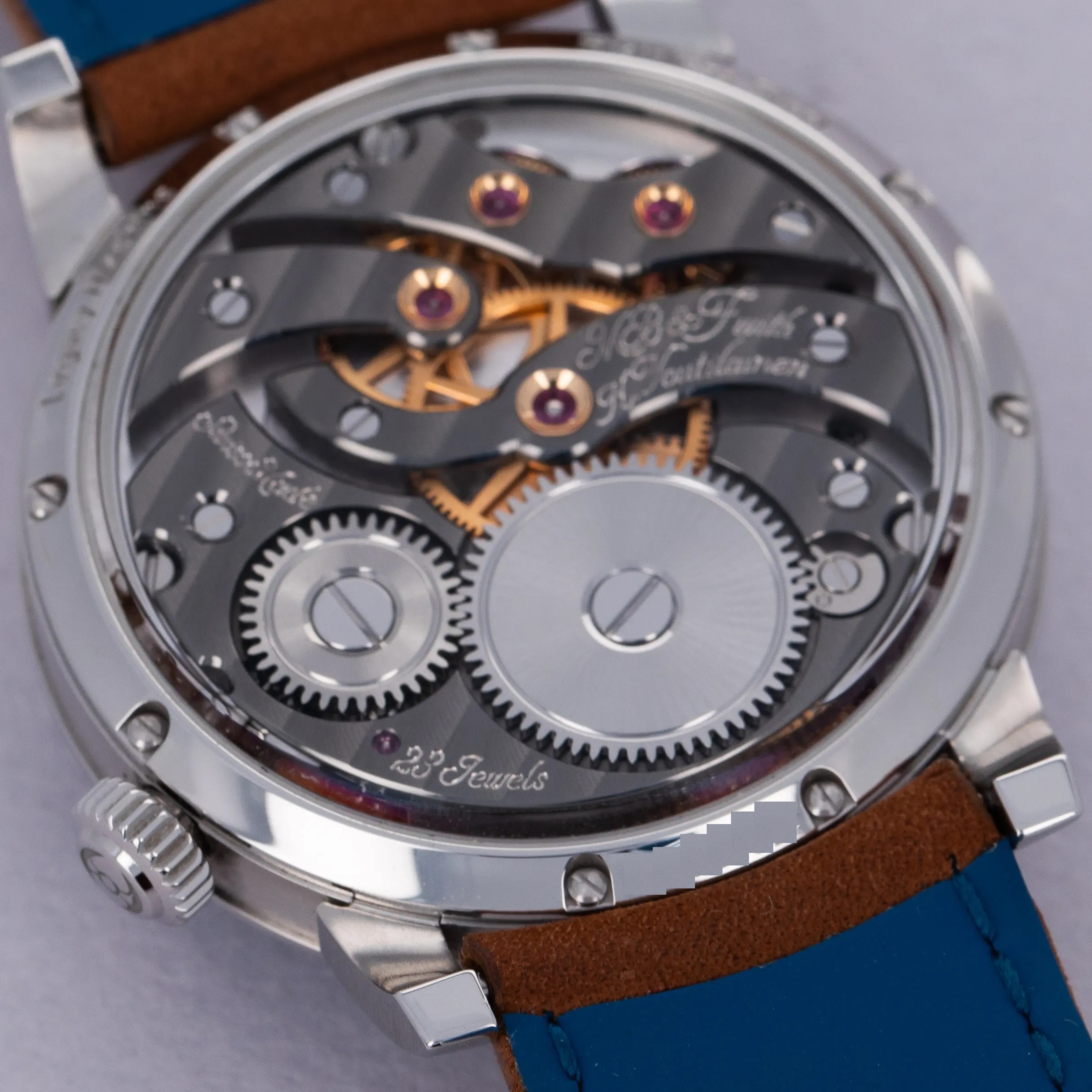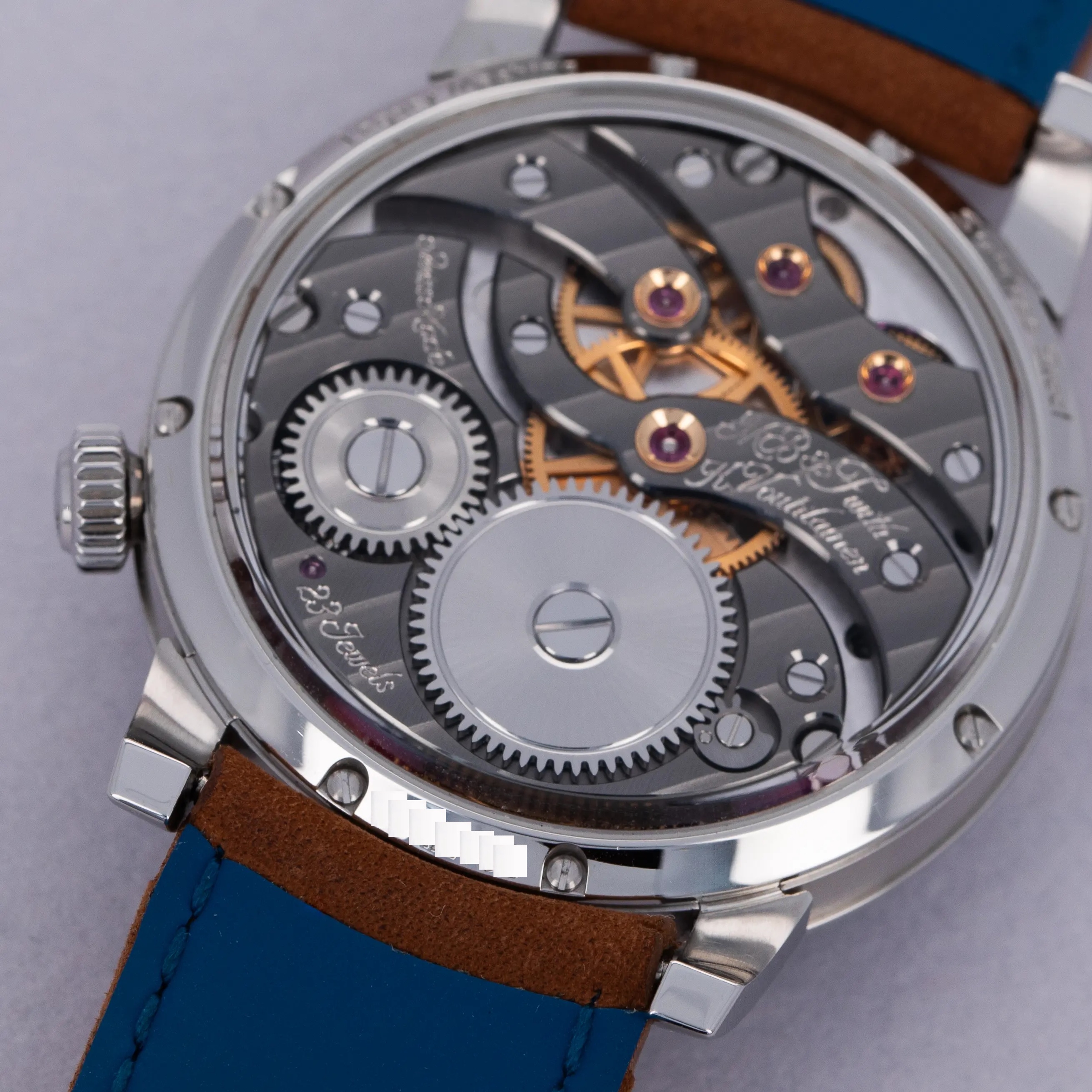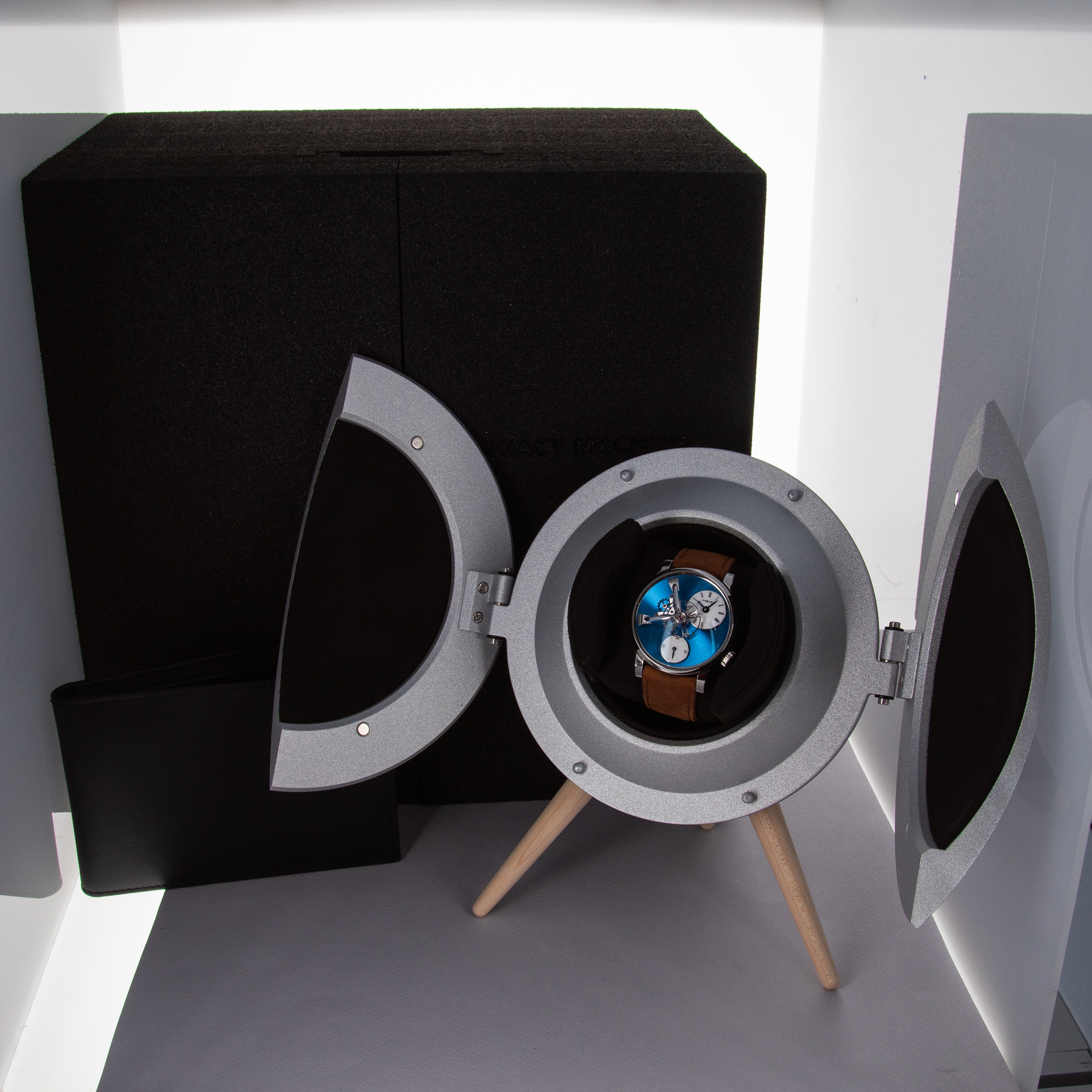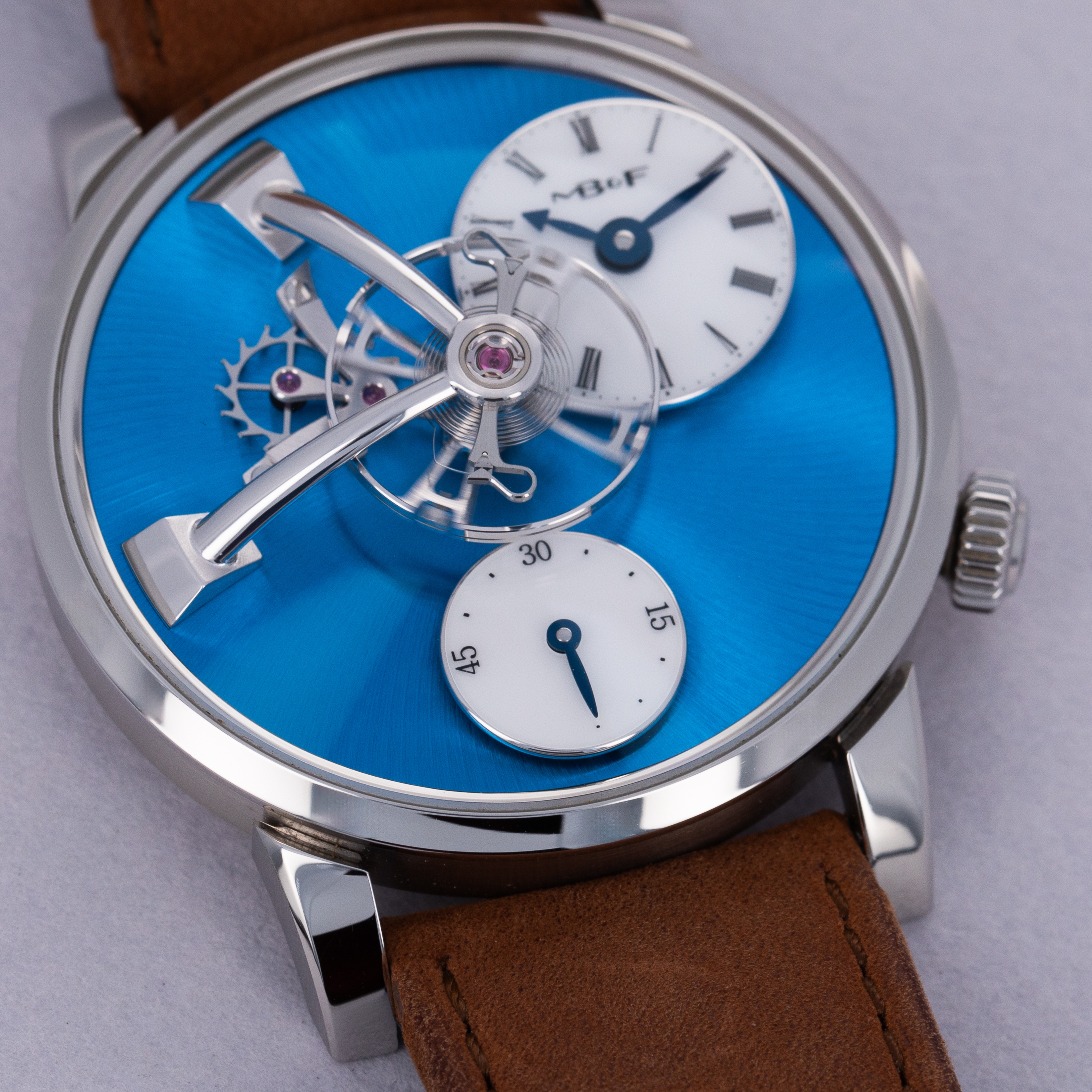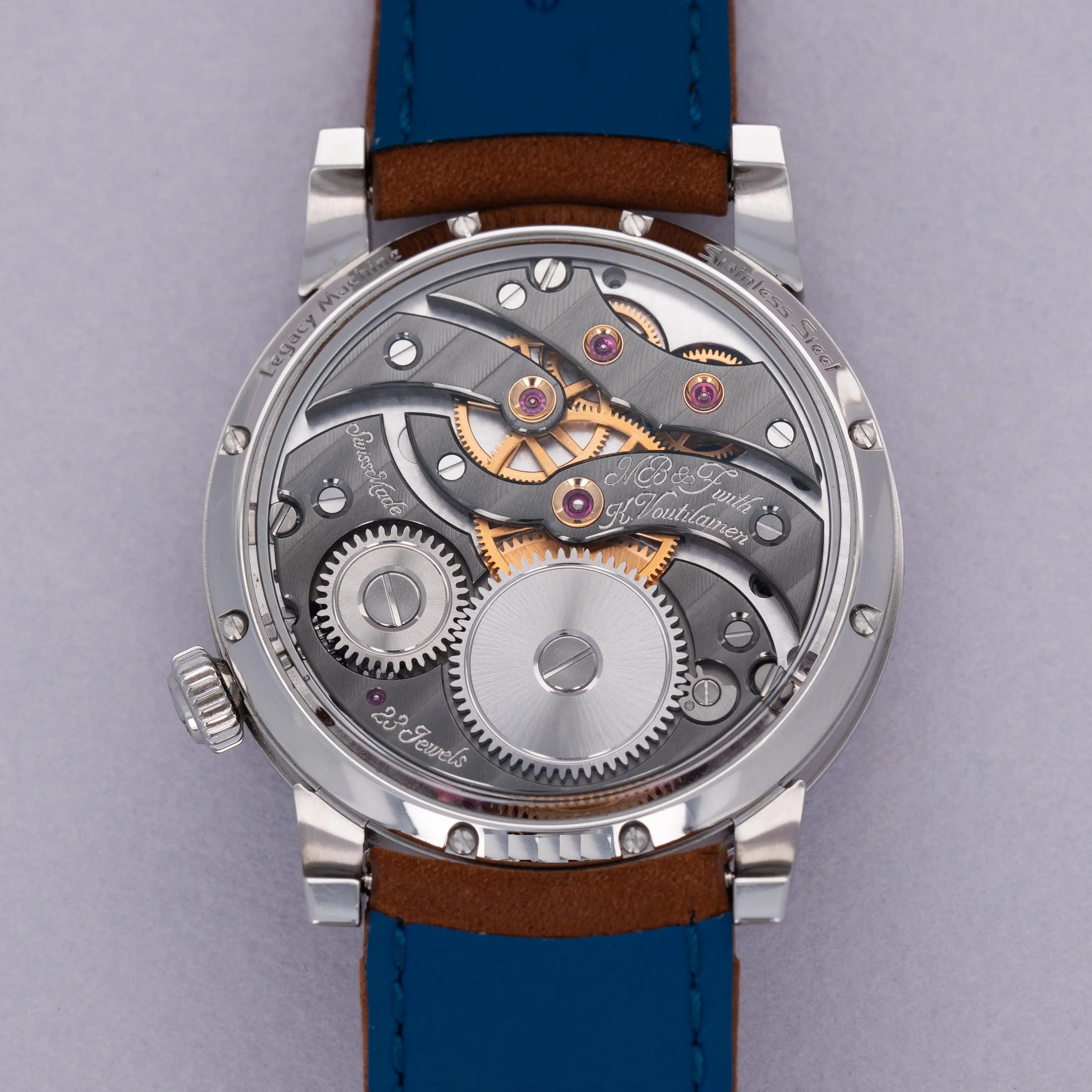 Released in 2014, just nine short years after MB&F's founding, the MB&F Legacy Machine 101 focuses on the fundamentals of watchmaking; telling the time, the power reserve and showcasing the timepiece's own beating heart, its escapement and balance wheel. Released after MB&F’s famously complex LM1 and LM2 collections, the LM101 was a 'back to the basics' move for the watchmaker with a counterintuitively complex design. Launched in 2021 as a new variant within the collection, the LM101 that we have here is made of stainless steel and features an electric blue dial that sits below the LM101’s two white enamel subdials that house an hour and minute display at 2 o’clock and a power reserve indicator at 6 o’clock. An incredibly unique piece of watchmaking, the LM101’s 14mm balance spring takes center stage atop the blue dial as MB&F celebrate the fundamentals of watchmaking, the timepiece’s escapement assembly and balance wheel. Of course, on the other side of the watch is the LM101’s movement, which has been finished to legendary watchmaker MB&F collaborator Kari Voutilainen’s movement aesthetics and finishing specifications.