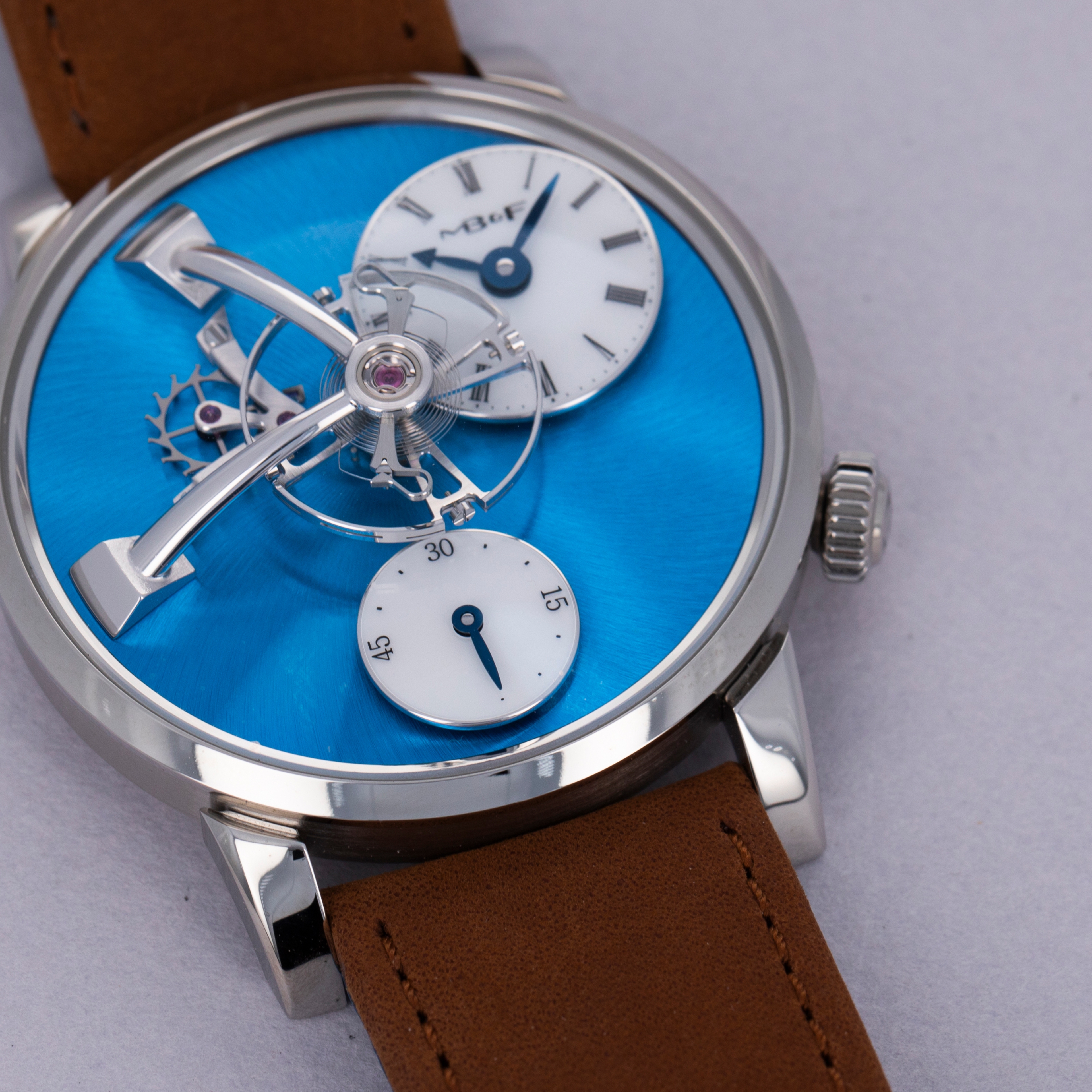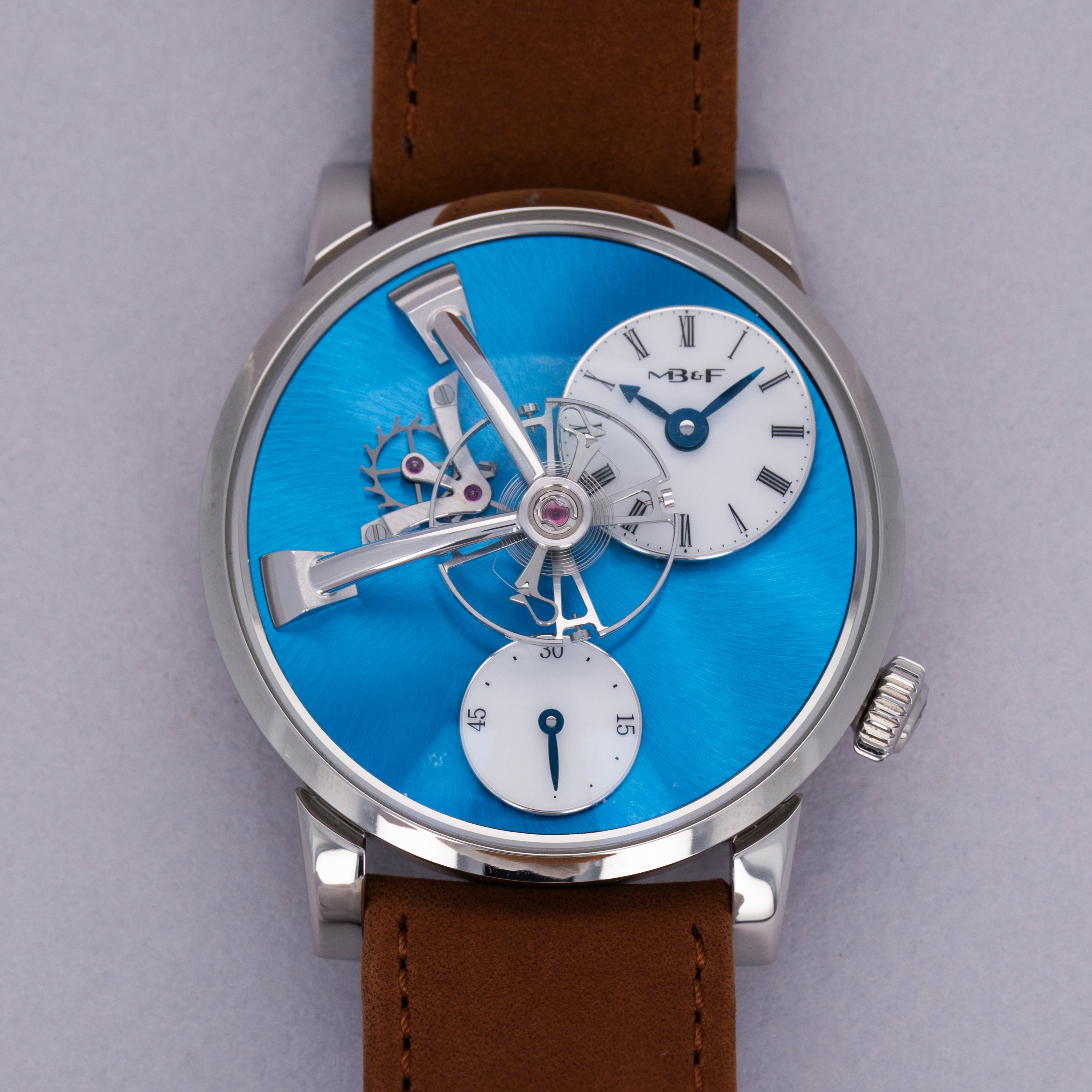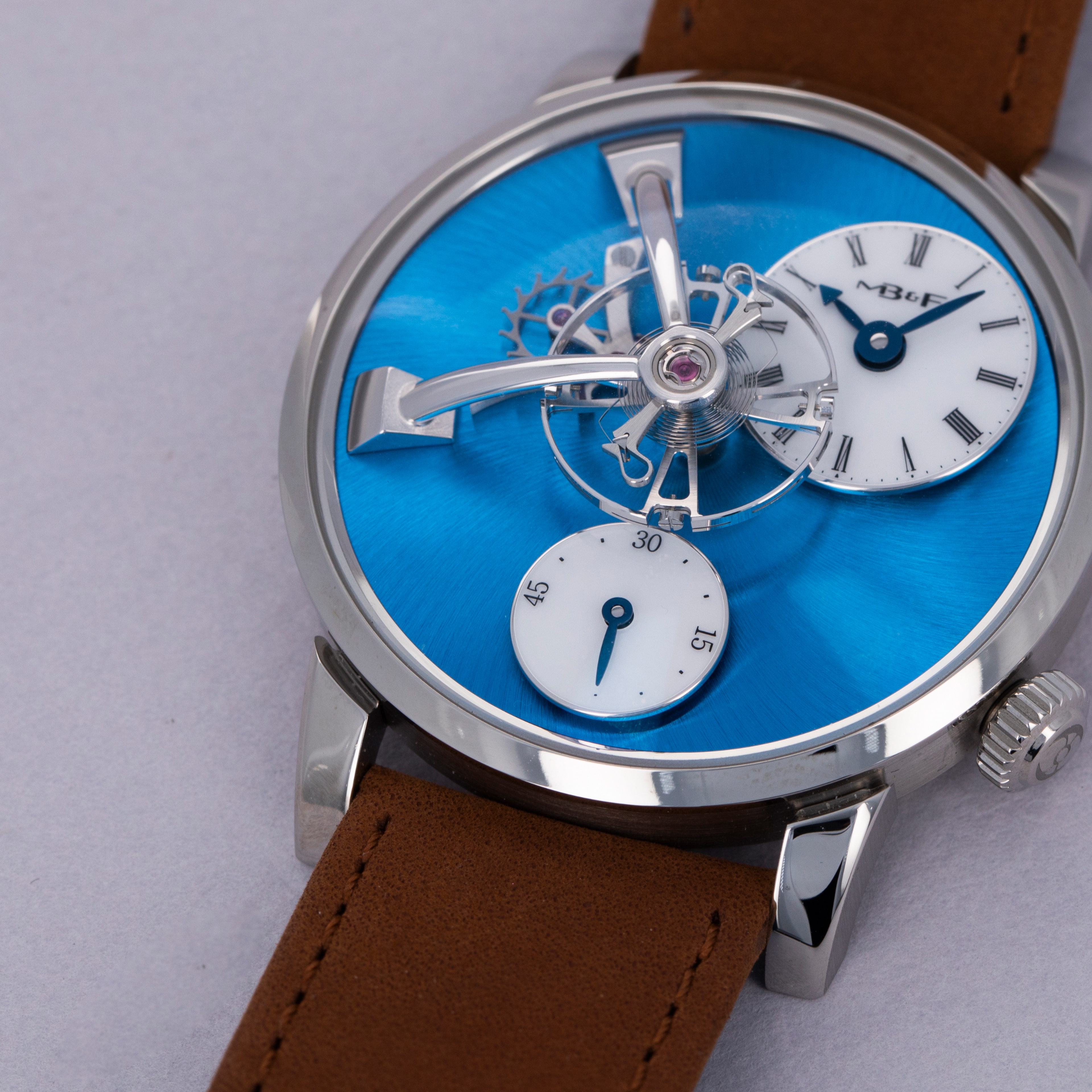 Released in 2014, just nine short years after MB&F's founding, the MB&F Legacy Machine 101 focuses on the fundamentals of watchmaking; telling the time, the power reserve and showcasing the timepiece's own beating heart, its escapement and balance wheel. Released after MB&F’s famously complex LM1 and LM2 collections, the LM101 was a 'back to the basics' move for the watchmaker with a counterintuitively complex design. Launched in 2021 as a new variant within the collection, the LM101 that we have here is made of stainless steel and features an electric blue dial that sits below the LM101’s two white enamel subdials that house an hour and minute display at 2 o’clock and a power reserve indicator at 6 o’clock. An incredibly unique piece of watchmaking, the LM101’s 14mm balance spring takes center stage atop the blue dial as MB&F celebrate the fundamentals of watchmaking, the timepiece’s escapement assembly and balance wheel. Of course, on the other side of the watch is the LM101’s movement, which has been finished to legendary watchmaker MB&F collaborator Kari Voutilainen’s movement aesthetics and finishing specifications.