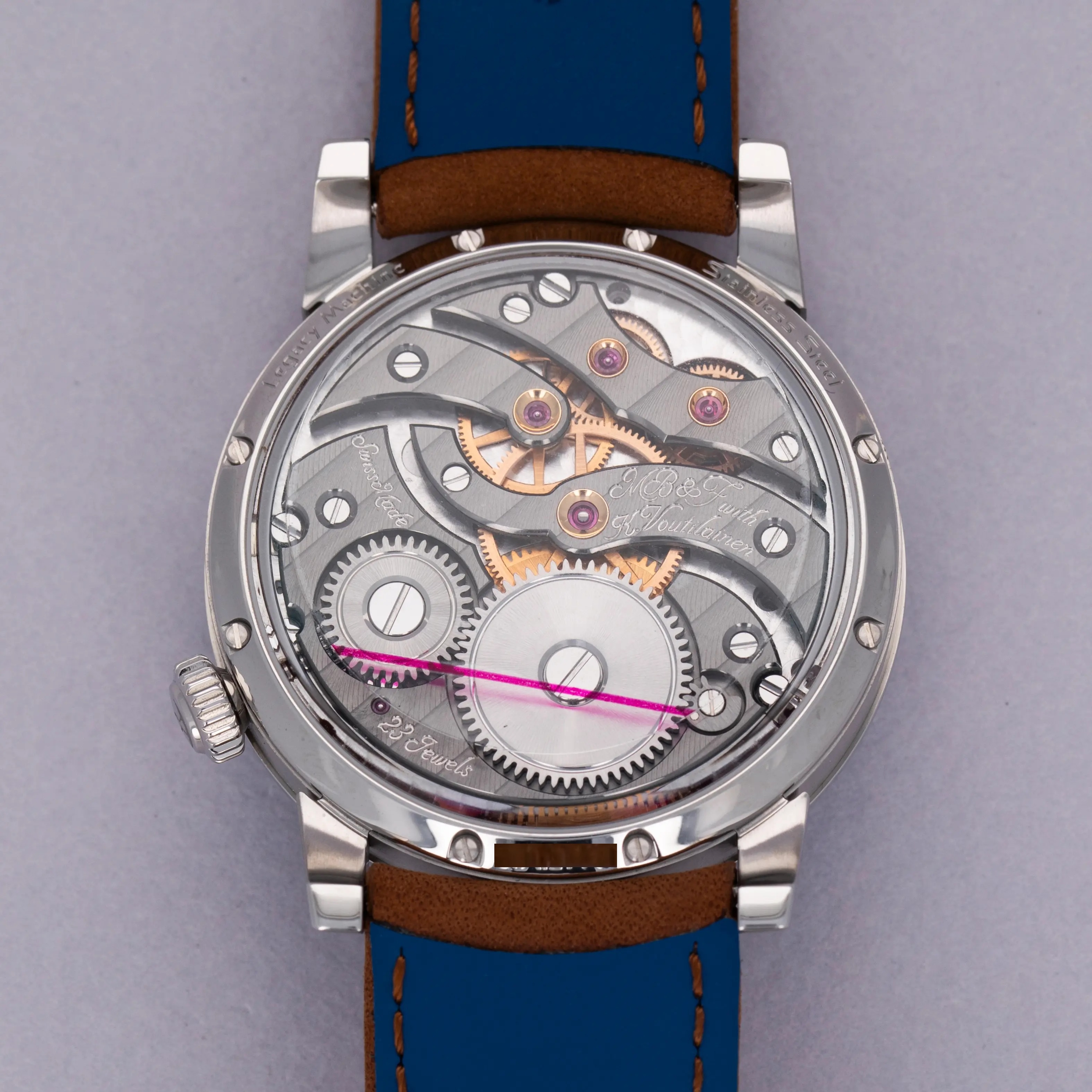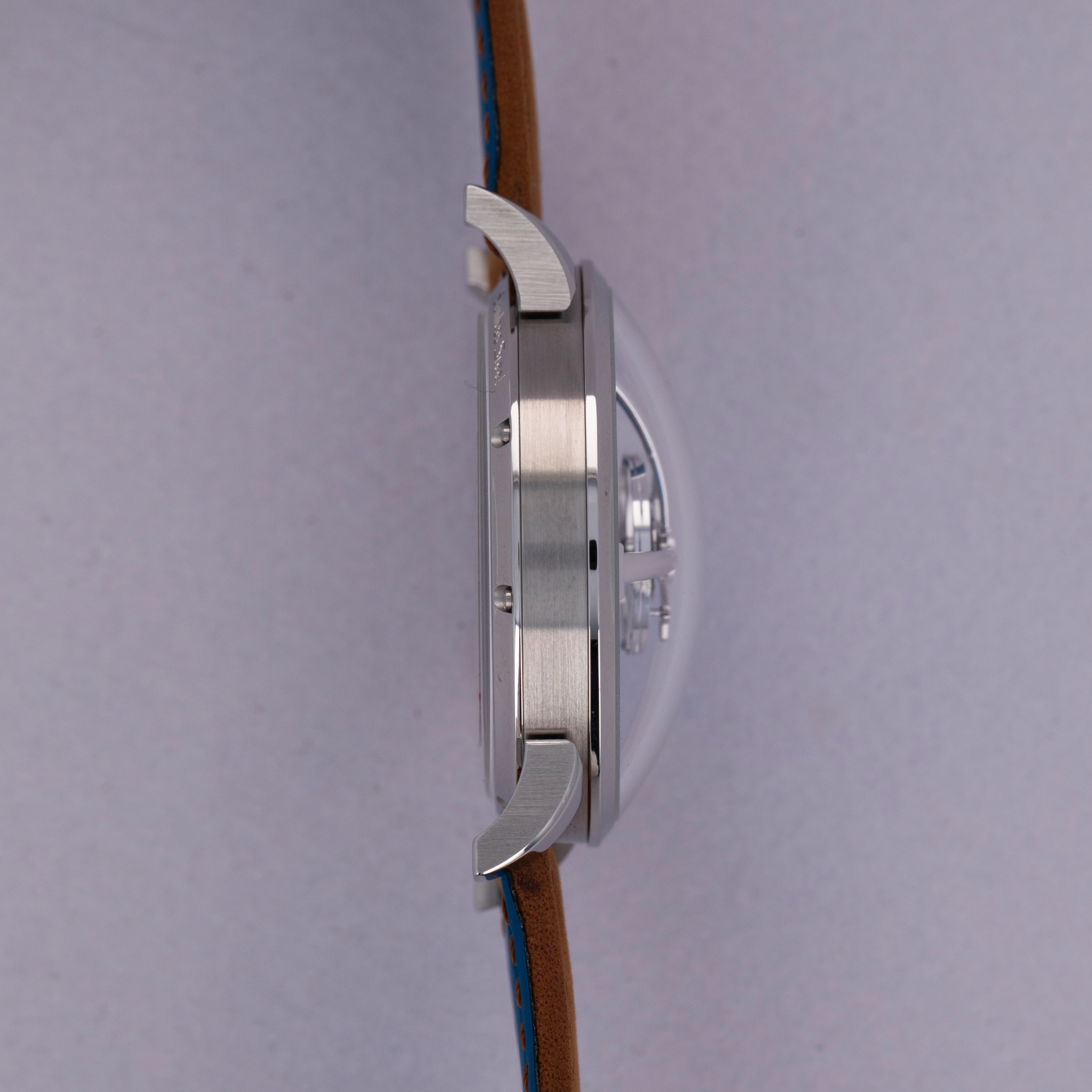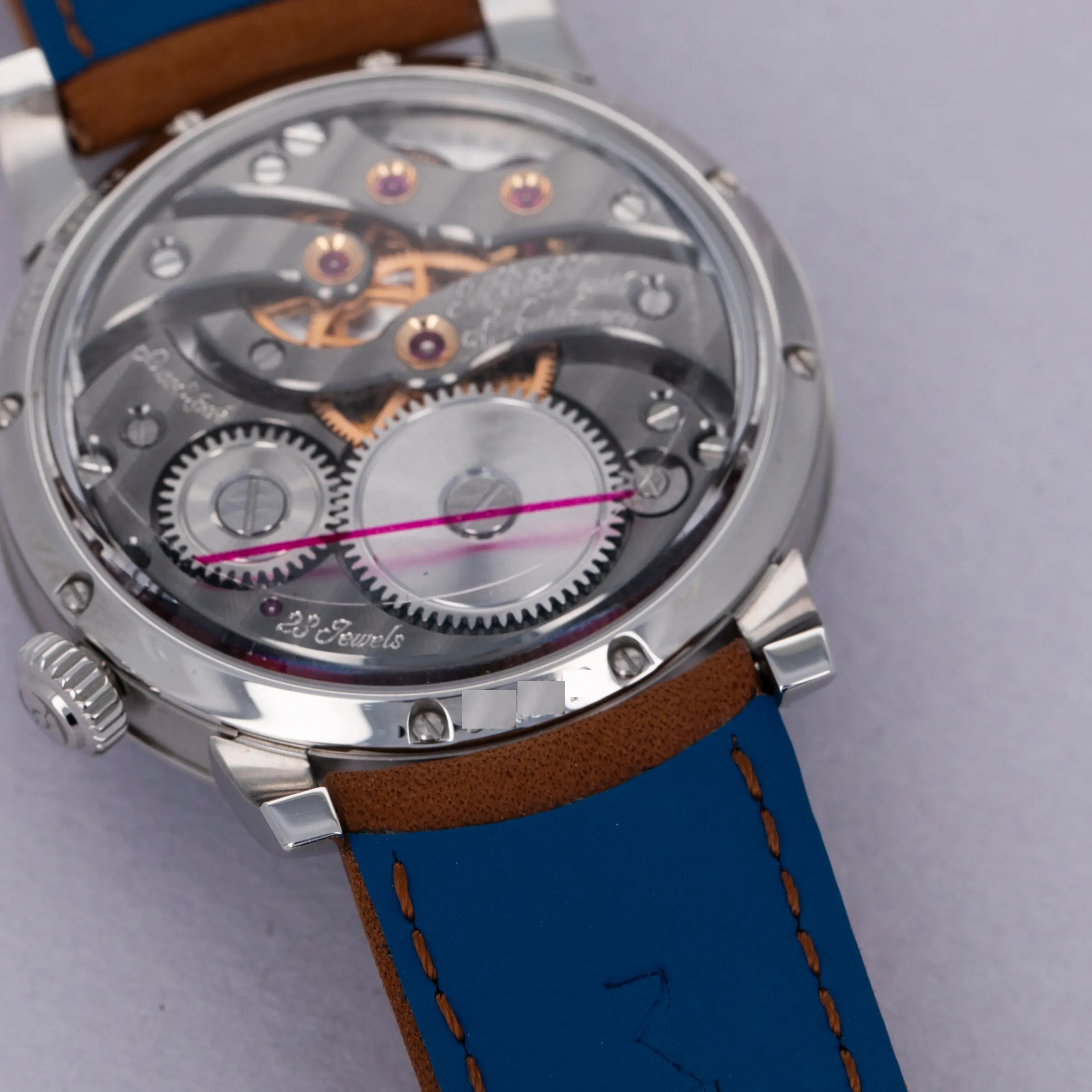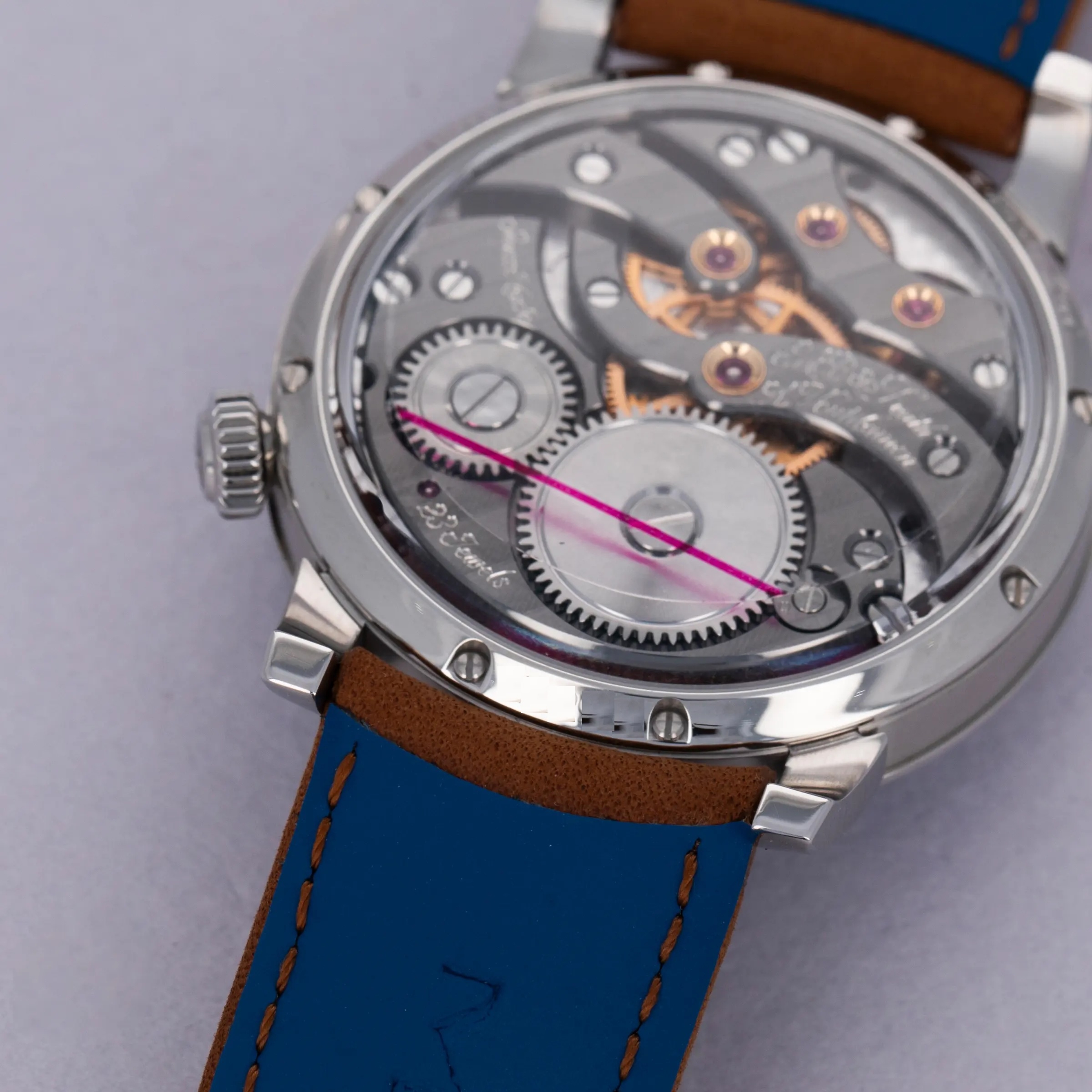 Released in 2014, just nine short years after MB&F's founding, the MB&F Legacy Machine 101 focuses on the fundamentals of watchmaking; telling the time, the power reserve and showcasing the timepiece's own beating heart, its escapement and balance wheel. Released after MB&F’s famously complex LM1 and LM2 collections, the LM101 was a 'back to the basics' move for the watchmaker with a counterintuitively complex design. Launched in 2021 as a new variant within the collection, the LM101 that we have here is made of stainless steel and features an electric blue dial that sits below the LM101’s two white enamel subdials that house an hour and minute display at 2 o’clock and a power reserve indicator at 6 o’clock. An incredibly unique piece of watchmaking, the LM101’s 14mm balance spring takes center stage atop the blue dial as MB&F celebrate the fundamentals of watchmaking, the timepiece’s escapement assembly and balance wheel. Of course, on the other side of the watch is the LM101’s movement, which has been finished to legendary watchmaker MB&F collaborator Kari Voutilainen’s movement aesthetics and finishing specifications.