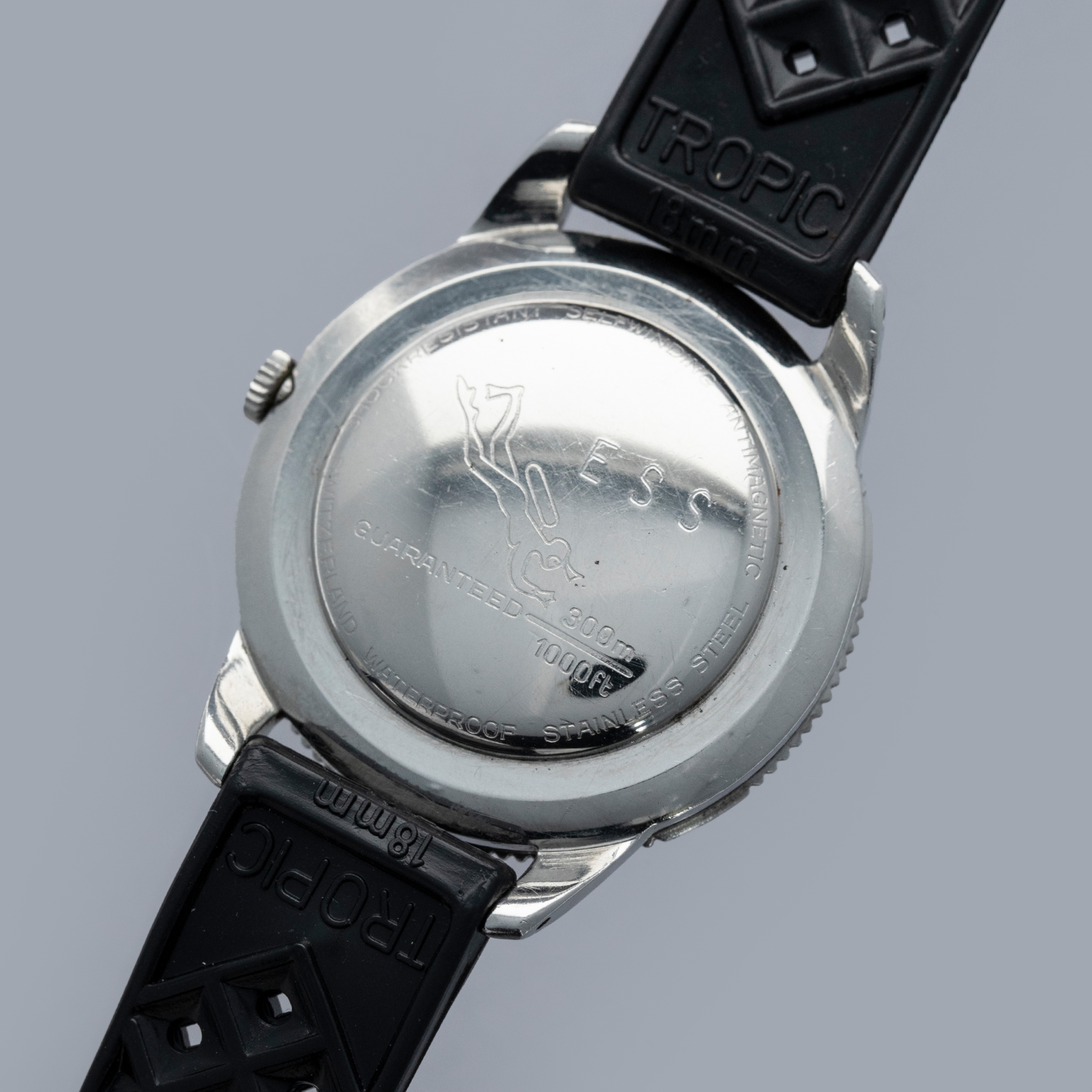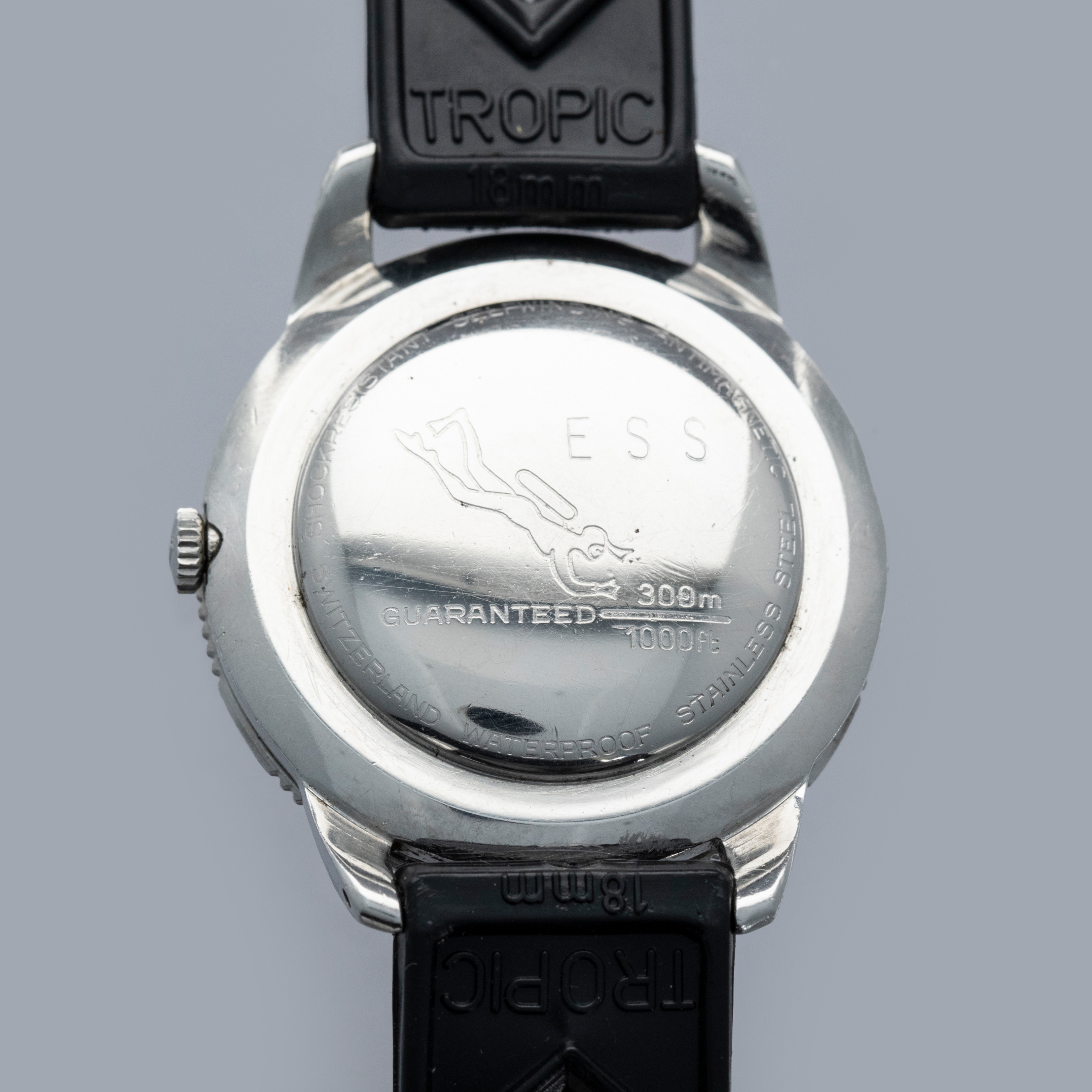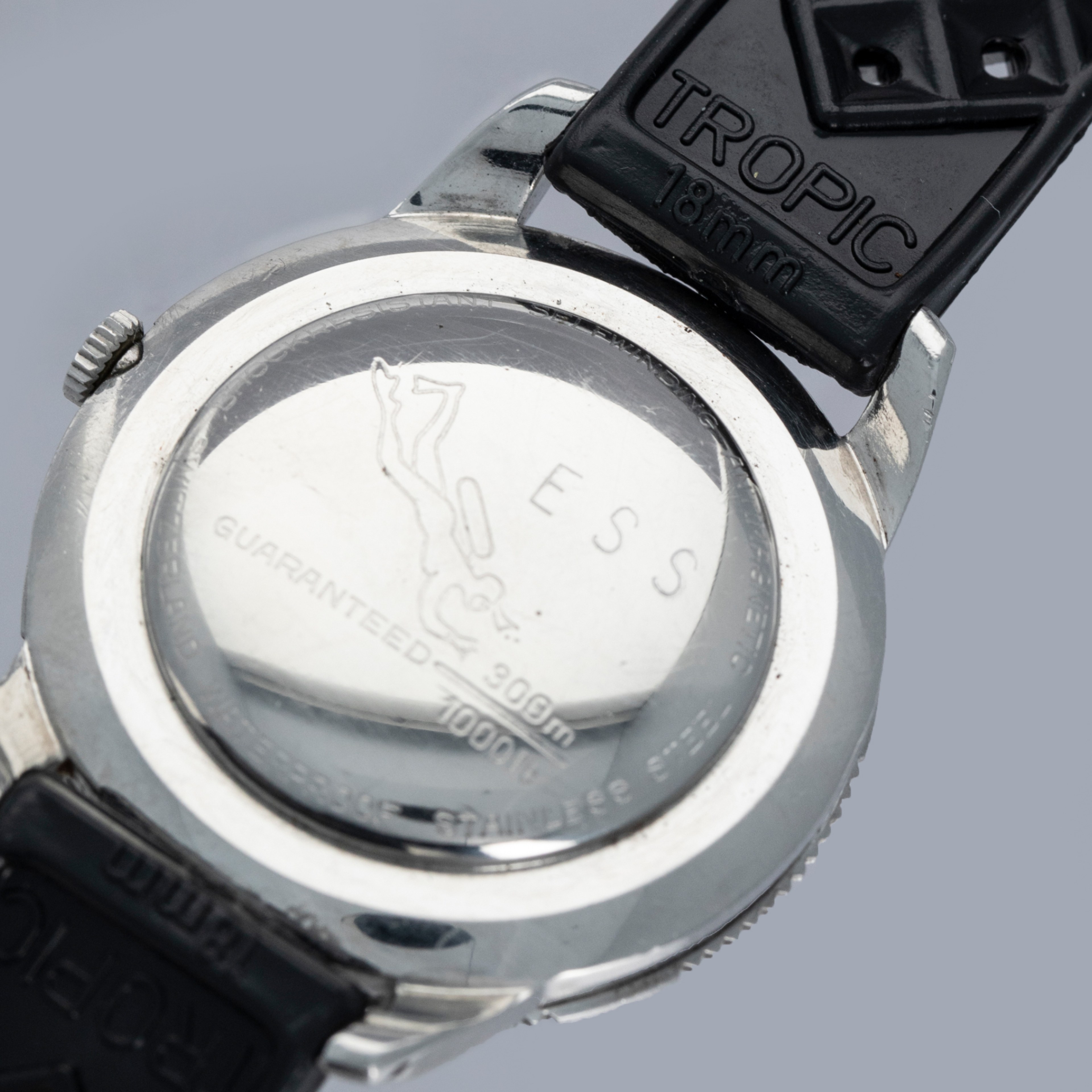 The watch is in overall excellent condition. The stainless steel case has some wear, with scratches and nicks, as expected of a watch of this vintage. The case back engravings are still well defined. There is an "ESS" engraved on the caseback. The original MIDO winding crown is still present. The bezel has some surface scratches, with most of the enamel filling still intact in the numerals and markings. The dial is in beautiful condition with vibrant colors and little to no visible surface wear. Luminous indexes are evenly toned, wiht a few plots showing areas of discoloration. Watch has original hands, but the hour hand is devoid of luminous material. Original crystal shows extensive crazing, but still has the "MIDO" mark visible in the center. The watch is fitted with a black Tropic strap in excellent condition. Please note that the watch ticks at the time of cataloging, but timekeeping is poor and a service is recommended.