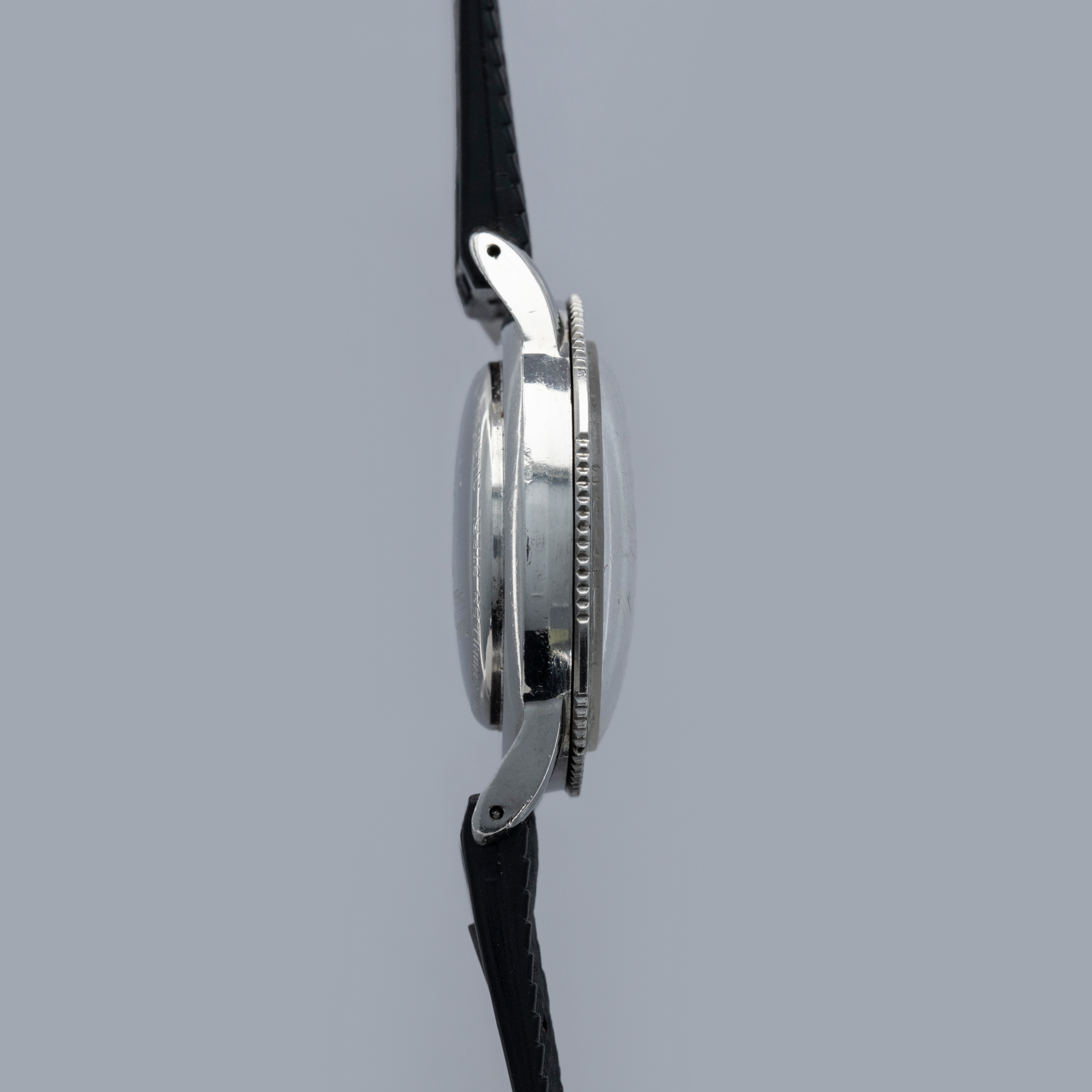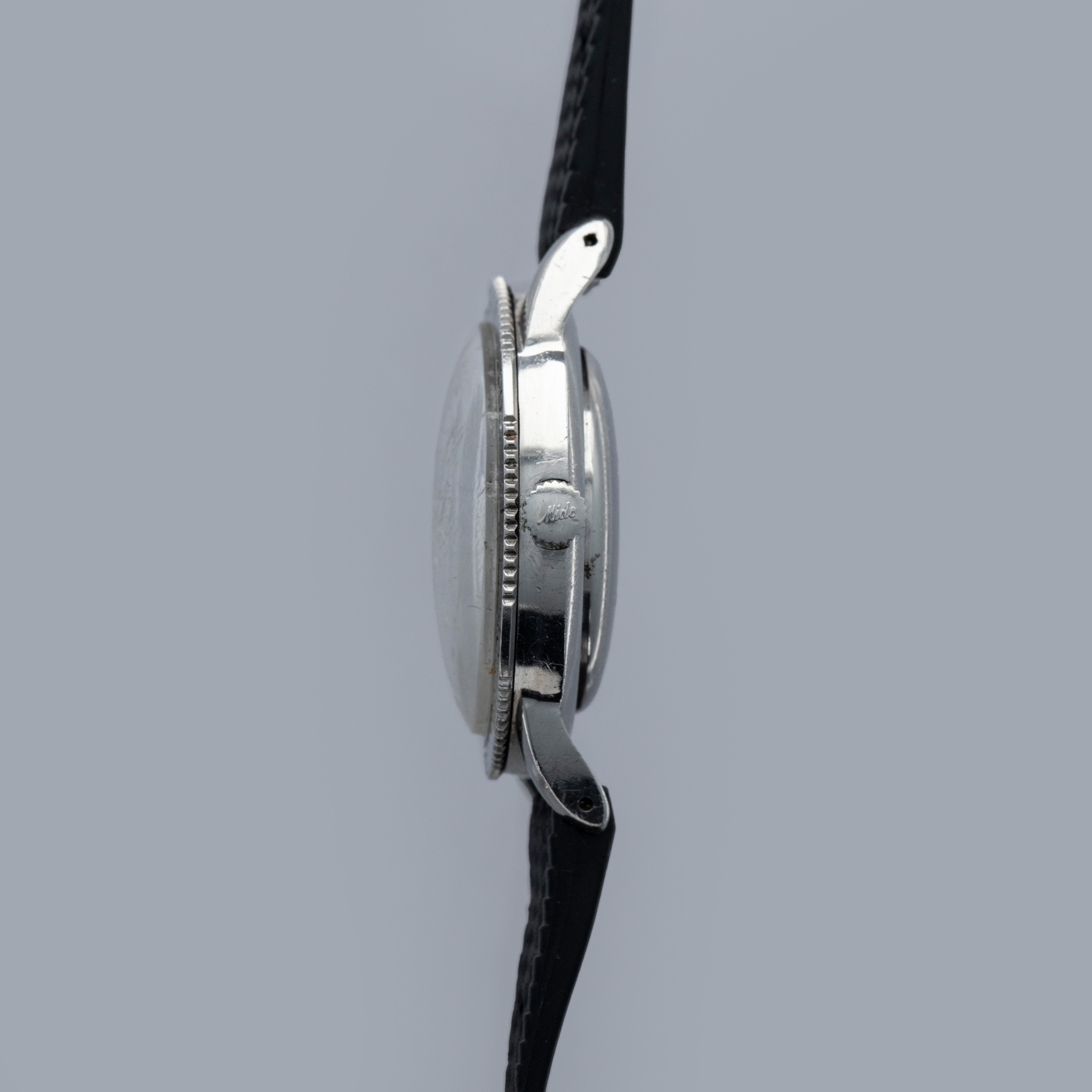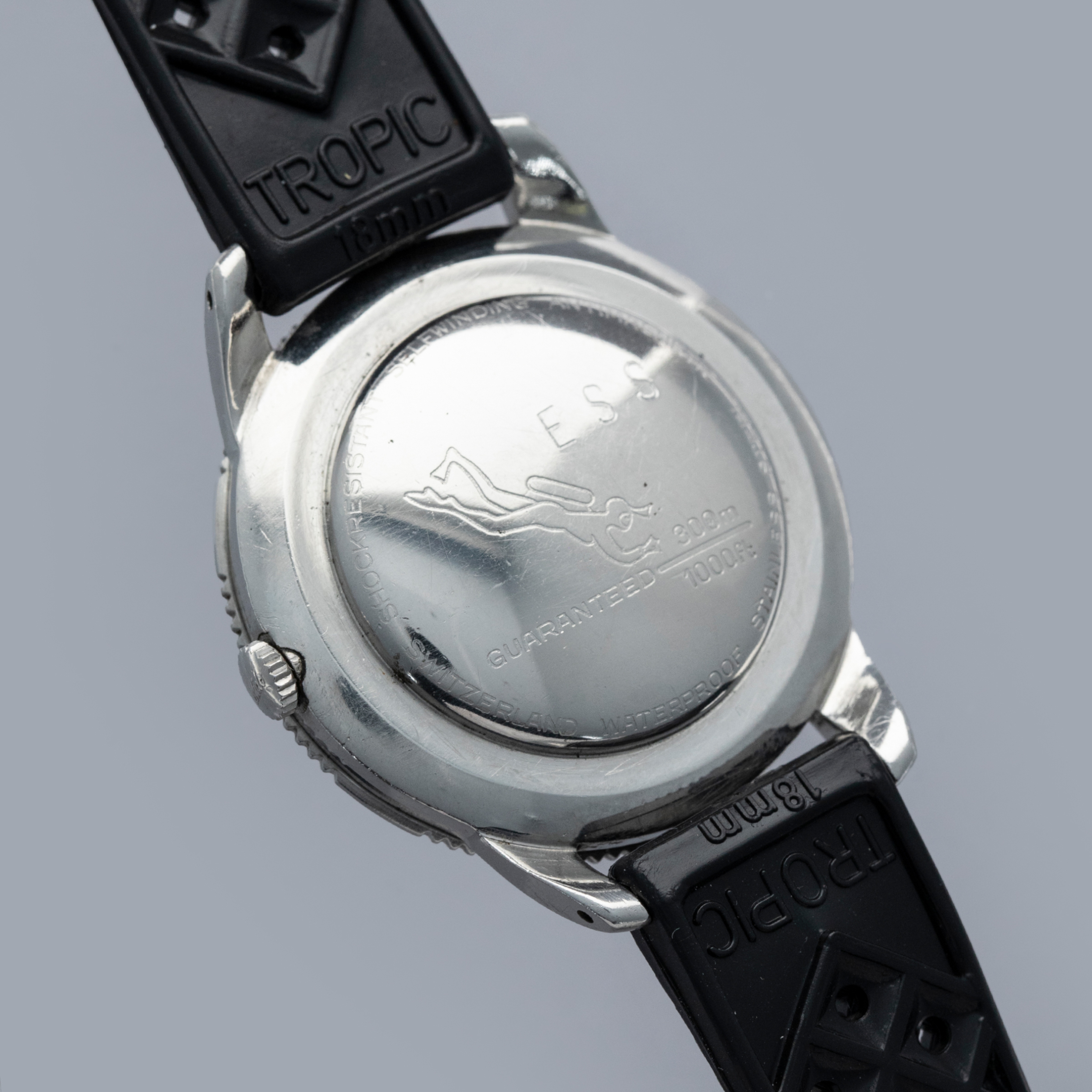 The watch is in overall excellent condition. The stainless steel case has some wear, with scratches and nicks, as expected of a watch of this vintage. The case back engravings are still well defined. There is an "ESS" engraved on the caseback. The original MIDO winding crown is still present. The bezel has some surface scratches, with most of the enamel filling still intact in the numerals and markings. The dial is in beautiful condition with vibrant colors and little to no visible surface wear. Luminous indexes are evenly toned, wiht a few plots showing areas of discoloration. Watch has original hands, but the hour hand is devoid of luminous material. Original crystal shows extensive crazing, but still has the "MIDO" mark visible in the center. The watch is fitted with a black Tropic strap in excellent condition. Please note that the watch ticks at the time of cataloging, but timekeeping is poor and a service is recommended.