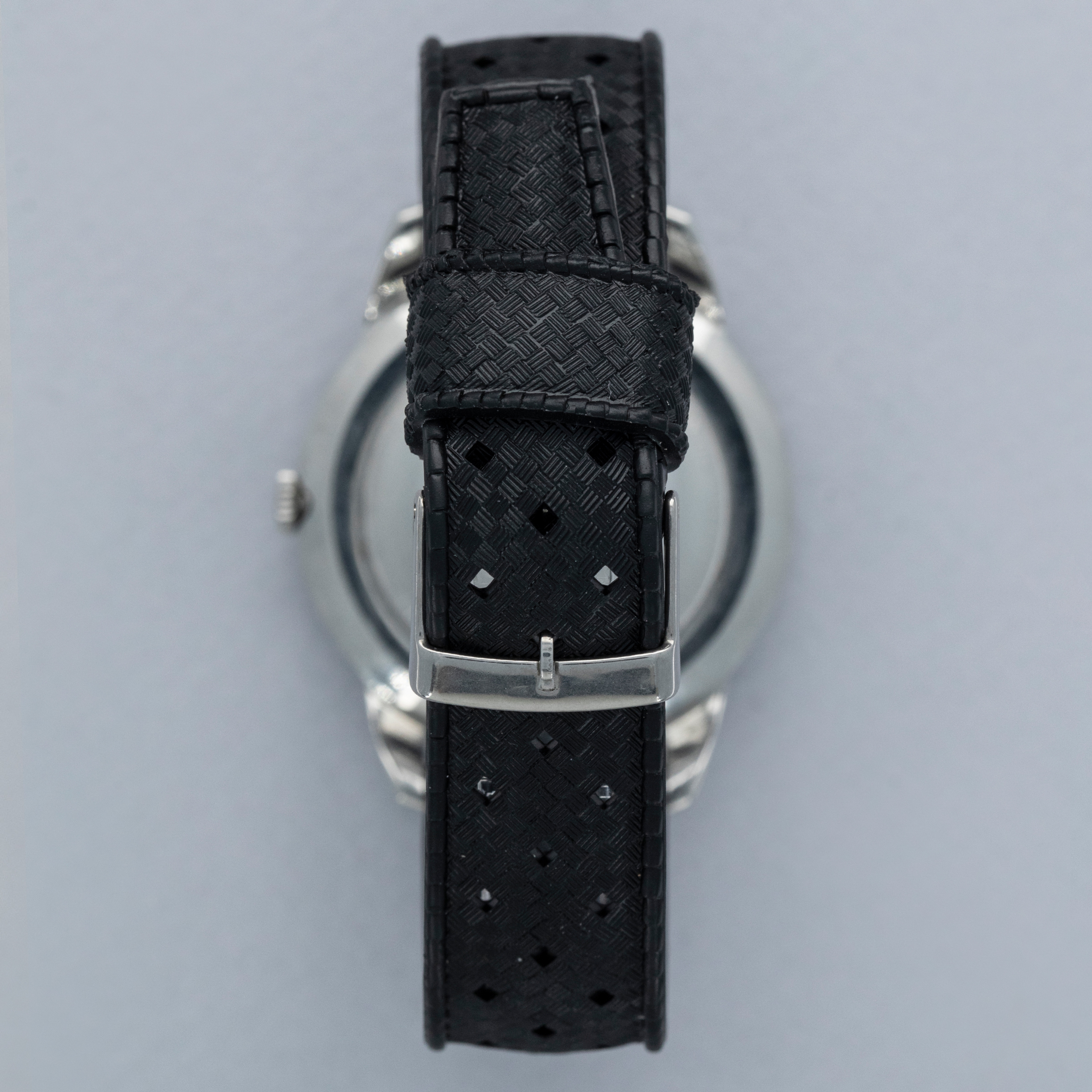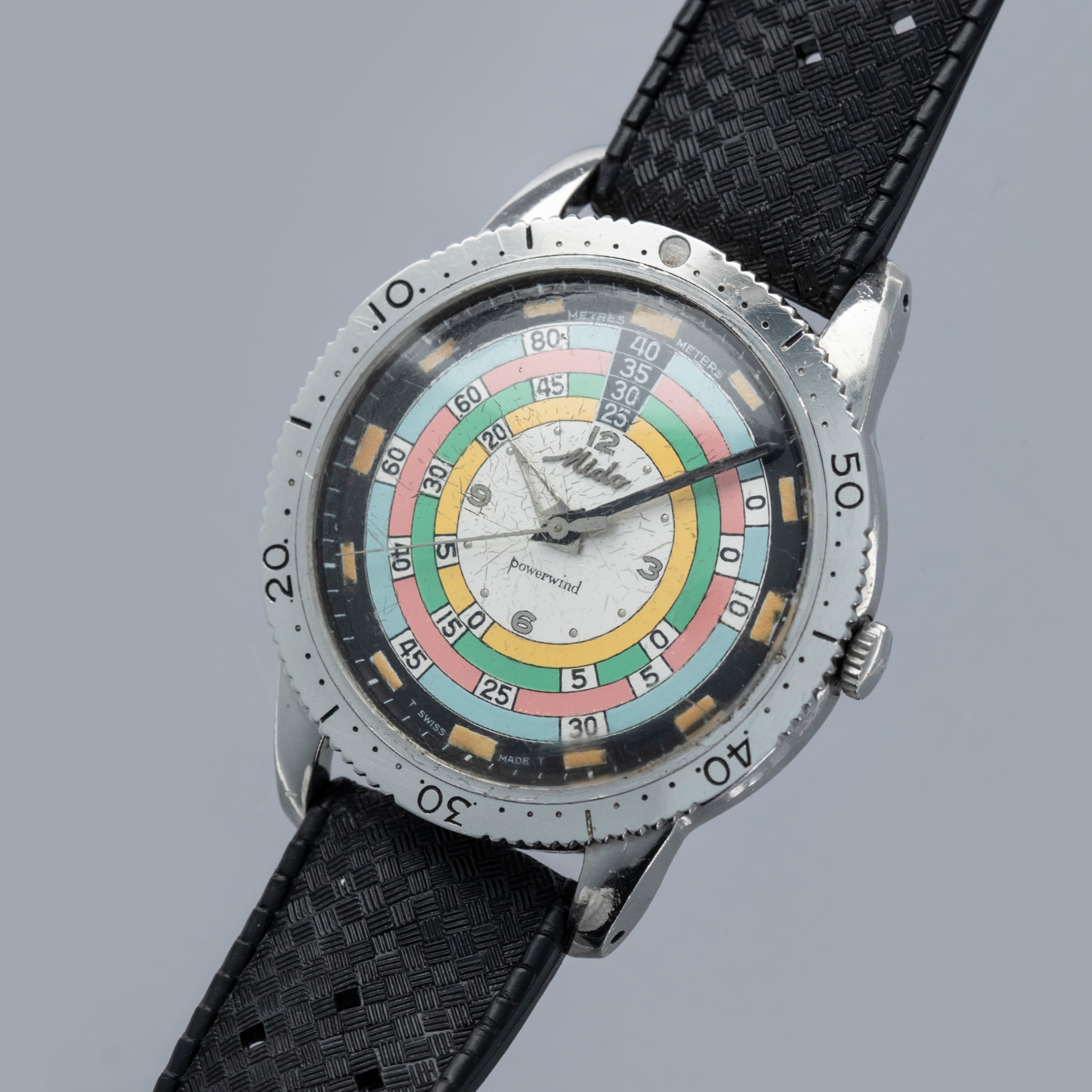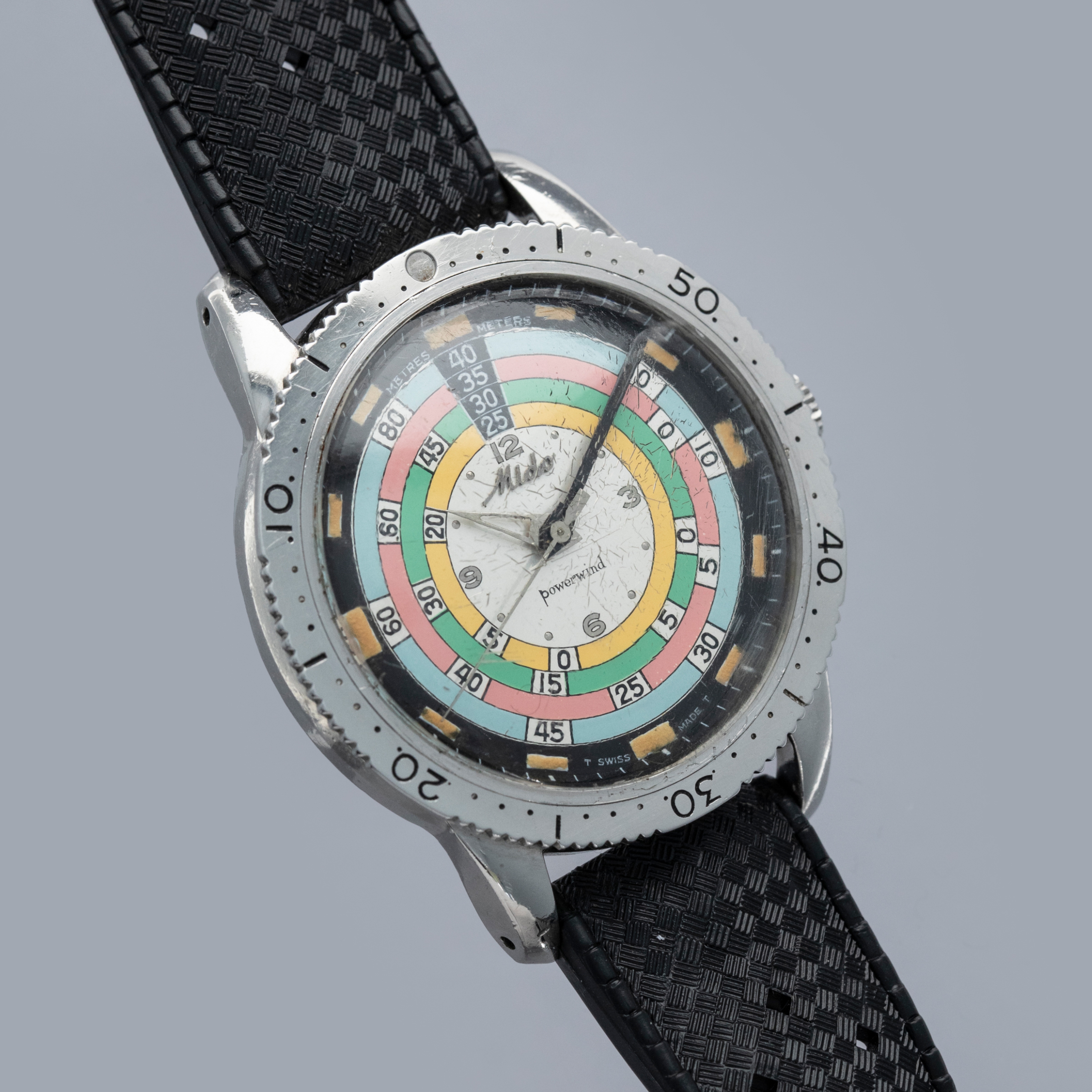 Originally launched in 1961 as the Powerwind 1000 that was part of the Ocean Star line that debuted just two years before, the Mido Ocean Star Decompression Timer harkens back to the birth of recreational diving as a hobby and pastime, a time which saw the proliferation of the skin divers and the advancement of dive watches as a whole. Discontinued in 1965, the Powerwind 1000 was popular for its bright dial, which featured a colorful decompression table that informed its wearer how long they would need to spend underwater resurfacing, provided they reached a certain depth for a certain amount of time, to avoid developing decompression sickness, or 'The Bends' - a sickness that would often claim the lives of divers. Offered here we have an original Ocean Star “Rainbow” with its beautifully colorful decompression table dial, a simple 37.5mm stainless steel case, a wonderful black tropic rubber strap, and its bi-directional bezel. An early skin diver that stands as remnant of just how important functional tool watches were for some tasks and professions prior to the invention of their digital counterparts, this timepiece is a true piece of horological history.