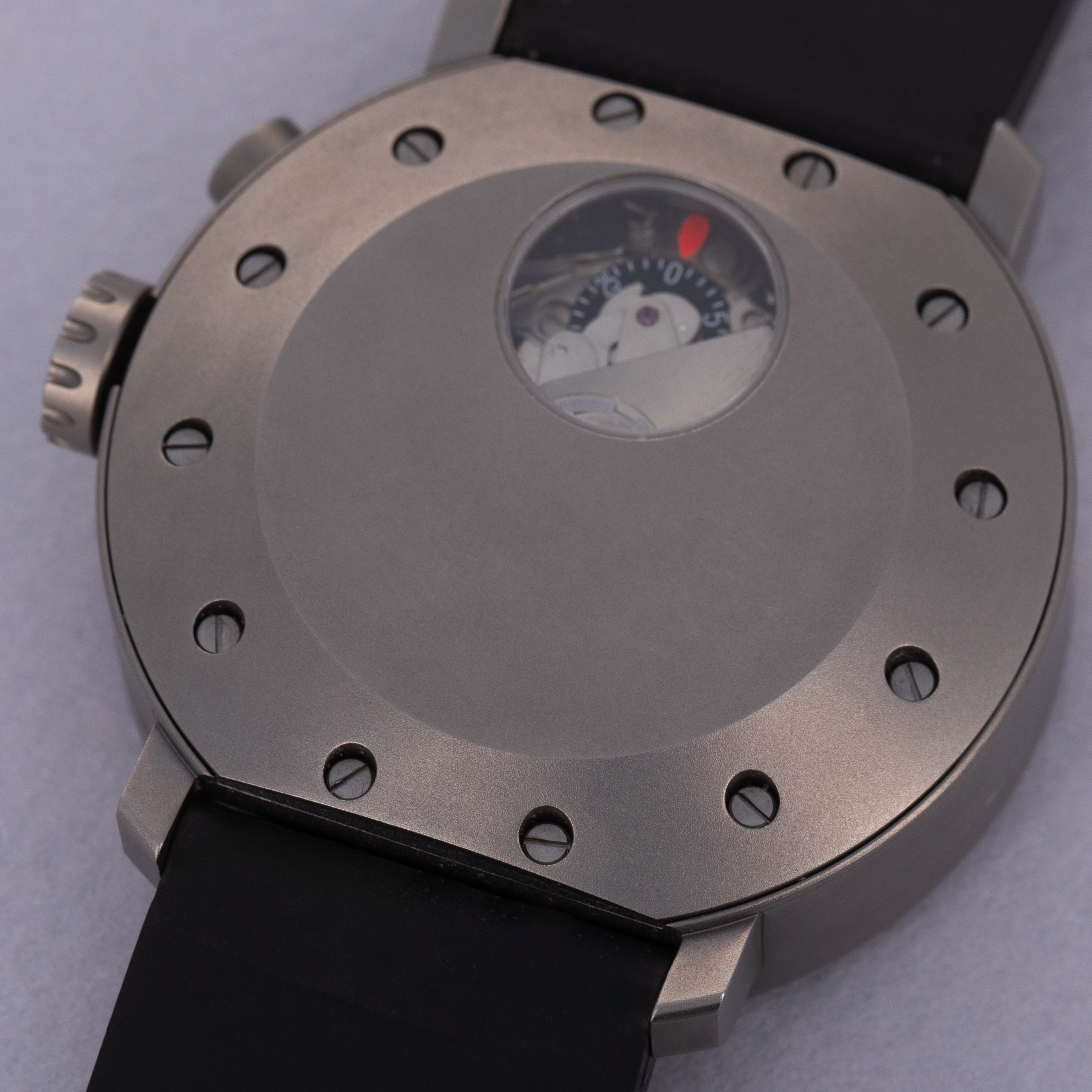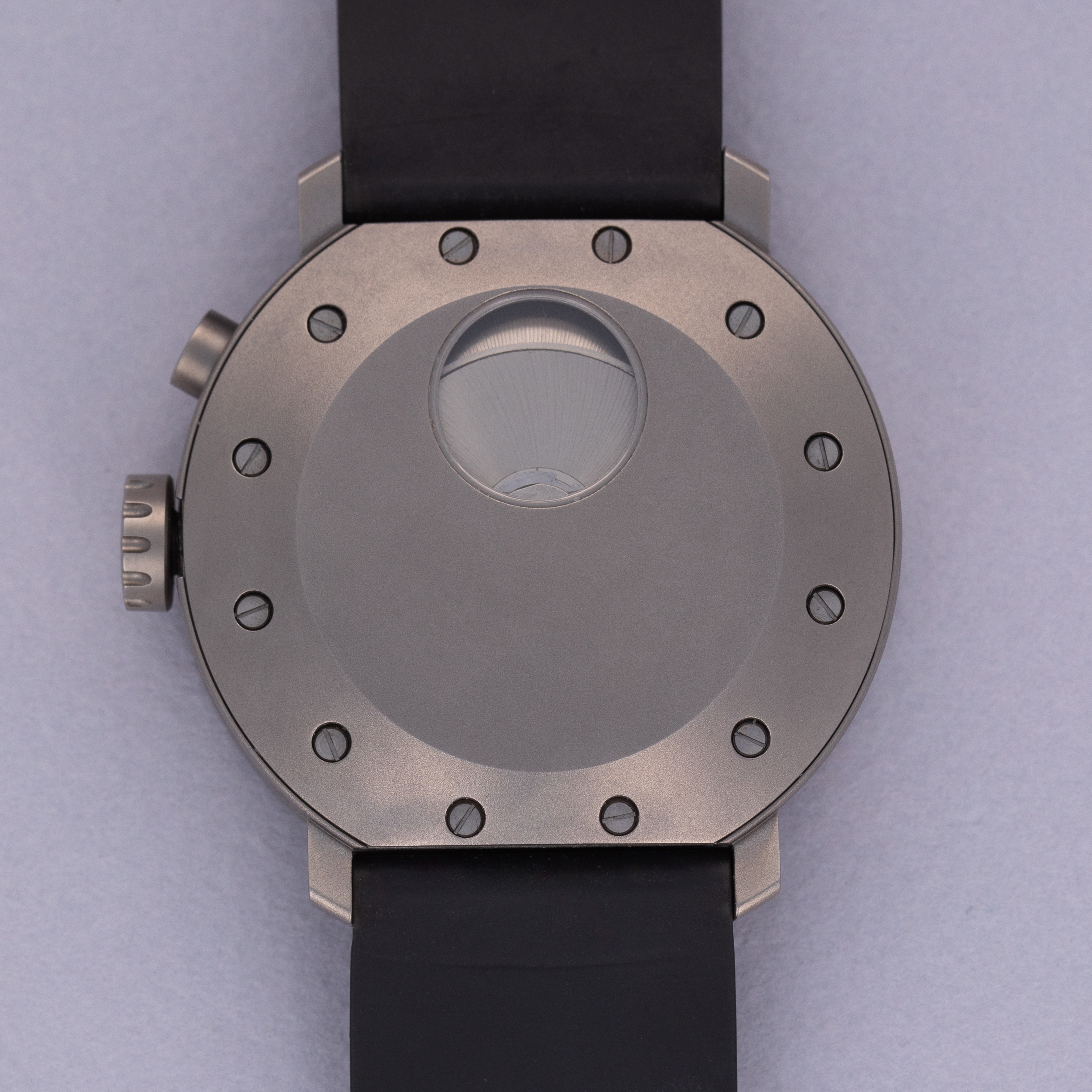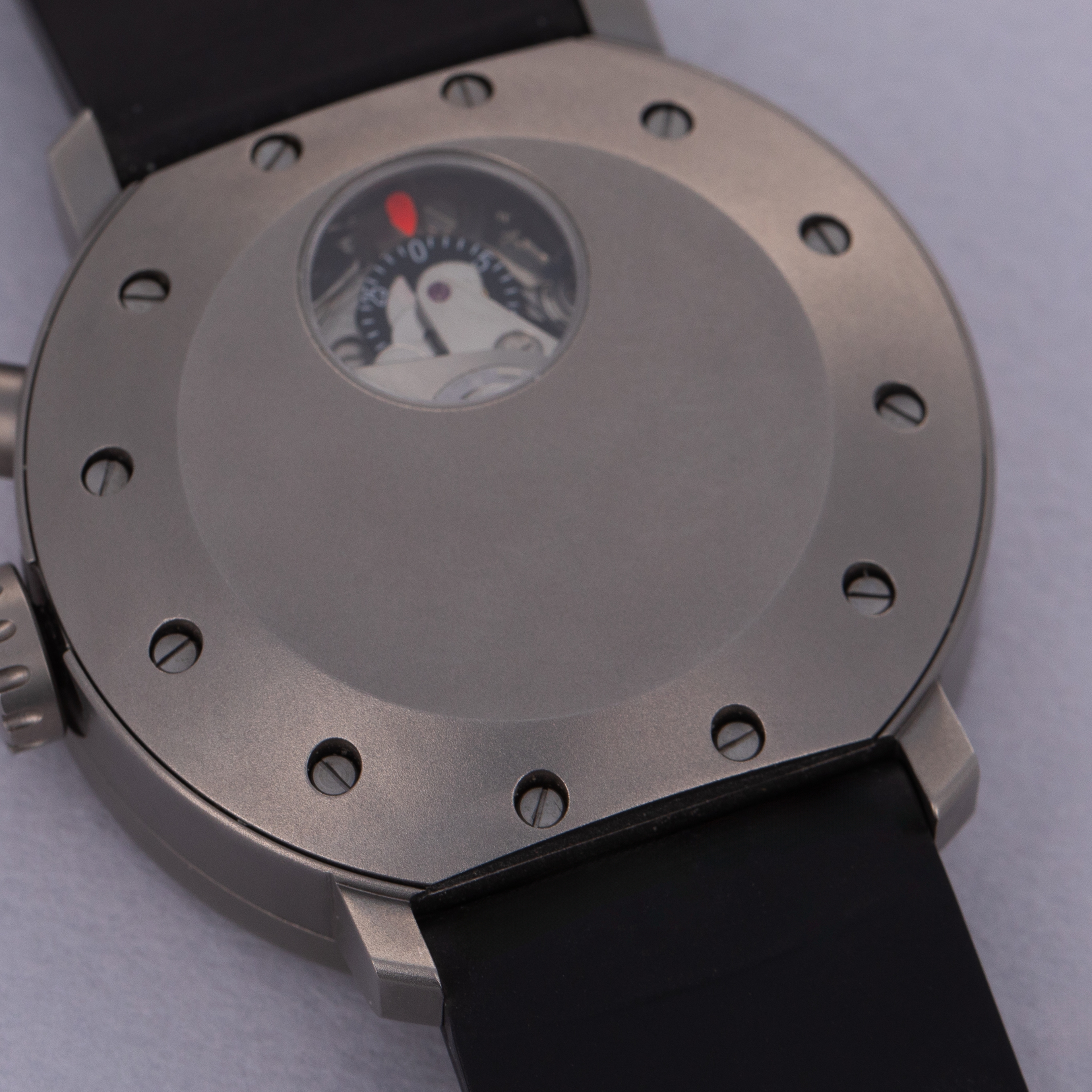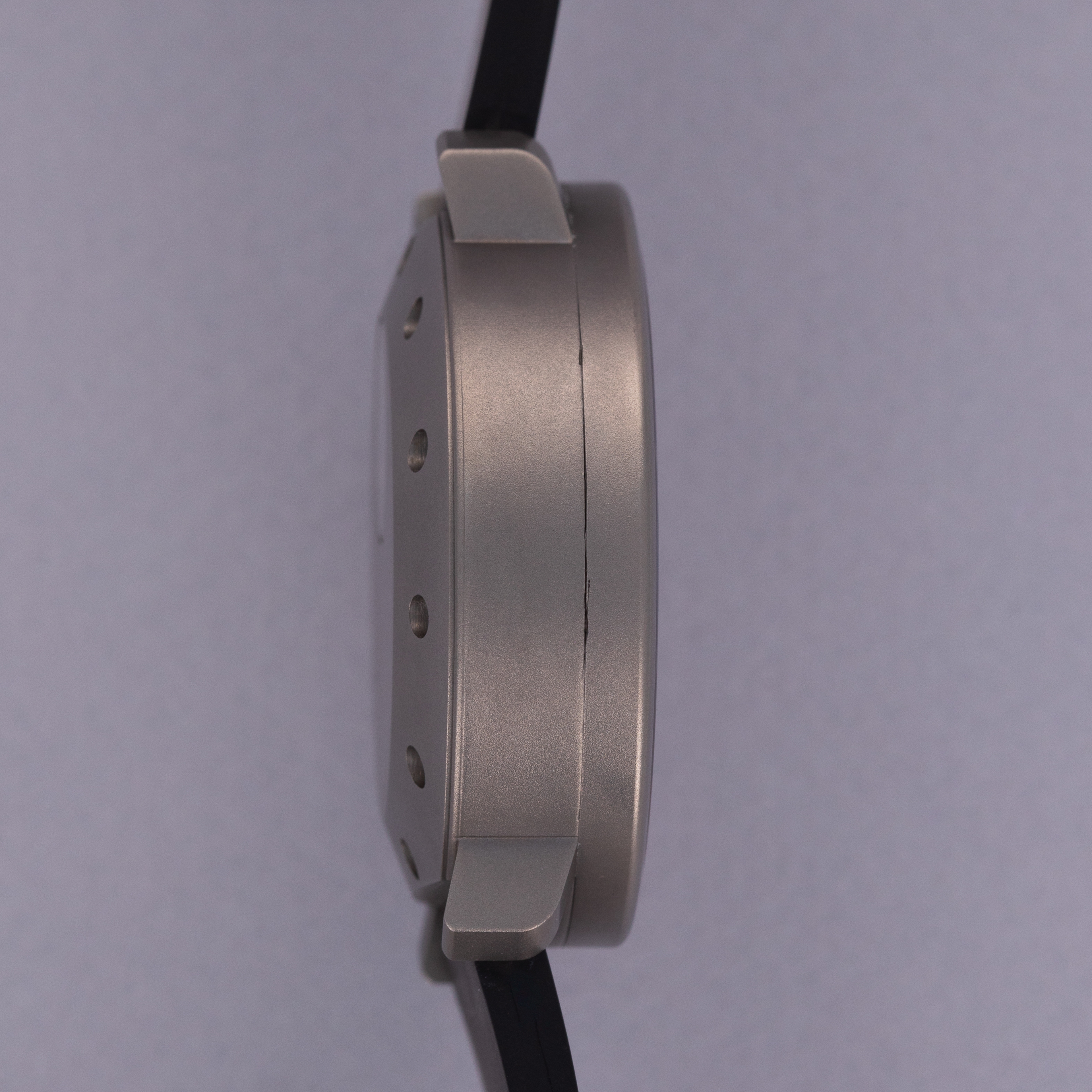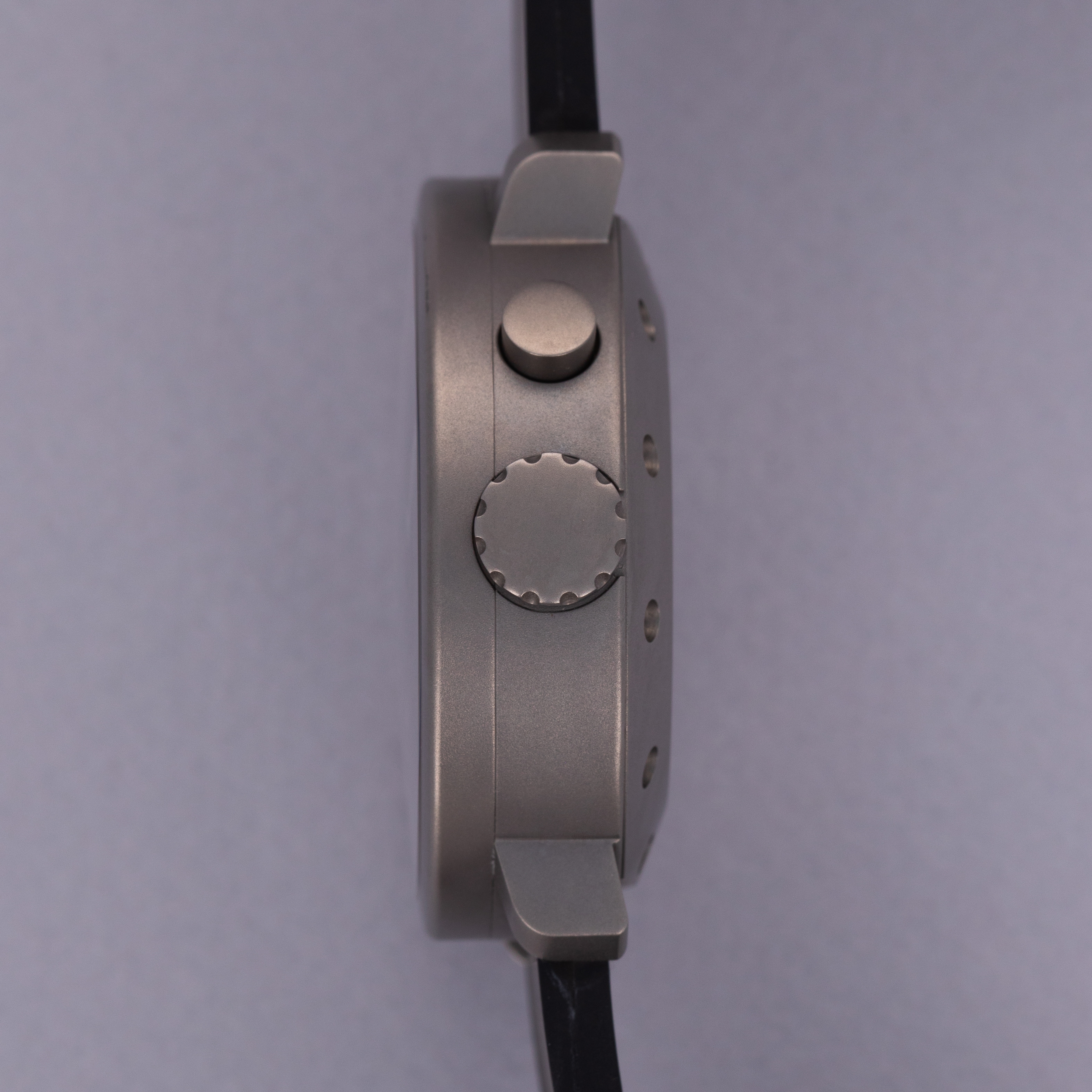 Launched in 2005 and produced until 2020 at a rate of around 100 units per year, the MIH Watch Annual Calendar Monopusher Chronograph is a testament to minimalist design and horological excellence. Created by Ludwig Oechslin of Ulysee Nardin fame, and world class movement specialist Paul Gerber, this timepiece combines simplicity with sophisticated functionality that results in a wonderfully unique wearing experience. The watch features an annual calendar, requiring only one adjustment per year, alongside a monopusher chronograph, which allows the user to start, stop, and reset the chronograph with a single button – two high-end complications that are seldom combined, even in very high end watchmaking. Boasting a clean dial design, devoid of excessive markings, this watch’s black diaplsy emphasizes legibility and elegance. The 42mm x 15mm titanium case houses a modified Valjoux 7750 movement with a 9-piece annual calendar module created by Ludwig Oechslin. The watch's understated aesthetics are complemented by a robust, yet refined, construction, making it suitable for both everyday wear and special occasions.