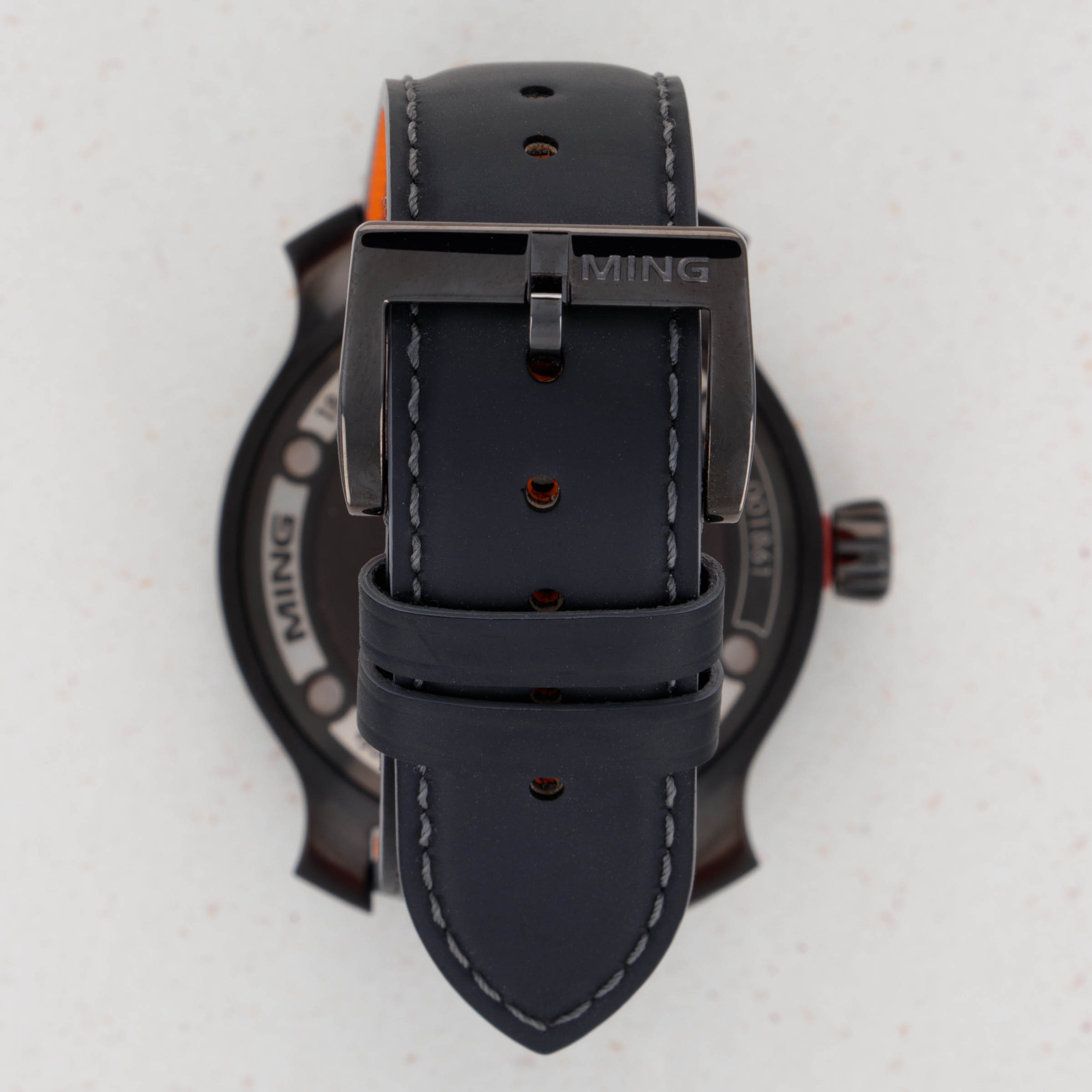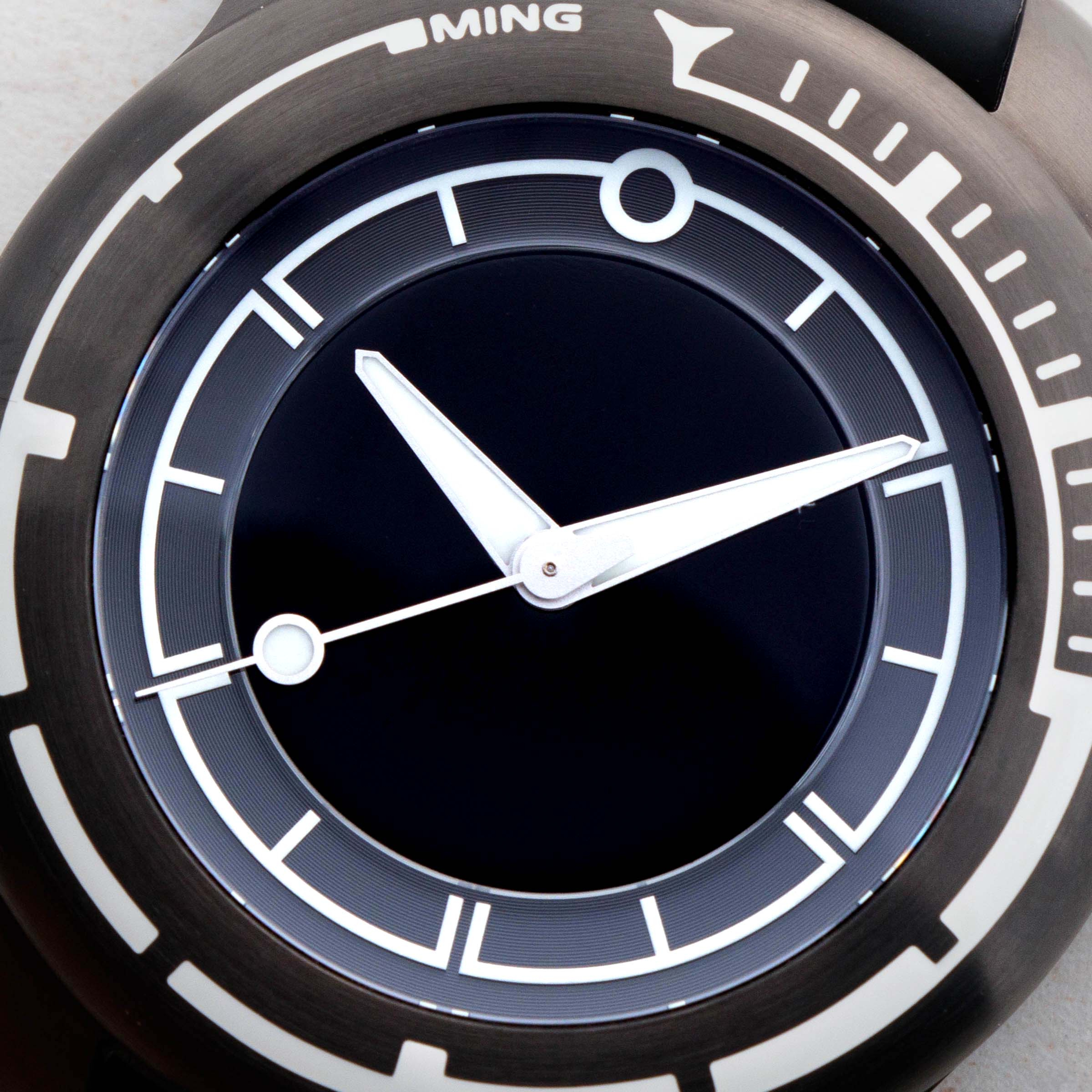 With a focus on legibility, the MING 18.01 makes extensive use of the brightest luminous material made by LumiNova, called X1. It is applied in liquid expoxy form to the bezel, a solid block in the hands, and as HyCeram- a sapphire fused luminous ceramic.