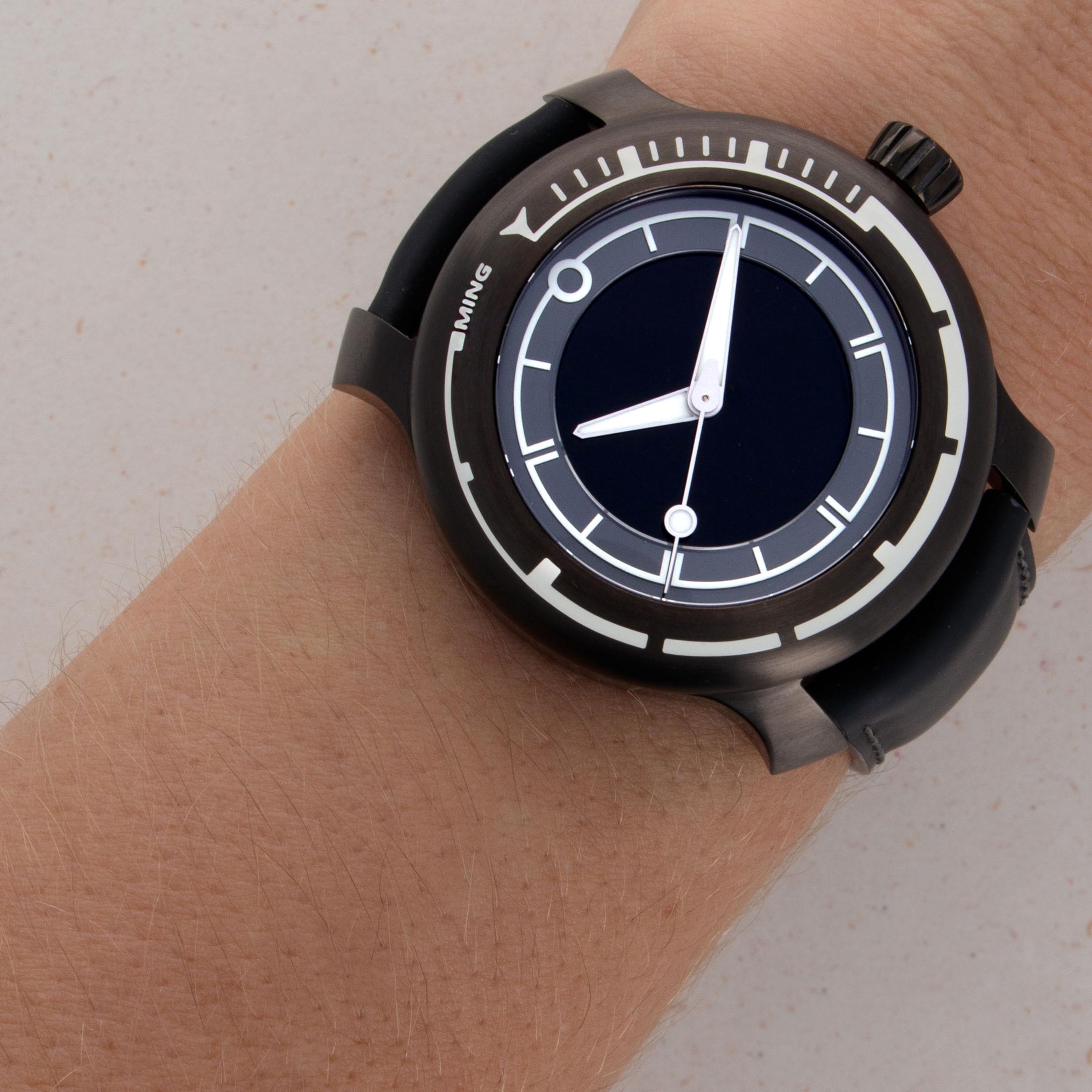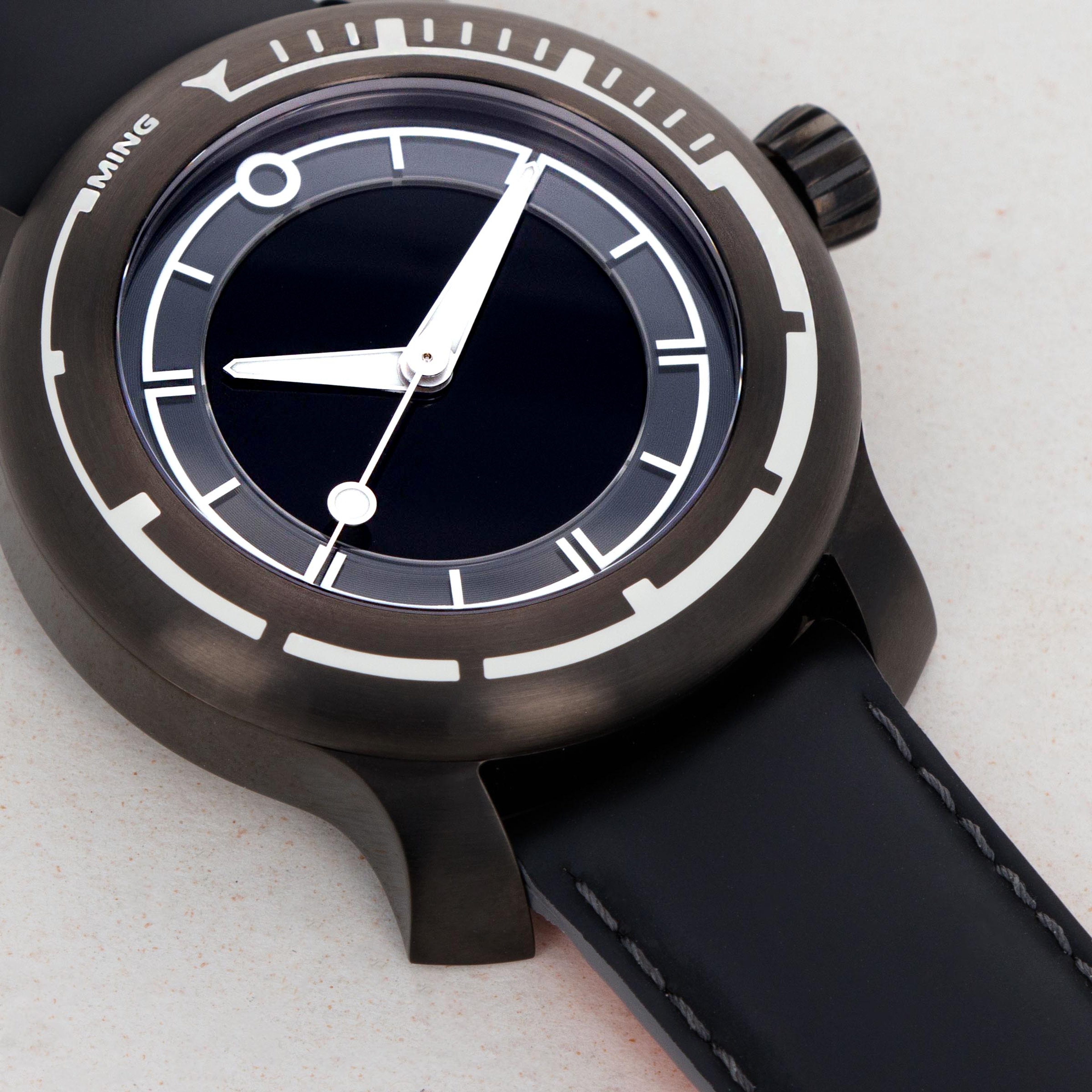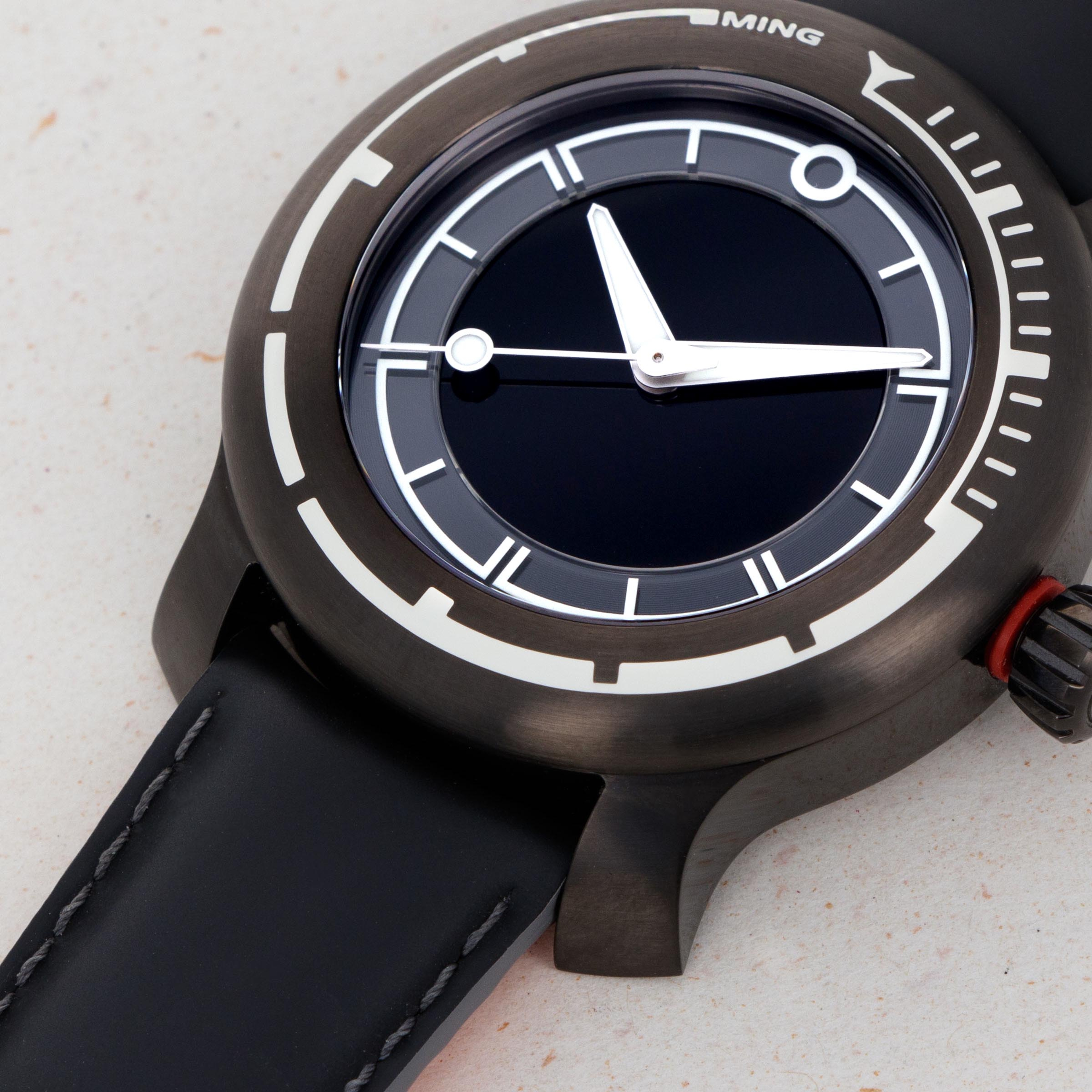 In a short time since its first watches hit the market in 2017, MING has built a reputation as a small brand that makes high quality and thoughtfully designed watches in very limited quantities. This formula for success was validated in 2019, as the brand took home the GPHG award for Horological Revelation for the 17.06 Copper. The 18.01 H41 DLC that we have here was launched in mid-2020 as an evolution of the original Abyss concept and an expansion within the 18.01 family. It features a slightly slimmer profile and a slightly updated aesthetic with an entirely blacked out DLC-coated grade 5 titanium construction. The watch is a truly functional dive watch, with an incredible depth rating of 1km which is paired with extensive use of Super-LumiNova X1 across its dial and bezel, which combine to produce MING’s signature luminous pattern, a mainstay of the brand’s already-famous design language, much like MING’s flared lugs. Furthermore, the 18.01 DLC is powered by the famously robust and reliable automatic ETA cal. 2824-2 movement, which Schwarz-Etienne has modified for MING, as per usual. Sitting on a sleek black rubber strap by Jean Rousseau Paris, the 18.01 DLC demonstrates the collaborative efforts required to create a timepiece of this calibre and the levels MING will go to in order to produce a top quality timepiece.