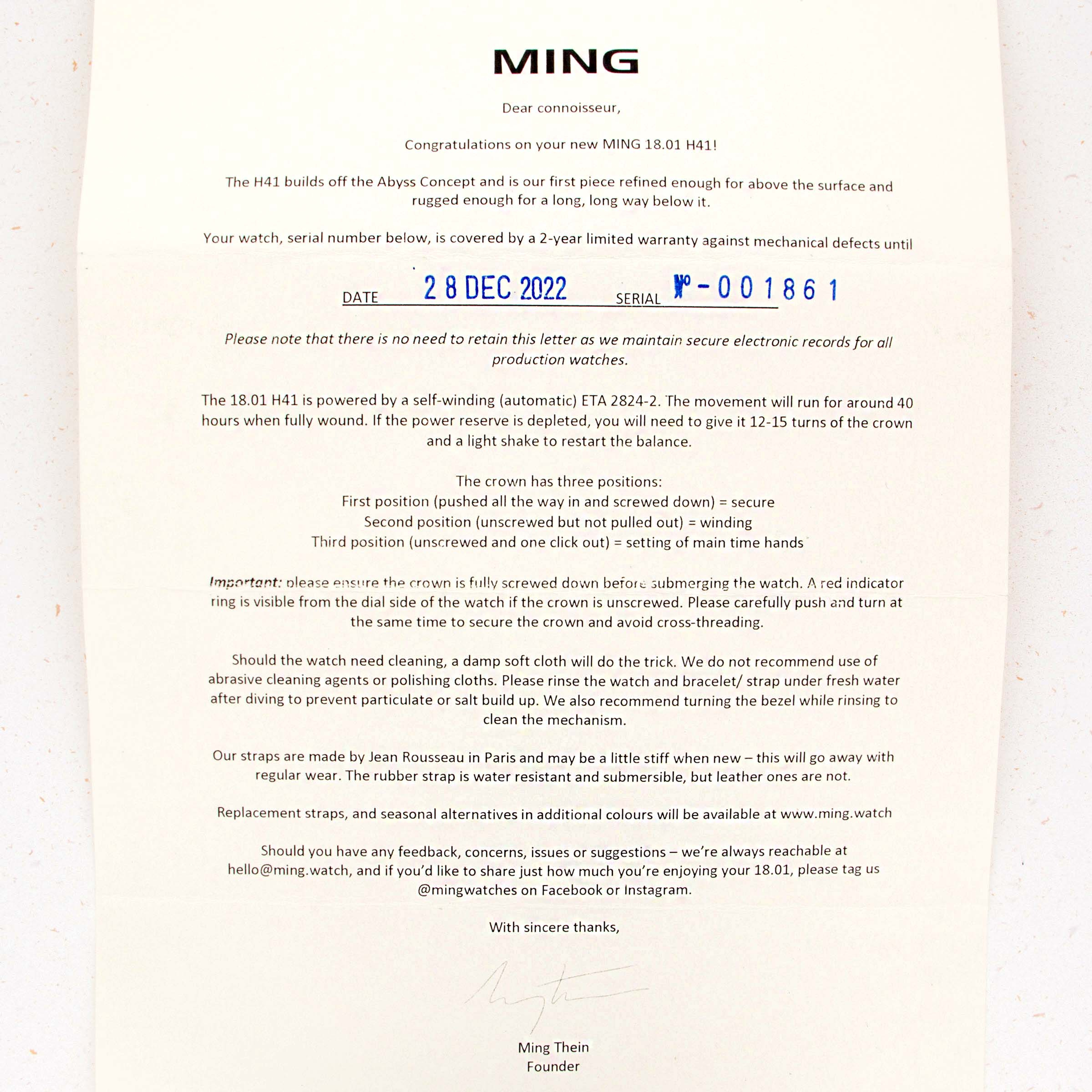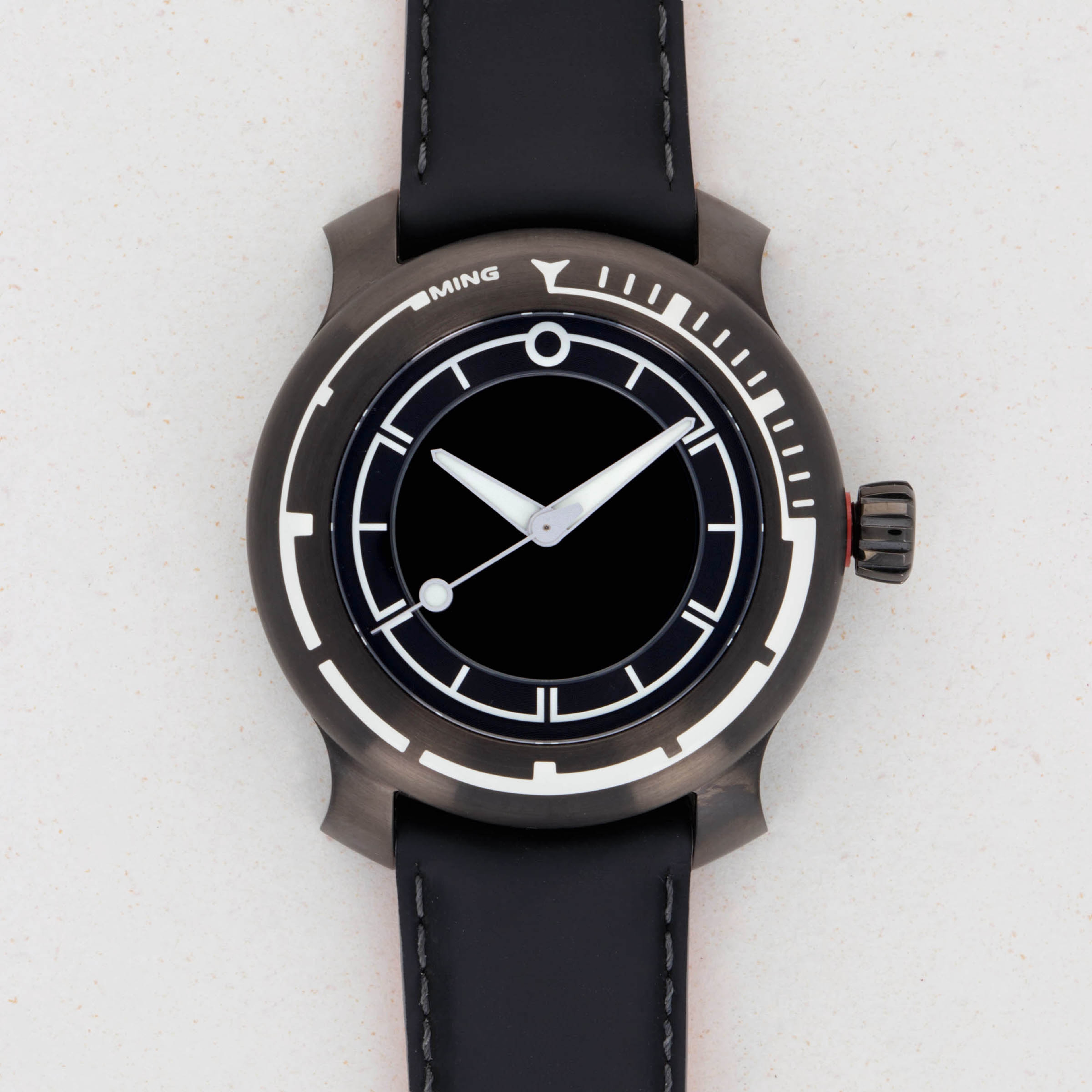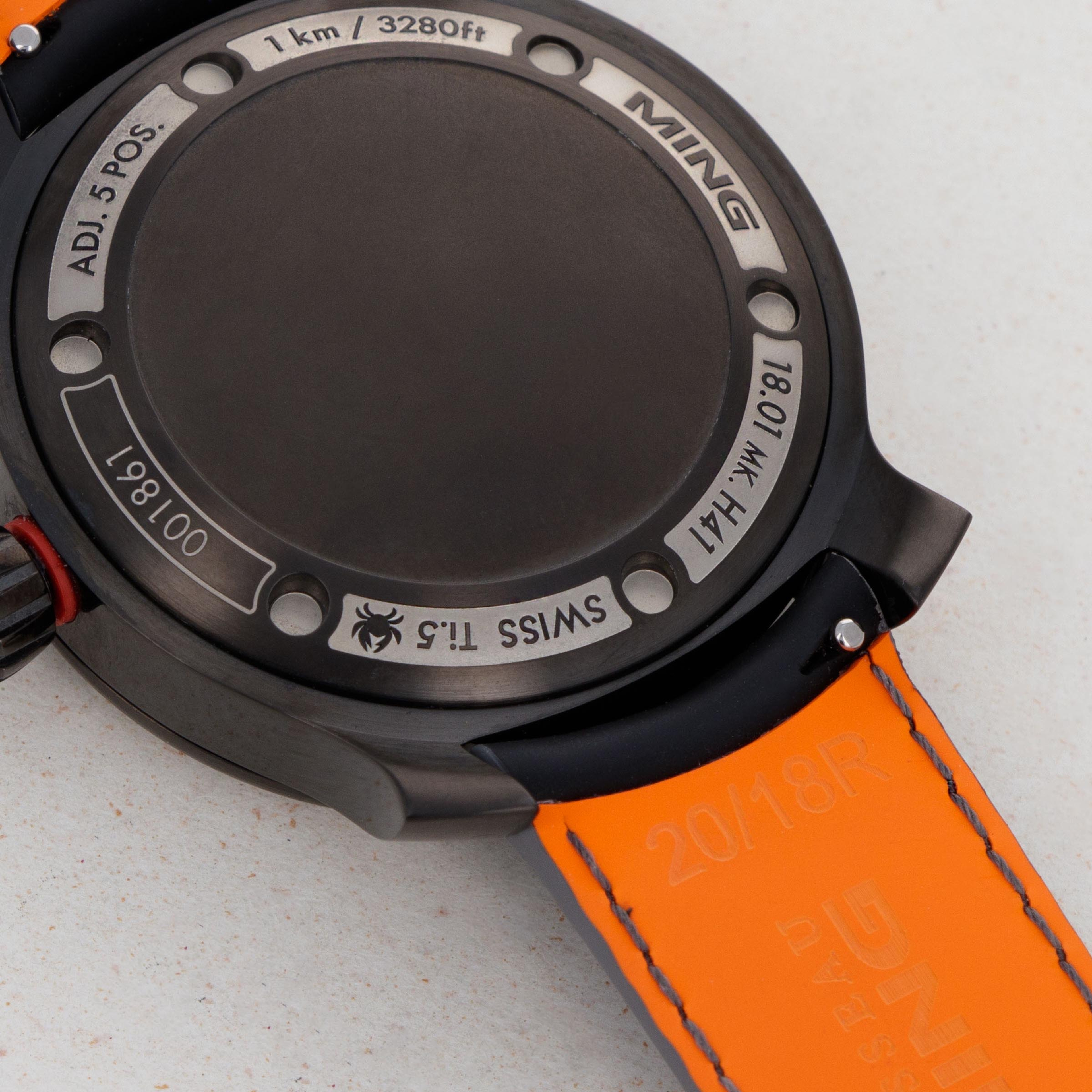 In a short time since its first watches hit the market in 2017, MING has built a reputation as a small brand that makes high quality and thoughtfully designed watches in very limited quantities. This formula for success was validated in 2019, as the brand took home the GPHG award for Horological Revelation for the 17.06 Copper. The 18.01 H41 DLC that we have here was launched in mid-2020 as an evolution of the original Abyss concept and an expansion within the 18.01 family. It features a slightly slimmer profile and a slightly updated aesthetic with an entirely blacked out DLC-coated grade 5 titanium construction. The watch is a truly functional dive watch, with an incredible depth rating of 1km which is paired with extensive use of Super-LumiNova X1 across its dial and bezel, which combine to produce MING’s signature luminous pattern, a mainstay of the brand’s already-famous design language, much like MING’s flared lugs. Furthermore, the 18.01 DLC is powered by the famously robust and reliable automatic ETA cal. 2824-2 movement, which Schwarz-Etienne has modified for MING, as per usual. Sitting on a sleek black rubber strap by Jean Rousseau Paris, the 18.01 DLC demonstrates the collaborative efforts required to create a timepiece of this calibre and the levels MING will go to in order to produce a top quality timepiece.