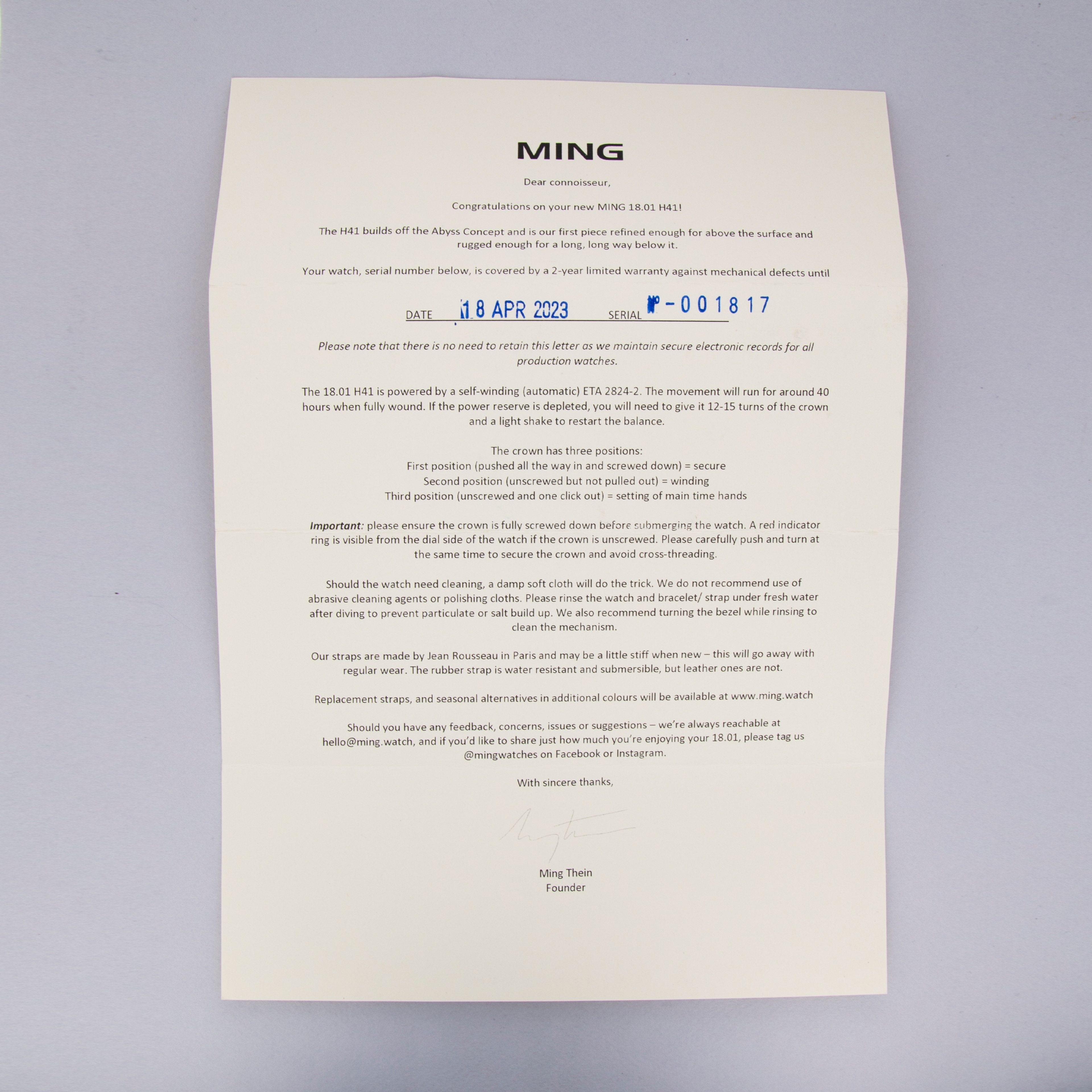 The 18.01 H41 Diver in Titanium was announced and released in 2020. An evolution of the original Abyss 18.01, it features a slightly slimmer profile and a slightly updated aesthetic. The watch is quite a functional dive watch, with a depth rating of 1km as well as extensive use of Super-LumiNova X1 on all lumious areas. It is powered by a ETA 2824-2 movement, which is know for its reliability.