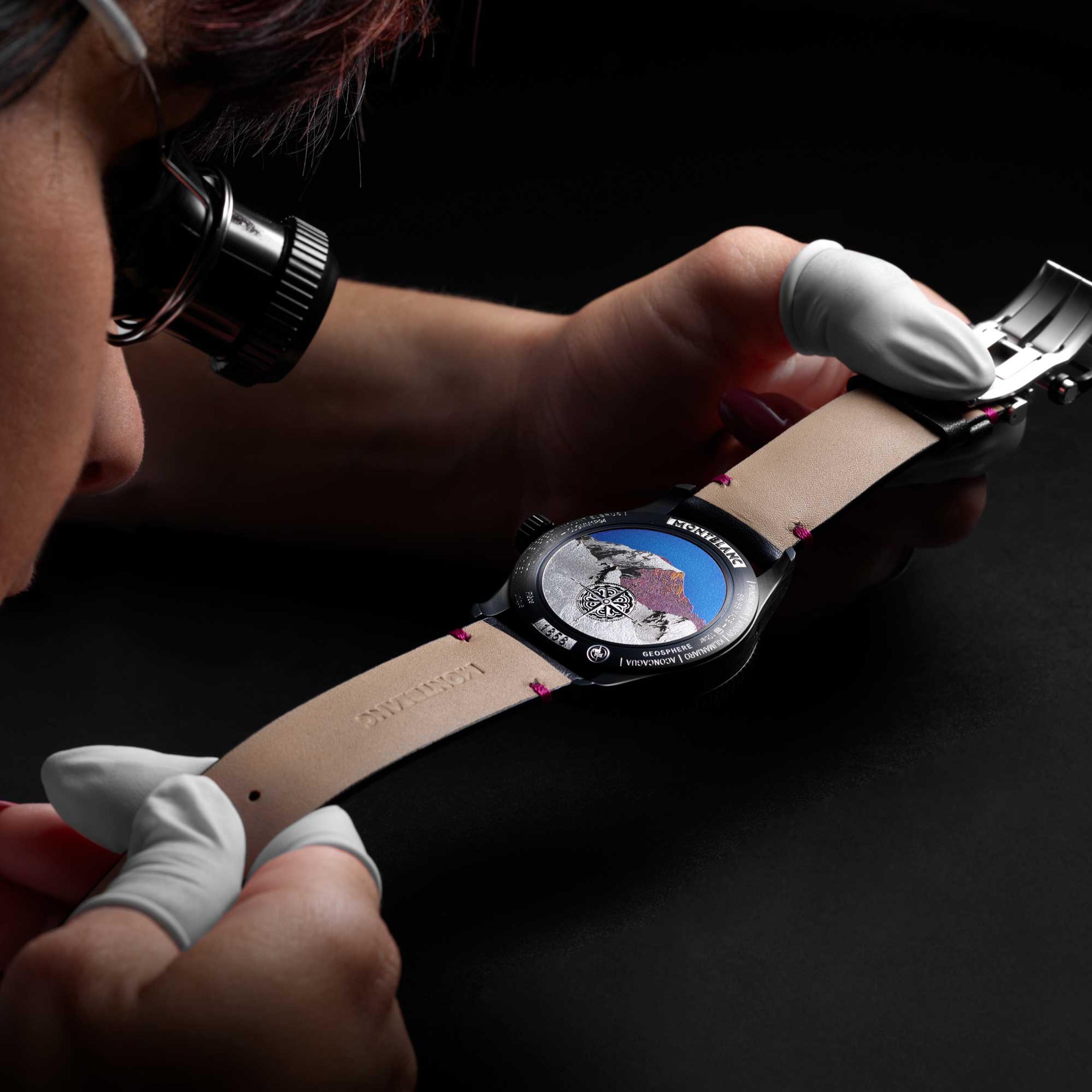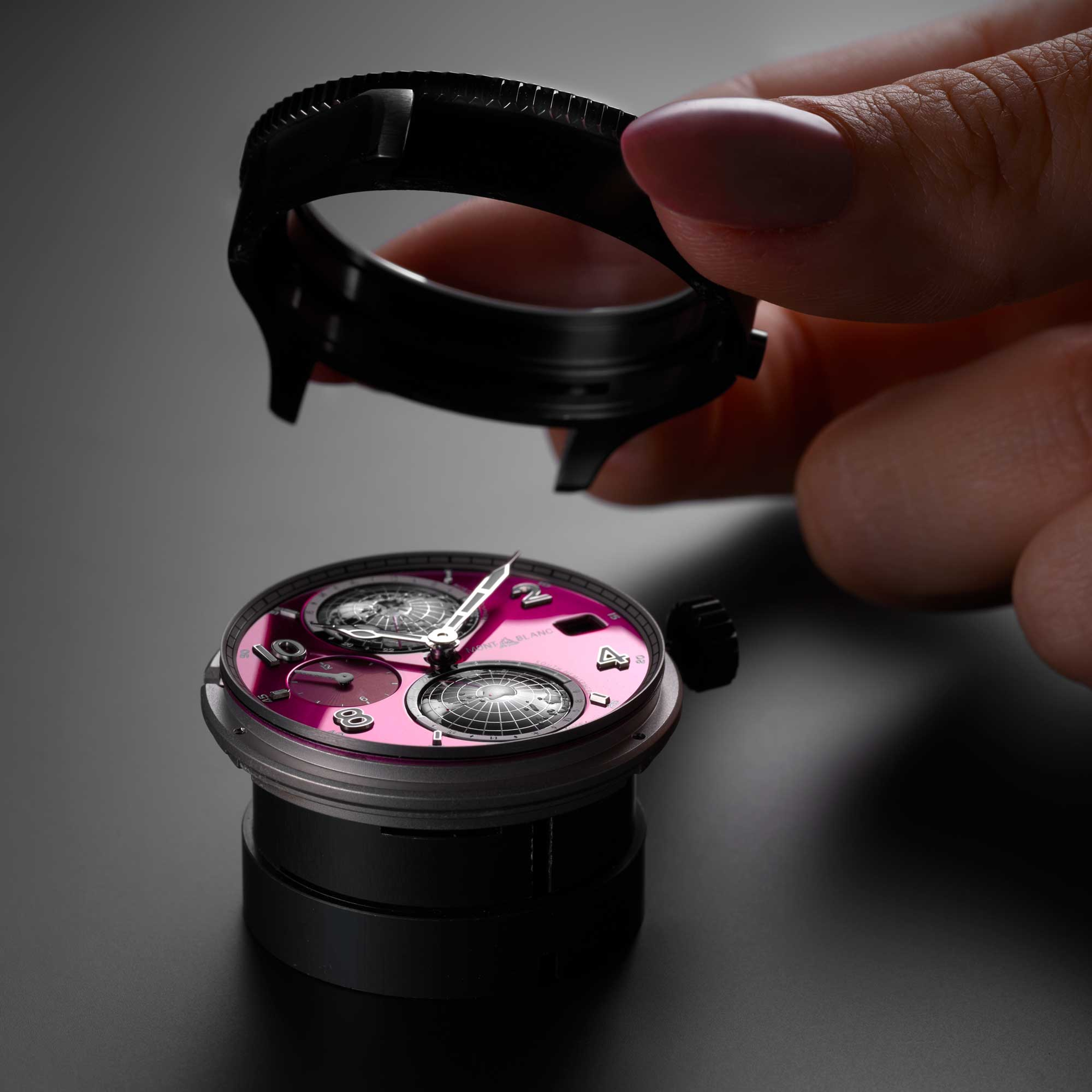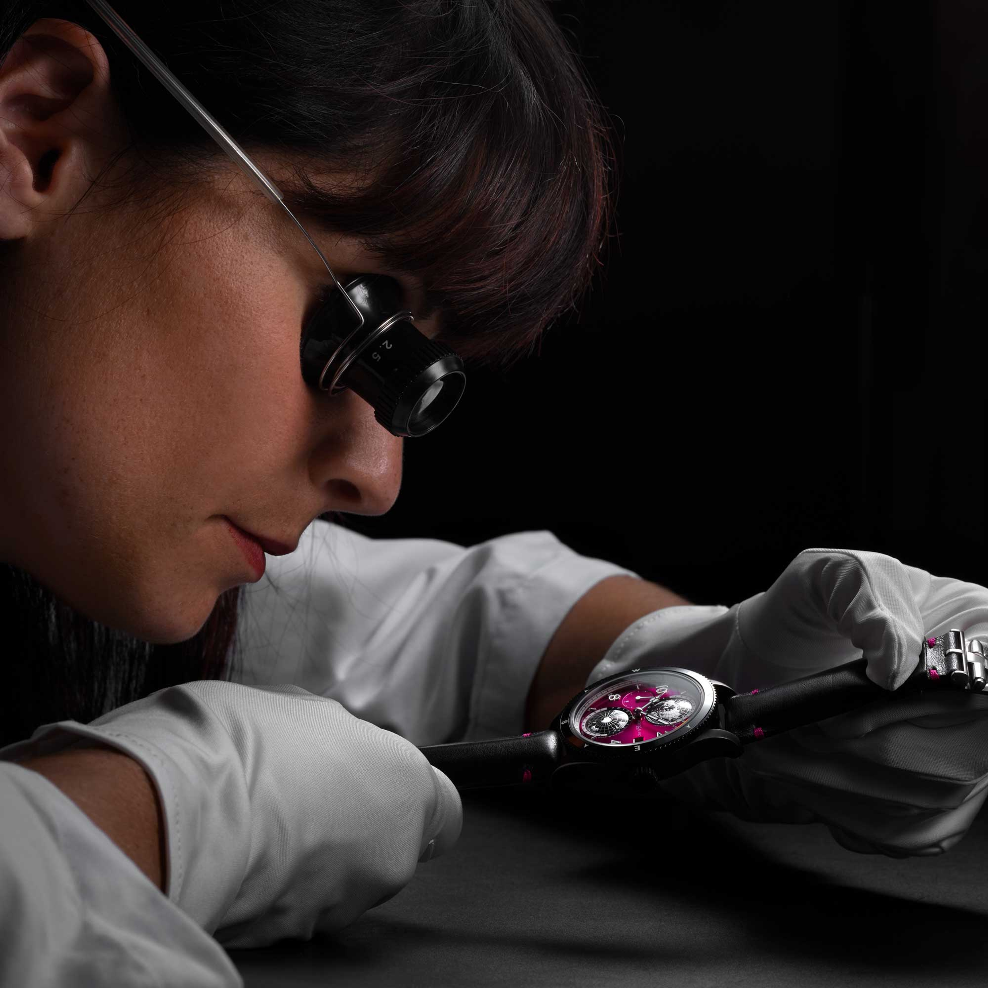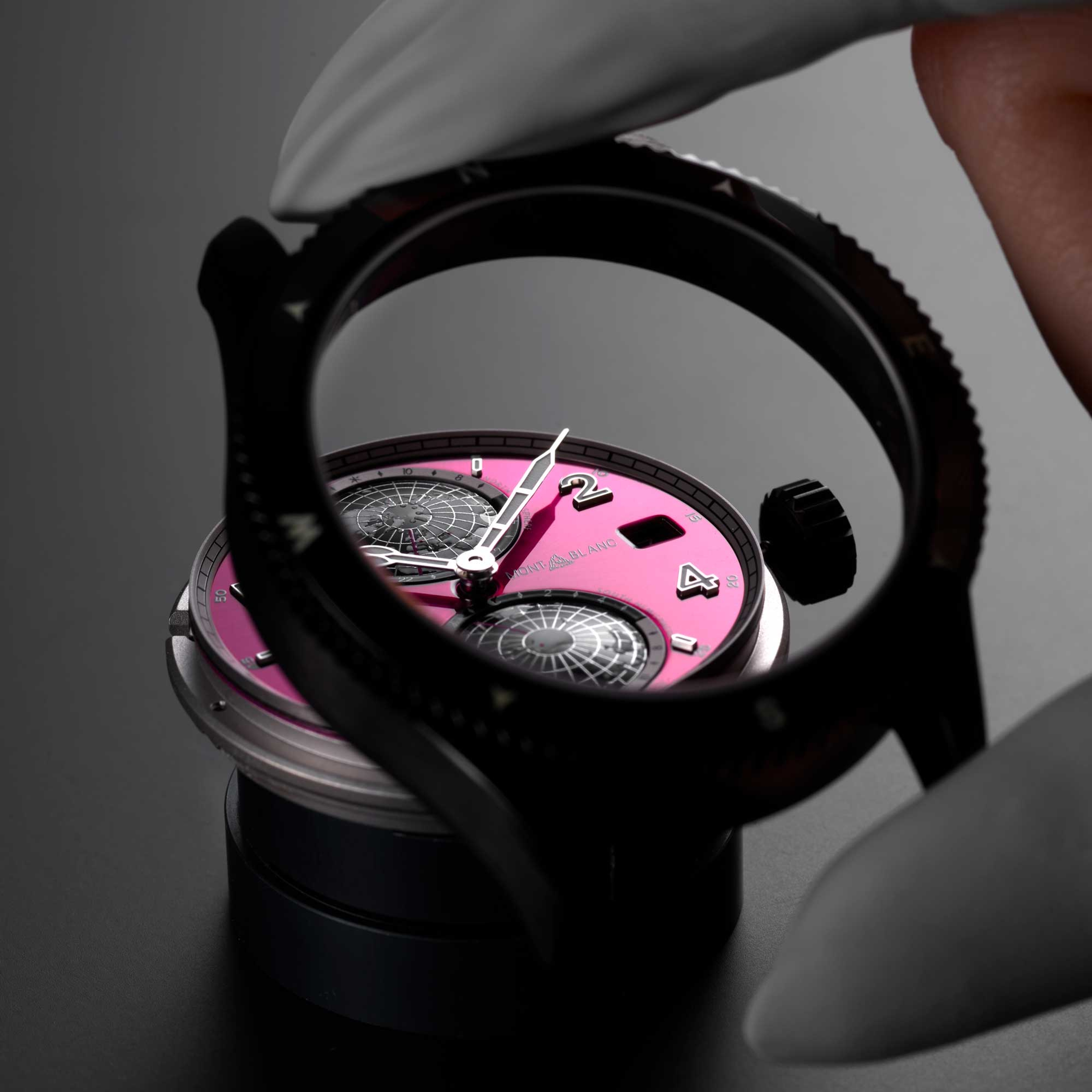 Montblanc is pleased to announce its first partnership with the Pink Dial project initiated by the Revolution and the Rake magazine’s founder, Wei Koh, by creating and donating the 1858 Geosphere Pink Dial Unique Piece to sustain the cause. Assembled by a Montblanc female watchmaker, this very special wristwatch, made of black DLC titanium with a fuchsia pink dial, is being auctioned this October.