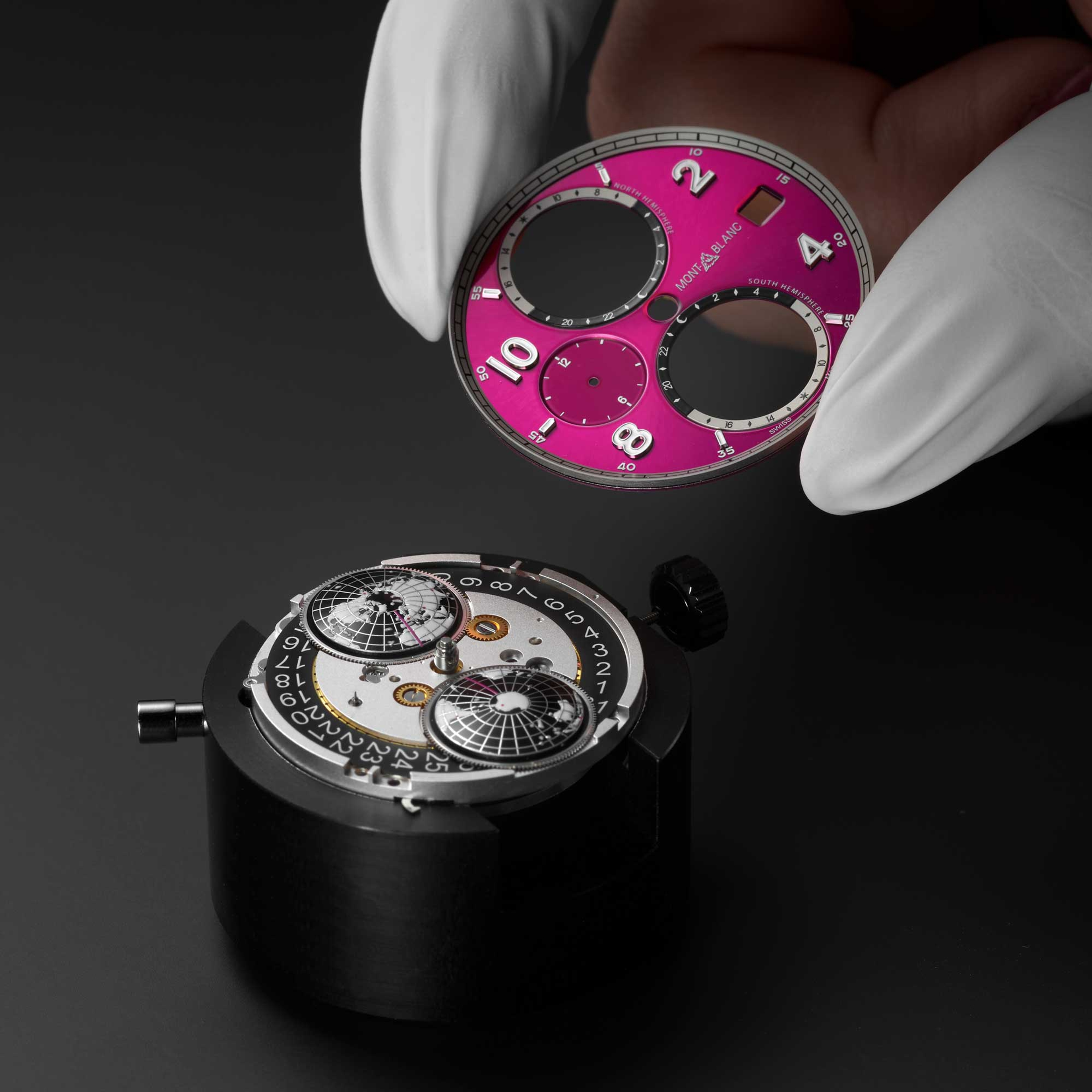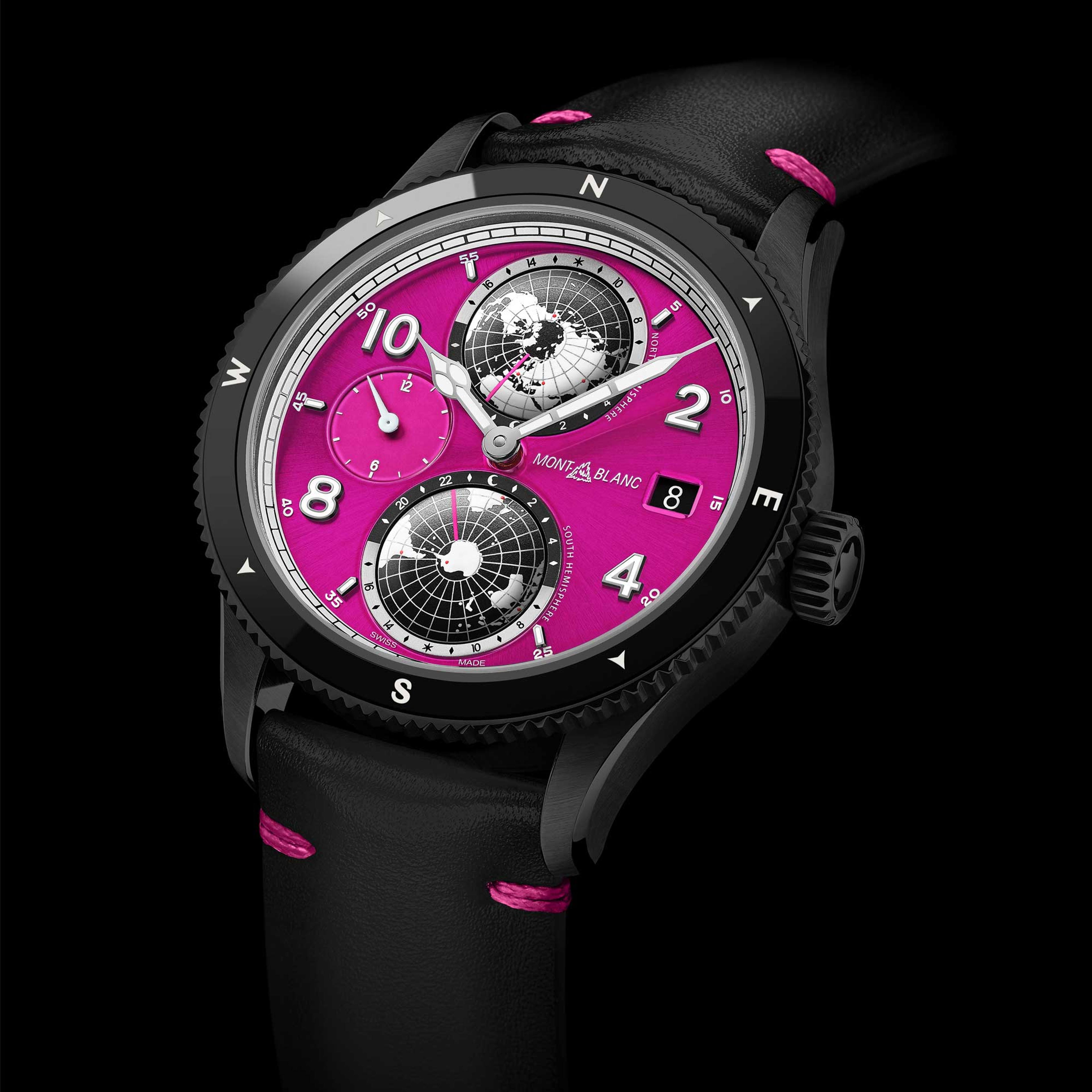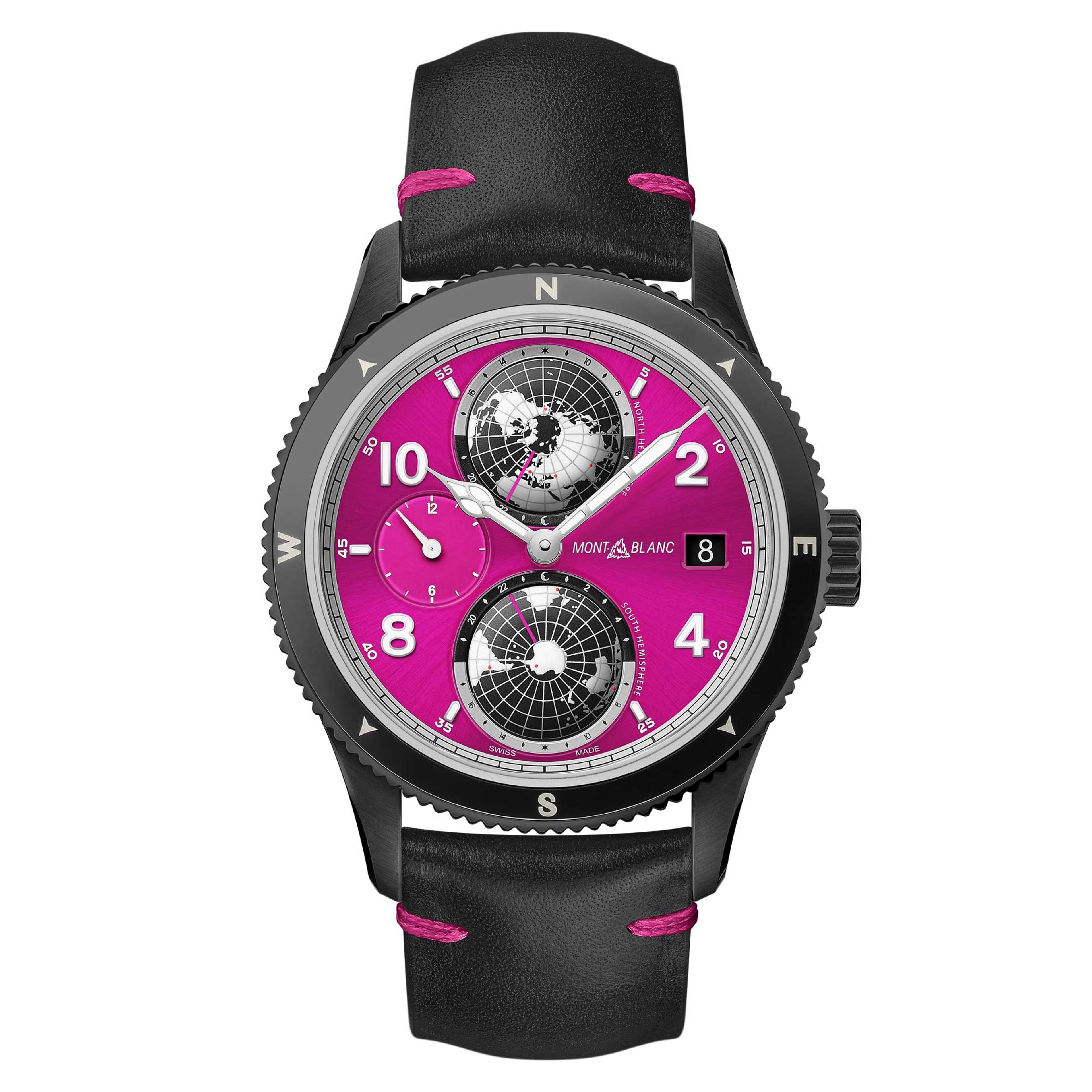 Fuchsia pink-colored, lacquered dial with sunray finishing, rhodium-coated and white-colored luminescent applied Arabic numerals, rhodium-coated and white-colored luminescent cathedral-shaped hour-and minute-hands, white-colored luminescent second time zone hand, rhodium-coated and white colored luminescent northern and southern hemispheres globes, historical Montblanc logo at 3 o’clock