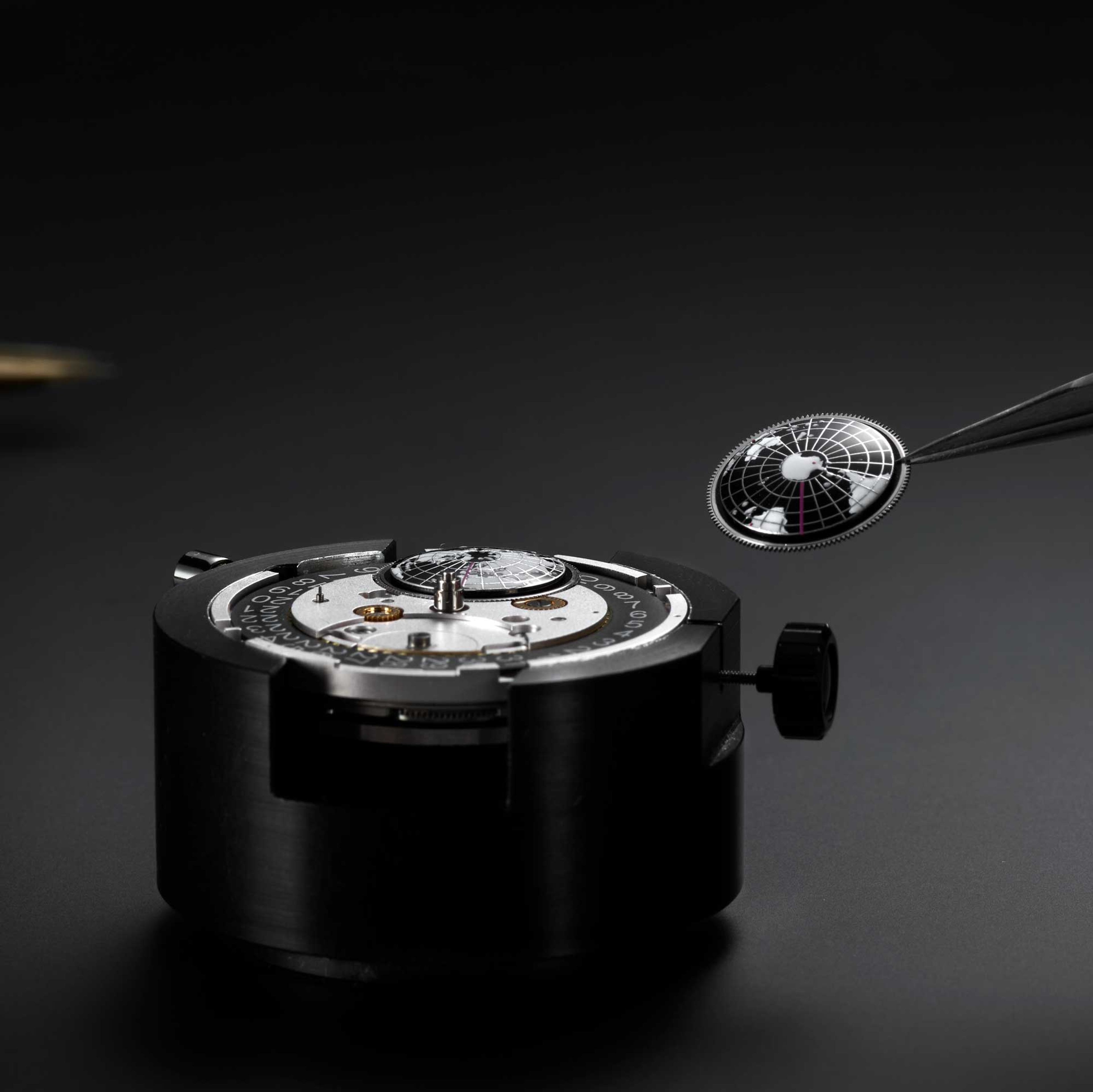 Hours and minutes from the centre, date at 3 o’clock; second time zone at 9 o’clock; domed turning northern and southern hemisphere globes at 12 o’clock and 6 o’clock with a 24-hour scale and day-night indication