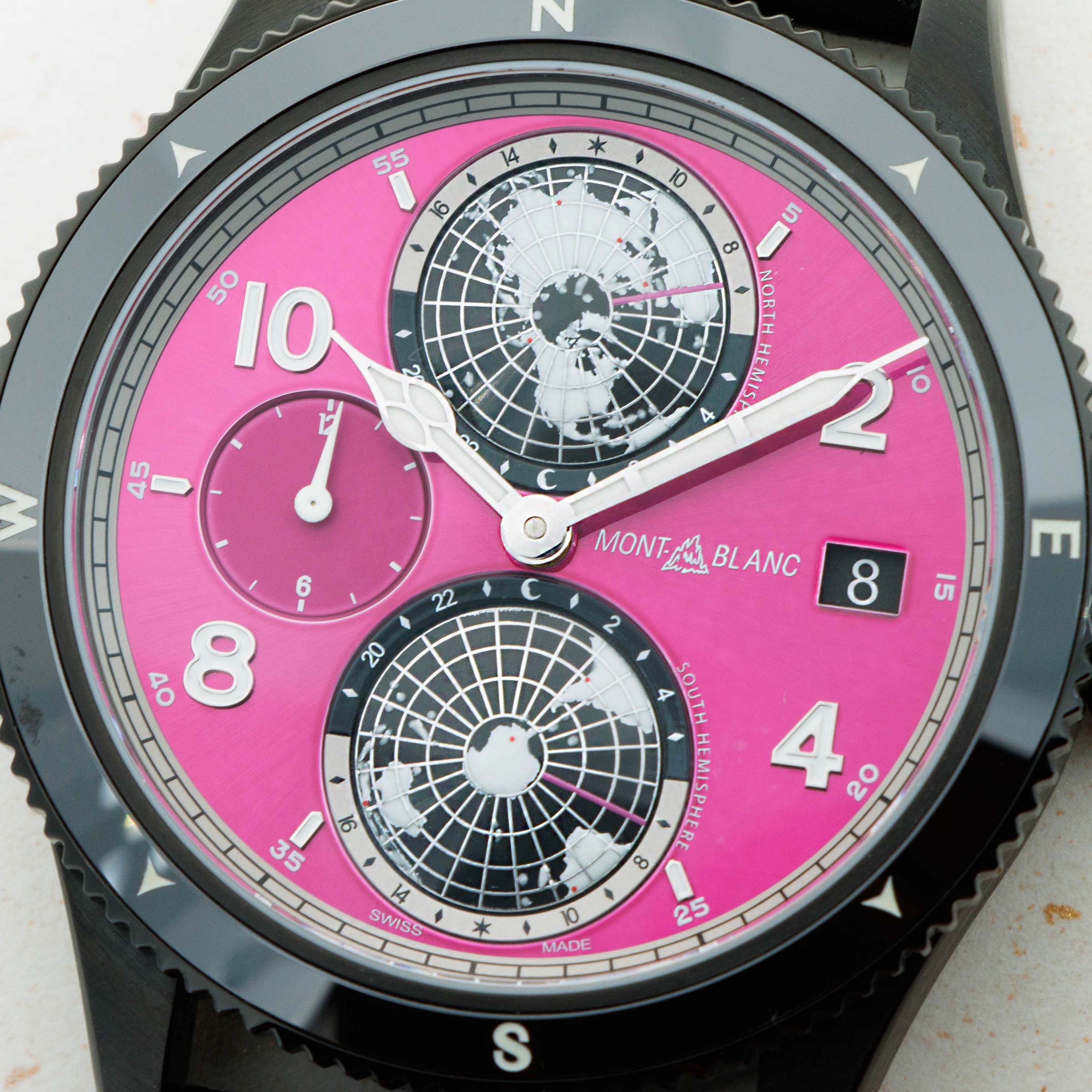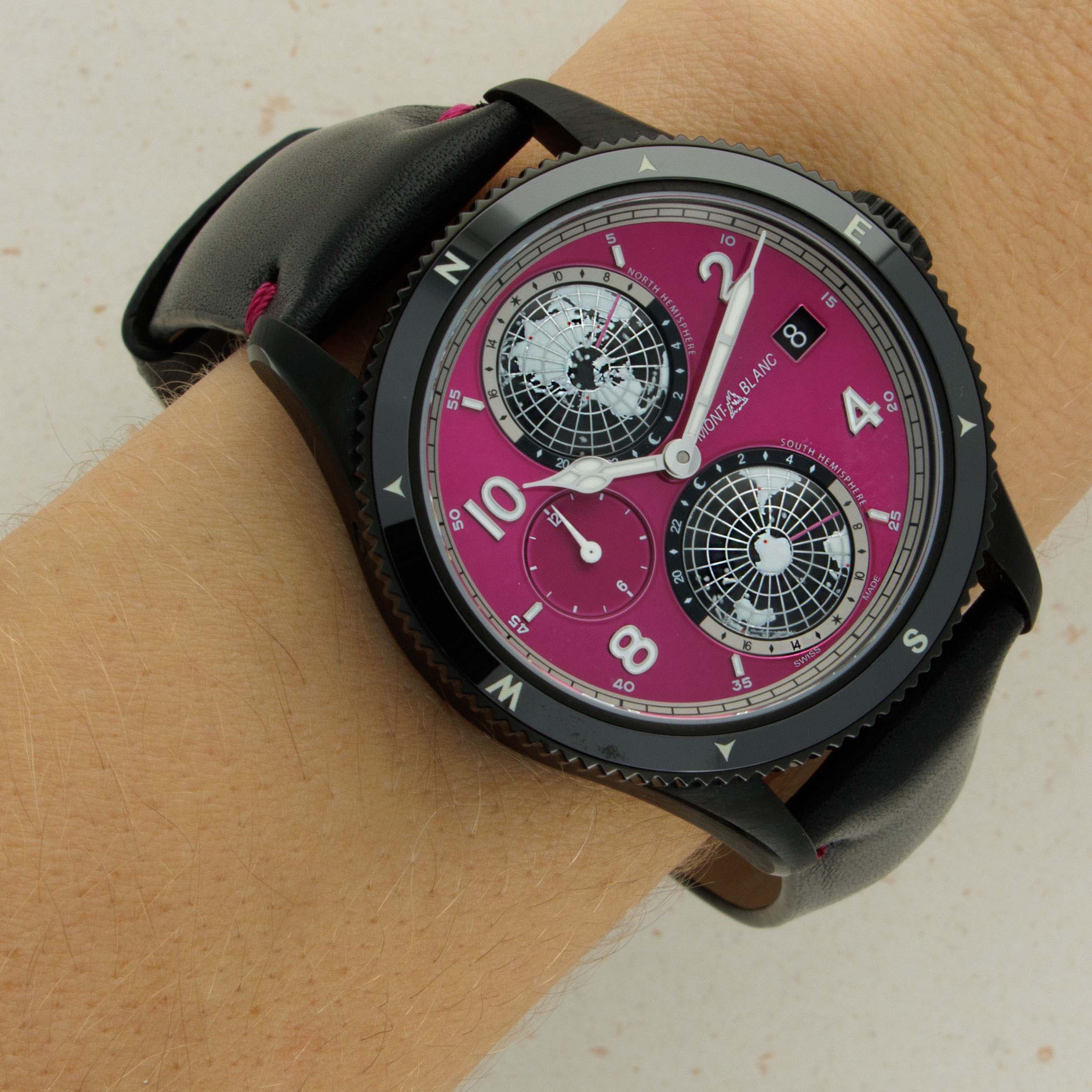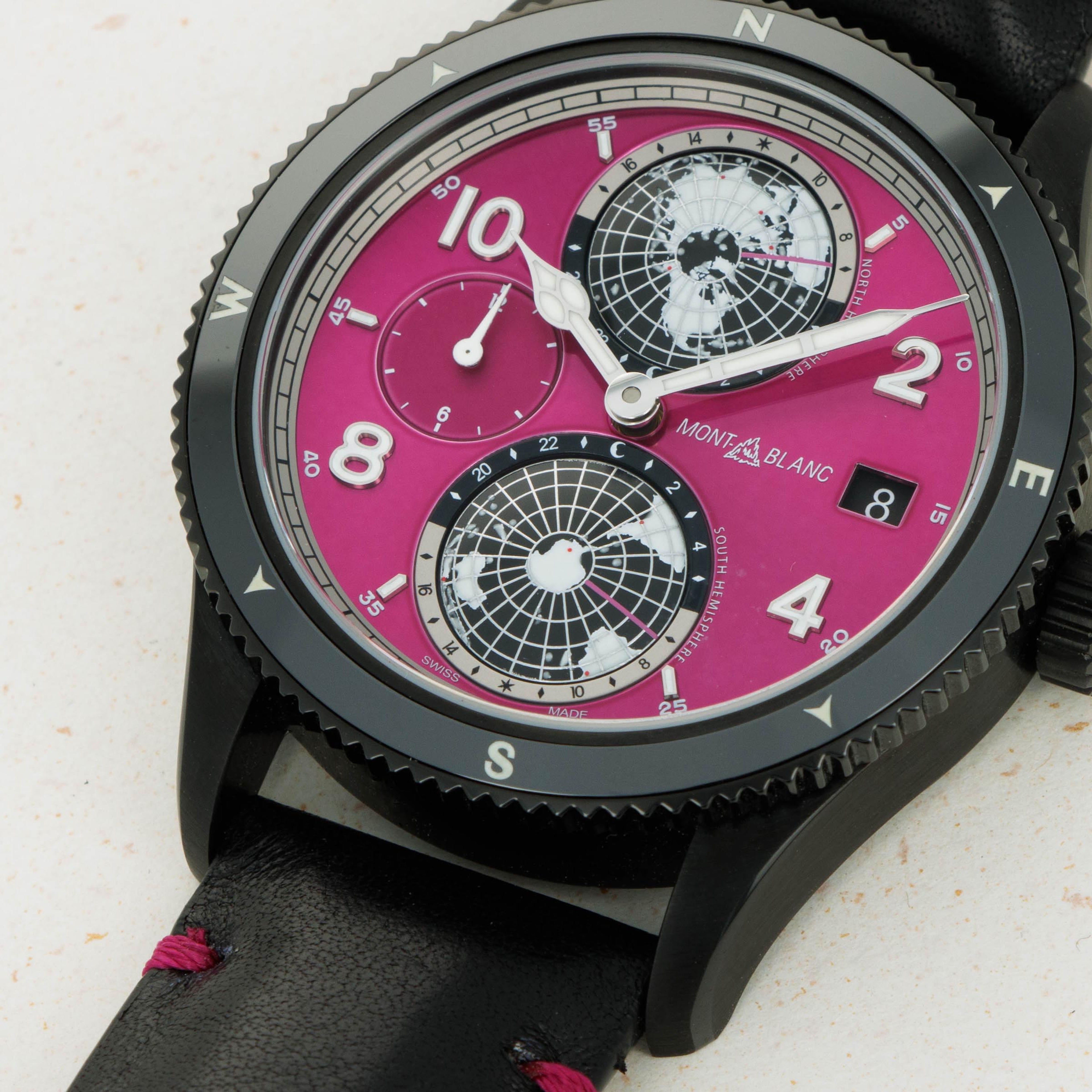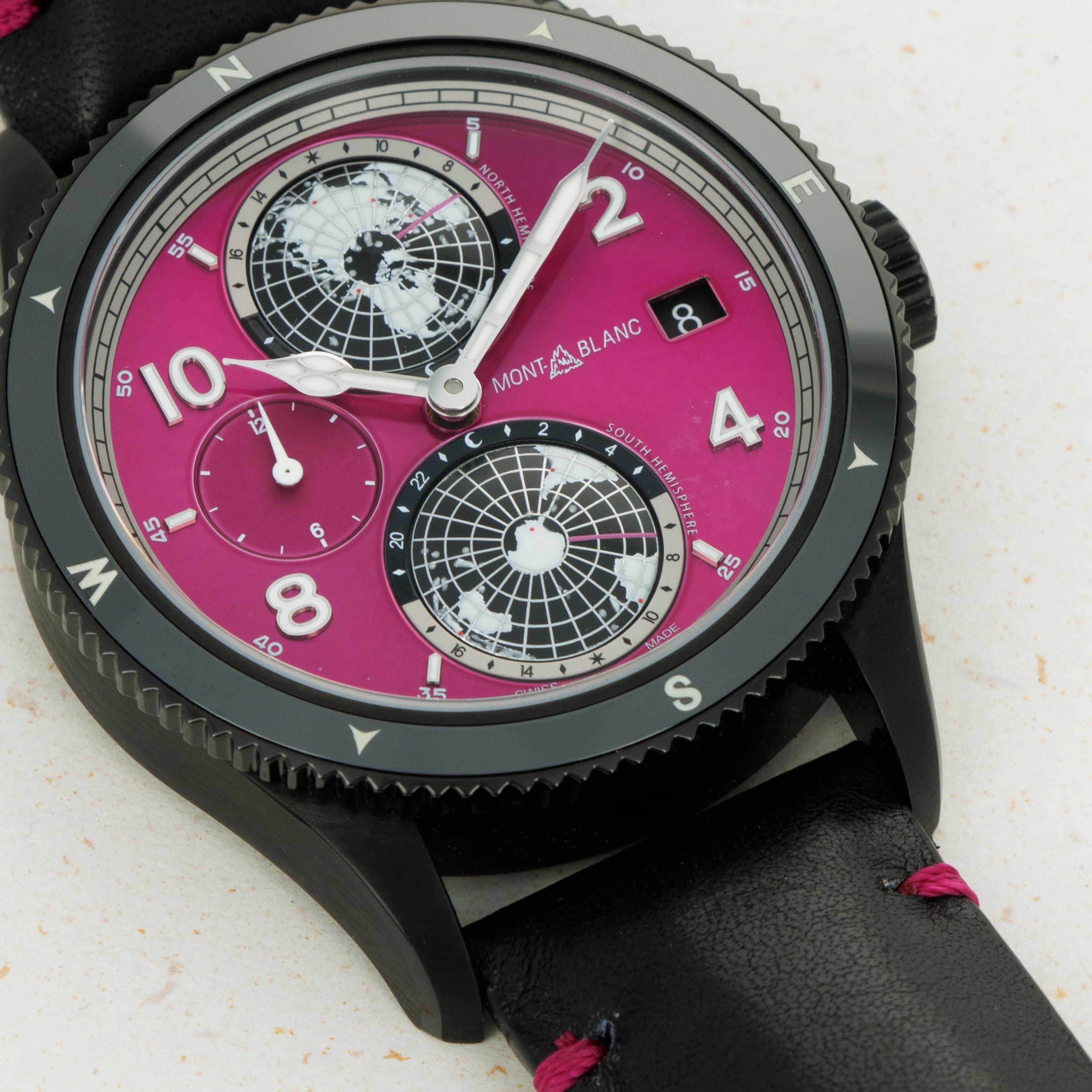 Made as a unique piece for our Pink Dial Project auction in 2021, this speical execution of the Geosphere features a fuchsia pin dial and a black DLC-coated titanium case, and was completely assembled by one of Montblanc's best female watchmakers. A truly unique piece that helped raise significant funds for breast cancer awareness.