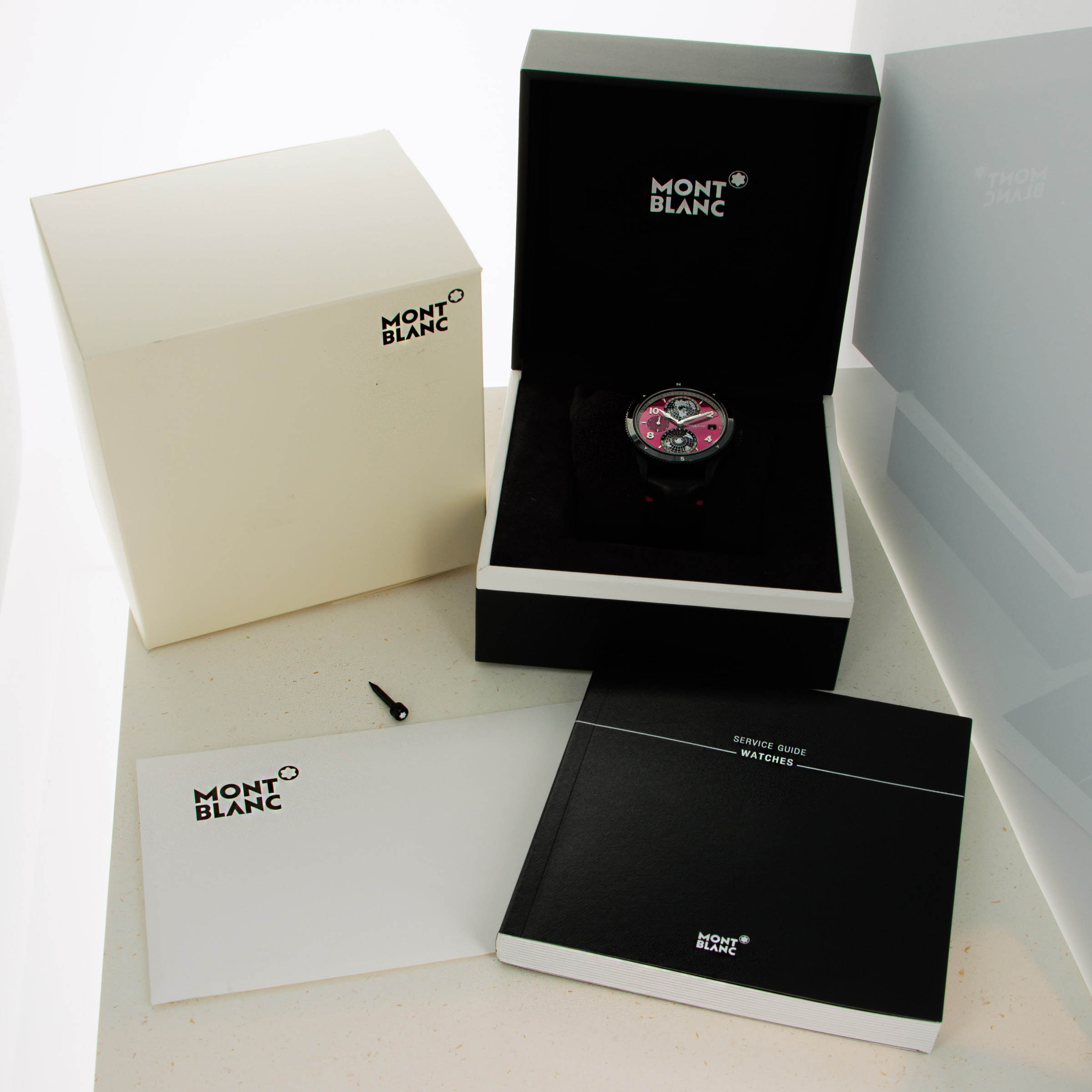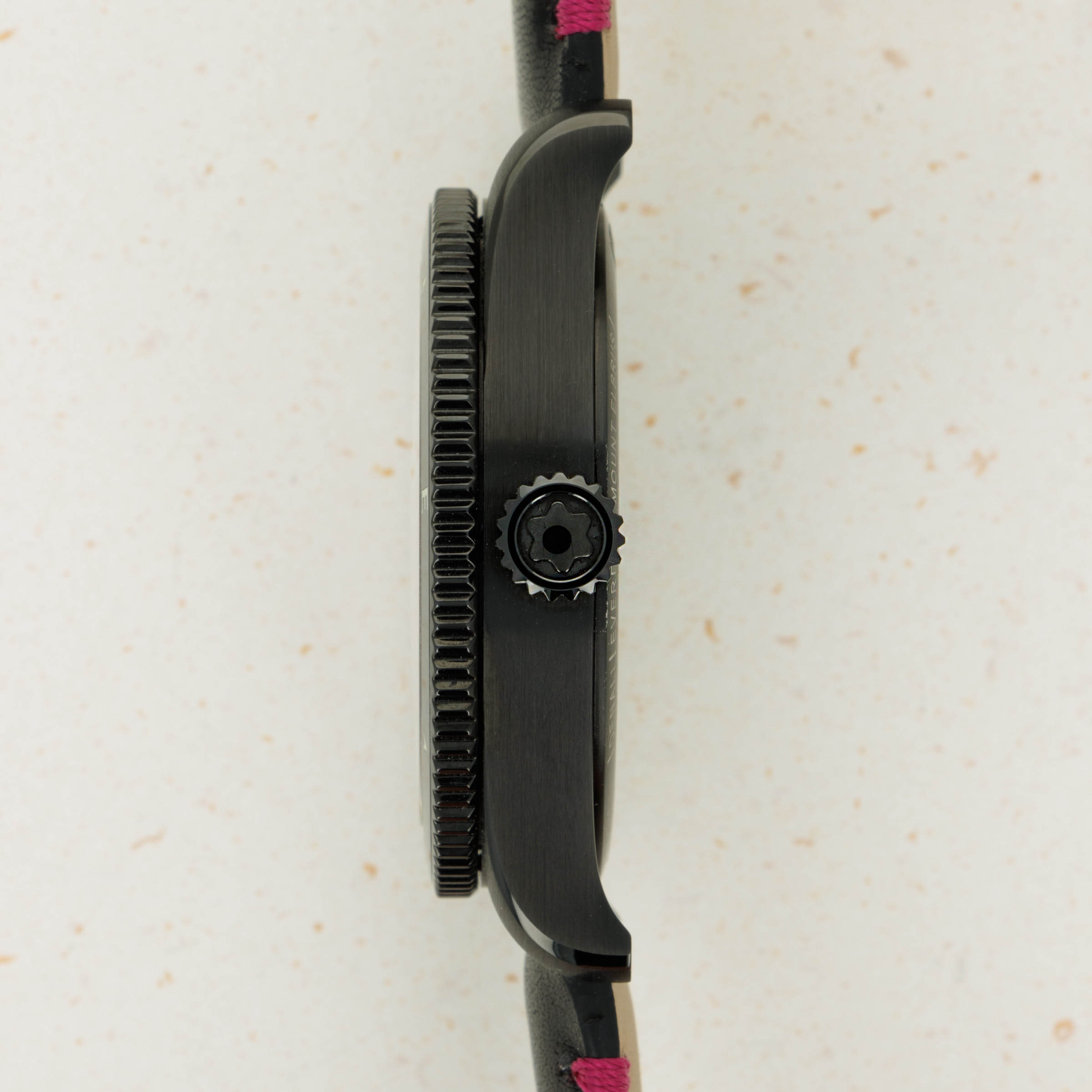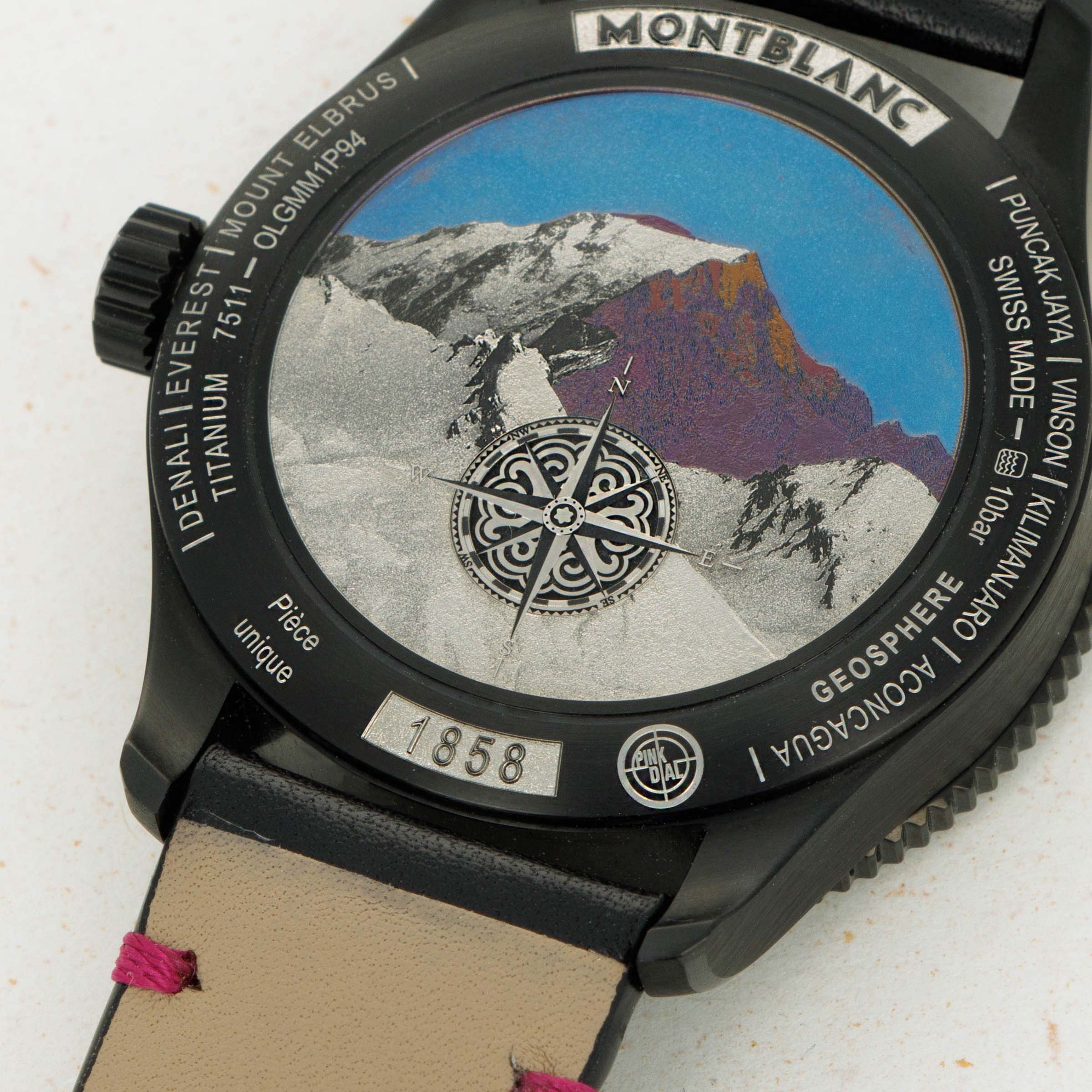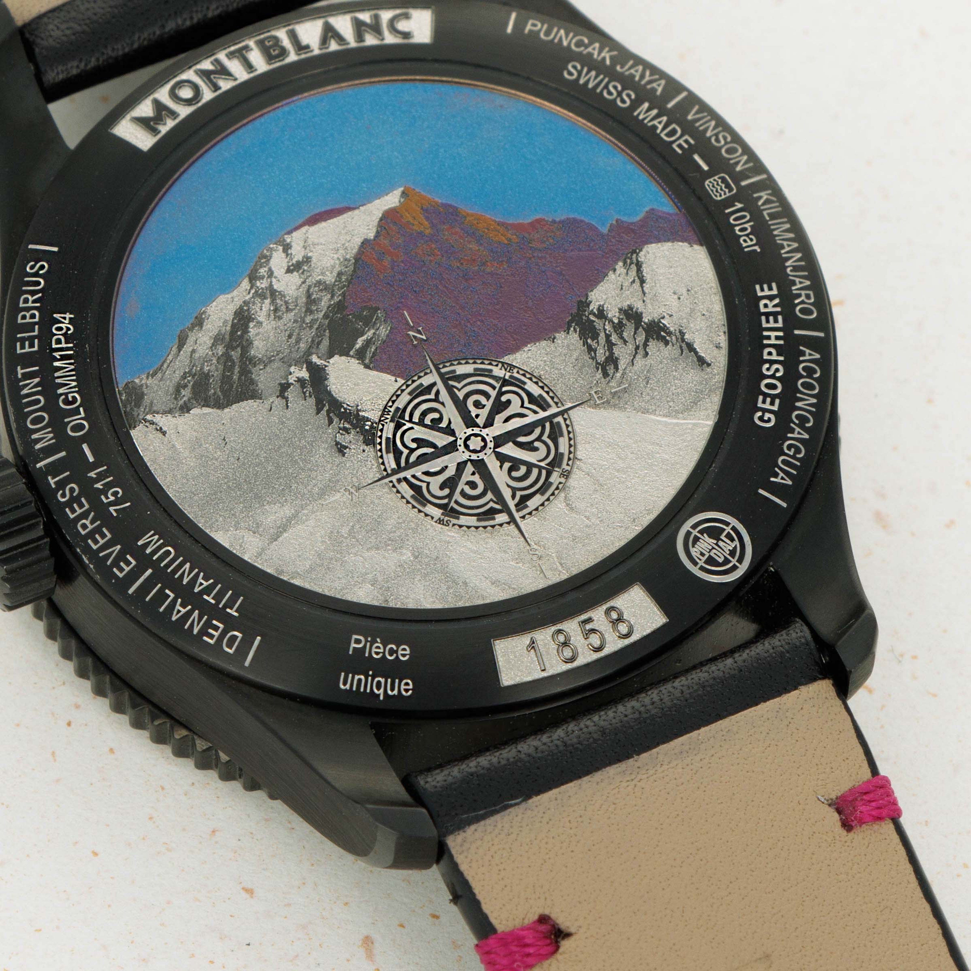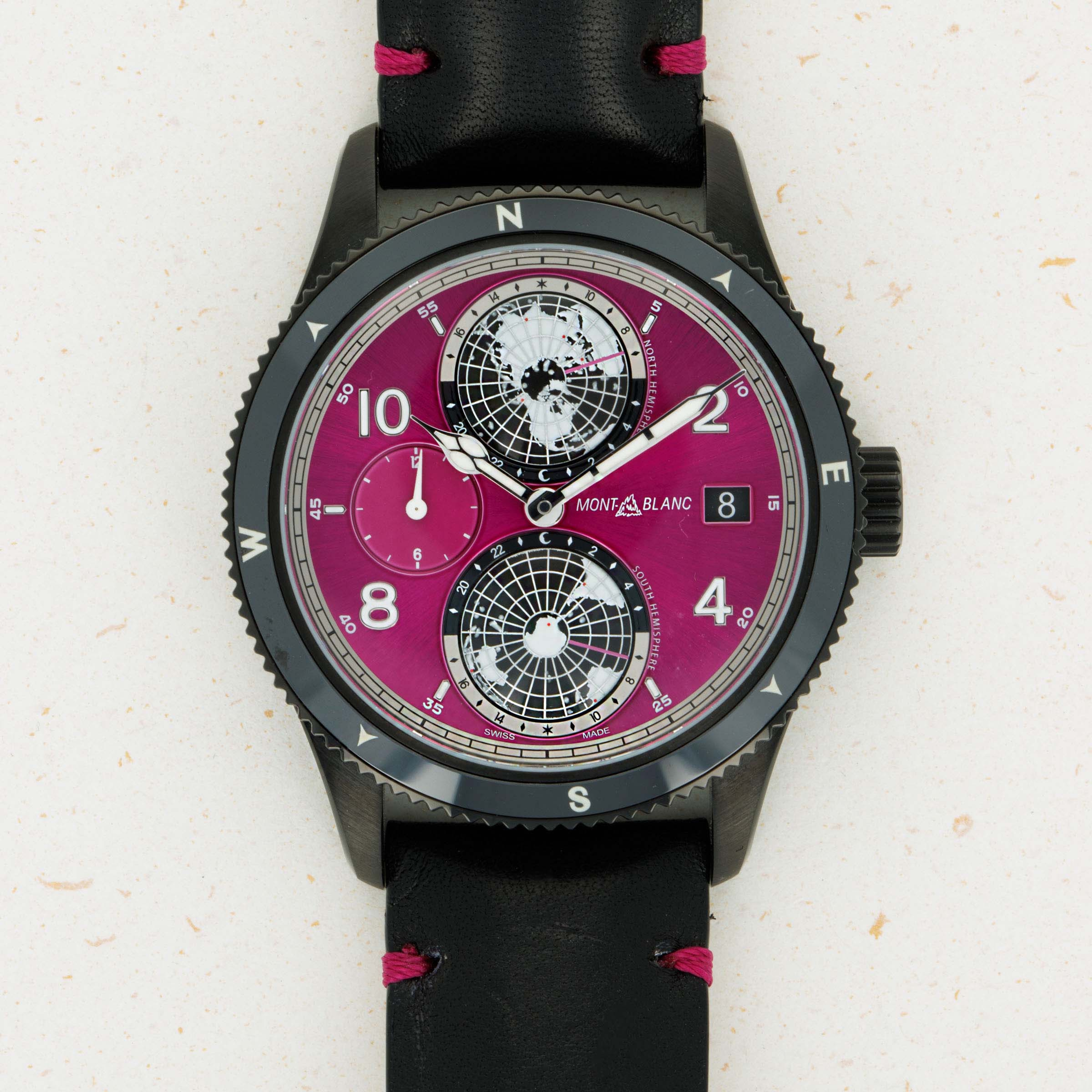 Made as a unique piece for our Pink Dial Project auction in 2021, this speical execution of the Geosphere features a fuchsia pin dial and a black DLC-coated titanium case, and was completely assembled by one of Montblanc's best female watchmakers. A truly unique piece that helped raise significant funds for breast cancer awareness.